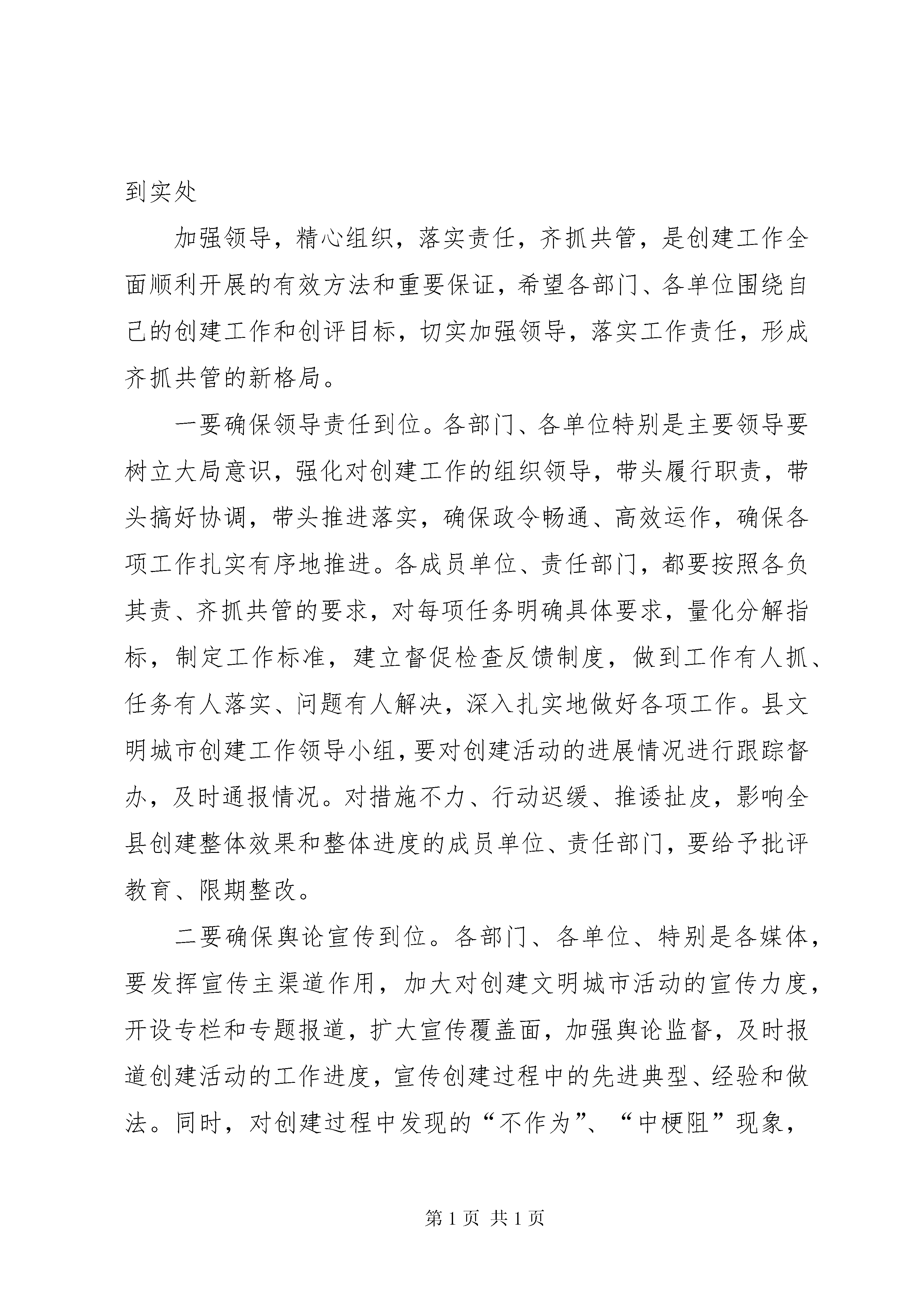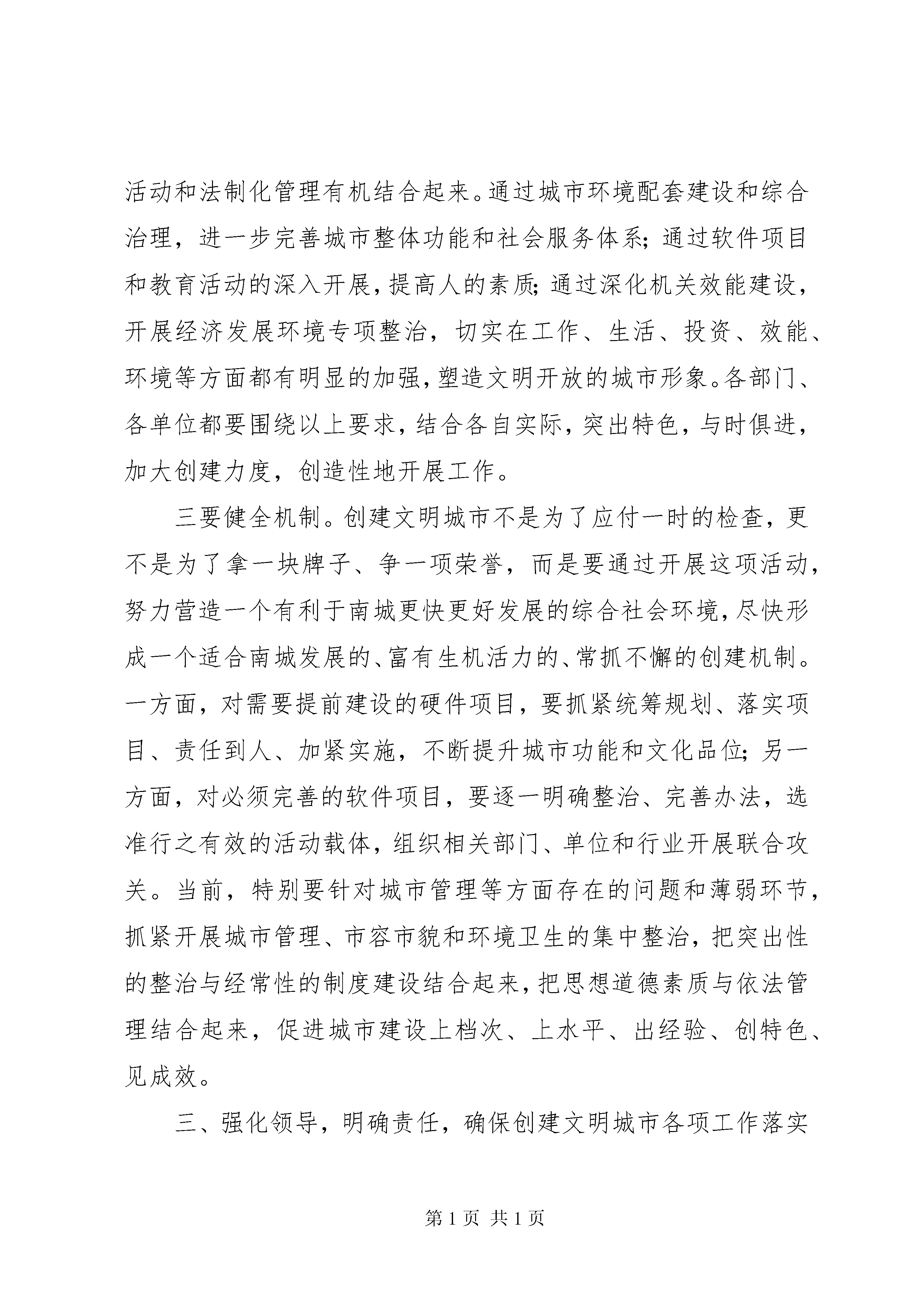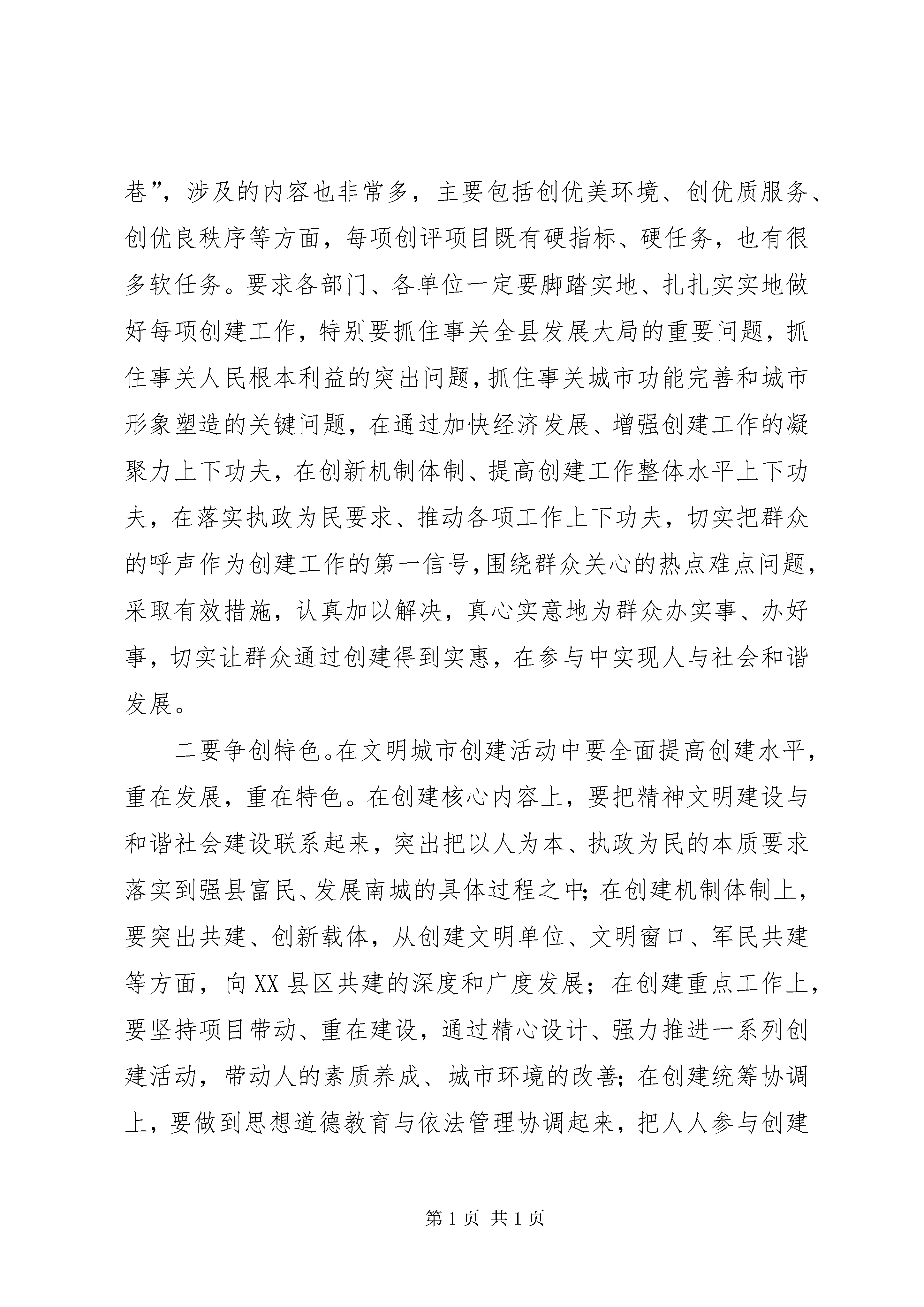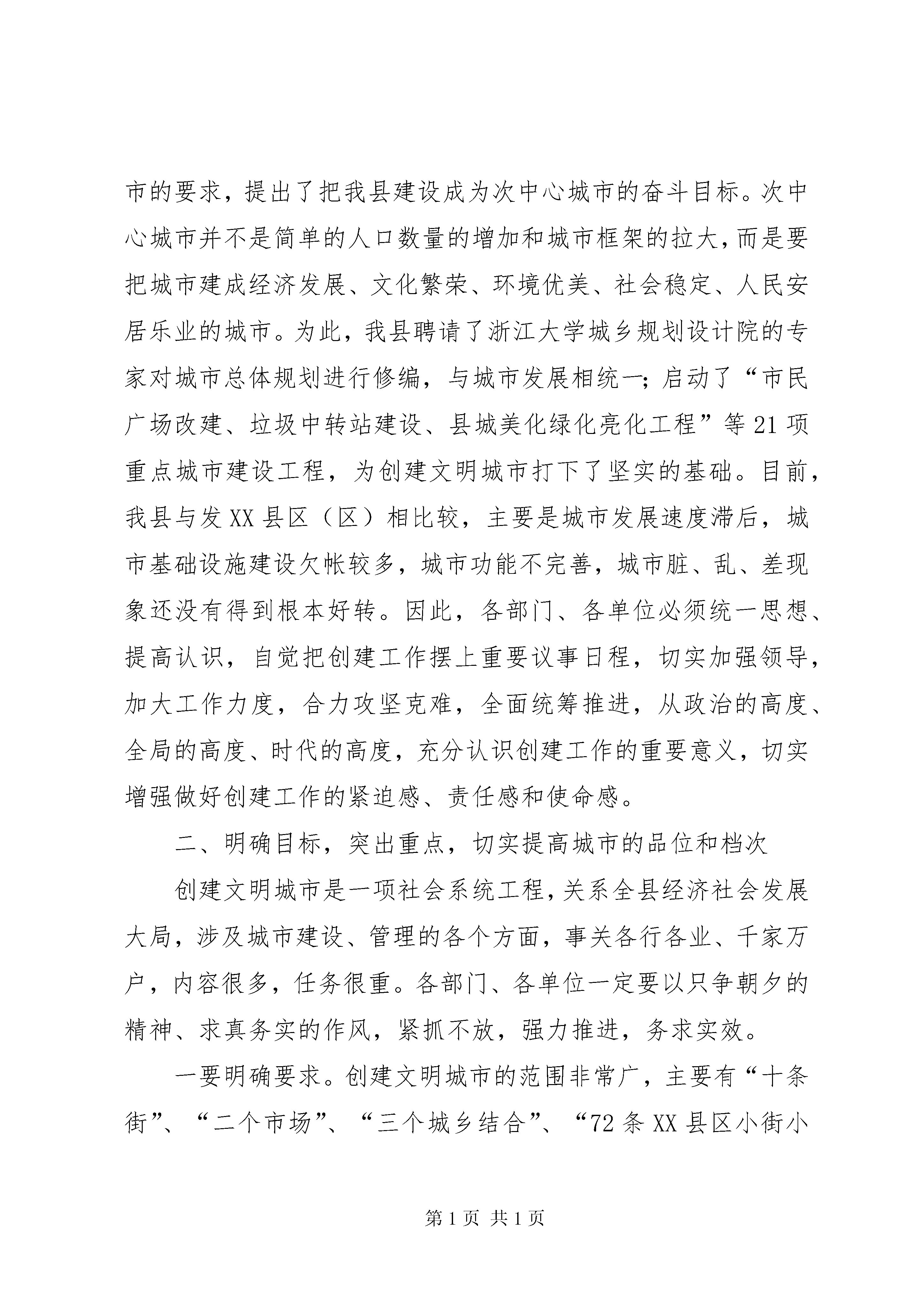 创建文明城市工作会发言材料同志们:刚才,同志就我县创建文明城市工作作了一个很好的动员报告,同志对我县创建文明城市工作进行了全面部署,我完全赞同。县委、县政府今天召开这次动员大会,主要任务是动员全县人民立即行动起来,齐心协力,真抓实干,扎实做好创建各项工作,对我县创建文明城市工作进行全面部署,巩固发展已有成果,奋力争创文明城市,促进全县三个文明协调发展。希望各部门、各单位认真抓好贯彻落实,把我县的文明城市创建工作抓紧、抓实、抓出成效。下面,我再强调三点意见:一、统一思想,转变观念,进一步增强创建文明城市的紧迫感和责任感创建文明城市,是贯彻落实十七届五中全会提出构建和谐社会精神、统筹三个文明协调发展的重要举措,是新时期推进精神文明建设,提高市民素质、城市文明程度和促进社会全面进步的一个重要抓手。通过创建文明城市,可以提高我县城市的知名度、影响力、吸引力和竞争力。我县有2000多年的历史,近几年来随着经济发展和国家几项重点工程在我县实施,尤其是廖坊水库、京福高速公路的建设和即将实施的向埔铁路和济广高速公路的建设,将对我县城市的对外交通、用地规模和发展方向产生深远的影响。县委、县政府为全面实施三个文明协调发展,根据省、市的要求,提出了把我县建设成为次中心城市的奋斗目标。次中心城市并不是简单的人口数量的增加和城市框架的拉大,而是要把城市建成经济发展、文化繁荣、环境优美、社会稳定、人民安居乐业的城市。为此,我县聘请了浙江大学城乡规划设计院的专家对城市总体规划进行修编,与城市发展相统一;启动了“市民广场改建、垃圾中转站建设、县城美化绿化亮化工程”等21项重点城市建设工程,为创建文明城市打下了坚实的基础。目前,我县与发XX县区(区)相比较,主要是城市发展速度滞后,城市基础设施建设欠帐较多,城市功能不完善,城市脏、乱、差现象还没有得到根本好转。因此,各部门、各单位必须统一思想、提高认识,自觉把创建工作摆上重要议事日程,切实加强领导,加大工作力度,合力攻坚克难,全面统筹推进,从政治的高度、全局的高度、时代的高度,充分认识创建工作的重要意义,切实增强做好创建工作的紧迫感、责任感和使命感。二、明确目标,突出重点,切实提高城市的品位和档次创建文明城市是一项社会系统工程,关系全县经济社会发展大局,涉及城市建设、管理的各个方面,事关各行各业、千家万户,内容很多,任务很重。各部门、各单位一定要以只争朝夕的精神、求真务实的作风,紧抓不放,强力推进,务求实效。一要明确要求。创建文明城市的范围非常广,主要有“十条街”、“二个市场”、“三个城乡结合”、“72条XX县区小街小巷”,涉及的内容也非常多,主要包括创优美环境、创优质服务、创优良秩序等方面,每项创评项目既有硬指标、硬任务,也有很多软任务。要求各部门、各单位一定要脚踏实地、扎扎实实地做好每项创建工作,特别要抓住事关全县发展大局的重要问题,抓住事关人民根本利益的突出问题,抓住事关城市功能完善和城市形象塑造的关键问题,在通过加快经济发展、增强创建工作的凝聚力上下功夫,在创新机制体制、提高创建工作整体水平上下功夫,在落实执政为民要求、推动各项工作上下功夫,切实把群众的呼声作为创建工作的第一信号,围绕群众关心的热点难点问题,采取有效措施,认真加以解决,真心实意地为群众办实事、办好事,切实让群众通过创建得到实惠,在参与中实现人与社会和谐发展。二要争创特色。在文明城市创建活动中要全面提高创建水平,重在发展,重在特色。在创建核心内容上,要把精神文明建设与和谐社会建设联系起来,突出把以人为本、执政为民的本质要求落实到强县富民、发展南城的具体过程之中;在创建机制体制上,要突出共建、创新载体,从创建文明单位、文明窗口、军民共建等方面,向XX县区共建的深度和广度发展;在创建重点工作上,要坚持项目带动、重在建设,通过精心设计、强力推进一系列创建活动,带动人的素质养成、城市环境的改善;在创建统筹协调上,要做到思想道德教育与依法管理协调起来,把人人参与创建活动和法制化管理有机结合起来。通过城市环境配套建设和综合治理,进一步完善城市整体功能和社会服务体系;通过软件项目和教育活动的深入开展,提高人的素质;通过深化机关效能建设,开展经济发展环境专项整治,切实在工作、生活、投资、效能、环境等方面都有明显的加强,塑造文明开放的城市形象。各部门、各单位都要围绕以上要求,结合各自实际,突出特色,与时俱进,加大创建力度,创造性地开展工作。三要健全机制。创建文明城市不是为了应付一时的检查,更不是为了拿一块牌子、争一项荣誉,而是要通过开展这项活动,努力营造一个有利于南城更快更好发展的综合社会环境,尽快形成一个适合南城发展的、富有生机活力的、常抓不懈的创建机制。一方面,对需要提前建设的硬件项目,要抓紧统筹规划、落实项目、责任到人、加紧