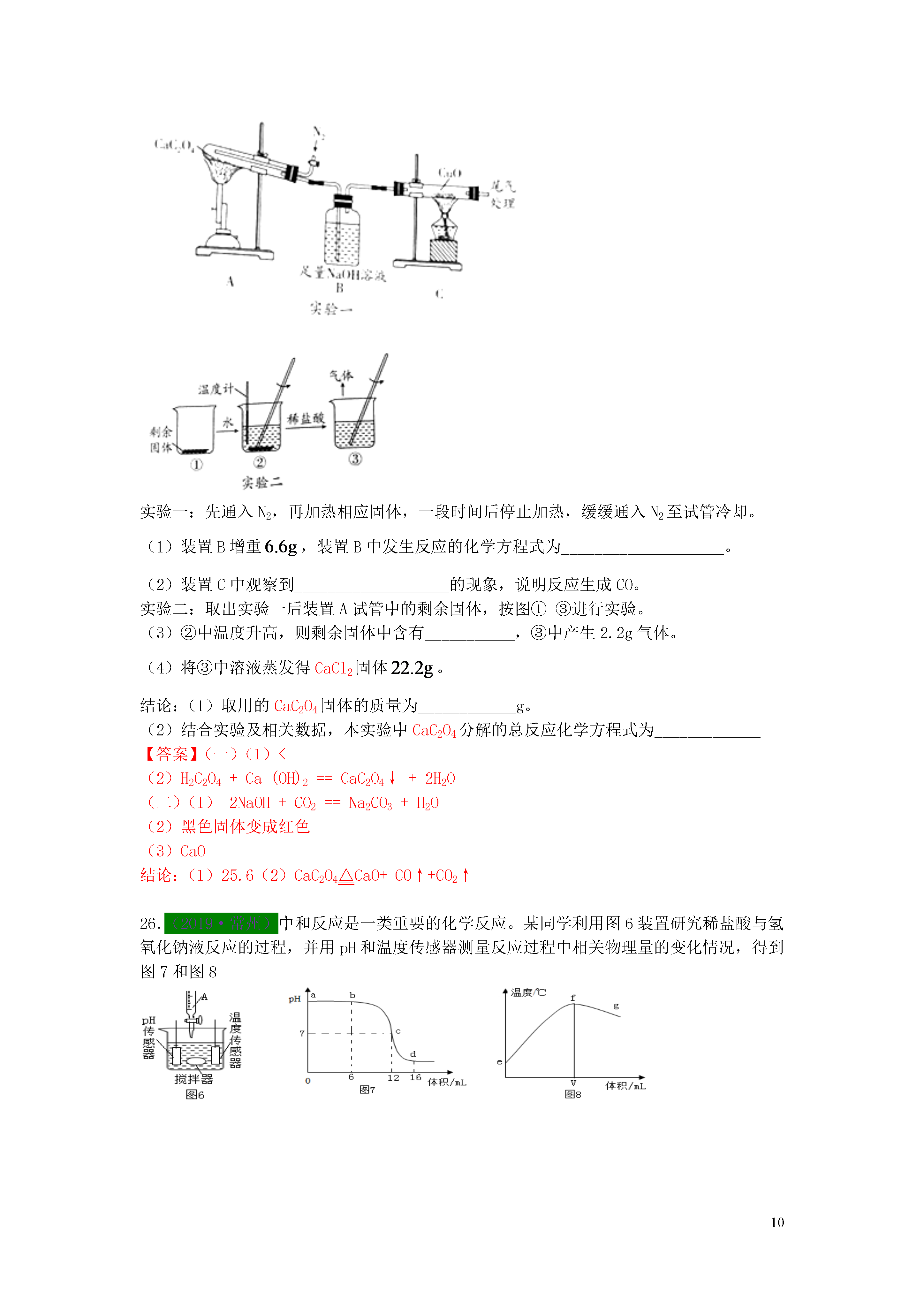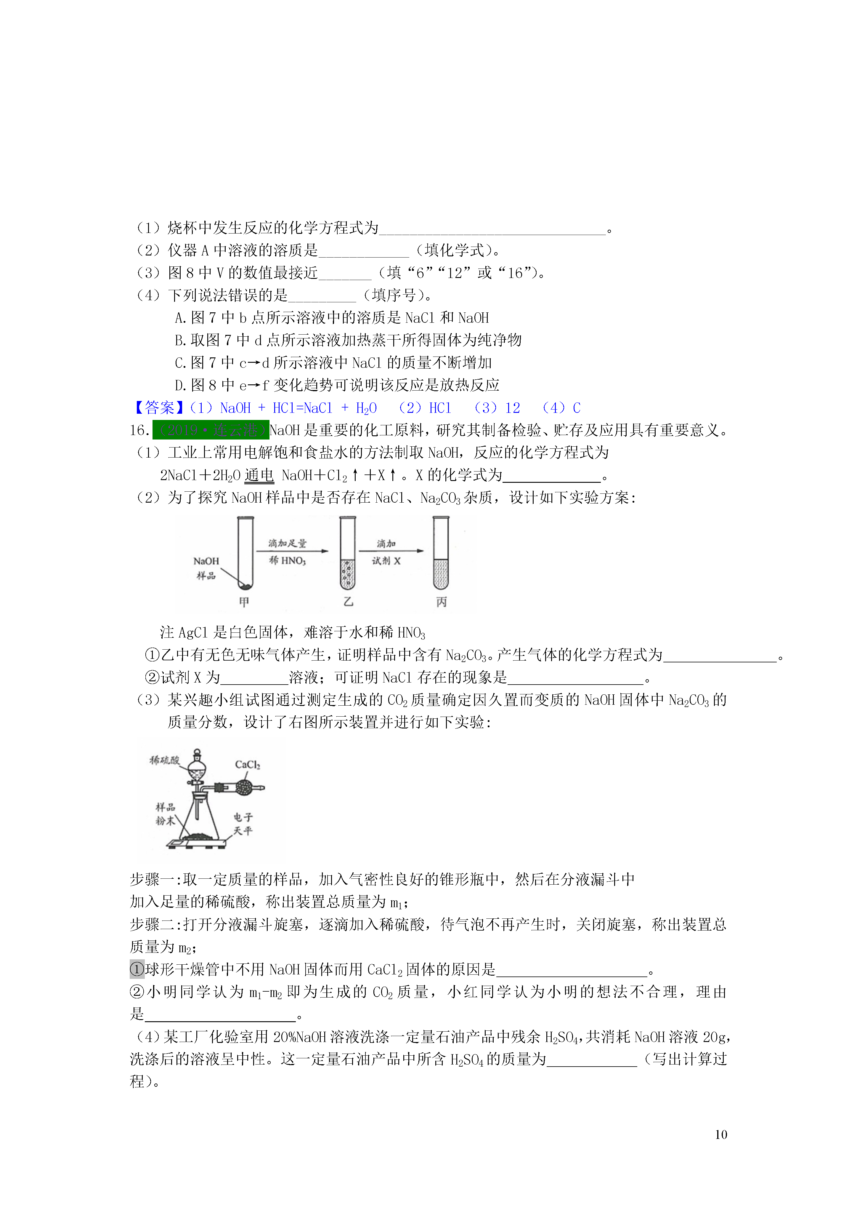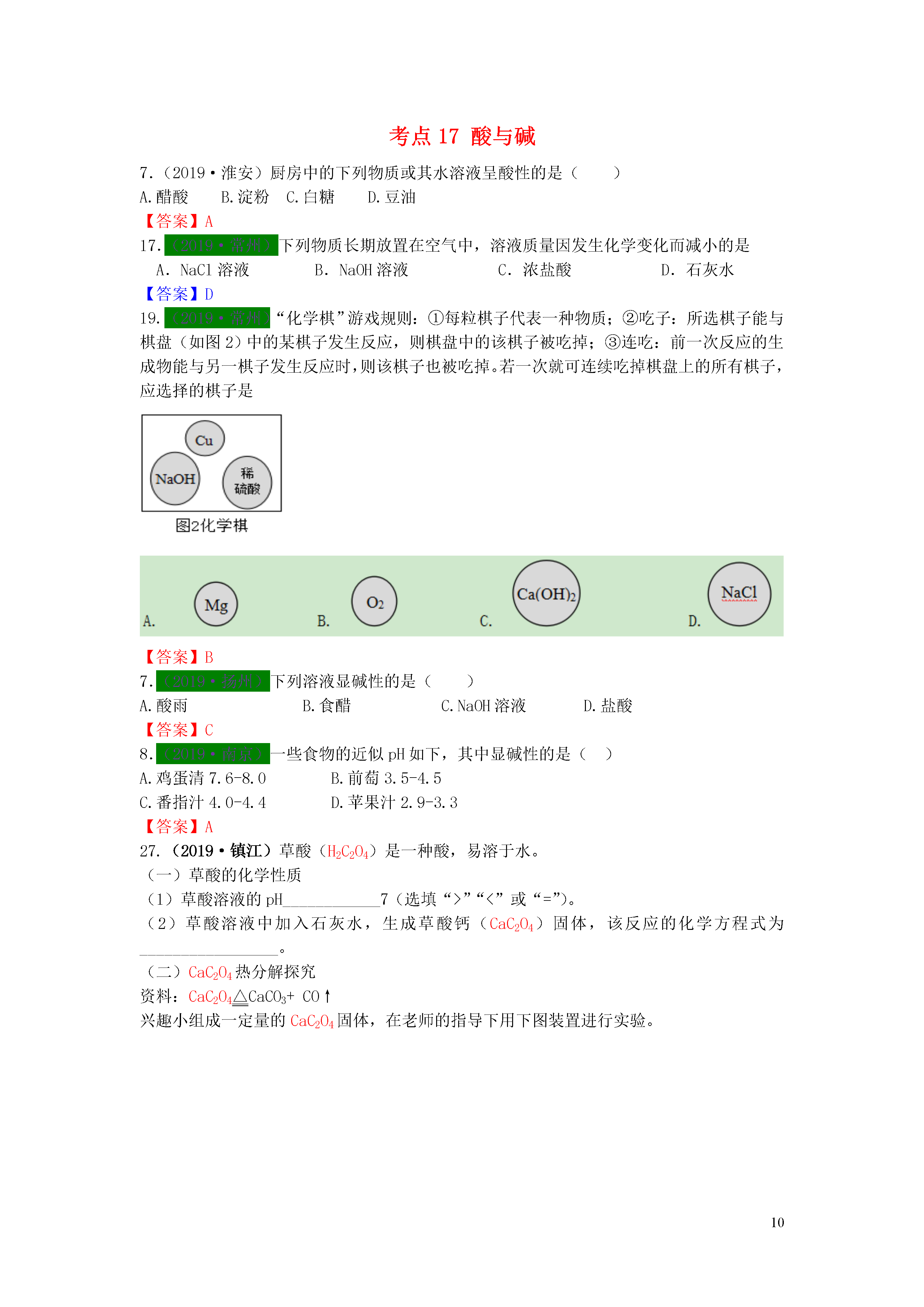 10考点17酸与碱7.(2019·淮安)厨房中的下列物质或其水溶液呈酸性的是()A.醋酸B.淀粉C.白糖D.豆油【答案】A17.(2019·常州)下列物质长期放置在空气中,溶液质量因发生化学变化而减小的是A.NaCl溶液B.NaOH溶液C.浓盐酸D.石灰水【答案】D19.(2019·常州)“化学棋”游戏规则:①每粒棋子代表一种物质;②吃子:所选棋子能与棋盘(如图2)中的某棋子发生反应,则棋盘中的该棋子被吃掉;③连吃:前一次反应的生成物能与另一棋子发生反应时,则该棋子也被吃掉。若一次就可连续吃掉棋盘上的所有棋子,应选择的棋子是【答案】B7.(2019·扬州)下列溶液显碱性的是()A.酸雨B.食醋C.NaOH溶液D.盐酸【答案】C8.(2019·南京)一些食物的近似pH如下,其中显碱性的是()A.鸡蛋清7.6-8.0B.前萄3.5-4.5C.番指汁4.0-4.4D.苹果汁2.9-3.3【答案】A27.(2019·镇江)草酸(H2C2O4)是一种酸,易溶于水。(一)草酸的化学性质(1)草酸溶液的pH____________7(选填“>”“<”或“=”)。(2)草酸溶液中加入石灰水,生成草酸钙(CaC2O4)固体,该反应的化学方程式为_________________。(二)CaC2O4热分解探究资料:CaC2O4△CaCO3+CO↑兴趣小组成一定量的CaC2O4固体,在老师的指导下用下图装置进行实验。实验一:先通入N2,再加热相应固体,一段时间后停止加热,缓缓通入N2至试管冷却。(1)装置B增重,装置B中发生反应的化学方程式为____________________。(2)装置C中观察到___________________的现象,说明反应生成CO。实验二:取出实验一后装置A试管中的剩余固体,按图①-③进行实验。(3)②中温度升高,则剩余固体中含有___________,③中产生2.2g气体。(4)将③中溶液蒸发得CaCl2固体。结论:(1)取用的CaC2O4固体的质量为____________g。(2)结合实验及相关数据,本实验中CaC2O4分解的总反应化学方程式为_____________【答案】(一)(1)<(2)H2C2O4+Ca(OH)2==CaC2O4↓+2H2O(二)(1)2NaOH+CO2==Na2CO3+H2O(2)黑色固体变成红色(3)CaO结论:(1)25.6(2)CaC2O4△CaO+CO↑+CO2↑26.(2019·常州)中和反应是一类重要的化学反应。某同学利用图6装置研究稀盐酸与氢氧化钠液反应的过程,并用pH和温度传感器测量反应过程中相关物理量的变化情况,得到图7和图8(1)烧杯中发生反应的化学方程式为______________________________。(2)仪器A中溶液的溶质是____________(填化学式)。(3)图8中V的数值最接近_______(填“6”“12”或“16”)。(4)下列说法错误的是_________(填序号)。A.图7中b点所示溶液中的溶质是NaCl和NaOHB.取图7中d点所示溶液加热蒸干所得固体为纯净物C.图7中c→d所示溶液中NaCl的质量不断增加D.图8中e→f变化趋势可说明该反应是放热反应【答案】(1)NaOH+HCl=NaCl+H2O(2)HCl(3)12(4)C16.(2019·连云港)NaOH是重要的化工原料,研究其制备检验、贮存及应用具有重要意义。(1)工业上常用电解饱和食盐水的方法制取NaOH,反应的化学方程式为2NaCl+2H2O通电NaOH+Cl2↑+X↑。X的化学式为。(2)为了探究NaOH样品中是否存在NaCl、Na2CO3杂质,设计如下实验方案:注AgCl是白色固体,难溶于水和稀HNO3①乙中有无色无味气体产生,证明样品中含有Na2CO3。产生气体的化学方程式为。②试剂X为溶液;可证明NaCl存在的现象是。某兴趣小组试图通过测定生成的CO2质量确定因久置而变质的NaOH固体中Na2CO3的质量分数,设计了右图所示装置并进行如下实验:步骤一:取一定质量的样品,加入气密性良好的锥形瓶中,然后在分液漏斗中加入足量的稀硫酸,称出装置总质量为m1;步骤二:打开分液漏斗旋塞,逐滴加入稀硫酸,待气泡不再产生时,关闭旋塞,称出装置总质量为m2;①球形干燥管中不用NaOH固体而用CaCl2固体的原因是。②小明同学认为m1-m2即为生成的CO2质量,小红同学认为小明的想法不合理,理由是。(4)某工厂化验室用20%NaOH溶液洗涤一定量石油产品中残余H2SO4,共消耗NaOH溶液20g,洗涤后的溶液呈中性。这一定量石油产品