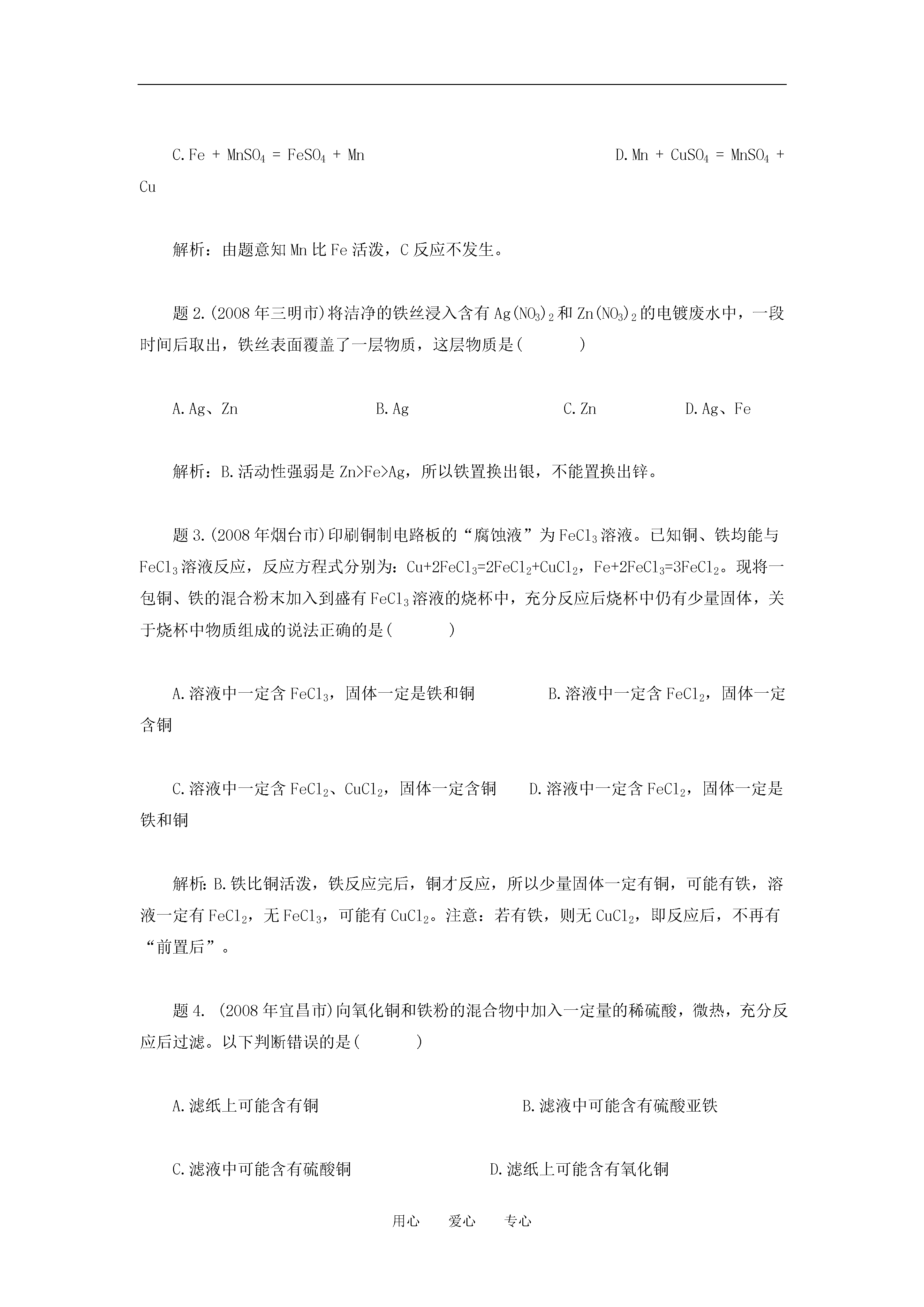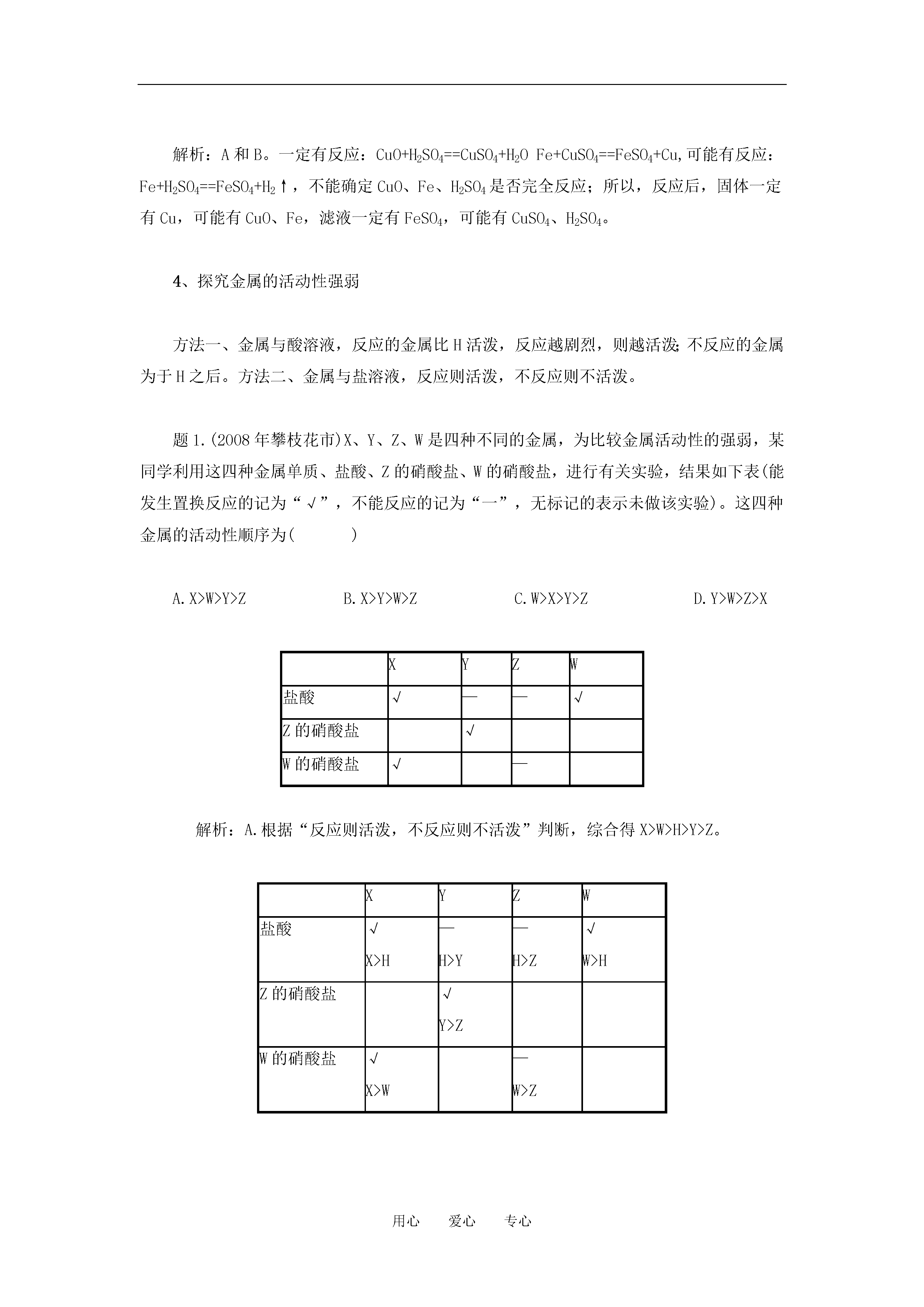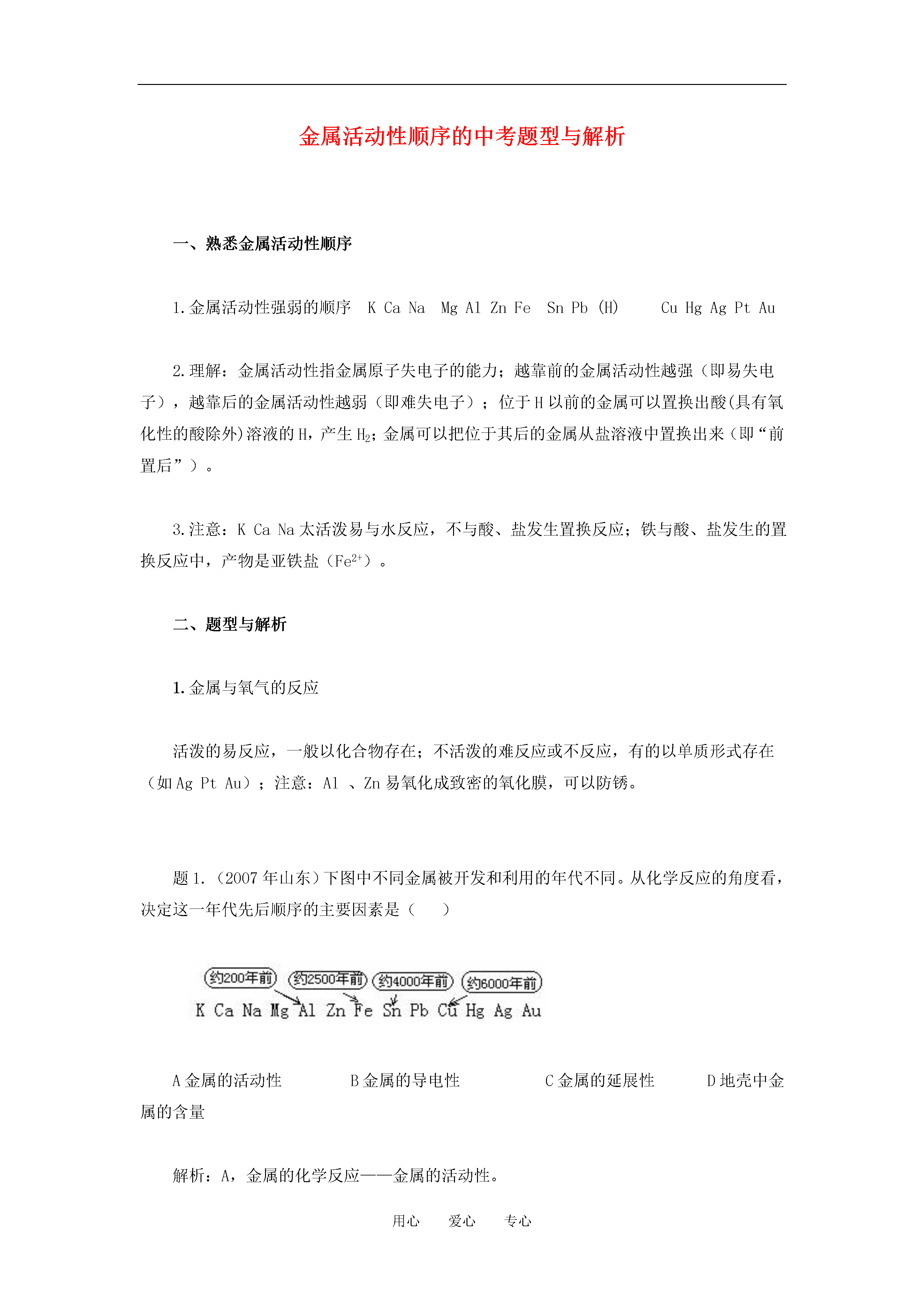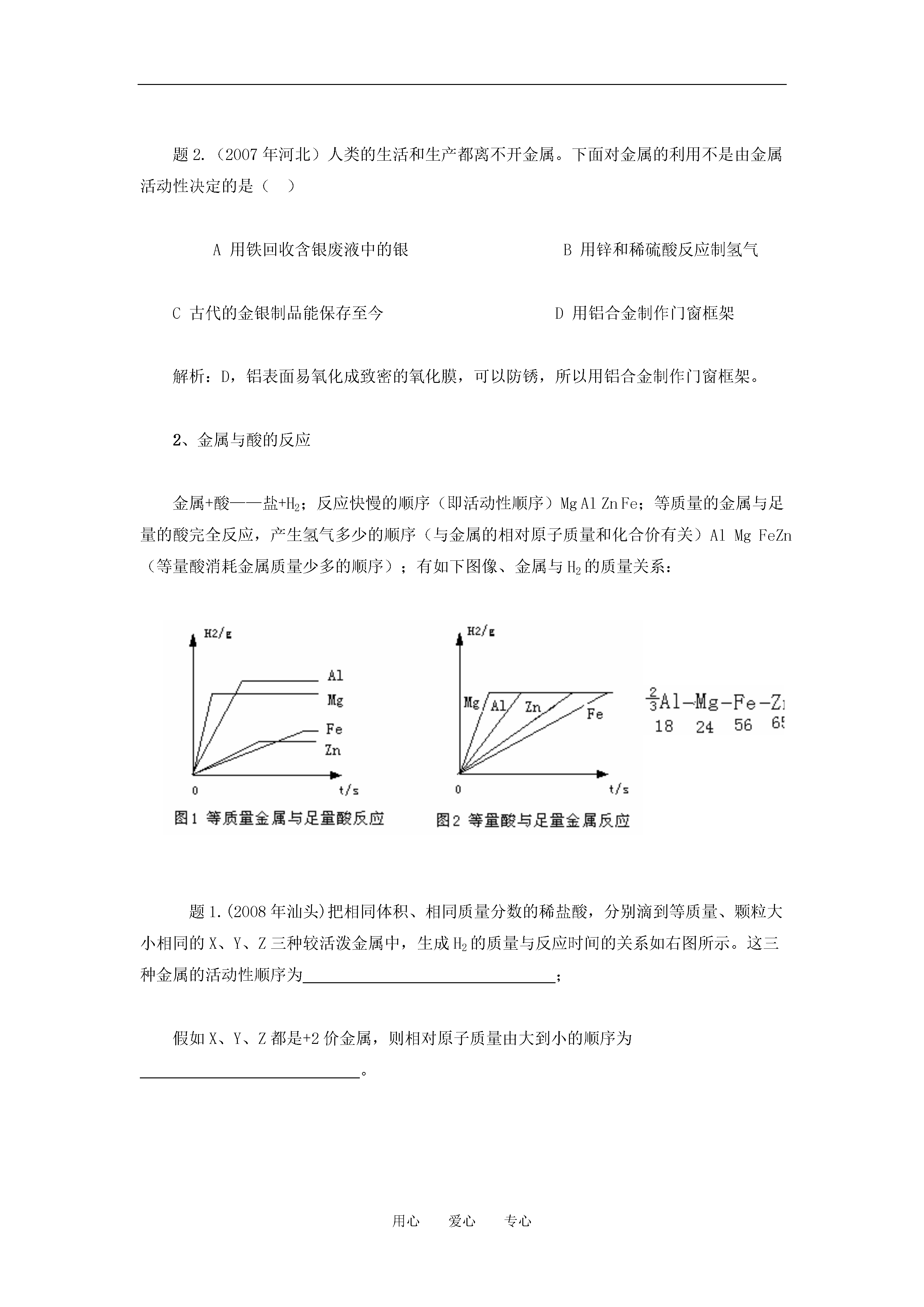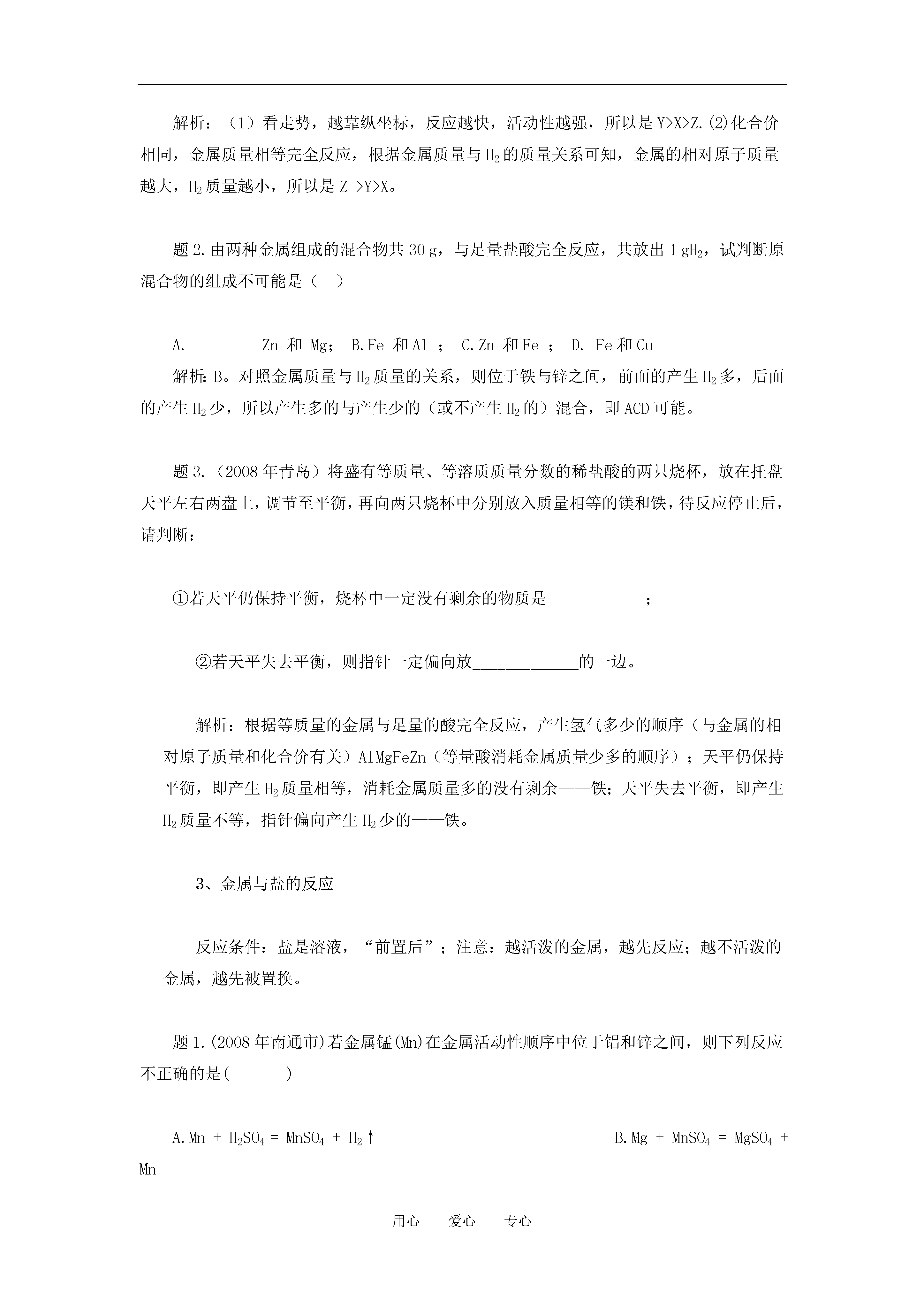 用心爱心专心金属活动性顺序的中考题型与解析一、熟悉金属活动性顺序1.金属活动性强弱的顺序KCaNaMgAlZnFeSnPb(H)CuHgAgPtAu2.理解:金属活动性指金属原子失电子的能力;越靠前的金属活动性越强(即易失电子),越靠后的金属活动性越弱(即难失电子);位于H以前的金属可以置换出酸(具有氧化性的酸除外)溶液的H,产生H2;金属可以把位于其后的金属从盐溶液中置换出来(即“前置后”)。3.注意:KCaNa太活泼易与水反应,不与酸、盐发生置换反应;铁与酸、盐发生的置换反应中,产物是亚铁盐(Fe2+)。二、题型与解析1.金属与氧气的反应活泼的易反应,一般以化合物存在;不活泼的难反应或不反应,有的以单质形式存在(如AgPtAu);注意:Al、Zn易氧化成致密的氧化膜,可以防锈。题1.(2007年山东)下图中不同金属被开发和利用的年代不同。从化学反应的角度看,决定这一年代先后顺序的主要因素是()A金属的活动性B金属的导电性C金属的延展性D地壳中金属的含量解析:A,金属的化学反应——金属的活动性。题2.(2007年河北)人类的生活和生产都离不开金属。下面对金属的利用不是由金属活动性决定的是()A用铁回收含银废液中的银B用锌和稀硫酸反应制氢气C古代的金银制品能保存至今D用铝合金制作门窗框架解析:D,铝表面易氧化成致密的氧化膜,可以防锈,所以用铝合金制作门窗框架。2、金属与酸的反应金属+酸——盐+H2;反应快慢的顺序(即活动性顺序)MgAlZnFe;等质量的金属与足量的酸完全反应,产生氢气多少的顺序(与金属的相对原子质量和化合价有关)AlMgFeZn(等量酸消耗金属质量少多的顺序);有如下图像、金属与H2的质量关系:题1.(2008年汕头)把相同体积、相同质量分数的稀盐酸,分别滴到等质量、颗粒大小相同的X、Y、Z三种较活泼金属中,生成H2的质量与反应时间的关系如右图所示。这三种金属的活动性顺序为;假如X、Y、Z都是+2价金属,则相对原子质量由大到小的顺序为。解析:(1)看走势,越靠纵坐标,反应越快,活动性越强,所以是Y>X>Z.(2)化合价相同,金属质量相等完全反应,根据金属质量与H2的质量关系可知,金属的相对原子质量越大,H2质量越小,所以是Z>Y>X。题2.由两种金属组成的混合物共30g,与足量盐酸完全反应,共放出1gH2,试判断原混合物的组成不可能是()A.Zn和Mg;B.Fe和Al;C.Zn和Fe;D.Fe和Cu解析:B。对照金属质量与H2质量的关系,则位于铁与锌之间,前面的产生H2多,后面的产生H2少,所以产生多的与产生少的(或不产生H2的)混合,即ACD可能。题3.(2008年青岛)将盛有等质量、等溶质质量分数的稀盐酸的两只烧杯,放在托盘天平左右两盘上,调节至平衡,再向两只烧杯中分别放入质量相等的镁和铁,待反应停止后,请判断:①若天平仍保持平衡,烧杯中一定没有剩余的物质是____________;②若天平失去平衡,则指针一定偏向放_____________的一边。解析:根据等质量的金属与足量的酸完全反应,产生氢气多少的顺序(与金属的相对原子质量和化合价有关)AlMgFeZn(等量酸消耗金属质量少多的顺序);天平仍保持平衡,即产生H2质量相等,消耗金属质量多的没有剩余——铁;天平失去平衡,即产生H2质量不等,指针偏向产生H2少的——铁。3、金属与盐的反应反应条件:盐是溶液,“前置后”;注意:越活泼的金属,越先反应;越不活泼的金属,越先被置换。题1.(2008年南通市)若金属锰(Mn)在金属活动性顺序中位于铝和锌之间,则下列反应不正确的是()A.Mn+H2SO4=MnSO4+H2↑B.Mg+MnSO4=MgSO4+MnC.Fe+MnSO4=FeSO4+MnD.Mn+CuSO4=MnSO4+Cu解析:由题意知Mn比Fe活泼,C反应不发生。题2.(2008年三明市)将洁净的铁丝浸入含有Ag(NO3)2和Zn(NO3)2的电镀废水中,一段时间后取出,铁丝表面覆盖了一层物质,这层物质是()A.Ag、ZnB.AgC.ZnD.Ag、Fe解析:B.活动性强弱是Zn>Fe>Ag,所以铁置换出银,不能置换出锌。