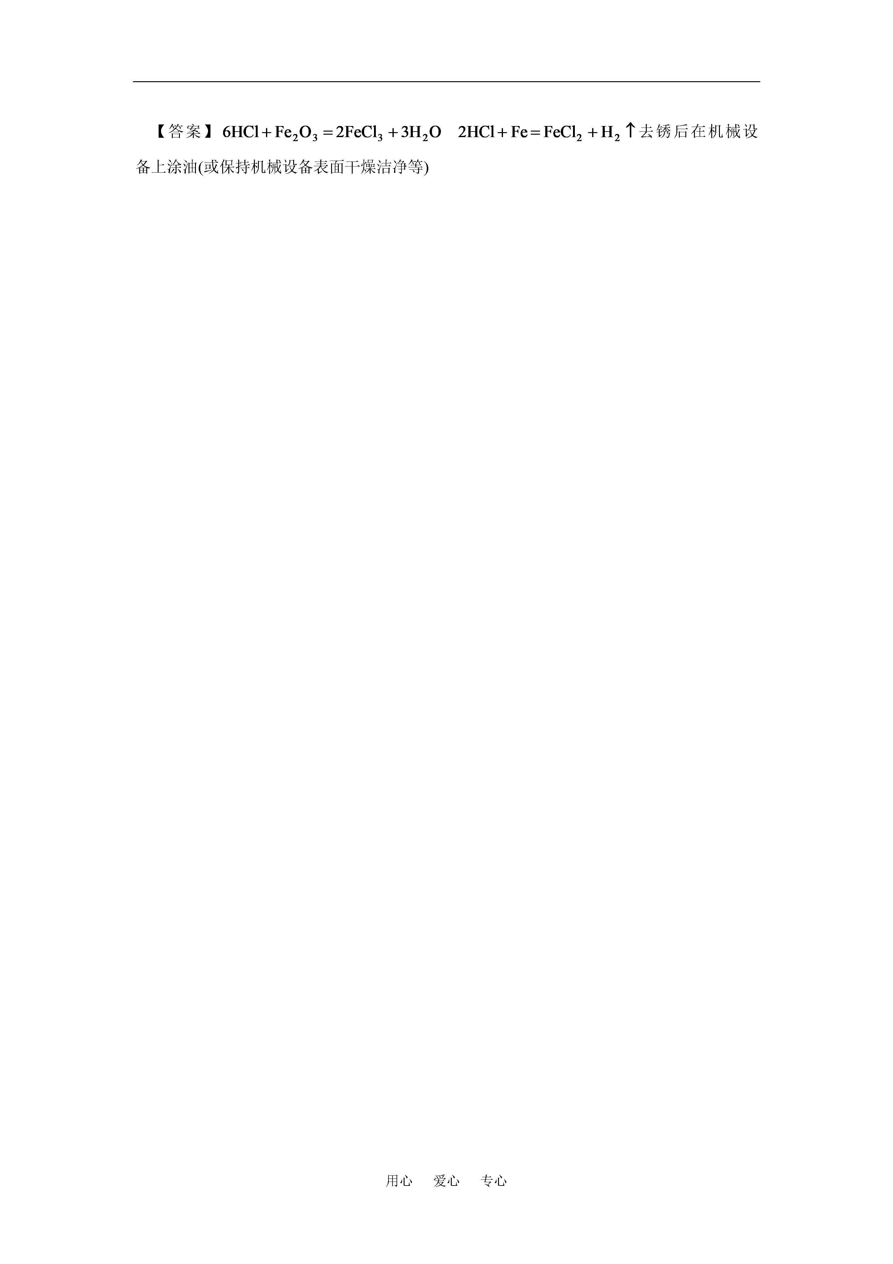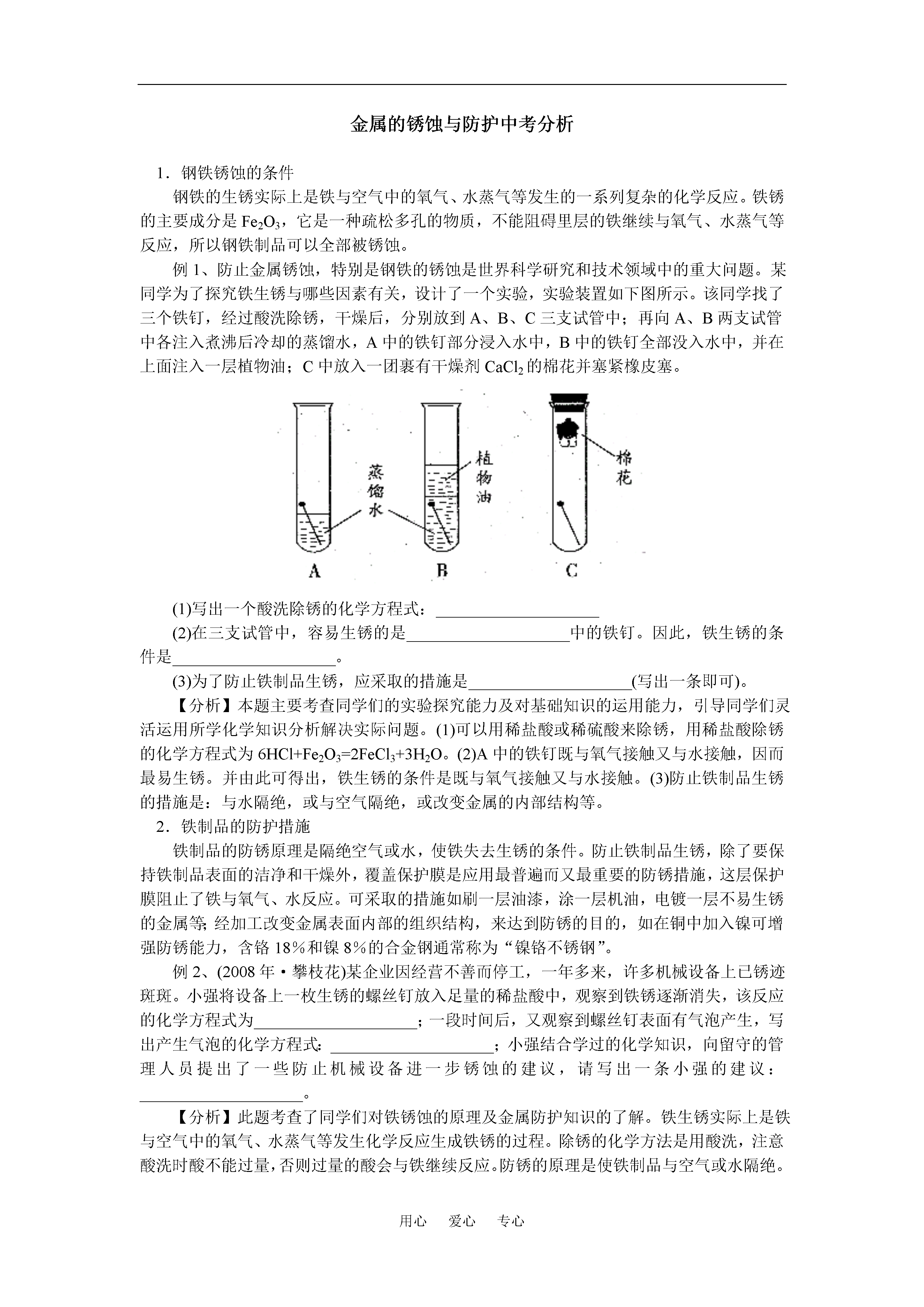 用心爱心专心金属的锈蚀与防护中考分析1.钢铁锈蚀的条件钢铁的生锈实际上是铁与空气中的氧气、水蒸气等发生的一系列复杂的化学反应。铁锈的主要成分是Fe2O3,它是一种疏松多孔的物质,不能阻碍里层的铁继续与氧气、水蒸气等反应,所以钢铁制品可以全部被锈蚀。例1、防止金属锈蚀,特别是钢铁的锈蚀是世界科学研究和技术领域中的重大问题。某同学为了探究铁生锈与哪些因素有关,设计了一个实验,实验装置如下图所示。该同学找了三个铁钉,经过酸洗除锈,干燥后,分别放到A、B、C三支试管中;再向A、B两支试管中各注入煮沸后冷却的蒸馏水,A中的铁钉部分浸入水中,B中的铁钉全部没入水中,并在上面注入一层植物油;C中放入一团裹有干燥剂CaCl2的棉花并塞紧橡皮塞。(1)写出一个酸洗除锈的化学方程式:____________________(2)在三支试管中,容易生锈的是____________________中的铁钉。因此,铁生锈的条件是____________________。(3)为了防止铁制品生锈,应采取的措施是____________________(写出一条即可)。【分析】本题主要考查同学们的实验探究能力及对基础知识的运用能力,引导同学们灵活运用所学化学知识分析解决实际问题。(1)可以用稀盐酸或稀硫酸来除锈,用稀盐酸除锈的化学方程式为6HCl+Fe2O3=2FeCl3+3H2O。(2)A中的铁钉既与氧气接触又与水接触,因而最易生锈。并由此可得出,铁生锈的条件是既与氧气接触又与水接触。(3)防止铁制品生锈的措施是:与水隔绝,或与空气隔绝,或改变金属的内部结构等。2.铁制品的防护措施铁制品的防锈原理是隔绝空气或水,使铁失去生锈的条件。防止铁制品生锈,除了要保持铁制品表面的洁净和干燥外,覆盖保护膜是应用最普遍而又最重要的防锈措施,这层保护膜阻止了铁与氧气、水反应。可采取的措施如刷一层油漆,涂一层机油,电镀一层不易生锈的金属等;经加工改变金属表面内部的组织结构,来达到防锈的目的,如在铜中加入镍可增强防锈能力,含铬18%和镍8%的合金钢通常称为“镍铬不锈钢”。例2、(2008年·攀枝花)某企业因经营不善而停工,一年多来,许多机械设备上已锈迹斑斑。小强将设备上一枚生锈的螺丝钉放入足量的稀盐酸中,观察到铁锈逐渐消失,该反应的化学方程式为____________________;一段时间后,又观察到螺丝钉表面有气泡产生,写出产生气泡的化学方程式:____________________;小强结合学过的化学知识,向留守的管理人员提出了一些防止机械设备进一步锈蚀的建议,请写出一条小强的建议:____________________。【分析】此题考查了同学们对铁锈蚀的原理及金属防护知识的了解。铁生锈实际上是铁与空气中的氧气、水蒸气等发生化学反应生成铁锈的过程。除锈的化学方法是用酸洗,注意酸洗时酸不能过量,否则过量的酸会与铁继续反应。防锈的原理是使铁制品与空气或水隔绝。【答案】去锈后在机械设备上涂油(或保持机械设备表面干燥洁净等)