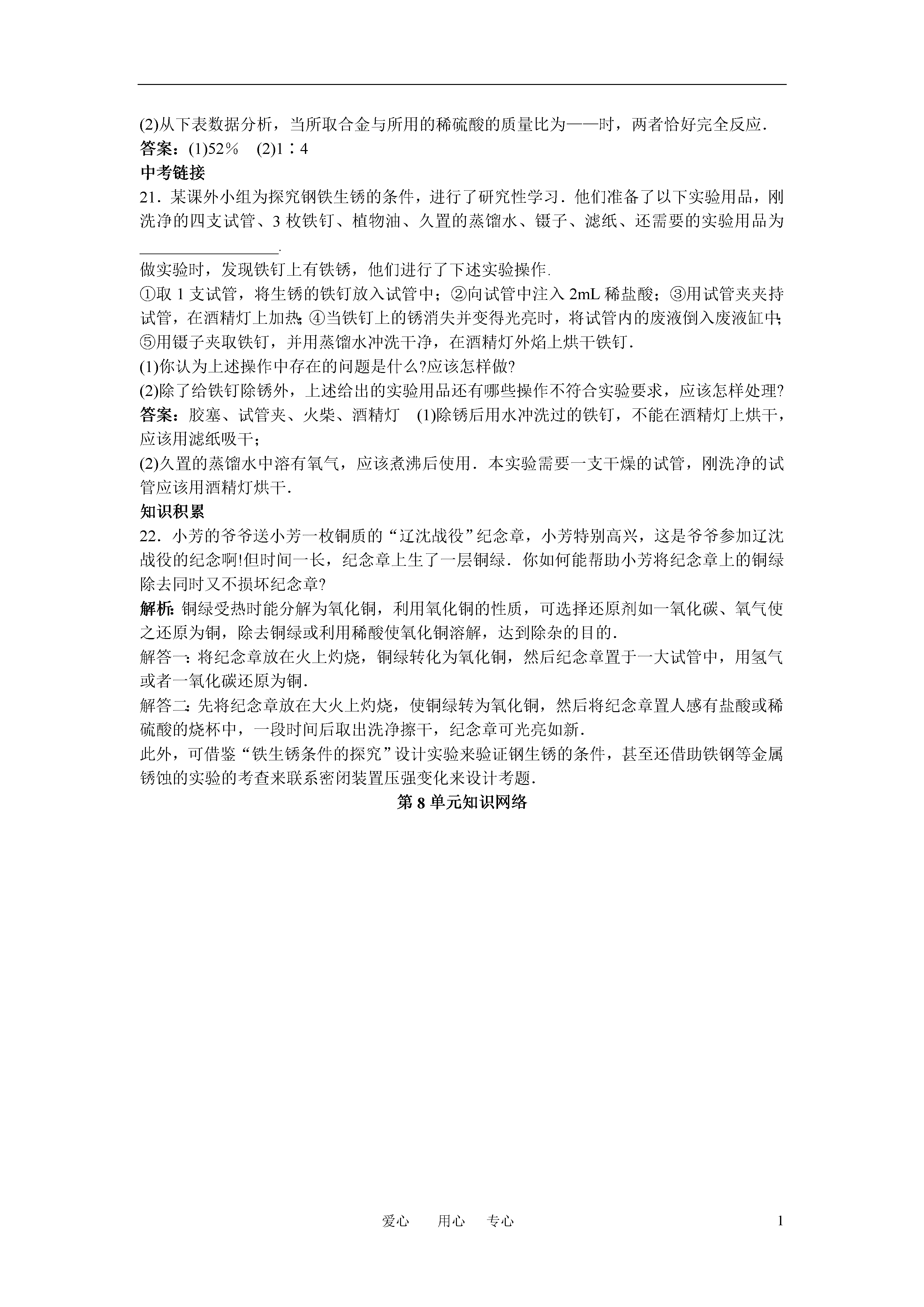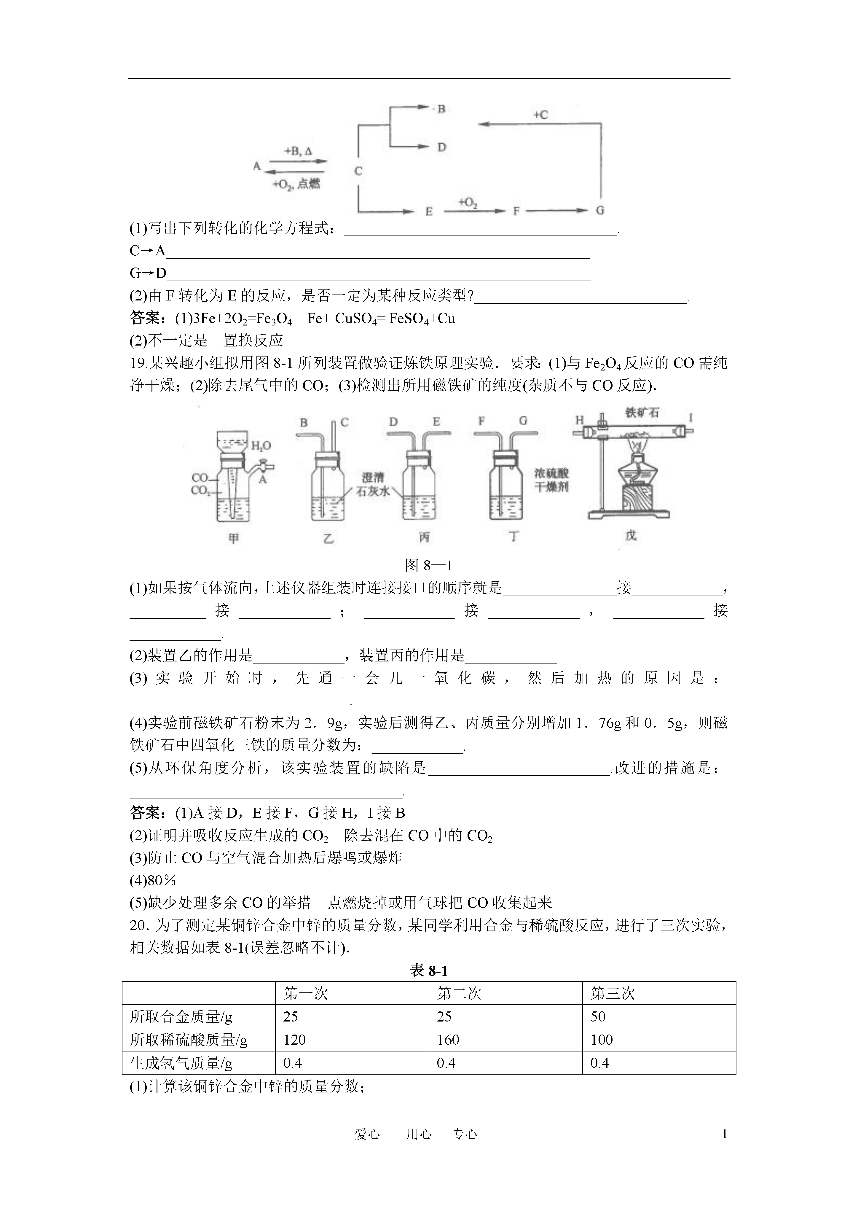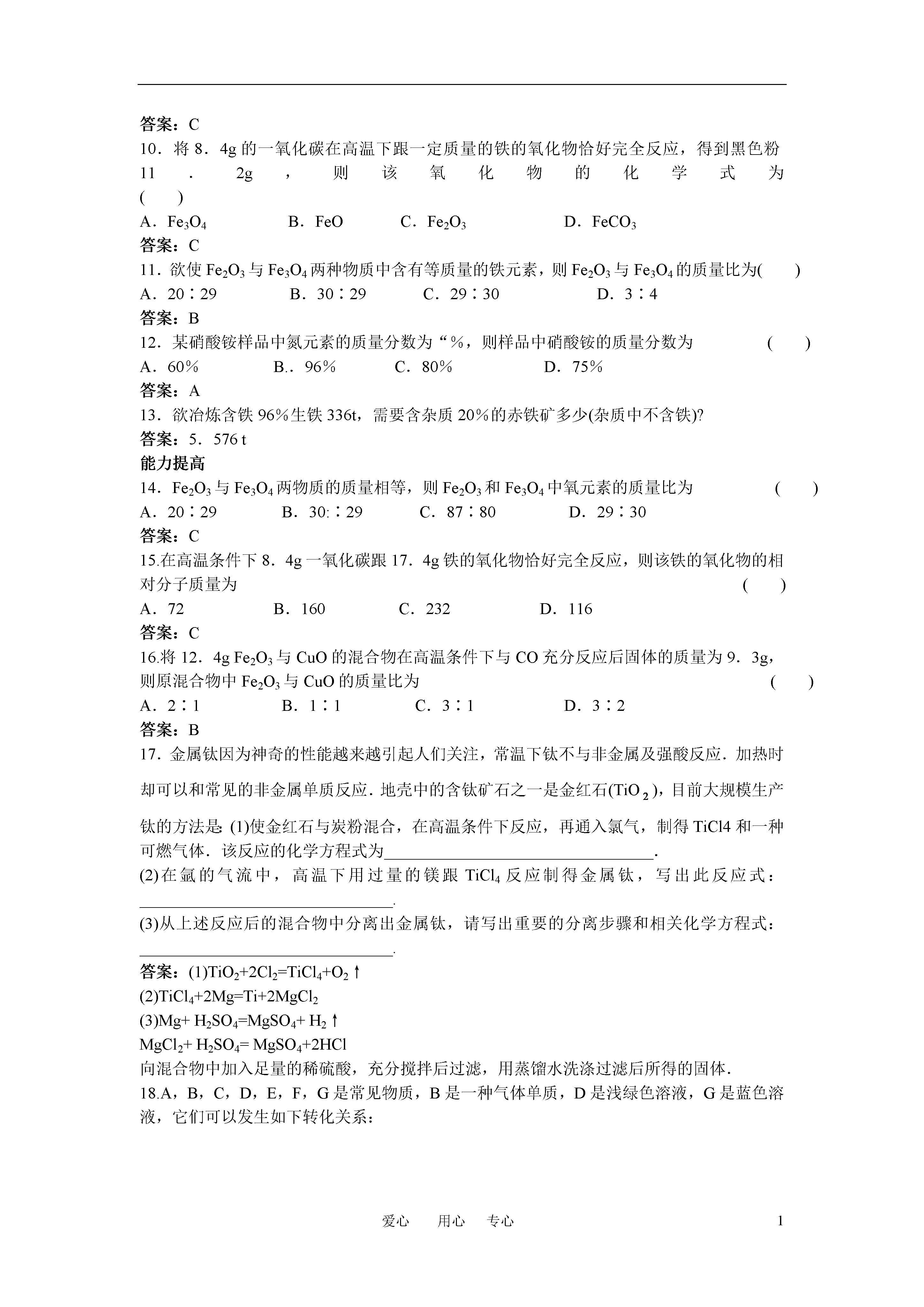 1爱心用心专心练习26金属资源的保护和利用自主学习1.赤铁矿的主要成分是()A.FeOB.Fe2O3C.Fe3O4D.FeCO3答案:B2.为了防止铁受腐蚀,下列采取的措施错误的是()A.在金属铁制品表面涂上油B.在铁制品表面涂上金属锌C.把铁制品浸在水里使它与空气隔绝D.保持铁制品表面的洁净与干燥答案:C3.下列方法不能防止铁制品生锈的是()①涂油②刷油漆③砂纸擦④镀铬⑤水洗⑥烤蓝A.③⑤B.②④⑥C.①②③D.①④答案:A4.①氧气②空气③生铁④赤铁矿⑤石灰石⑥生石灰⑦无烟煤.⑧焦炭,炼铁高炉中投放的基本原料是以上物质的哪几种()A.①③⑤⑦B.②④⑤⑧C.①③⑥D.①②③④答案:B5.下列关于金属资源的说法中,你不赞成的是()A.地球上的金属资源是取之不尽的B.地球上除少数的不活泼的金属如金、银等有单质形式存在外,其余都以化合物形式存在C.防止金属腐蚀,回收利用废旧金属可以保护金属资源和环境D.合理开采矿物,寻找金属代用品都是保护都都金属资源的有效途径答案:A6.下列说法正确的是()A.金属铁、铝、铜均具有银白色的光泽B.早在商朝时期就开始生产和使用铁器C.把生铁炼成钢就是把生铁中的杂质全部氧化除去D.赤铁矿、菱铁矿、黄铜矿、磁铁矿都是铁的合金答案:D基础巩固7.下列说法错误的是()A.铁在潮湿的空气中易生锈B.炼铁的原理是在高温条件下用CO还原铁的氧化物C.焦炭、石灰石、氧化亚铁、赤铁矿均为炼铁的直接原料D.铁与盐酸反应生成氯化亚铁和氢气答案:C8.下列物质为纯净物的是()A.黄铁矿B.菱铁矿C.不锈钢D.含氧质量分数为30%的氧化铁答案:D9.血红蛋白的相对分子质量为68000,含铁的质量分数为3.3%,则平均每个血红蛋白分子中铁原子的数目为()A.1B.2C.4D.3答案:C10.将8.4g的一氧化碳在高温下跟一定质量的铁的氧化物恰好完全反应,得到黑色粉11.2g,则该氧化物的化学式为()A.Fe3O4B.FeOC.Fe2O3D.FeCO3答案:C11.欲使Fe2O3与Fe3O4两种物质中含有等质量的铁元素,则Fe2O3与Fe3O4的质量比为()A.20∶29B.30∶29C.29∶30D.3∶4答案:B12.某硝酸铵样品中氮元素的质量分数为“%,则样品中硝酸铵的质量分数为()A.60%B..96%C.80%D.75%答案:A13.欲冶炼含铁96%生铁336t,需要含杂质20%的赤铁矿多少(杂质中不含铁)?答案:5.576t能力提高14.Fe2O3与Fe3O4两物质的质量相等,则Fe2O3和Fe3O4中氧元素的质量比为()A.20∶29B.30:∶29C.87∶80D.29∶30答案:C15.在高温条件下8.4g一氧化碳跟17.4g铁的氧化物恰好完全反应,则该铁的氧化物的相对分子质量为()A.72B.160C.232D.116答案:C16.将12.4gFe2O3与CuO的混合物在高温条件下与CO充分反应后固体的质量为9.3g,则原混合物中Fe2O3与CuO的质量比为()A.2∶1B.1∶1C.3∶1D.3∶2答案:B17.金属钛因为神奇的性能越来越引起人们关注,常温下钛不与非金属及强酸反应.加热时却可以和常见的非金属单质反应.地壳中的含钛矿石之一是金红石(TiO),目前大规模生产钛的方法是:(1)使金红石与炭粉混合,在高温条件下反应,再通入氯气,制得TiCl4和一种可燃气体.该反应的化学方程式为_________________________________.(2)在氩的气流中,高温下用过量的镁跟TiCl4反应制得金属钛,写出此反应式:_______________________________.(3)从上述反应后的混合物中分离出金属钛,请写出重要的分离步骤和相关化学方程式:_______________________________.答案:(1)TiO2+2Cl2=TiCl4+O2↑(2)TiCl4+2Mg=Ti+2MgCl2(3)Mg+H2SO4=MgSO4+H2↑MgCl2+H2SO4=MgSO4+2HCl向混合物中加入足量的稀硫酸,充分搅拌后过滤,用蒸馏水洗涤过滤后所得的固体.18.A,B,C,D,E,F,G是常见物质,B是一种气体单质,D是浅绿色溶液,G是蓝色溶液,它们可以发生如下转化关系:(1)写出下列转化的化学方程式:____________________________________.C→A________________________________________________________G→D__________