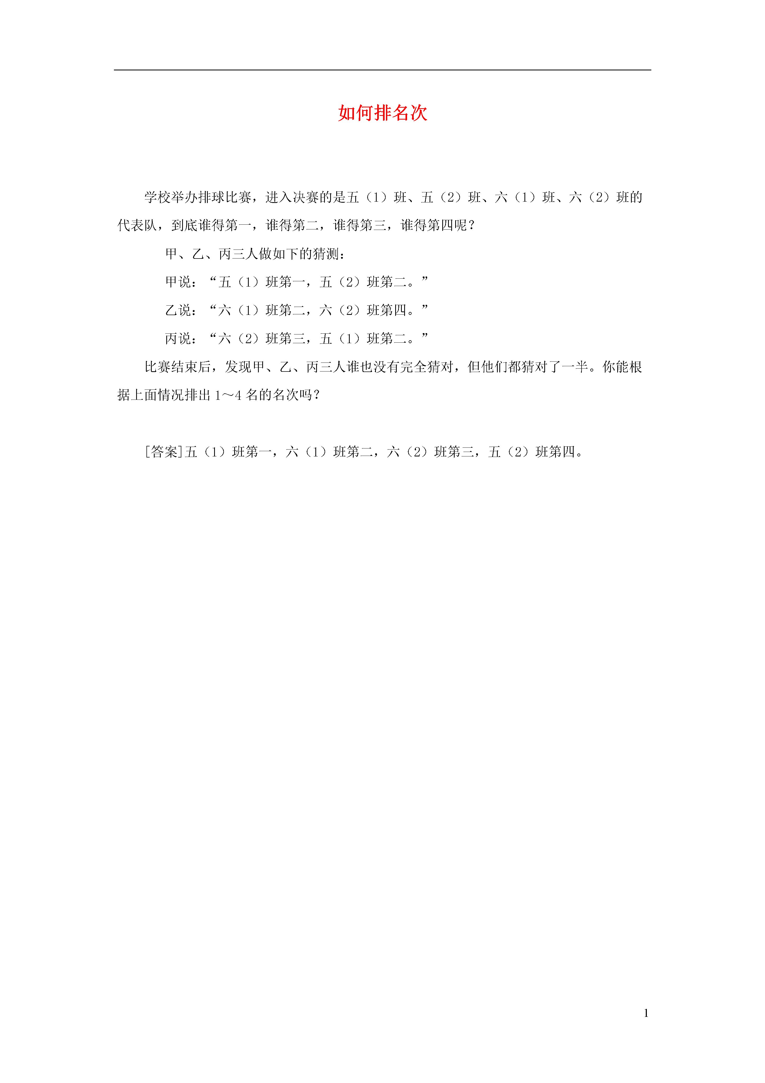 1如何排名次学校举办排球比赛,进入决赛的是五(1)班、五(2)班、六(1)班、六(2)班的代表队,到底谁得第一,谁得第二,谁得第三,谁得第四呢?甲、乙、丙三人做如下的猜测:甲说:“五(1)班第一,五(2)班第二。”乙说:“六(1)班第二,六(2)班第四。”丙说:“六(2)班第三,五(1)班第二。”比赛结束后,发现甲、乙、丙三人谁也没有完全猜对,但他们都猜对了一半。你能根据上面情况排出1~4名的名次吗?[答案]五(1)班第一,六(1)班第二,六(2)班第三,五(2)班第四。