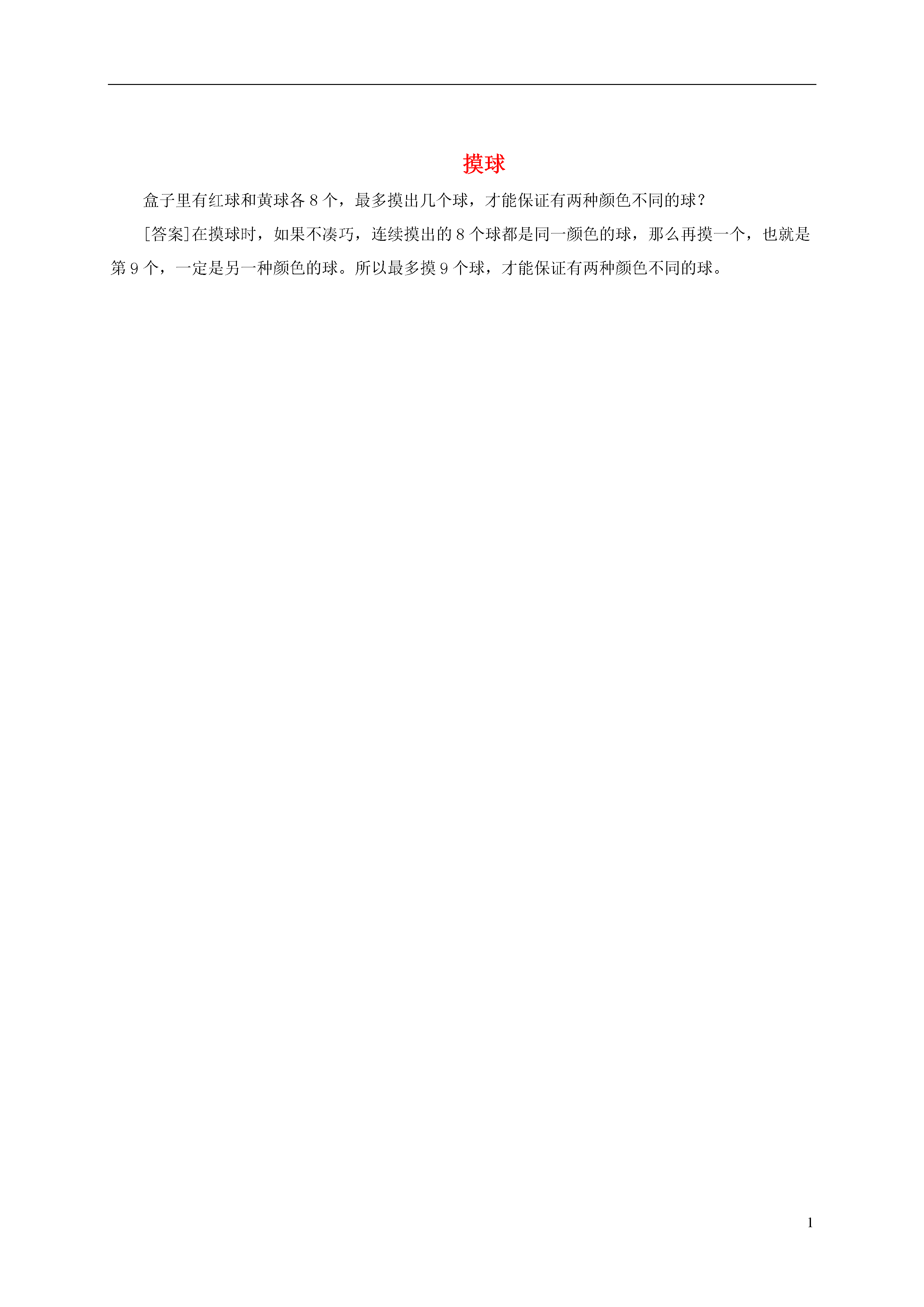 1摸球盒子里有红球和黄球各8个,最多摸出几个球,才能保证有两种颜色不同的球?[答案]在摸球时,如果不凑巧,连续摸出的8个球都是同一颜色的球,那么再摸一个,也就是第9个,一定是另一种颜色的球。所以最多摸9个球,才能保证有两种颜色不同的球。