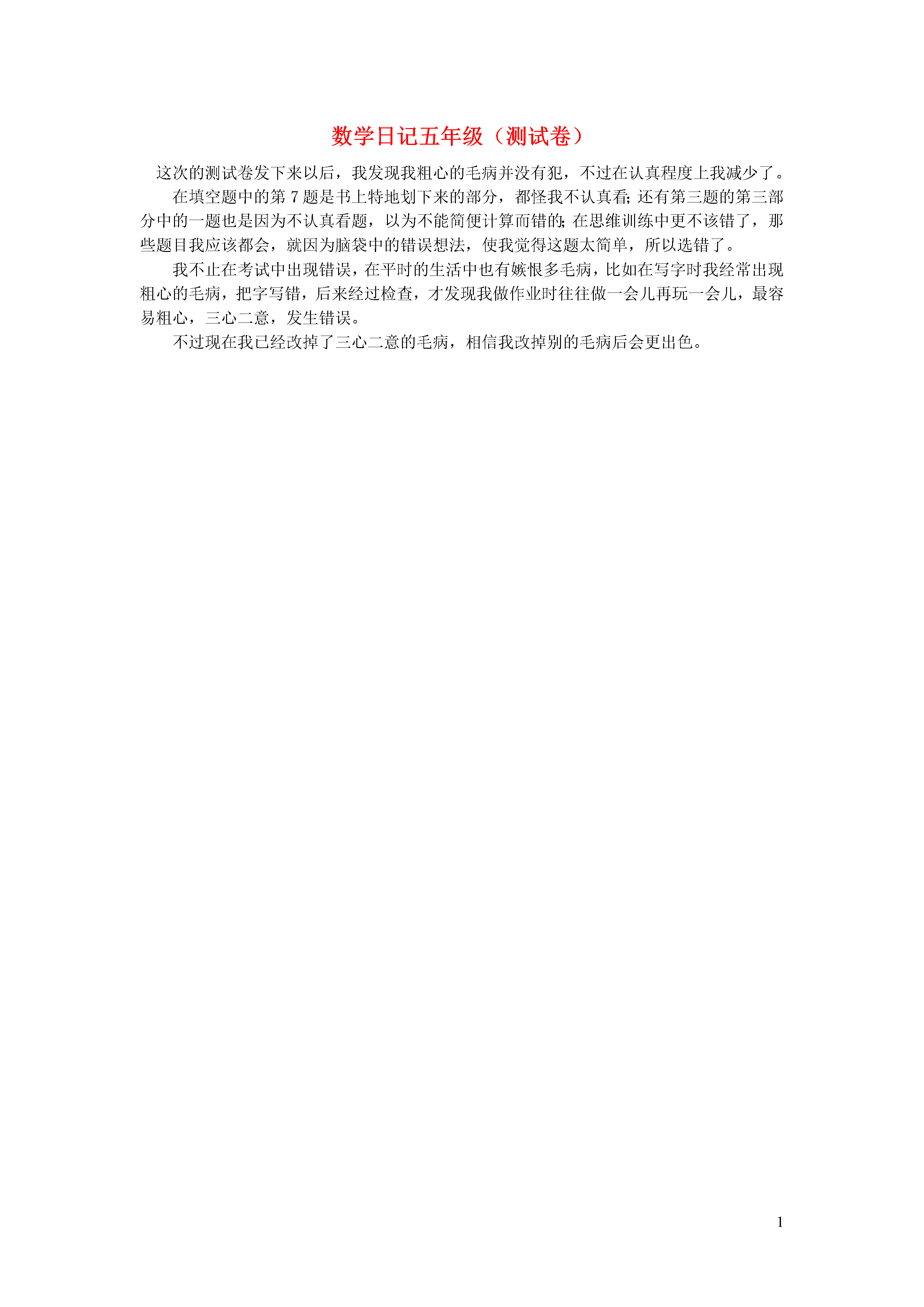 1数学日记五年级(测试卷)这次的测试卷发下来以后,我发现我粗心的毛病并没有犯,不过在认真程度上我减少了。在填空题中的第7题是书上特地划下来的部分,都怪我不认真看;还有第三题的第三部分中的一题也是因为不认真看题,以为不能简便计算而错的;在思维训练中更不该错了,那些题目我应该都会,就因为脑袋中的错误想法,使我觉得这题太简单,所以选错了。我不止在考试中出现错误,在平时的生活中也有嫉恨多毛病,比如在写字时我经常出现粗心的毛病,把字写错,后来经过检查,才发现我做作业时往往做一会儿再玩一会儿,最容易粗心,三心二意,发生错误。不过现在我已经改掉了三心二意的毛病,相信我改掉别的毛病后会更出色。