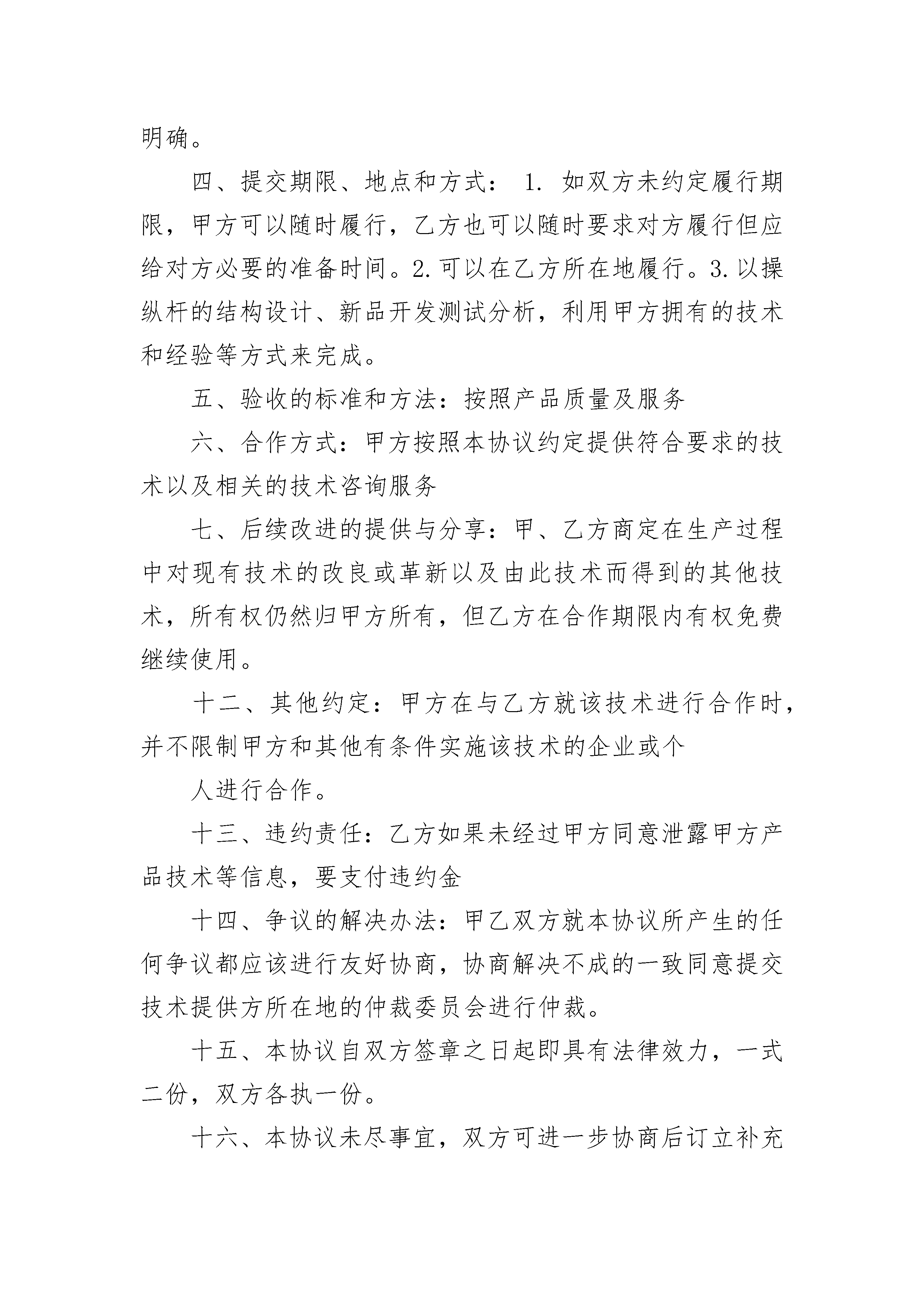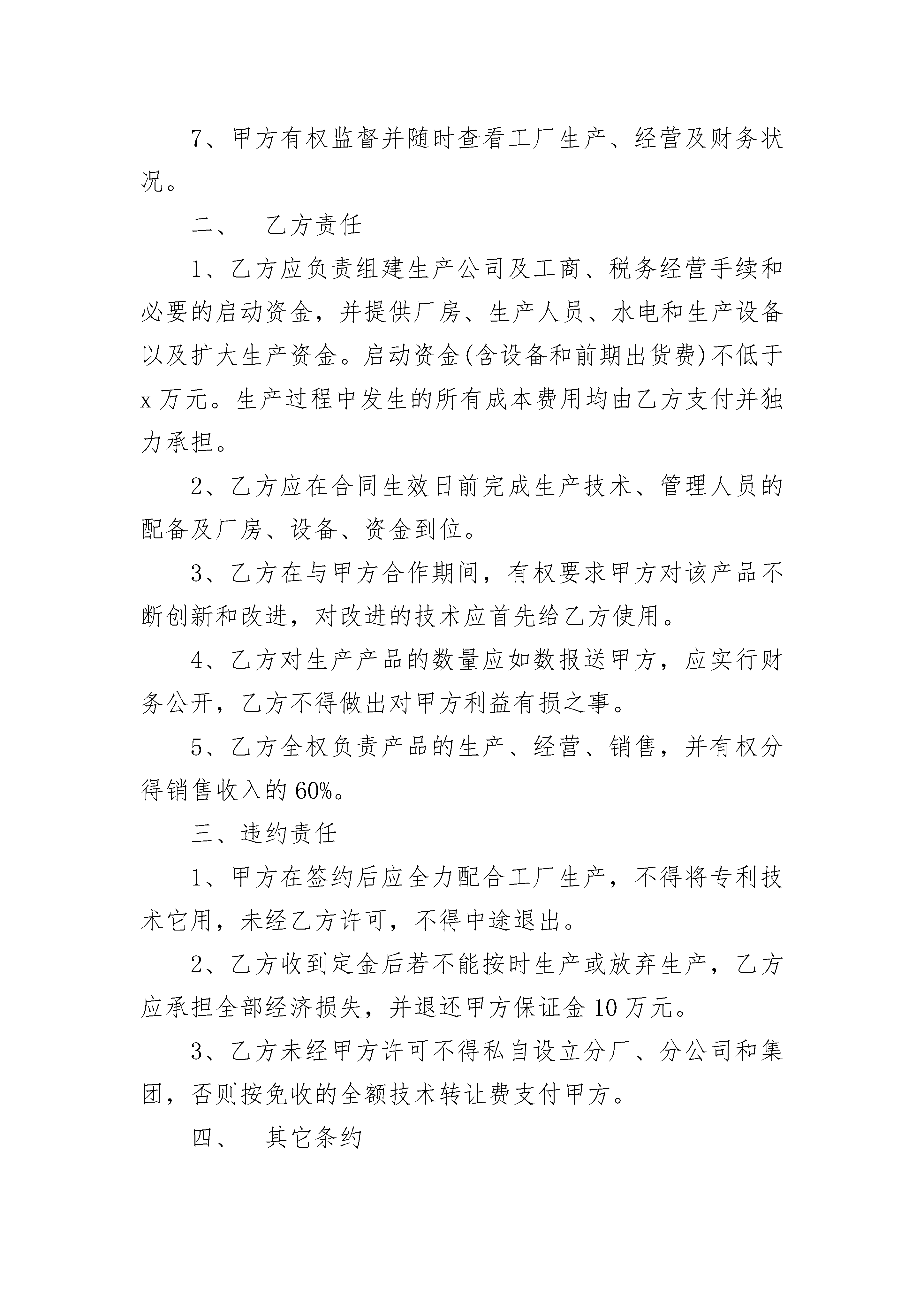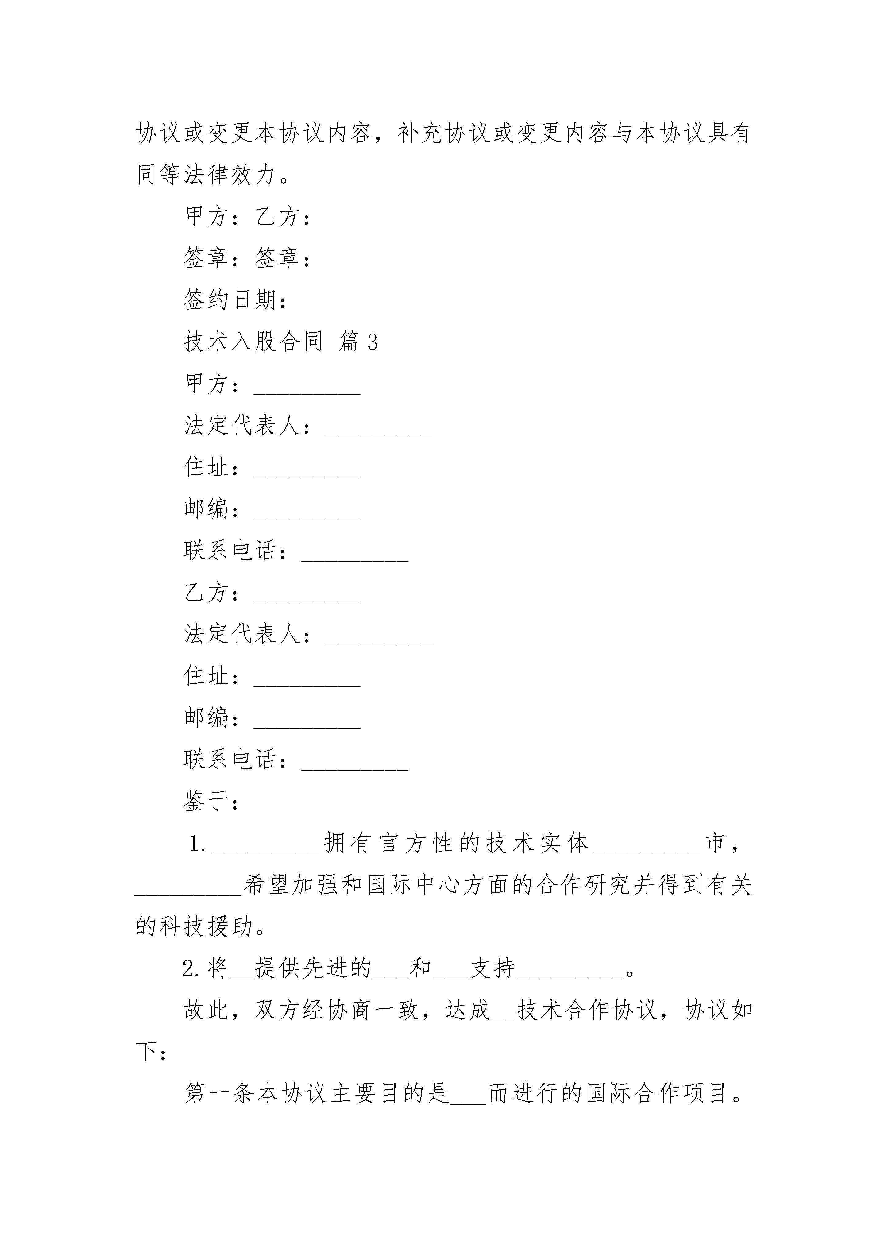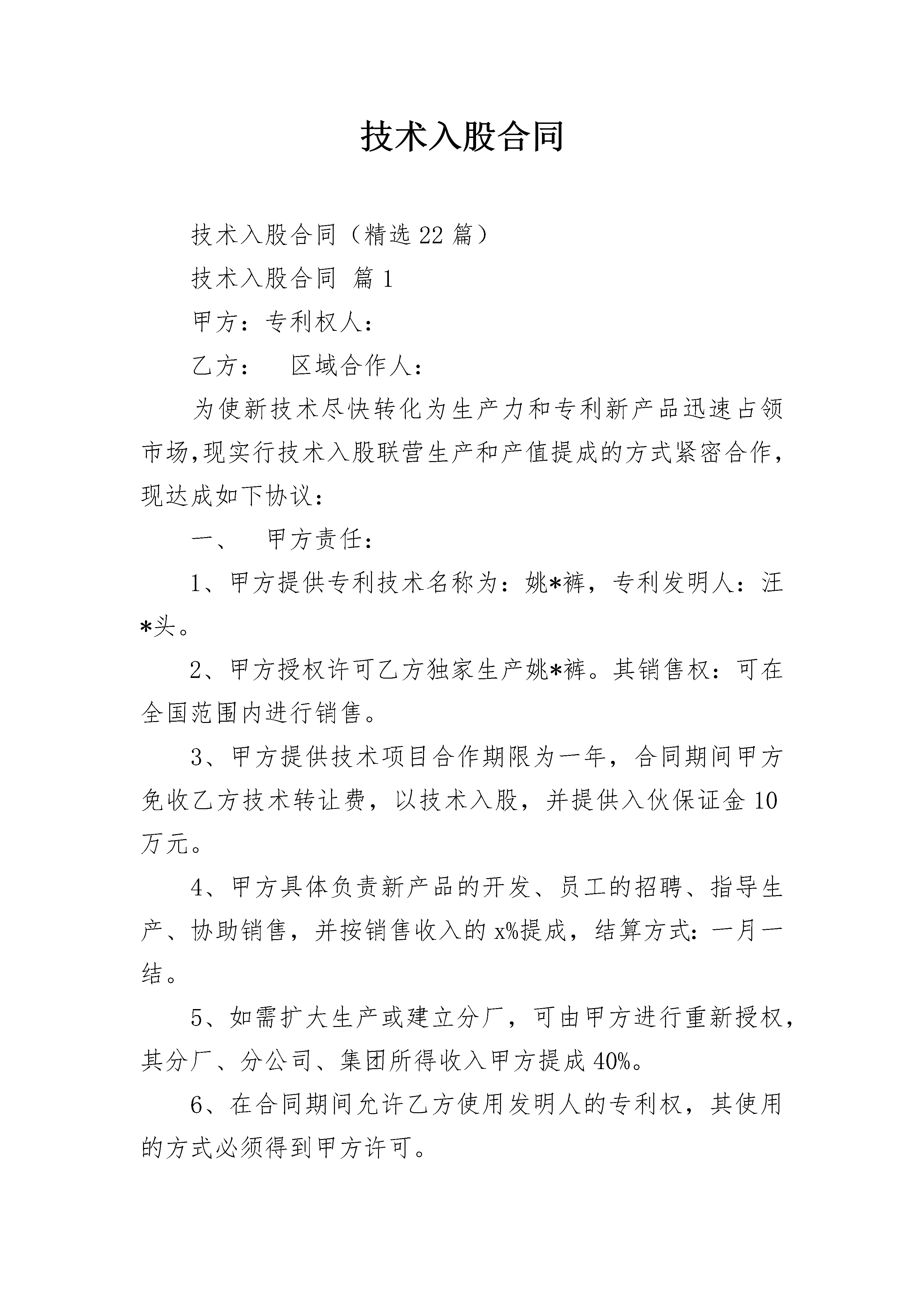 技术入股合同技术入股合同(精选22篇)技术入股合同篇1甲方:专利权人:乙方:区域合作人:为使新技术尽快转化为生产力和专利新产品迅速占领市场,现实行技术入股联营生产和产值提成的方式紧密合作,现达成如下协议:一、甲方责任:1、甲方提供专利技术名称为:姚*裤,专利发明人:汪*头。2、甲方授权许可乙方独家生产姚*裤。其销售权:可在全国范围内进行销售。3、甲方提供技术项目合作期限为一年,合同期间甲方免收乙方技术转让费,以技术入股,并提供入伙保证金10万元。4、甲方具体负责新产品的开发、员工的招聘、指导生产、协助销售,并按销售收入的x%提成,结算方式:一月一结。5、如需扩大生产或建立分厂,可由甲方进行重新授权,其分厂、分公司、集团所得收入甲方提成40%。6、在合同期间允许乙方使用发明人的专利权,其使用的方式必须得到甲方许可。7、甲方有权监督并随时查看工厂生产、经营及财务状况。二、乙方责任1、乙方应负责组建生产公司及工商、税务经营手续和必要的启动资金,并提供厂房、生产人员、水电和生产设备以及扩大生产资金。启动资金(含设备和前期出货费)不低于x万元。生产过程中发生的所有成本费用均由乙方支付并独力承担。2、乙方应在合同生效日前完成生产技术、管理人员的配备及厂房、设备、资金到位。3、乙方在与甲方合作期间,有权要求甲方对该产品不断创新和改进,对改进的技术应首先给乙方使用。4、乙方对生产产品的数量应如数报送甲方,应实行财务公开,乙方不得做出对甲方利益有损之事。5、乙方全权负责产品的生产、经营、销售,并有权分得销售收入的60%。三、违约责任1、甲方在签约后应全力配合工厂生产,不得将专利技术它用,未经乙方许可,不得中途退出。2、乙方收到定金后若不能按时生产或放弃生产,乙方应承担全部经济损失,并退还甲方保证金10万元。3、乙方未经甲方许可不得私自设立分厂、分公司和集团,否则按免收的全额技术转让费支付甲方。四、其它条约1、合同期满,甲方不再提成、参股和销售,乙方应退还甲方的10万元保证金。如继续合作,合作方式另行商议。2、合同期满,乙方如继续使用甲方专利,乙方应向甲方支付一定数额的使用费,费用另议。3、有效期20__年5月日到20__年月日止。4、本合同自双方签字之日起生效。四、备注:甲方:乙方:代表人:代表人:技术入股合同篇2甲方:乙方:鉴于甲方拥有工业__技术,鉴于乙方对甲方__技术的了解,愿意实施甲方的技术及专有技术,并且具备实施该这些技术的物质条件、法人资格和必要的资金,双方经过充分协商,本着平等自愿、互利有偿和诚实信用的原则签订本合同,共同遵照履行。一、甲方所提供技术的内容、要求和工业化开发程度:提供工业操纵杆控制技术,根据甲、乙双方签订的销售合同要求来实施,在小试生产的技术成果二、技术指导的内容:基本标准上的技术协调及产品技术服务三、技术指导的人员由甲方派出,差旅费、咨询服务费有乙方承担,具体费用标准,甲乙双方另行订立协议进一步明确。四、提交期限、地点和方式:1.如双方未约定履行期限,甲方可以随时履行,乙方也可以随时要求对方履行但应给对方必要的准备时间。2.可以在乙方所在地履行。3.以操纵杆的结构设计、新品开发测试分析,利用甲方拥有的技术和经验等方式来完成。五、验收的标准和方法:按照产品质量及服务六、合作方式:甲方按照本协议约定提供符合要求的技术以及相关的技术咨询服务七、后续改进的提供与分享:甲、乙方商定在生产过程中对现有技术的改良或革新以及由此技术而得到的其他技术,所有权仍然归甲方所有,但乙方在合作期限内有权免费继续使用。十二、其他约定:甲方在与乙方就该技术进行合作时,并不限制甲方和其他有条件实施该技术的企业或个人进行合作。十三、违约责任:乙方如果未经过甲方同意泄露甲方产品技术等信息,要支付违约金十四、争议的解决办法:甲乙双方就本协议所产生的任何争议都应该进行友好协商,协商解决不成的一致同意提交技术提供方所在地的仲裁委员会进行仲裁。十五、本协议自双方签章之日起即具有法律效力,一式二份,双方各执一份。十六、本协议未尽事宜,双方可进一步协商后订立补充协议或变更本协议内容,补充协议或变更内容与本协议具有同等法律效力。甲方:乙方:签章:签章:签约日期:技术入股合同篇3甲方:_________法定代表人:_________住址:_________邮编:_________联系电话:_________乙方:_________法定代表人:_________住址:_________邮编:_________联系电话:_________鉴于:1._________拥有官方性的技术实体_________市,_________希望加强和国际中心方面的合作研究并得到有关的科技援助。2.将__提供