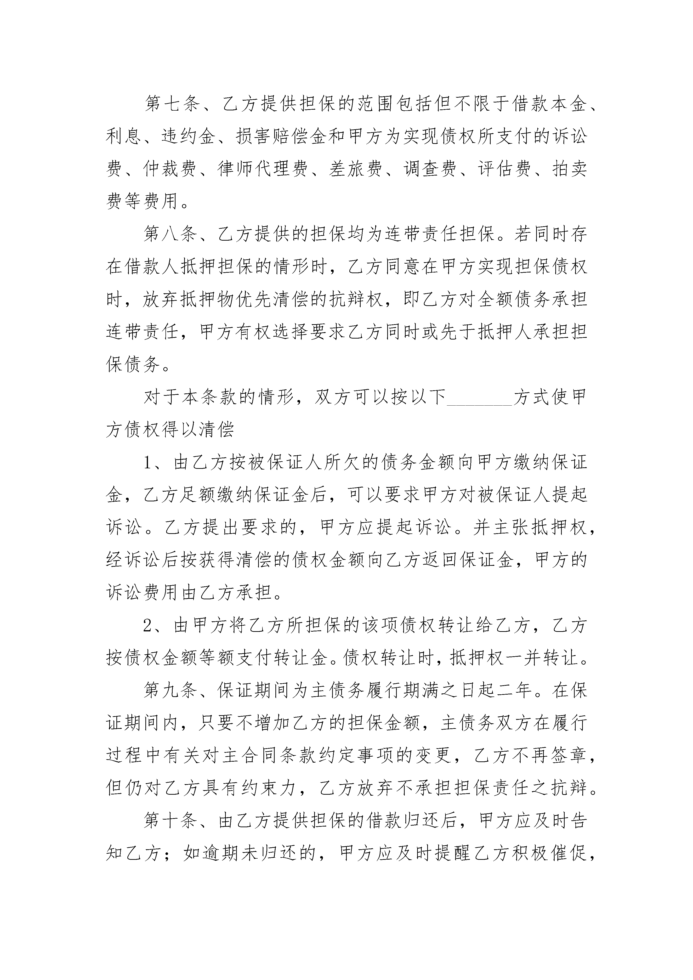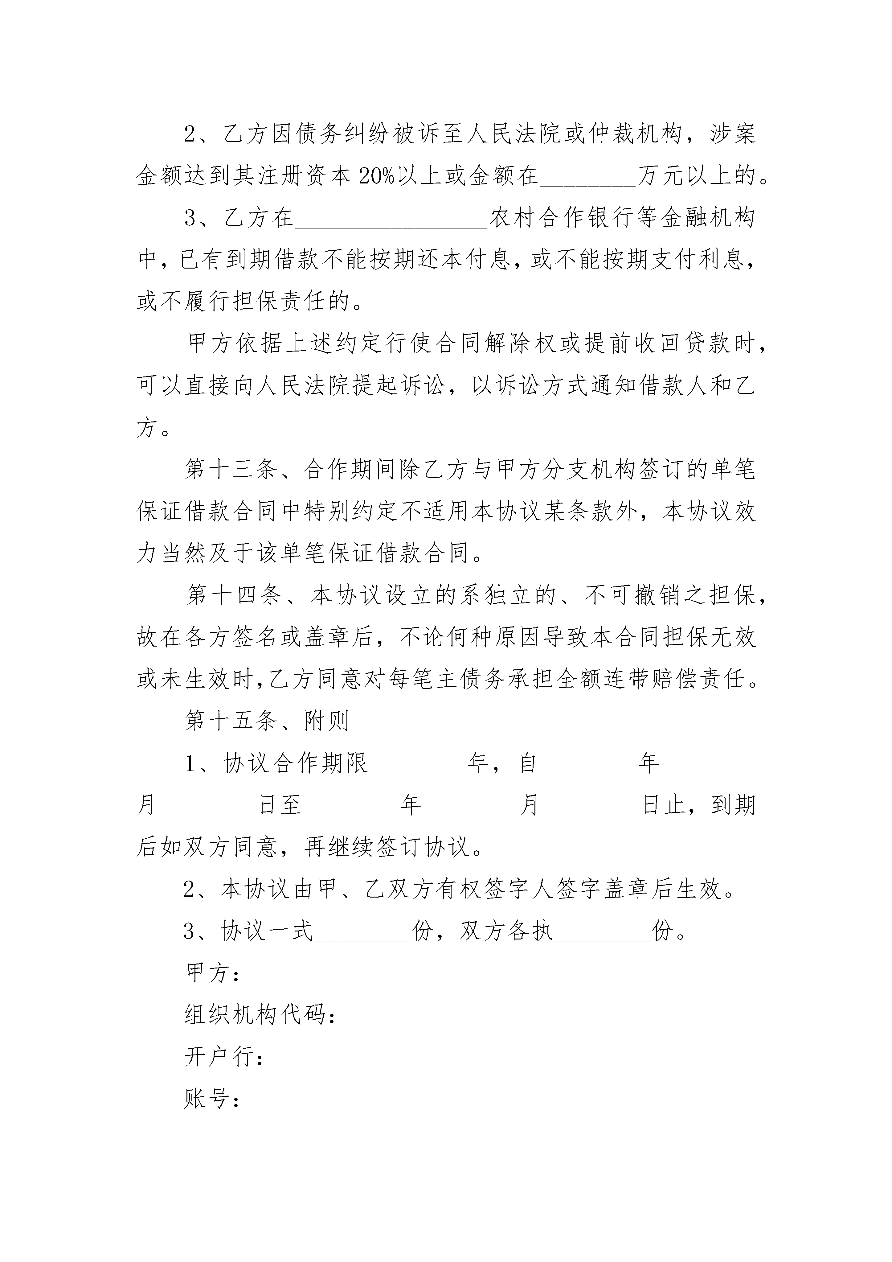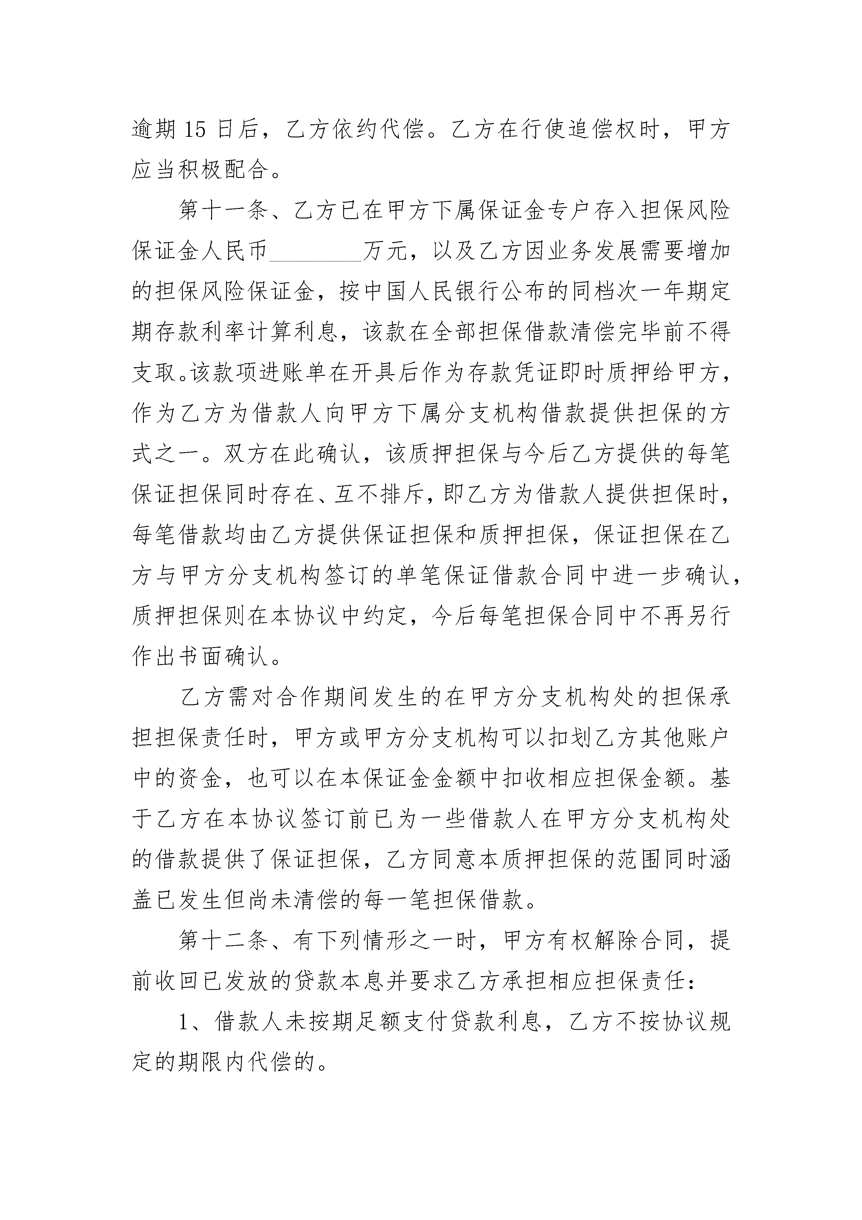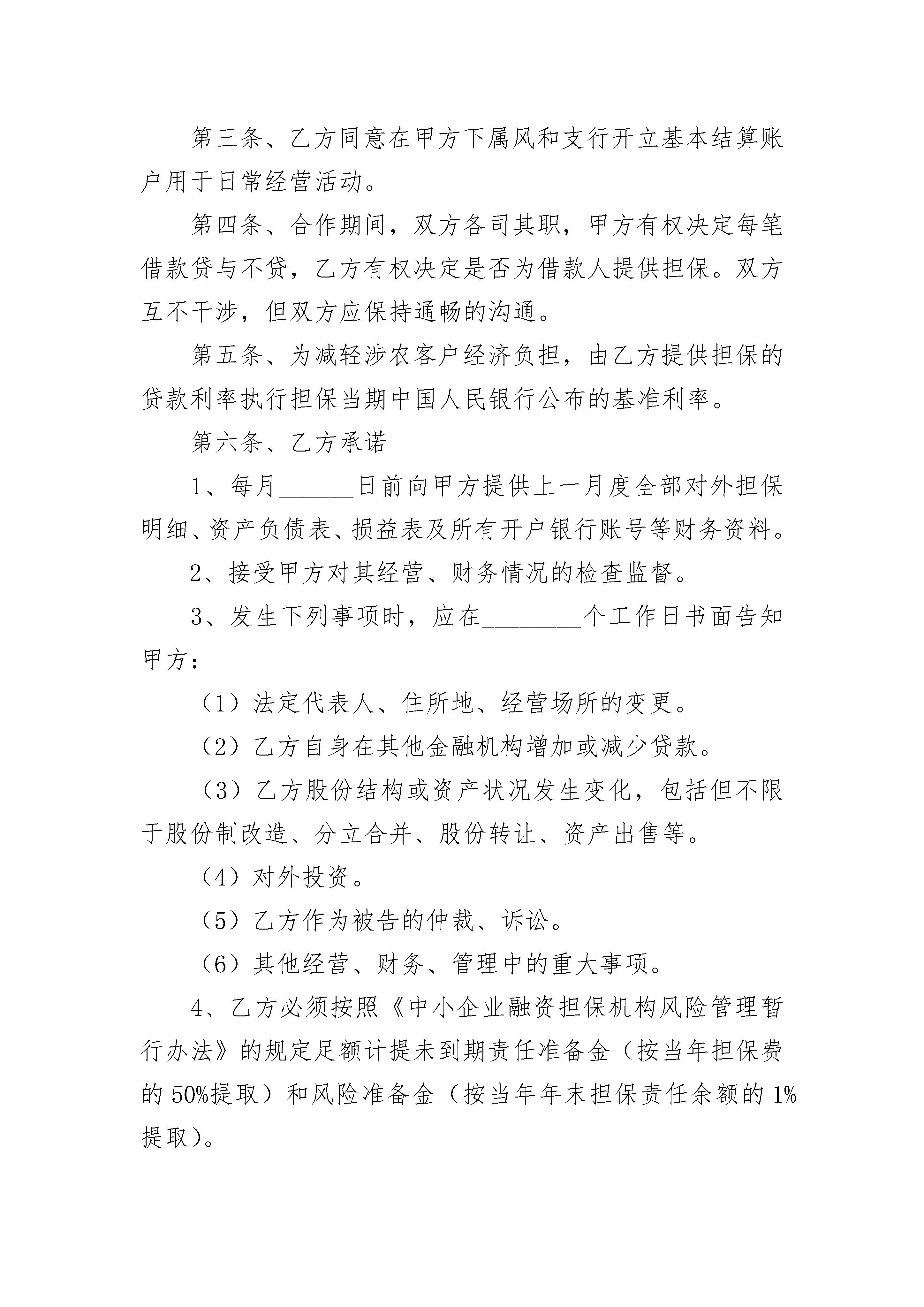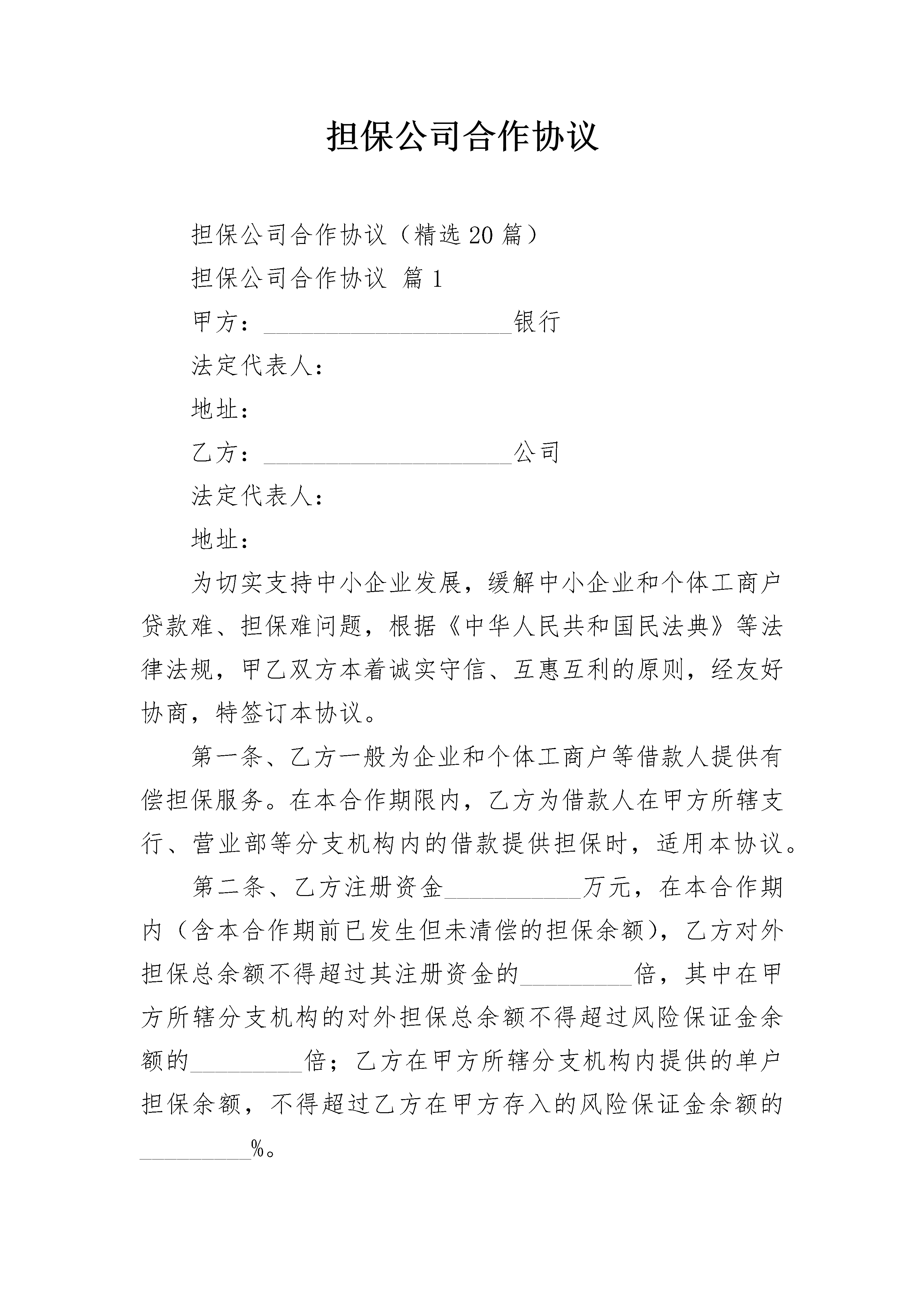 担保公司合作协议担保公司合作协议(精选20篇)担保公司合作协议篇1甲方:____________________银行法定代表人:地址:乙方:____________________公司法定代表人:地址:为切实支持中小企业发展,缓解中小企业和个体工商户贷款难、担保难问题,根据《中华人民共和国民法典》等法律法规,甲乙双方本着诚实守信、互惠互利的原则,经友好协商,特签订本协议。第一条、乙方一般为企业和个体工商户等借款人提供有偿担保服务。在本合作期限内,乙方为借款人在甲方所辖支行、营业部等分支机构内的借款提供担保时,适用本协议。第二条、乙方注册资金___________万元,在本合作期内(含本合作期前已发生但未清偿的担保余额),乙方对外担保总余额不得超过其注册资金的_________倍,其中在甲方所辖分支机构的对外担保总余额不得超过风险保证金余额的_________倍;乙方在甲方所辖分支机构内提供的单户担保余额,不得超过乙方在甲方存入的风险保证金余额的_________%。第三条、乙方同意在甲方下属风和支行开立基本结算账户用于日常经营活动。第四条、合作期间,双方各司其职,甲方有权决定每笔借款贷与不贷,乙方有权决定是否为借款人提供担保。双方互不干涉,但双方应保持通畅的沟通。第五条、为减轻涉农客户经济负担,由乙方提供担保的贷款利率执行担保当期中国人民银行公布的基准利率。第六条、乙方承诺1、每月______日前向甲方提供上一月度全部对外担保明细、资产负债表、损益表及所有开户银行账号等财务资料。2、接受甲方对其经营、财务情况的检查监督。3、发生下列事项时,应在________个工作日书面告知甲方:(1)法定代表人、住所地、经营场所的变更。(2)乙方自身在其他金融机构增加或减少贷款。(3)乙方股份结构或资产状况发生变化,包括但不限于股份制改造、分立合并、股份转让、资产出售等。(4)对外投资。(5)乙方作为被告的仲裁、诉讼。(6)其他经营、财务、管理中的重大事项。4、乙方必须按照《中小企业融资担保机构风险管理暂行办法》的规定足额计提未到期责任准备金(按当年担保费的50%提取)和风险准备金(按当年年末担保责任余额的1%提取)。第七条、乙方提供担保的范围包括但不限于借款本金、利息、违约金、损害赔偿金和甲方为实现债权所支付的诉讼费、仲裁费、律师代理费、差旅费、调查费、评估费、拍卖费等费用。第八条、乙方提供的担保均为连带责任担保。若同时存在借款人抵押担保的情形时,乙方同意在甲方实现担保债权时,放弃抵押物优先清偿的抗辩权,即乙方对全额债务承担连带责任,甲方有权选择要求乙方同时或先于抵押人承担担保债务。对于本条款的情形,双方可以按以下_______方式使甲方债权得以清偿1、由乙方按被保证人所欠的债务金额向甲方缴纳保证金,乙方足额缴纳保证金后,可以要求甲方对被保证人提起诉讼。乙方提出要求的,甲方应提起诉讼。并主张抵押权,经诉讼后按获得清偿的债权金额向乙方返回保证金,甲方的诉讼费用由乙方承担。2、由甲方将乙方所担保的该项债权转让给乙方,乙方按债权金额等额支付转让金。债权转让时,抵押权一并转让。第九条、保证期间为主债务履行期满之日起二年。在保证期间内,只要不增加乙方的担保金额,主债务双方在履行过程中有关对主合同条款约定事项的变更,乙方不再签章,但仍对乙方具有约束力,乙方放弃不承担担保责任之抗辩。第十条、由乙方提供担保的借款归还后,甲方应及时告知乙方;如逾期未归还的,甲方应及时提醒乙方积极催促,逾期15日后,乙方依约代偿。乙方在行使追偿权时,甲方应当积极配合。第十一条、乙方已在甲方下属保证金专户存入担保风险保证金人民币________万元,以及乙方因业务发展需要增加的担保风险保证金,按中国人民银行公布的同档次一年期定期存款利率计算利息,该款在全部担保借款清偿完毕前不得支取。该款项进账单在开具后作为存款凭证即时质押给甲方,作为乙方为借款人向甲方下属分支机构借款提供担保的方式之一。双方在此确认,该质押担保与今后乙方提供的每笔保证担保同时存在、互不排斥,即乙方为借款人提供担保时,每笔借款均由乙方提供保证担保和质押担保,保证担保在乙方与甲方分支机构签订的单笔保证借款合同中进一步确认,质押担保则在本协议中约定,今后每笔担保合同中不再另行作出书面确认。乙方需对合作期间发生的在甲方分支机构处的担保承担担保责任时,甲方或甲方分支机构可以扣划乙方其他账户中的资金,也可以在本保证金金额中扣收相应担保金额。基于乙方在本协议签订前已为一些借款人在甲方分支机构处的借款提供了保证担保,乙方同意本质押担保的范围同时涵盖已发生但尚未清偿的每一笔担保借款。第十二条、有下列情形之一时,甲方有权解除合同,提前收回已发放的贷款本息并要求乙方承担相应担保责任:1、借款人未按期足额支付贷款利息,乙方不按协