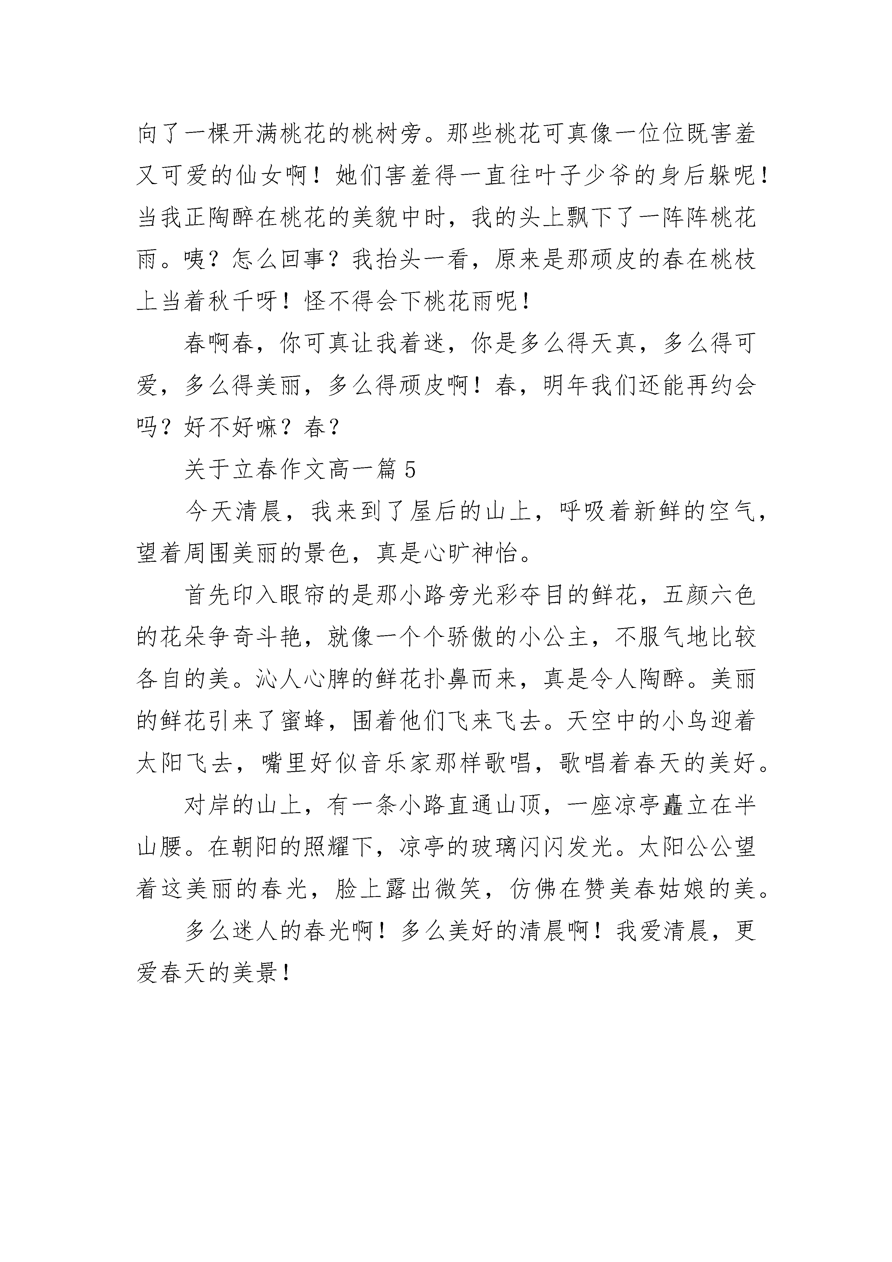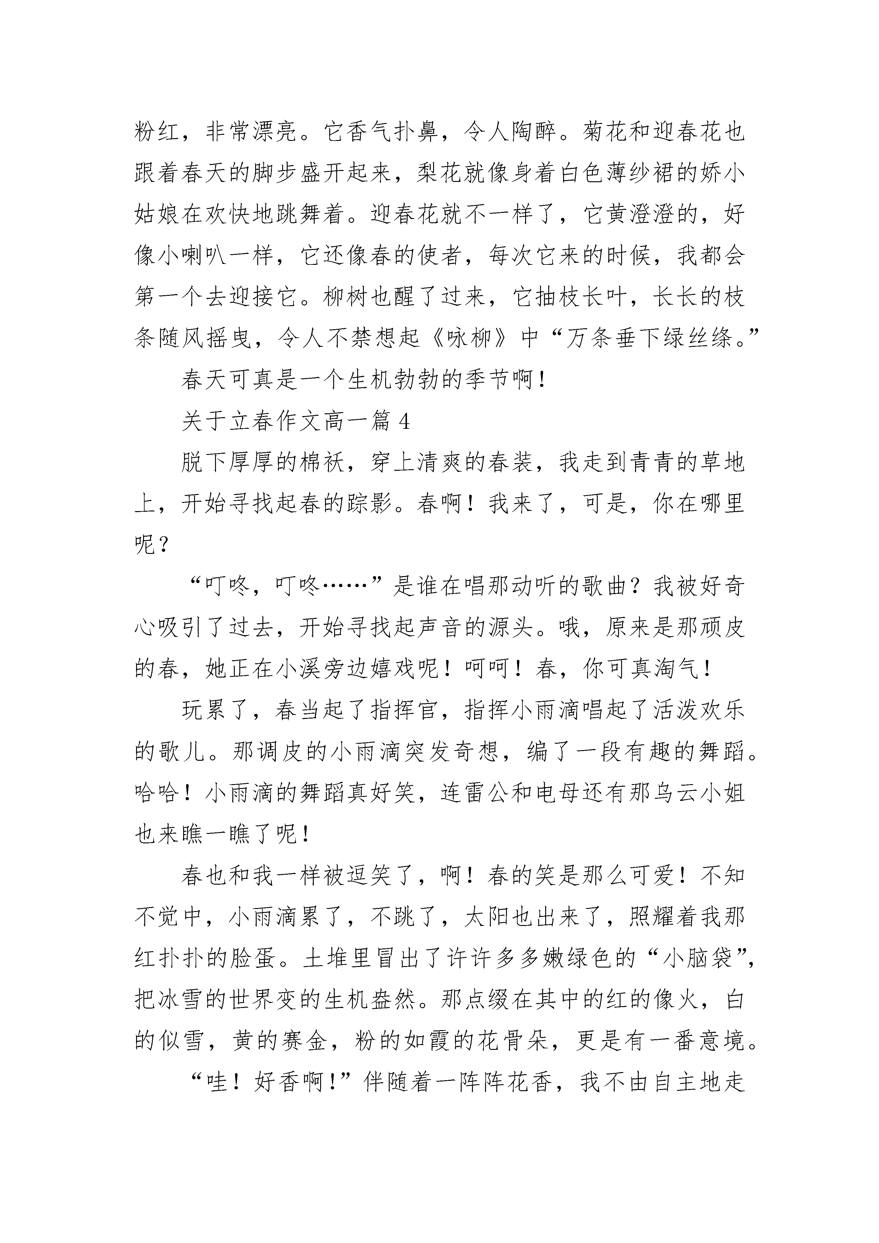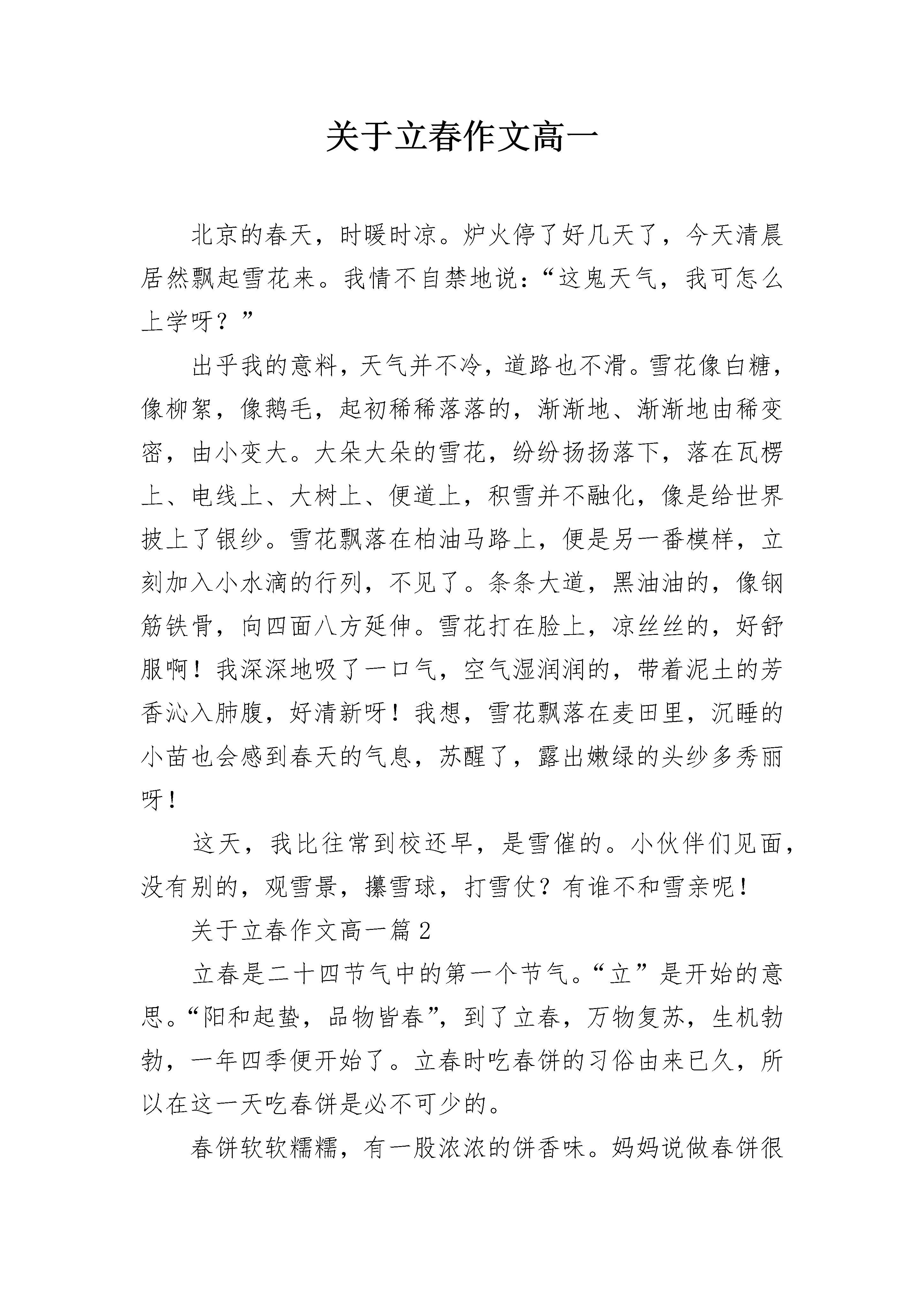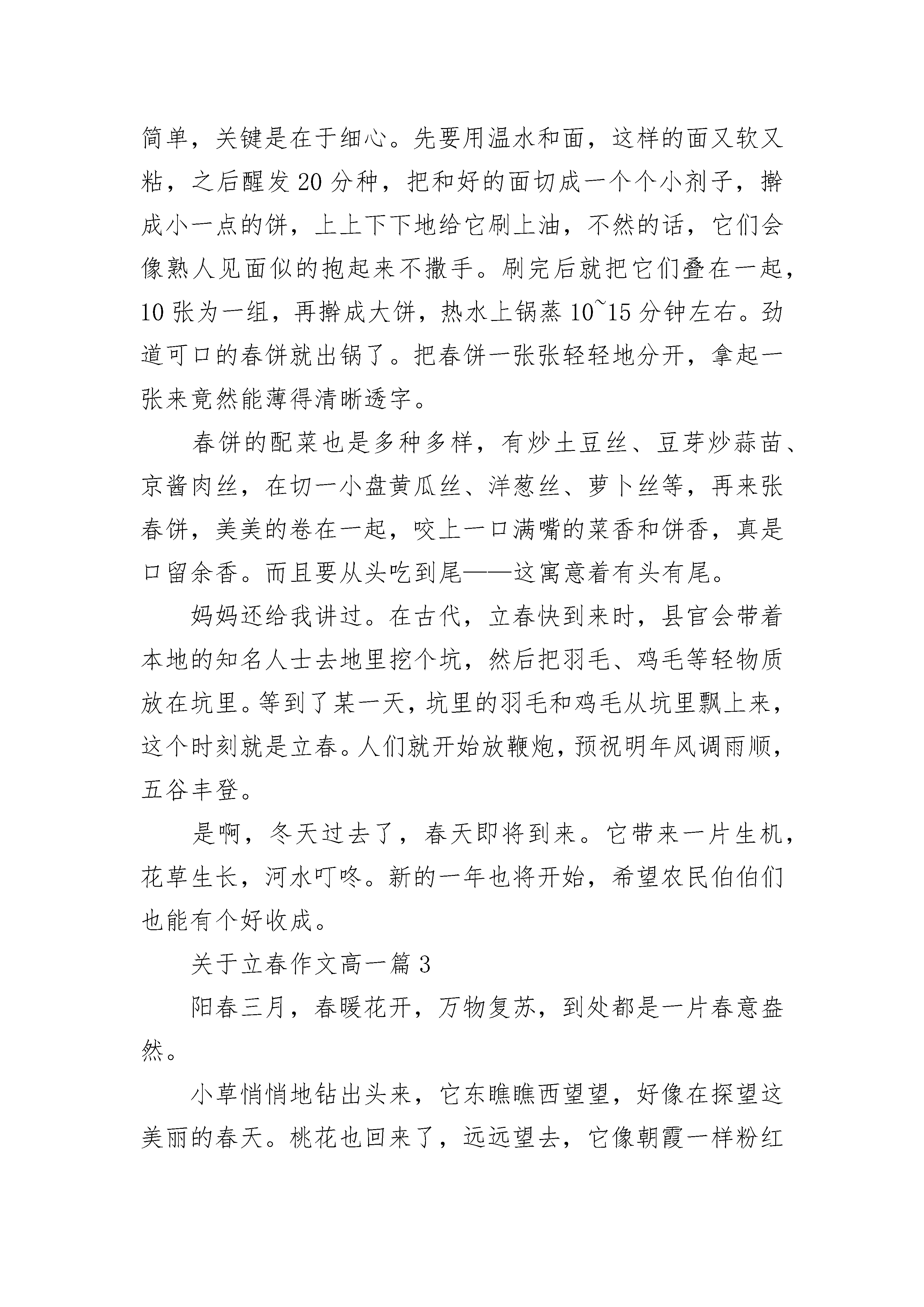 关于立春作文高一北京的春天,时暖时凉。炉火停了好几天了,今天清晨居然飘起雪花来。我情不自禁地说:“这鬼天气,我可怎么上学呀?”出乎我的意料,天气并不冷,道路也不滑。雪花像白糖,像柳絮,像鹅毛,起初稀稀落落的,渐渐地、渐渐地由稀变密,由小变大。大朵大朵的雪花,纷纷扬扬落下,落在瓦楞上、电线上、大树上、便道上,积雪并不融化,像是给世界披上了银纱。雪花飘落在柏油马路上,便是另一番模样,立刻加入小水滴的行列,不见了。条条大道,黑油油的,像钢筋铁骨,向四面八方延伸。雪花打在脸上,凉丝丝的,好舒服啊!我深深地吸了一口气,空气湿润润的,带着泥土的芳香沁入肺腹,好清新呀!我想,雪花飘落在麦田里,沉睡的小苗也会感到春天的气息,苏醒了,露出嫩绿的头纱多秀丽呀!这天,我比往常到校还早,是雪催的。小伙伴们见面,没有别的,观雪景,攥雪球,打雪仗?有谁不和雪亲呢!关于立春作文高一篇2立春是二十四节气中的第一个节气。“立”是开始的意思。“阳和起蛰,品物皆春”,到了立春,万物复苏,生机勃勃,一年四季便开始了。立春时吃春饼的习俗由来已久,所以在这一天吃春饼是必不可少的。春饼软软糯糯,有一股浓浓的饼香味。妈妈说做春饼很简单,关键是在于细心。先要用温水和面,这样的面又软又粘,之后醒发20分种,把和好的面切成一个个小剂子,擀成小一点的饼,上上下下地给它刷上油,不然的话,它们会像熟人见面似的抱起来不撒手。刷完后就把它们叠在一起,10张为一组,再擀成大饼,热水上锅蒸10~15分钟左右。劲道可口的春饼就出锅了。把春饼一张张轻轻地分开,拿起一张来竟然能薄得清晰透字。春饼的配菜也是多种多样,有炒土豆丝、豆芽炒蒜苗、京酱肉丝,在切一小盘黄瓜丝、洋葱丝、萝卜丝等,再来张春饼,美美的卷在一起,咬上一口满嘴的菜香和饼香,真是口留余香。而且要从头吃到尾——这寓意着有头有尾。妈妈还给我讲过。在古代,立春快到来时,县官会带着本地的知名人士去地里挖个坑,然后把羽毛、鸡毛等轻物质放在坑里。等到了某一天,坑里的羽毛和鸡毛从坑里飘上来,这个时刻就是立春。人们就开始放鞭炮,预祝明年风调雨顺,五谷丰登。是啊,冬天过去了,春天即将到来。它带来一片生机,花草生长,河水叮咚。新的一年也将开始,希望农民伯伯们也能有个好收成。关于立春作文高一篇3阳春三月,春暖花开,万物复苏,到处都是一片春意盎然。小草悄悄地钻出头来,它东瞧瞧西望望,好像在探望这美丽的春天。桃花也回来了,远远望去,它像朝霞一样粉红粉红,非常漂亮。它香气扑鼻,令人陶醉。菊花和迎春花也跟着春天的脚步盛开起来,梨花就像身着白色薄纱裙的娇小姑娘在欢快地跳舞着。迎春花就不一样了,它黄澄澄的,好像小喇叭一样,它还像春的使者,每次它来的时候,我都会第一个去迎接它。柳树也醒了过来,它抽枝长叶,长长的枝条随风摇曳,令人不禁想起《咏柳》中“万条垂下绿丝绦。”春天可真是一个生机勃勃的季节啊!关于立春作文高一篇4脱下厚厚的棉袄,穿上清爽的春装,我走到青青的草地上,开始寻找起春的踪影。春啊!我来了,可是,你在哪里呢?“叮咚,叮咚……”是谁在唱那动听的歌曲?我被好奇心吸引了过去,开始寻找起声音的源头。哦,原来是那顽皮的春,她正在小溪旁边嬉戏呢!呵呵!春,你可真淘气!玩累了,春当起了指挥官,指挥小雨滴唱起了活泼欢乐的歌儿。那调皮的小雨滴突发奇想,编了一段有趣的舞蹈。哈哈!小雨滴的舞蹈真好笑,连雷公和电母还有那乌云小姐也来瞧一瞧了呢!春也和我一样被逗笑了,啊!春的笑是那么可爱!不知不觉中,小雨滴累了,不跳了,太阳也出来了,照耀着我那红扑扑的脸蛋。土堆里冒出了许许多多嫩绿色的“小脑袋”,把冰雪的世界变的生机盎然。那点缀在其中的红的像火,白的似雪,黄的赛金,粉的如霞的花骨朵,更是有一番意境。“哇!好香啊!”伴随着一阵阵花香,我不由自主地走向了一棵开满桃花的桃树旁。那些桃花可真像一位位既害羞又可爱的仙女啊!她们害羞得一直往叶子少爷的身后躲呢!当我正陶醉在桃花的美貌中时,我的头上飘下了一阵阵桃花雨。咦?怎么回事?我抬头一看,原来是那顽皮的春在桃枝上当着秋千呀!怪不得会下桃花雨呢!春啊春,你可真让我着迷,你是多么得天真,多么得可爱,多么得美丽,多么得顽皮啊!春,明年我们还能再约会吗?好不好嘛?春?关于立春作文高一篇5今天清晨,我来到了屋后的山上,呼吸着新鲜的空气,望着周围美丽的景色,真是心旷神怡。首先印入眼帘的是那小路旁光彩夺目的鲜花,五颜六色的花朵争奇斗艳,就像一个个骄傲的小公主,不服气地比较各自的美。沁人心脾的鲜花扑鼻而来,真是令人陶醉。美丽的鲜花引来了蜜蜂,围着他们飞来飞去。天空中的小鸟迎着太阳飞去,嘴里好似音乐家那样歌唱,歌唱着春天的美好。对岸的山上,有一条小路直通山顶,一座凉亭矗立在半山腰。在朝阳的照耀下,凉亭的玻璃闪闪发光。太阳公公望着这美丽的春光,脸上露出微笑,仿佛在赞