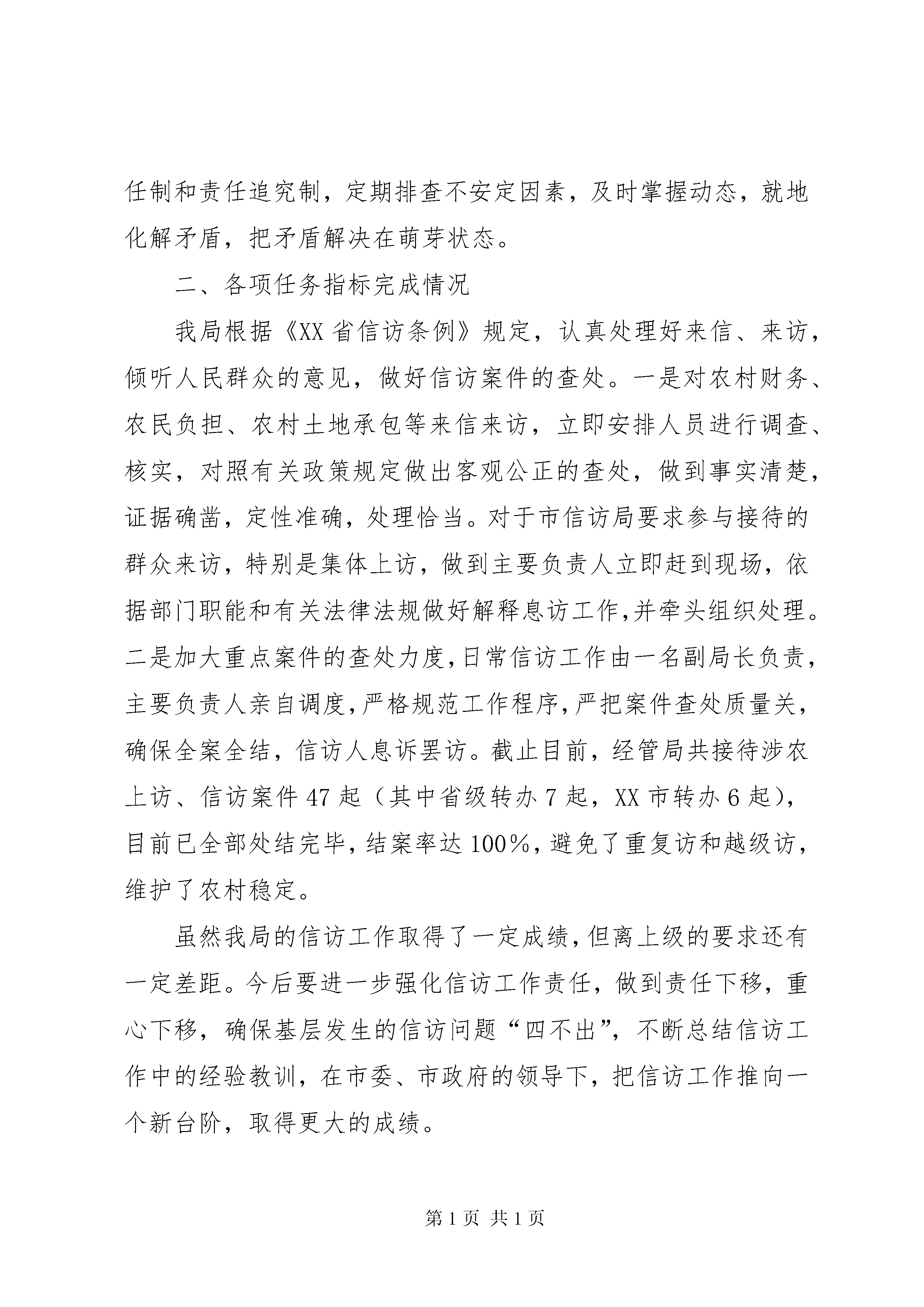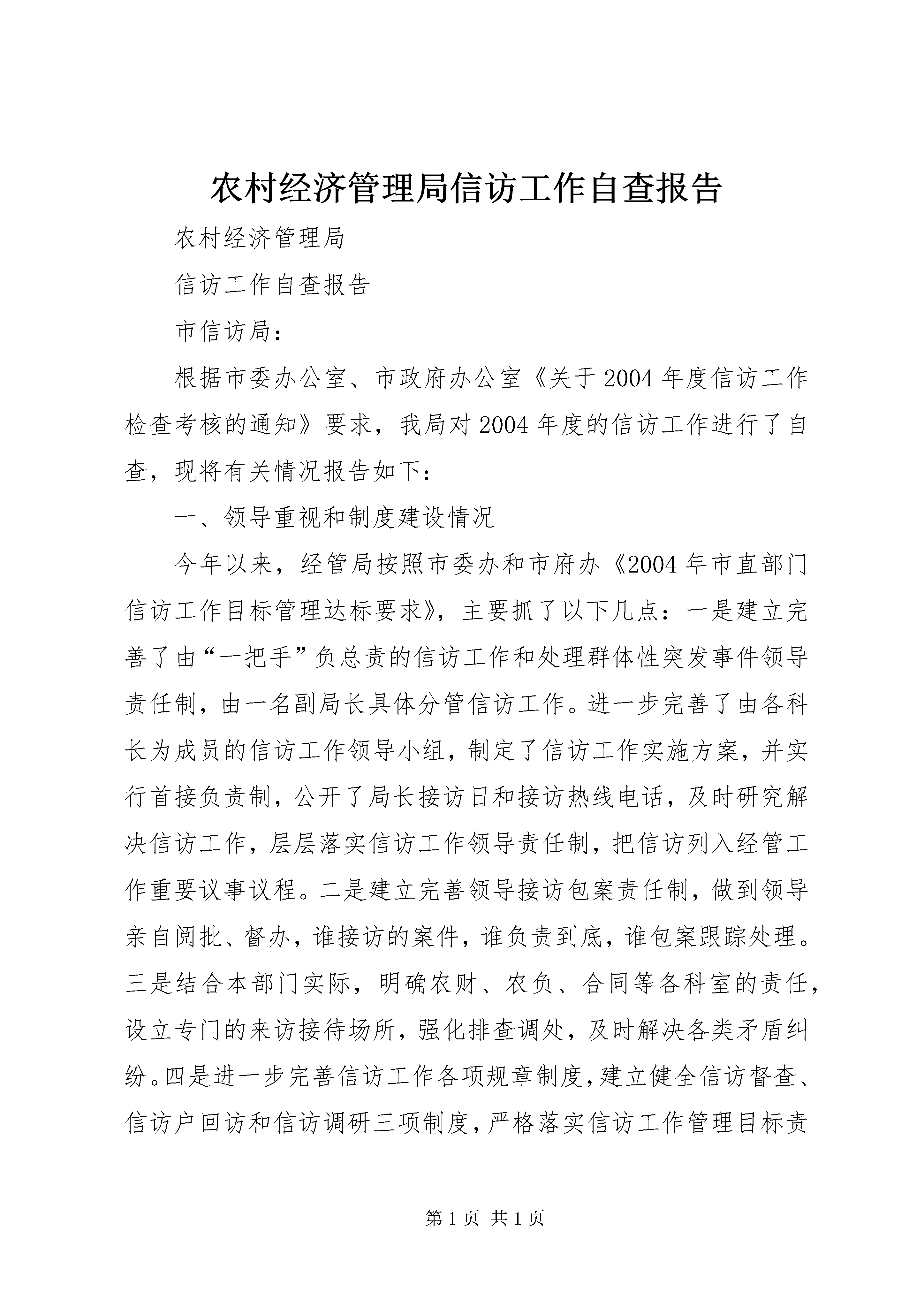 农村经济管理局信访工作自查报告农村经济管理局信访工作自查报告市信访局:根据市委办公室、市政府办公室《关于2004年度信访工作检查考核的通知》要求,我局对2004年度的信访工作进行了自查,现将有关情况报告如下:一、领导重视和制度建设情况今年以来,经管局按照市委办和市府办《2004年市直部门信访工作目标管理达标要求》,主要抓了以下几点:一是建立完善了由“一把手”负总责的信访工作和处理群体性突发事件领导责任制,由一名副局长具体分管信访工作。进一步完善了由各科长为成员的信访工作领导小组,制定了信访工作实施方案,并实行首接负责制,公开了局长接访日和接访热线电话,及时研究解决信访工作,层层落实信访工作领导责任制,把信访列入经管工作重要议事议程。二是建立完善领导接访包案责任制,做到领导亲自阅批、督办,谁接访的案件,谁负责到底,谁包案跟踪处理。三是结合本部门实际,明确农财、农负、合同等各科室的责任,设立专门的来访接待场所,强化排查调处,及时解决各类矛盾纠纷。四是进一步完善信访工作各项规章制度,建立健全信访督查、信访户回访和信访调研三项制度,严格落实信访工作管理目标责任制和责任追究制,定期排查不安定因素,及时掌握动态,就地化解矛盾,把矛盾解决在萌芽状态。二、各项任务指标完成情况我局根据《XX省信访条例》规定,认真处理好来信、来访,倾听人民群众的意见,做好信访案件的查处。一是对农村财务、农民负担、农村土地承包等来信来访,立即安排人员进行调查、核实,对照有关政策规定做出客观公正的查处,做到事实清楚,证据确凿,定性准确,处理恰当。对于市信访局要求参与接待的群众来访,特别是集体上访,做到主要负责人立即赶到现场,依据部门职能和有关法律法规做好解释息访工作,并牵头组织处理。二是加大重点案件的查处力度,日常信访工作由一名副局长负责,主要负责人亲自调度,严格规范工作程序,严把案件查处质量关,确保全案全结,信访人息诉罢访。截止目前,经管局共接待涉农上访、信访案件47起(其中省级转办7起,XX市转办6起),目前已全部处结完毕,结案率达100%,避免了重复访和越级访,维护了农村稳定。虽然我局的信访工作取得了一定成绩,但离上级的要求还有一定差距。今后要进一步强化信访工作责任,做到责任下移,重心下移,确保基层发生的信访问题“四不出”,不断总结信访工作中的经验教训,在市委、市政府的领导下,把信访工作推向一个新台阶,取得更大的成绩。二○○四年十二月十日