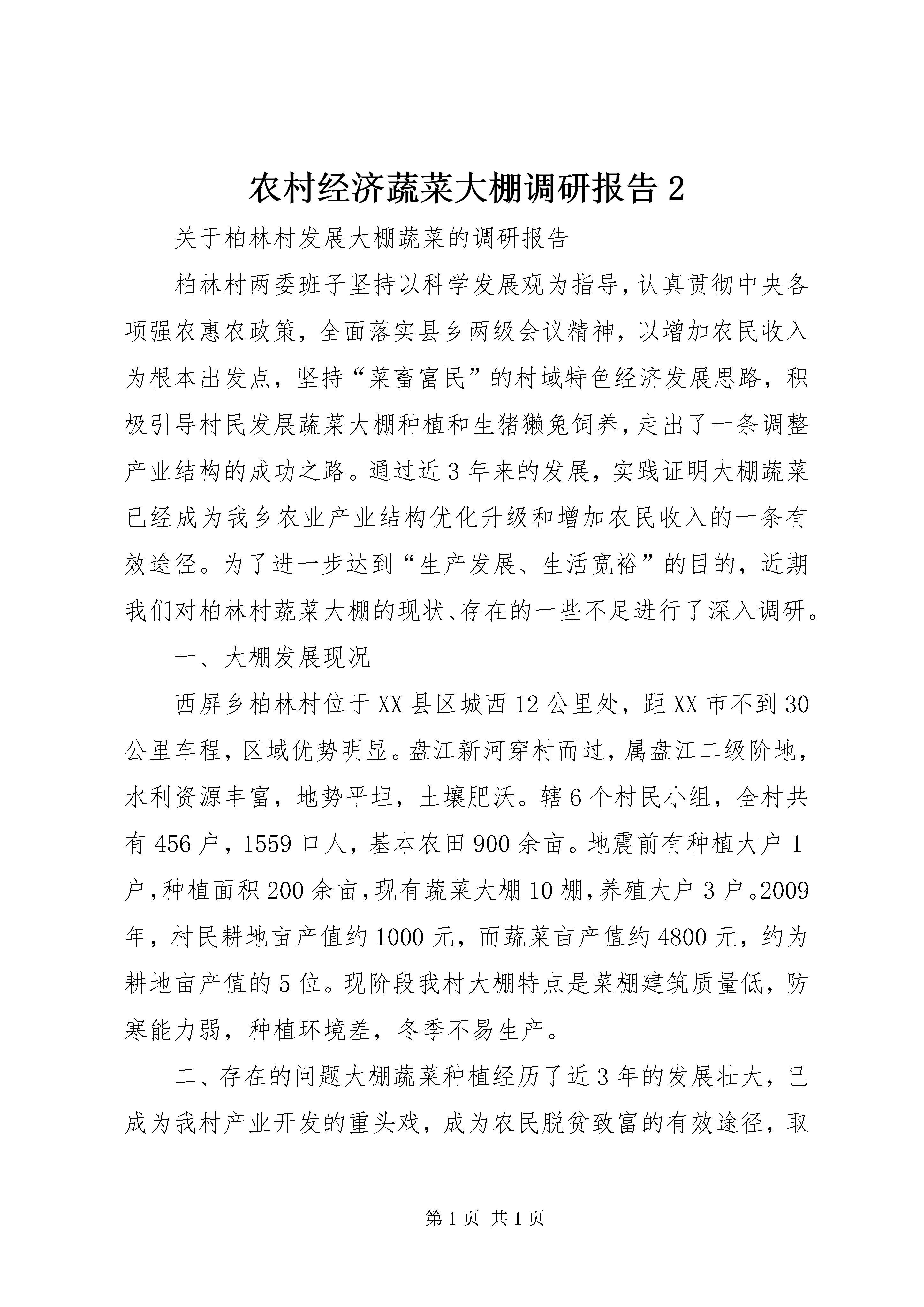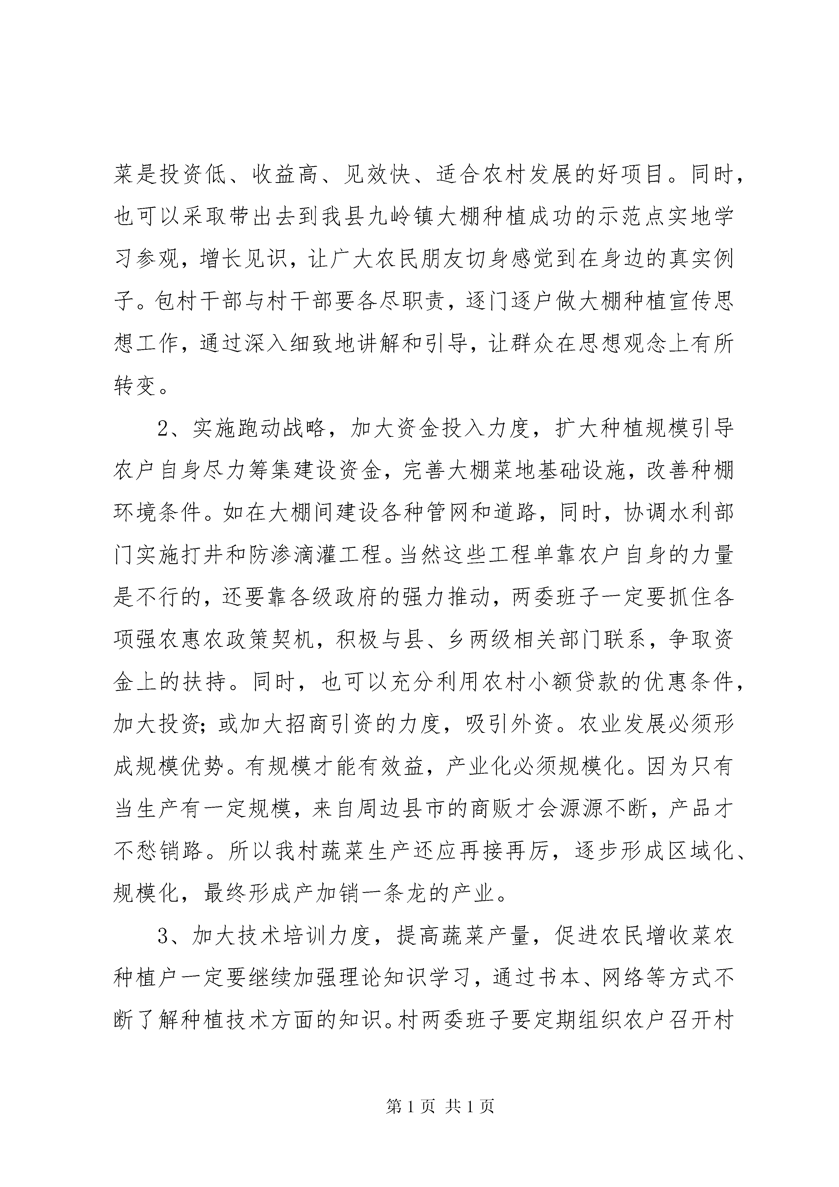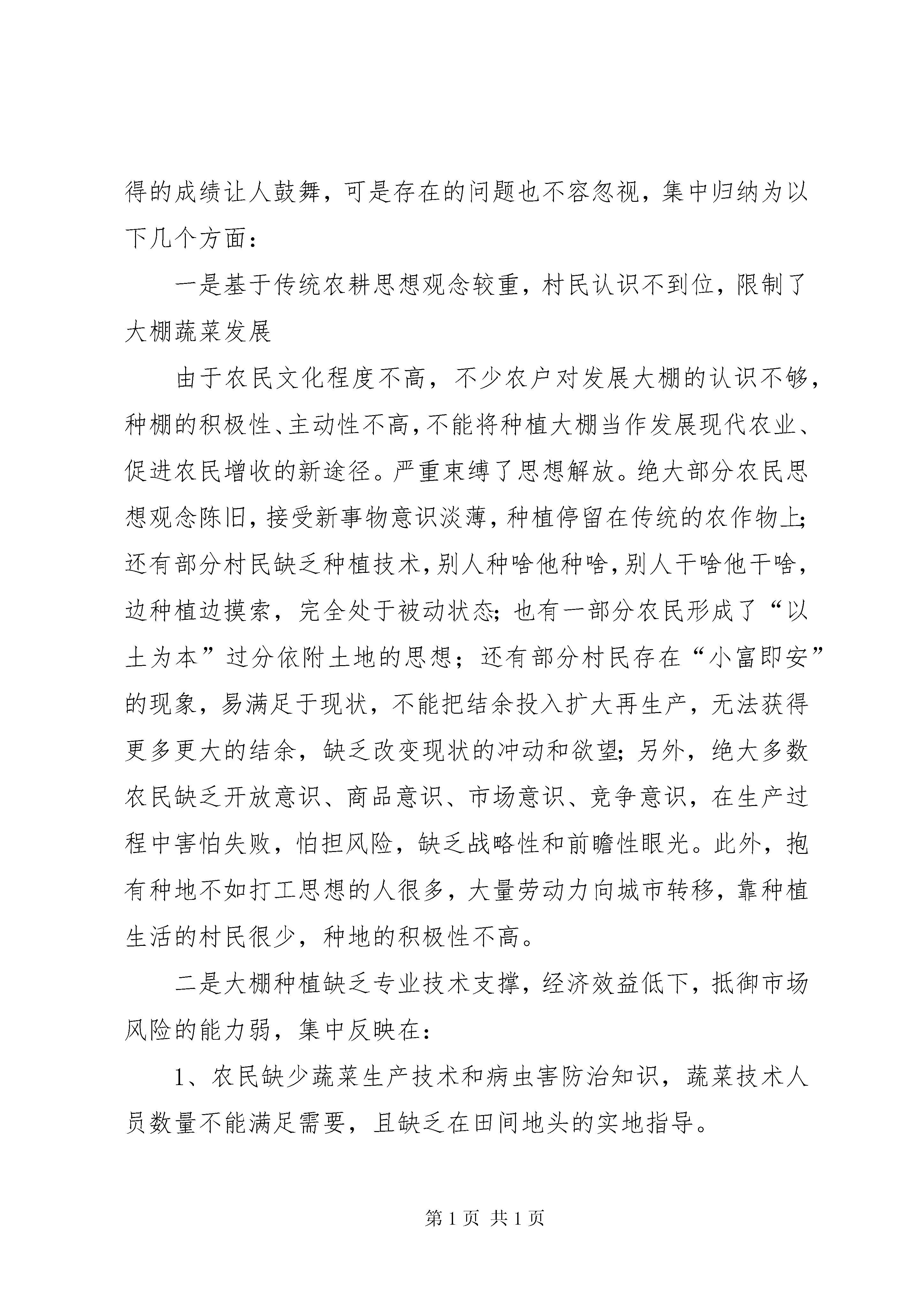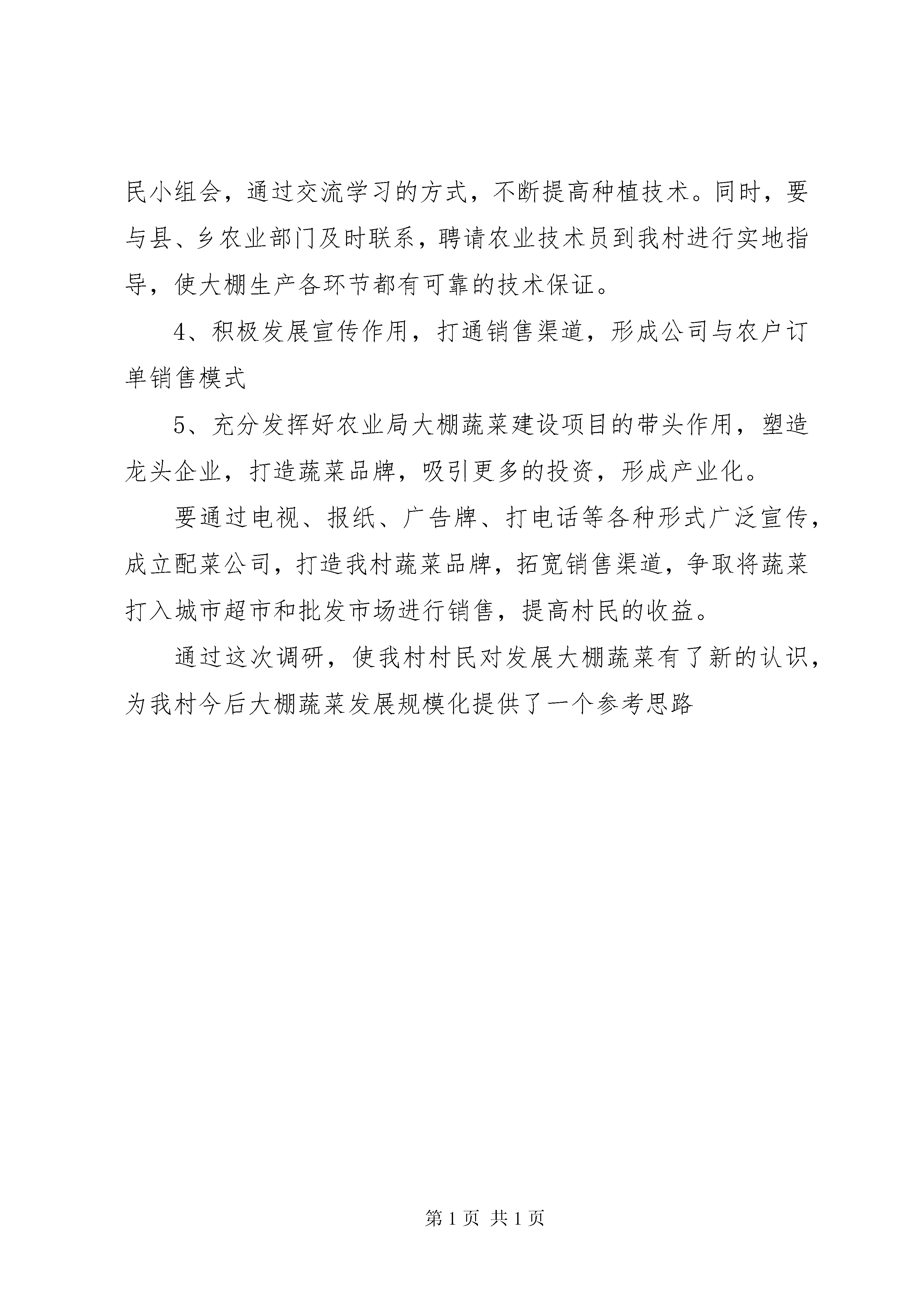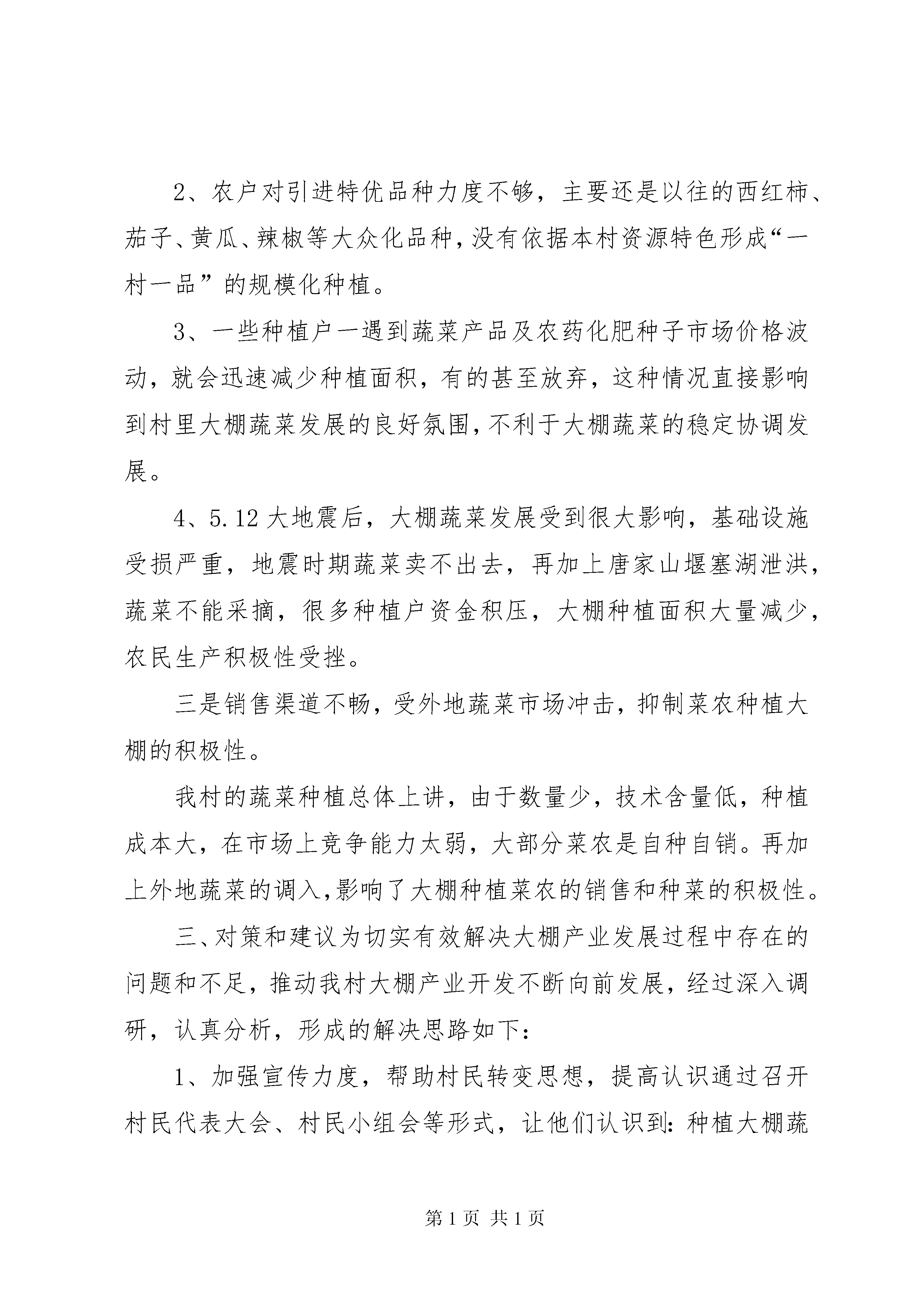 农村经济蔬菜大棚调研报告2关于柏林村发展大棚蔬菜的调研报告柏林村两委班子坚持以科学发展观为指导,认真贯彻中央各项强农惠农政策,全面落实县乡两级会议精神,以增加农民收入为根本出发点,坚持“菜畜富民”的村域特色经济发展思路,积极引导村民发展蔬菜大棚种植和生猪獭兔饲养,走出了一条调整产业结构的成功之路。通过近3年来的发展,实践证明大棚蔬菜已经成为我乡农业产业结构优化升级和增加农民收入的一条有效途径。为了进一步达到“生产发展、生活宽裕”的目的,近期我们对柏林村蔬菜大棚的现状、存在的一些不足进行了深入调研。一、大棚发展现况西屏乡柏林村位于XX县区城西12公里处,距XX市不到30公里车程,区域优势明显。盘江新河穿村而过,属盘江二级阶地,水利资源丰富,地势平坦,土壤肥沃。辖6个村民小组,全村共有456户,1559口人,基本农田900余亩。地震前有种植大户1户,种植面积200余亩,现有蔬菜大棚10棚,养殖大户3户。2009年,村民耕地亩产值约1000元,而蔬菜亩产值约4800元,约为耕地亩产值的5位。现阶段我村大棚特点是菜棚建筑质量低,防寒能力弱,种植环境差,冬季不易生产。二、存在的问题大棚蔬菜种植经历了近3年的发展壮大,已成为我村产业开发的重头戏,成为农民脱贫致富的有效途径,取得的成绩让人鼓舞,可是存在的问题也不容忽视,集中归纳为以下几个方面:一是基于传统农耕思想观念较重,村民认识不到位,限制了大棚蔬菜发展由于农民文化程度不高,不少农户对发展大棚的认识不够,种棚的积极性、主动性不高,不能将种植大棚当作发展现代农业、促进农民增收的新途径。严重束缚了思想解放。绝大部分农民思想观念陈旧,接受新事物意识淡薄,种植停留在传统的农作物上;还有部分村民缺乏种植技术,别人种啥他种啥,别人干啥他干啥,边种植边摸索,完全处于被动状态;也有一部分农民形成了“以土为本”过分依附土地的思想;还有部分村民存在“小富即安”的现象,易满足于现状,不能把结余投入扩大再生产,无法获得更多更大的结余,缺乏改变现状的冲动和欲望;另外,绝大多数农民缺乏开放意识、商品意识、市场意识、竞争意识,在生产过程中害怕失败,怕担风险,缺乏战略性和前瞻性眼光。此外,抱有种地不如打工思想的人很多,大量劳动力向城市转移,靠种植生活的村民很少,种地的积极性不高。二是大棚种植缺乏专业技术支撑,经济效益低下,抵御市场风险的能力弱,集中反映在:1、农民缺少蔬菜生产技术和病虫害防治知识,蔬菜技术人员数量不能满足需要,且缺乏在田间地头的实地指导。2、农户对引进特优品种力度不够,主要还是以往的西红柿、茄子、黄瓜、辣椒等大众化品种,没有依据本村资源特色形成“一村一品”的规模化种植。3、一些种植户一遇到蔬菜产品及农药化肥种子市场价格波动,就会迅速减少种植面积,有的甚至放弃,这种情况直接影响到村里大棚蔬菜发展的良好氛围,不利于大棚蔬菜的稳定协调发展。4、5.12大地震后,大棚蔬菜发展受到很大影响,基础设施受损严重,地震时期蔬菜卖不出去,再加上唐家山堰塞湖泄洪,蔬菜不能采摘,很多种植户资金积压,大棚种植面积大量减少,农民生产积极性受挫。三是销售渠道不畅,受外地蔬菜市场冲击,抑制菜农种植大棚的积极性。我村的蔬菜种植总体上讲,由于数量少,技术含量低,种植成本大,在市场上竞争能力太弱,大部分菜农是自种自销。再加上外地蔬菜的调入,影响了大棚种植菜农的销售和种菜的积极性。三、对策和建议为切实有效解决大棚产业发展过程中存在的问题和不足,推动我村大棚产业开发不断向前发展,经过深入调研,认真分析,形成的解决思路如下:1、加强宣传力度,帮助村民转变思想,提高认识通过召开村民代表大会、村民小组会等形式,让他们认识到:种植大棚蔬菜是投资低、收益高、见效快、适合农村发展的好项目。同时,也可以采取带出去到我县九岭镇大棚种植成功的示范点实地学习参观,增长见识,让广大农民朋友切身感觉到在身边的真实例子。包村干部与村干部要各尽职责,逐门逐户做大棚种植宣传思想工作,通过深入细致地讲解和引导,让群众在思想观念上有所转变。2、实施跑动战略,加大资金投入力度,扩大种植规模引导农户自身尽力筹集建设资金,完善大棚菜地基础设施,改善种棚环境条件。如在大棚间建设各种管网和道路,同时,协调水利部门实施打井和防渗滴灌工程。当然这些工程单靠农户自身的力量是不行的,还要靠各级政府的强力推动,两委班子一定要抓住各项强农惠农政策契机,积极与县、乡两级相关部门联系,争取资金上的扶持。同时,也可以充分利用农村小额贷款的优惠条件,加大投资;或加大招商引资的力度,吸引外资。农业发展必须形成规模优势。有规模才能有效益,产业化必须规模化。因为只有当生产有一定规模,来自周边县市的商贩才会源源不断,产品才不愁销路。所以我村蔬菜生产还应再接再厉,逐步形成区域化、规模化,最