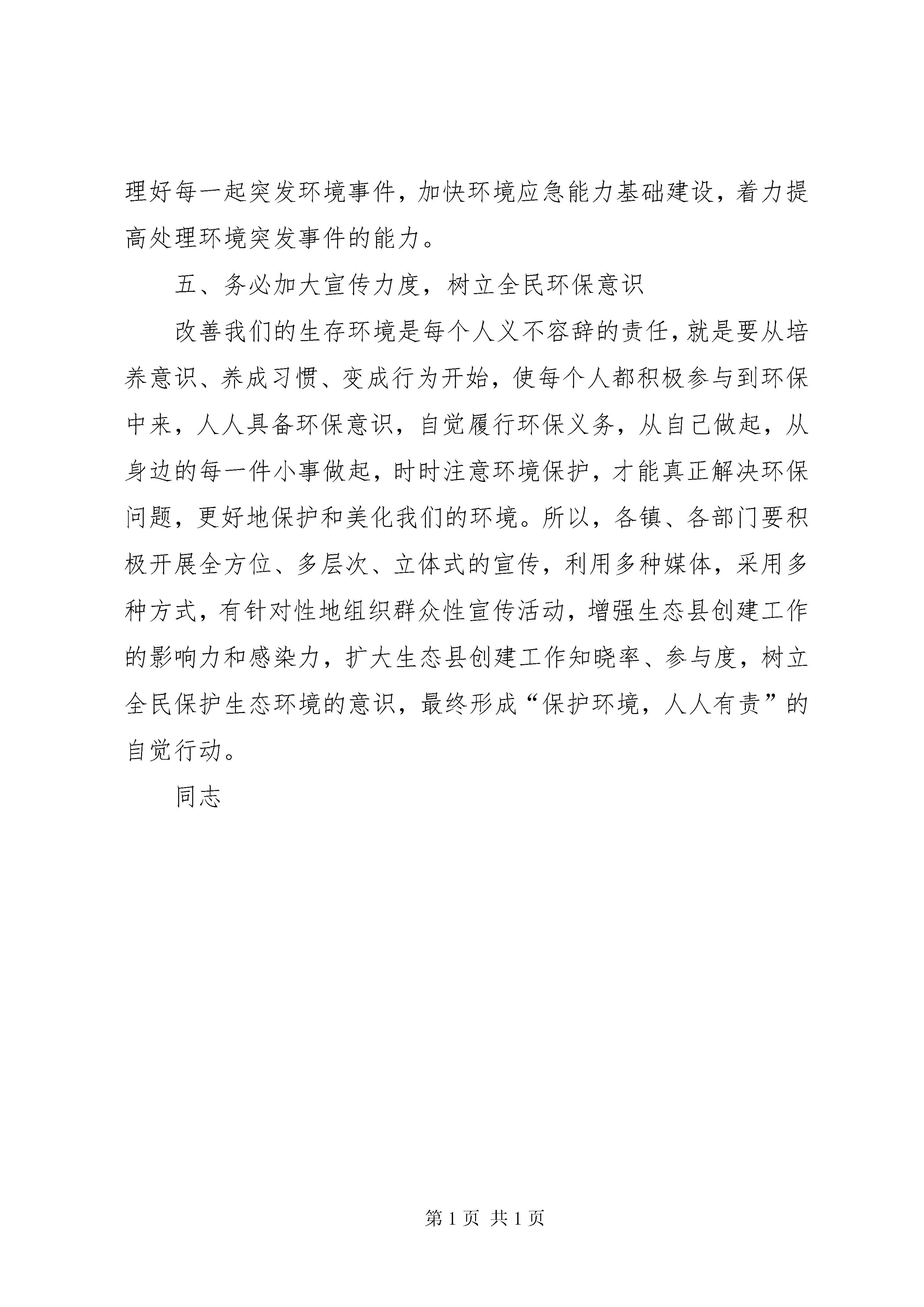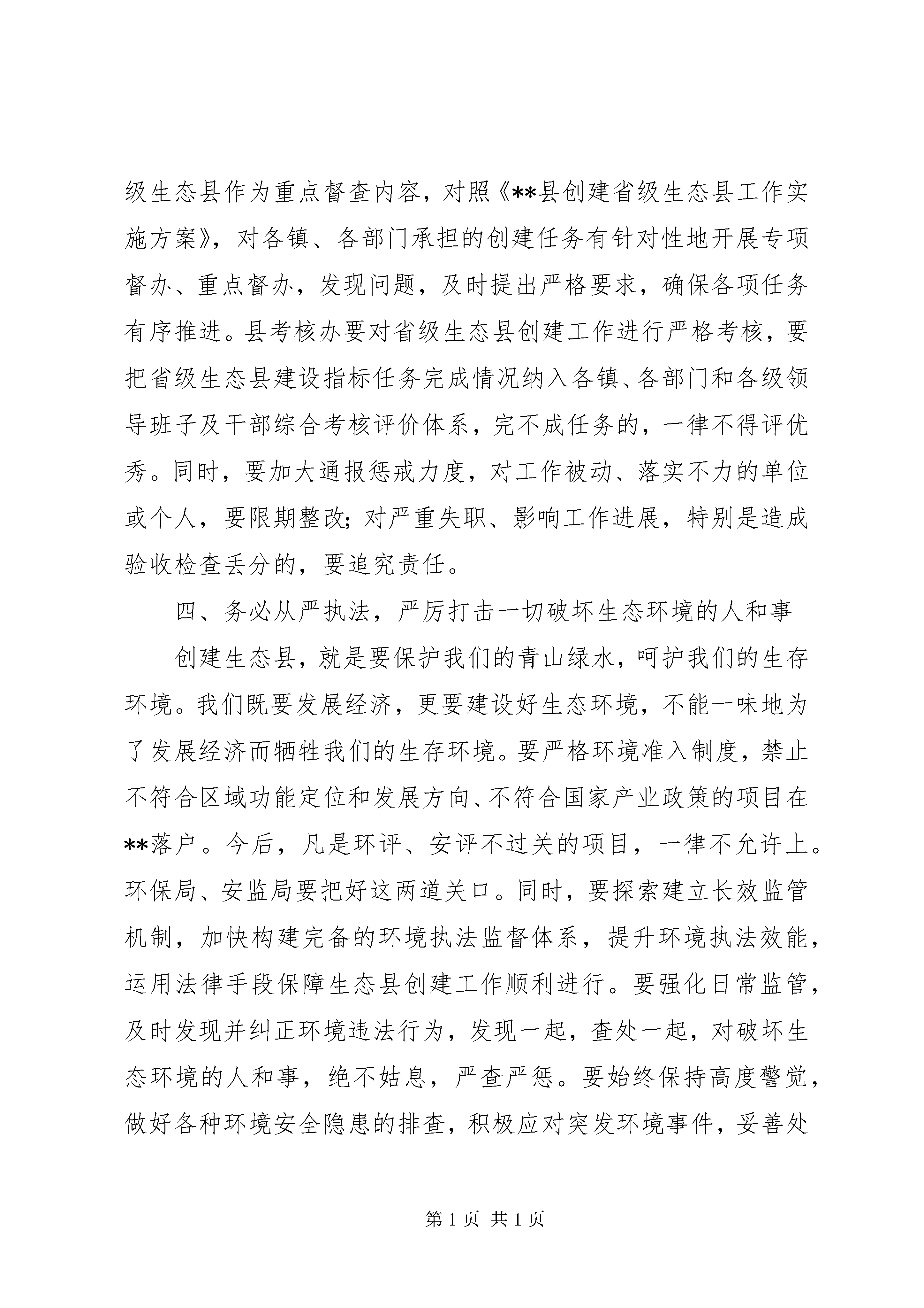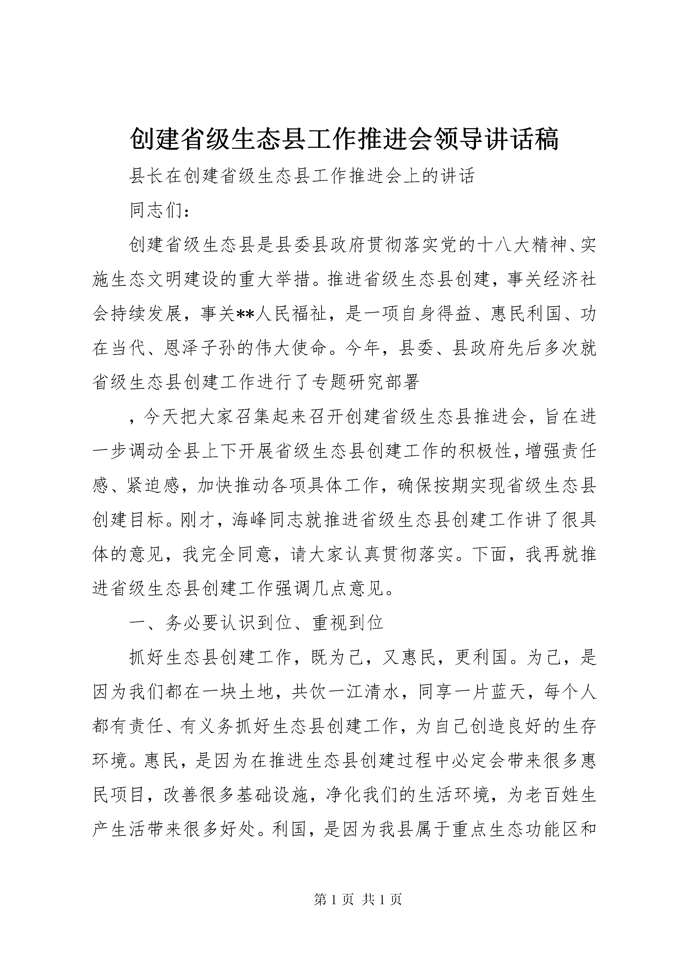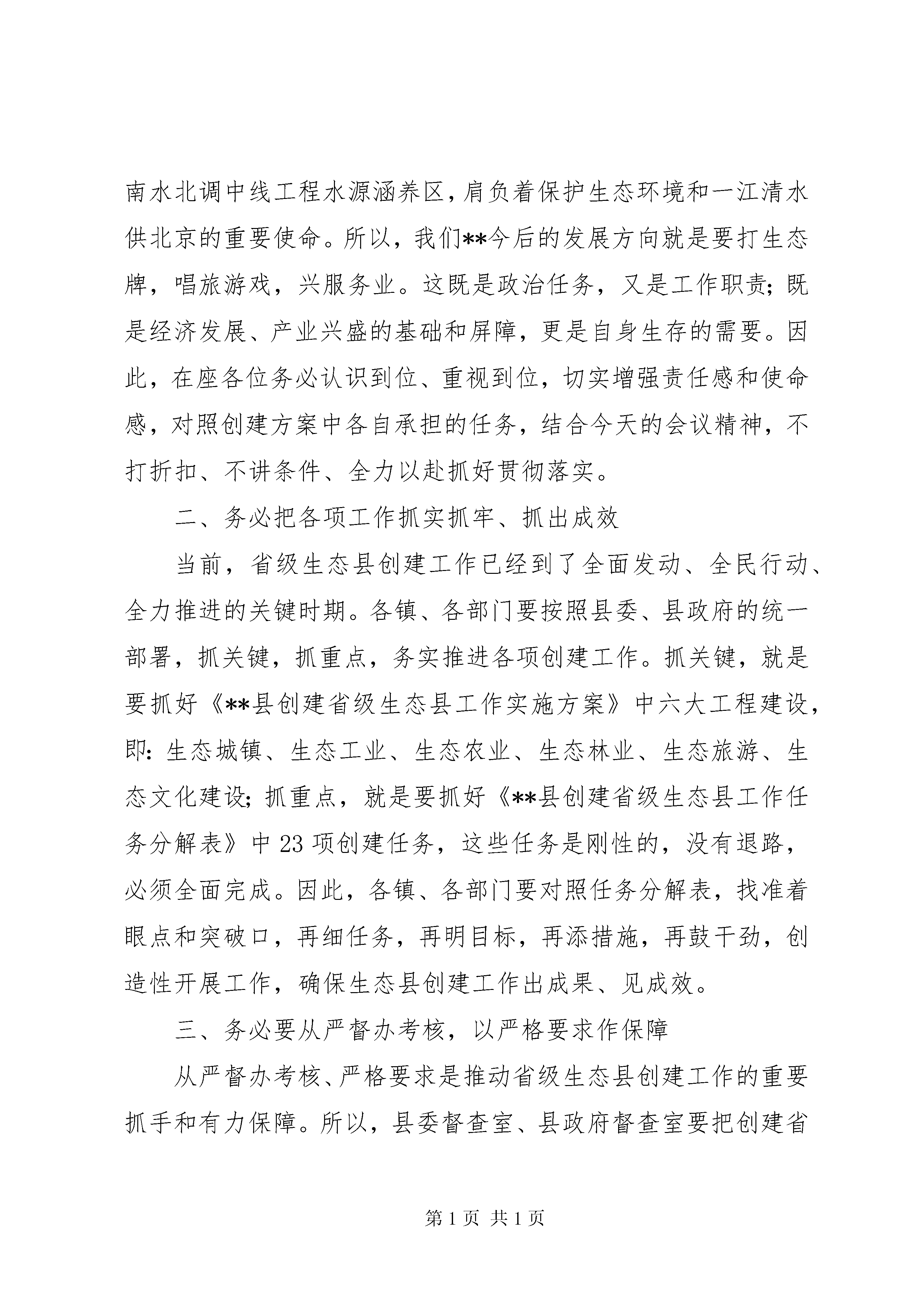 创建省级生态县工作推进会领导讲话稿县长在创建省级生态县工作推进会上的讲话同志们:创建省级生态县是县委县政府贯彻落实党的十八大精神、实施生态文明建设的重大举措。推进省级生态县创建,事关经济社会持续发展,事关**人民福祉,是一项自身得益、惠民利国、功在当代、恩泽子孙的伟大使命。今年,县委、县政府先后多次就省级生态县创建工作进行了专题研究部署,今天把大家召集起来召开创建省级生态县推进会,旨在进一步调动全县上下开展省级生态县创建工作的积极性,增强责任感、紧迫感,加快推动各项具体工作,确保按期实现省级生态县创建目标。刚才,海峰同志就推进省级生态县创建工作讲了很具体的意见,我完全同意,请大家认真贯彻落实。下面,我再就推进省级生态县创建工作强调几点意见。一、务必要认识到位、重视到位抓好生态县创建工作,既为己,又惠民,更利国。为己,是因为我们都在一块土地,共饮一江清水,同享一片蓝天,每个人都有责任、有义务抓好生态县创建工作,为自己创造良好的生存环境。惠民,是因为在推进生态县创建过程中必定会带来很多惠民项目,改善很多基础设施,净化我们的生活环境,为老百姓生产生活带来很多好处。利国,是因为我县属于重点生态功能区和南水北调中线工程水源涵养区,肩负着保护生态环境和一江清水供北京的重要使命。所以,我们**今后的发展方向就是要打生态牌,唱旅游戏,兴服务业。这既是政治任务,又是工作职责;既是经济发展、产业兴盛的基础和屏障,更是自身生存的需要。因此,在座各位务必认识到位、重视到位,切实增强责任感和使命感,对照创建方案中各自承担的任务,结合今天的会议精神,不打折扣、不讲条件、全力以赴抓好贯彻落实。二、务必把各项工作抓实抓牢、抓出成效当前,省级生态县创建工作已经到了全面发动、全民行动、全力推进的关键时期。各镇、各部门要按照县委、县政府的统一部署,抓关键,抓重点,务实推进各项创建工作。抓关键,就是要抓好《**县创建省级生态县工作实施方案》中六大工程建设,即:生态城镇、生态工业、生态农业、生态林业、生态旅游、生态文化建设;抓重点,就是要抓好《**县创建省级生态县工作任务分解表》中23项创建任务,这些任务是刚性的,没有退路,必须全面完成。因此,各镇、各部门要对照任务分解表,找准着眼点和突破口,再细任务,再明目标,再添措施,再鼓干劲,创造性开展工作,确保生态县创建工作出成果、见成效。三、务必要从严督办考核,以严格要求作保障从严督办考核、严格要求是推动省级生态县创建工作的重要抓手和有力保障。所以,县委督查室、县政府督查室要把创建省级生态县作为重点督查内容,对照《**县创建省级生态县工作实施方案》,对各镇、各部门承担的创建任务有针对性地开展专项督办、重点督办,发现问题,及时提出严格要求,确保各项任务有序推进。县考核办要对省级生态县创建工作进行严格考核,要把省级生态县建设指标任务完成情况纳入各镇、各部门和各级领导班子及干部综合考核评价体系,完不成任务的,一律不得评优秀。同时,要加大通报惩戒力度,对工作被动、落实不力的单位或个人,要限期整改;对严重失职、影响工作进展,特别是造成验收检查丢分的,要追究责任。四、务必从严执法,严厉打击一切破坏生态环境的人和事创建生态县,就是要保护我们的青山绿水,呵护我们的生存环境。我们既要发展经济,更要建设好生态环境,不能一味地为了发展经济而牺牲我们的生存环境。要严格环境准入制度,禁止不符合区域功能定位和发展方向、不符合国家产业政策的项目在**落户。今后,凡是环评、安评不过关的项目,一律不允许上。环保局、安监局要把好这两道关口。同时,要探索建立长效监管机制,加快构建完备的环境执法监督体系,提升环境执法效能,运用法律手段保障生态县创建工作顺利进行。要强化日常监管,及时发现并纠正环境违法行为,发现一起,查处一起,对破坏生态环境的人和事,绝不姑息,严查严惩。要始终保持高度警觉,做好各种环境安全隐患的排查,积极应对突发环境事件,妥善处理好每一起突发环境事件,加快环境应急能力基础建设,着力提高处理环境突发事件的能力。五、务必加大宣传力度,树立全民环保意识改善我们的生存环境是每个人义不容辞的责任,就是要从培养意识、养成习惯、变成行为开始,使每个人都积极参与到环保中来,人人具备环保意识,自觉履行环保义务,从自己做起,从身边的每一件小事做起,时时注意环境保护,才能真正解决环保问题,更好地保护和美化我们的环境。所以,各镇、各部门要积极开展全方位、多层次、立体式的宣传,利用多种媒体,采用多种方式,有针对性地组织群众性宣传活动,增强生态县创建工作的影响力和感染力,扩大生态县创建工作知晓率、参与度,树立全民保护生态环境的意识,最终形成“保护环境,人人有责”的自觉行动。同志
