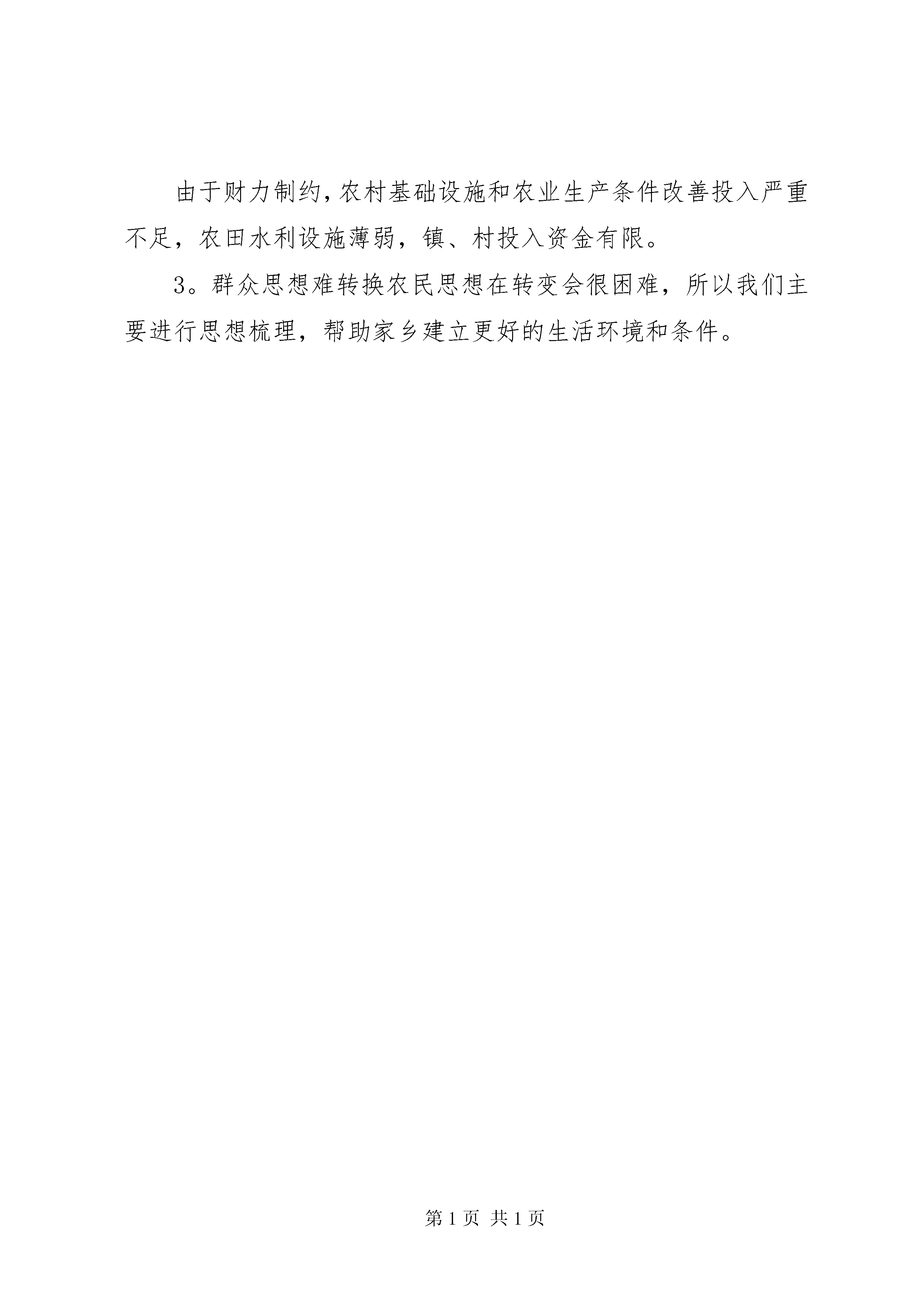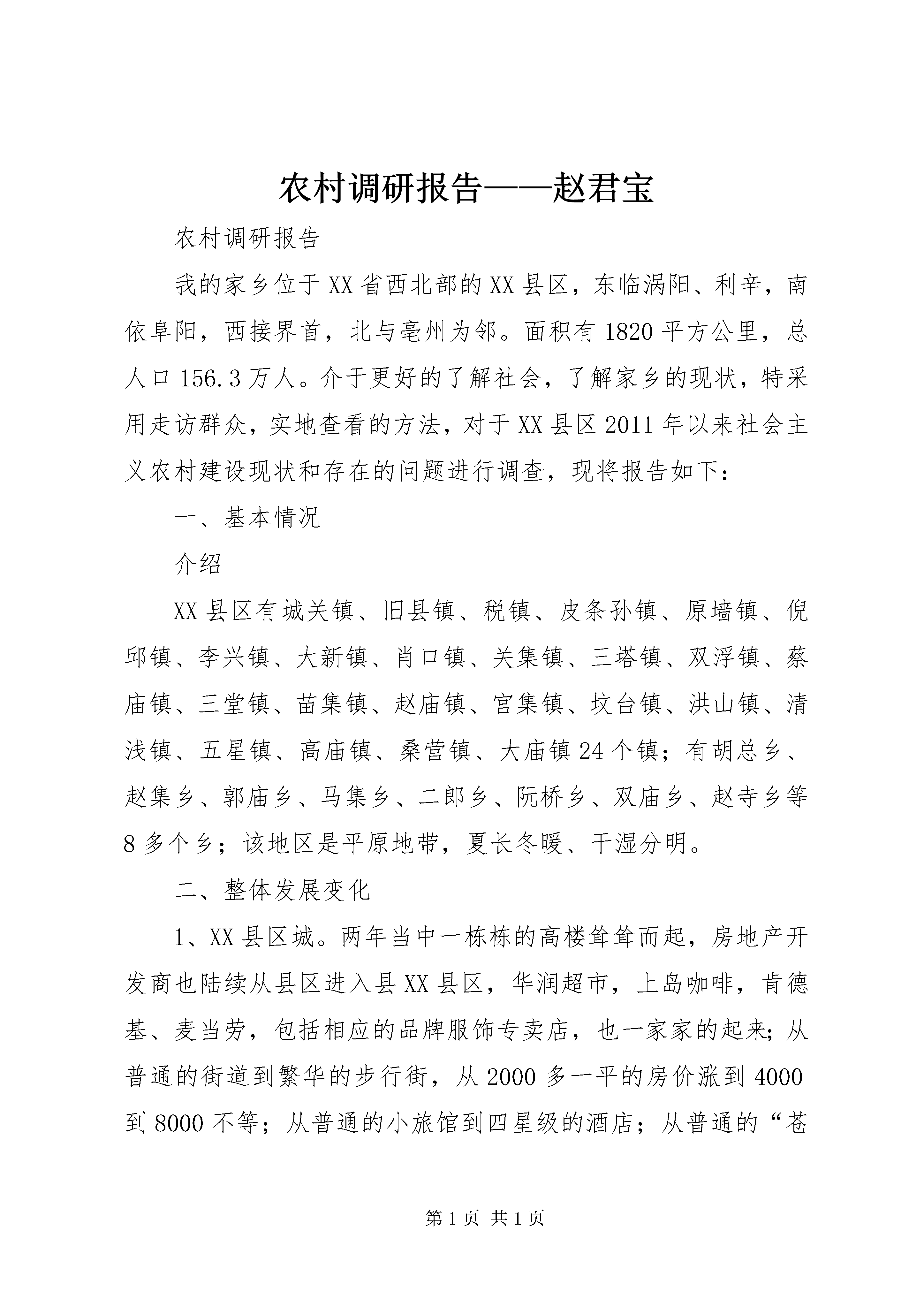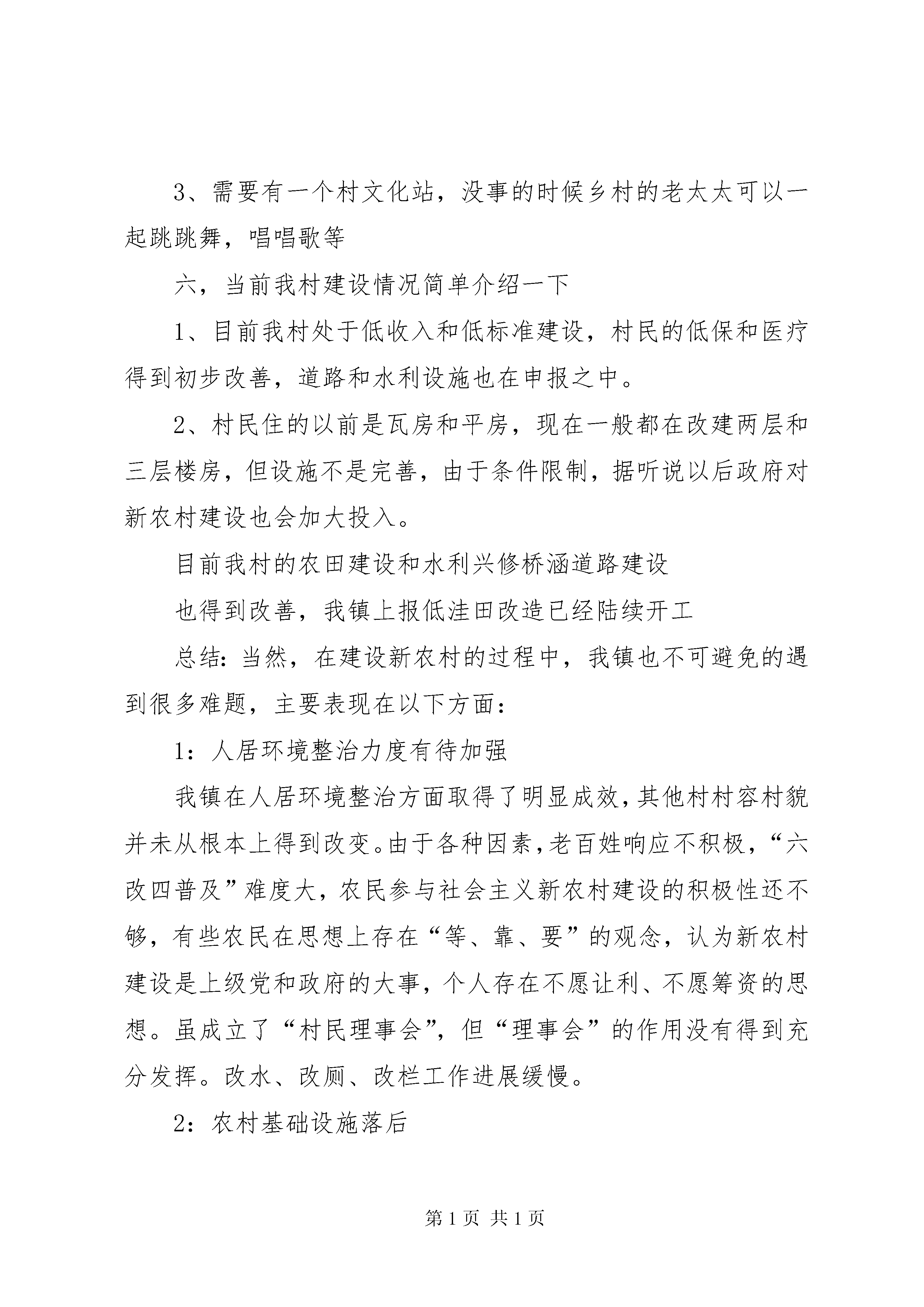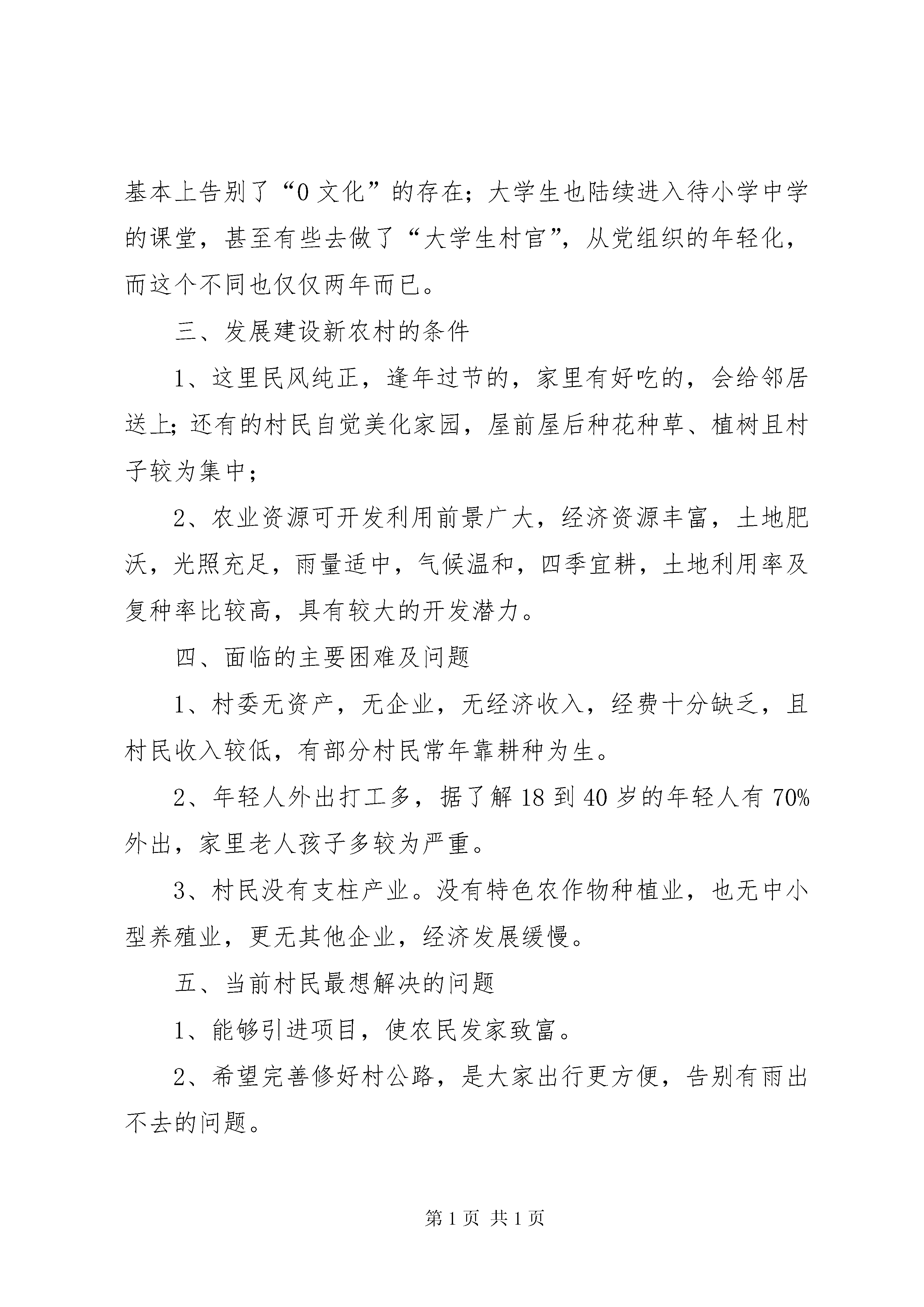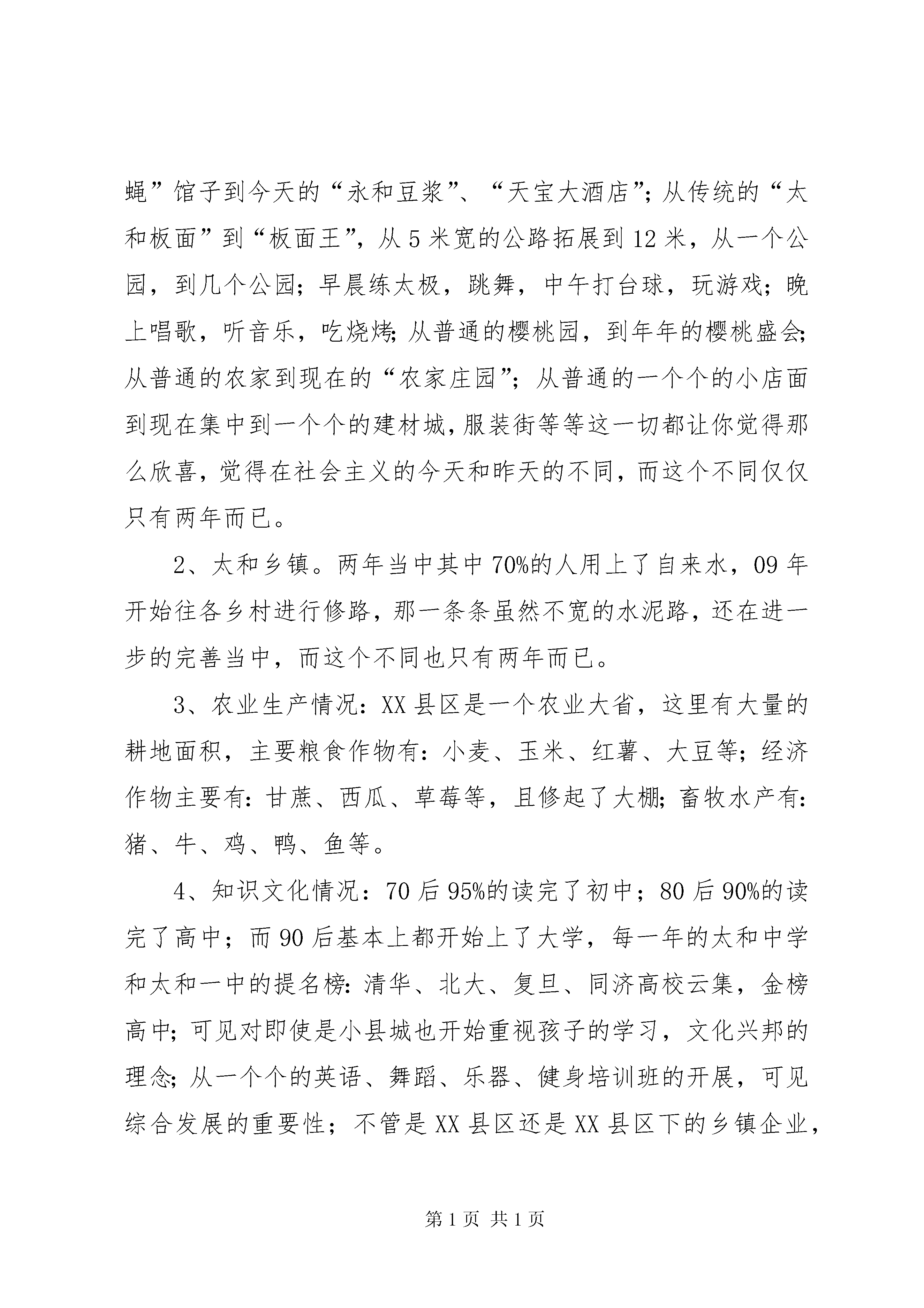 农村调研报告——赵君宝农村调研报告我的家乡位于XX省西北部的XX县区,东临涡阳、利辛,南依阜阳,西接界首,北与亳州为邻。面积有1820平方公里,总人口156.3万人。介于更好的了解社会,了解家乡的现状,特采用走访群众,实地查看的方法,对于XX县区2011年以来社会主义农村建设现状和存在的问题进行调查,现将报告如下:一、基本情况介绍XX县区有城关镇、旧县镇、税镇、皮条孙镇、原墙镇、倪邱镇、李兴镇、大新镇、肖口镇、关集镇、三塔镇、双浮镇、蔡庙镇、三堂镇、苗集镇、赵庙镇、宫集镇、坟台镇、洪山镇、清浅镇、五星镇、高庙镇、桑营镇、大庙镇24个镇;有胡总乡、赵集乡、郭庙乡、马集乡、二郎乡、阮桥乡、双庙乡、赵寺乡等8多个乡;该地区是平原地带,夏长冬暖、干湿分明。二、整体发展变化1、XX县区城。两年当中一栋栋的高楼耸耸而起,房地产开发商也陆续从县区进入县XX县区,华润超市,上岛咖啡,肯德基、麦当劳,包括相应的品牌服饰专卖店,也一家家的起来;从普通的街道到繁华的步行街,从2000多一平的房价涨到4000到8000不等;从普通的小旅馆到四星级的酒店;从普通的“苍蝇”馆子到今天的“永和豆浆”、“天宝大酒店”;从传统的“太和板面”到“板面王”,从5米宽的公路拓展到12米,从一个公园,到几个公园;早晨练太极,跳舞,中午打台球,玩游戏;晚上唱歌,听音乐,吃烧烤;从普通的樱桃园,到年年的樱桃盛会;从普通的农家到现在的“农家庄园”;从普通的一个个的小店面到现在集中到一个个的建材城,服装街等等这一切都让你觉得那么欣喜,觉得在社会主义的今天和昨天的不同,而这个不同仅仅只有两年而已。2、太和乡镇。两年当中其中70%的人用上了自来水,09年开始往各乡村进行修路,那一条条虽然不宽的水泥路,还在进一步的完善当中,而这个不同也只有两年而已。3、农业生产情况:XX县区是一个农业大省,这里有大量的耕地面积,主要粮食作物有:小麦、玉米、红薯、大豆等;经济作物主要有:甘蔗、西瓜、草莓等,且修起了大棚;畜牧水产有:猪、牛、鸡、鸭、鱼等。4、知识文化情况:70后95%的读完了初中;80后90%的读完了高中;而90后基本上都开始上了大学,每一年的太和中学和太和一中的提名榜:清华、北大、复旦、同济高校云集,金榜高中;可见对即使是小县城也开始重视孩子的学习,文化兴邦的理念;从一个个的英语、舞蹈、乐器、健身培训班的开展,可见综合发展的重要性;不管是XX县区还是XX县区下的乡镇企业,基本上告别了“0文化”的存在;大学生也陆续进入待小学中学的课堂,甚至有些去做了“大学生村官”,从党组织的年轻化,而这个不同也仅仅两年而已。三、发展建设新农村的条件1、这里民风纯正,逢年过节的,家里有好吃的,会给邻居送上;还有的村民自觉美化家园,屋前屋后种花种草、植树且村子较为集中;2、农业资源可开发利用前景广大,经济资源丰富,土地肥沃,光照充足,雨量适中,气候温和,四季宜耕,土地利用率及复种率比较高,具有较大的开发潜力。四、面临的主要困难及问题1、村委无资产,无企业,无经济收入,经费十分缺乏,且村民收入较低,有部分村民常年靠耕种为生。2、年轻人外出打工多,据了解18到40岁的年轻人有70%外出,家里老人孩子多较为严重。3、村民没有支柱产业。没有特色农作物种植业,也无中小型养殖业,更无其他企业,经济发展缓慢。五、当前村民最想解决的问题1、能够引进项目,使农民发家致富。2、希望完善修好村公路,是大家出行更方便,告别有雨出不去的问题。3、需要有一个村文化站,没事的时候乡村的老太太可以一起跳跳舞,唱唱歌等六,当前我村建设情况简单介绍一下1、目前我村处于低收入和低标准建设,村民的低保和医疗得到初步改善,道路和水利设施也在申报之中。2、村民住的以前是瓦房和平房,现在一般都在改建两层和三层楼房,但设施不是完善,由于条件限制,据听说以后政府对新农村建设也会加大投入。目前我村的农田建设和水利兴修桥涵道路建设也得到改善,我镇上报低洼田改造已经陆续开工总结:当然,在建设新农村的过程中,我镇也不可避免的遇到很多难题,主要表现在以下方面:1:人居环境整治力度有待加强我镇在人居环境整治方面取得了明显成效,其他村村容村貌并未从根本上得到改变。由于各种因素,老百姓响应不积极,“六改四普及”难度大,农民参与社会主义新农村建设的积极性还不够,有些农民在思想上存在“等、靠、要”的观念,认为新农村建设是上级党和政府的大事,个人存在不愿让利、不愿筹资的思想。虽成立了“村民理事会”,但“理事会”的作用没有得到充分发挥。改水、改厕、改栏工作进展缓慢。2:农村基础设施落后由于财力制约,农村基础设施和农业生产条件改善投入严重不足,农田水利设施薄弱,镇、村投入资金有限。3。群众思想难转换农民思想在转变会很困难,所以我们主要进行思想梳理,帮助