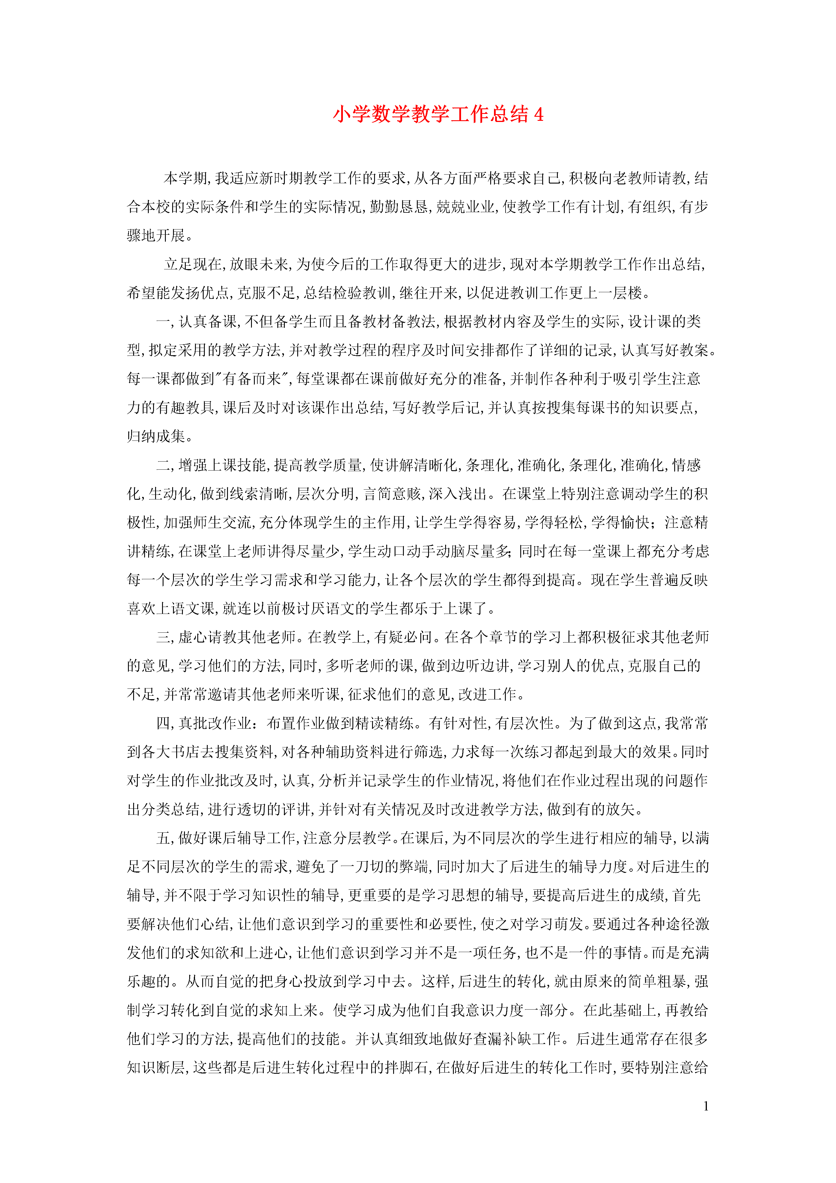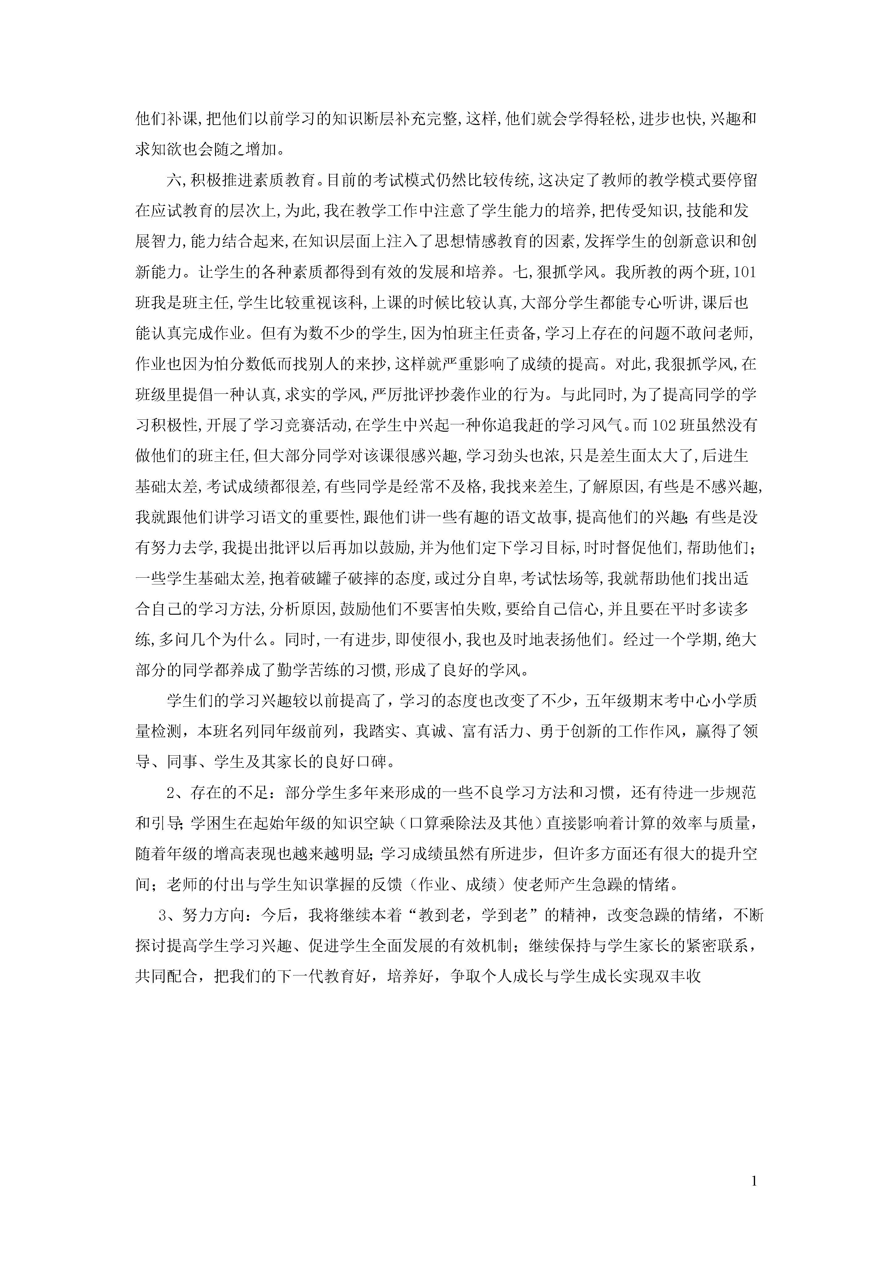 1小学数学教学工作总结4本学期,我适应新时期教学工作的要求,从各方面严格要求自己,积极向老教师请教,结合本校的实际条件和学生的实际情况,勤勤恳恳,兢兢业业,使教学工作有计划,有组织,有步骤地开展。立足现在,放眼未来,为使今后的工作取得更大的进步,现对本学期教学工作作出总结,希望能发扬优点,克服不足,总结检验教训,继往开来,以促进教训工作更上一层楼。一,认真备课,不但备学生而且备教材备教法,根据教材内容及学生的实际,设计课的类型,拟定采用的教学方法,并对教学过程的程序及时间安排都作了详细的记录,认真写好教案。每一课都做到"有备而来",每堂课都在课前做好充分的准备,并制作各种利于吸引学生注意力的有趣教具,课后及时对该课作出总结,写好教学后记,并认真按搜集每课书的知识要点,归纳成集。二,增强上课技能,提高教学质量,使讲解清晰化,条理化,准确化,条理化,准确化,情感化,生动化,做到线索清晰,层次分明,言简意赅,深入浅出。在课堂上特别注意调动学生的积极性,加强师生交流,充分体现学生的主作用,让学生学得容易,学得轻松,学得愉快;注意精讲精练,在课堂上老师讲得尽量少,学生动口动手动脑尽量多;同时在每一堂课上都充分考虑每一个层次的学生学习需求和学习能力,让各个层次的学生都得到提高。现在学生普遍反映喜欢上语文课,就连以前极讨厌语文的学生都乐于上课了。三,虚心请教其他老师。在教学上,有疑必问。在各个章节的学习上都积极征求其他老师的意见,学习他们的方法,同时,多听老师的课,做到边听边讲,学习别人的优点,克服自己的不足,并常常邀请其他老师来听课,征求他们的意见,改进工作。四,真批改作业:布置作业做到精读精练。有针对性,有层次性。为了做到这点,我常常到各大书店去搜集资料,对各种辅助资料进行筛选,力求每一次练习都起到最大的效果。同时对学生的作业批改及时,认真,分析并记录学生的作业情况,将他们在作业过程出现的问题作出分类总结,进行透切的评讲,并针对有关情况及时改进教学方法,做到有的放矢。五,做好课后辅导工作,注意分层教学。在课后,为不同层次的学生进行相应的辅导,以满足不同层次的学生的需求,避免了一刀切的弊端,同时加大了后进生的辅导力度。对后进生的辅导,并不限于学习知识性的辅导,更重要的是学习思想的辅导,要提高后进生的成绩,首先要解决他们心结,让他们意识到学习的重要性和必要性,使之对学习萌发。要通过各种途径激发他们的求知欲和上进心,让他们意识到学习并不是一项任务,也不是一件的事情。而是充满乐趣的。从而自觉的把身心投放到学习中去。这样,后进生的转化,就由原来的简单粗暴,强制学习转化到自觉的求知上来。使学习成为他们自我意识力度一部分。在此基础上,再教给他们学习的方法,提高他们的技能。并认真细致地做好查漏补缺工作。后进生通常存在很多知识断层,这些都是后进生转化过程中的拌脚石,在做好后进生的转化工作时,要特别注意给他们补课,把他们以前学习的知识断层补充完整,这样,他们就会学得轻松,进步也快,兴趣和求知欲也会随之增加。六,积极推进素质教育。目前的考试模式仍然比较传统,这决定了教师的教学模式要停留在应试教育的层次上,为此,我在教学工作中注意了学生能力的培养,把传受知识,技能和发展智力,能力结合起来,在知识层面上注入了思想情感教育的因素,发挥学生的创新意识和创新能力。让学生的各种素质都得到有效的发展和培养。七,狠抓学风。我所教的两个班,101班我是班主任,学生比较重视该科,上课的时候比较认真,大部分学生都能专心听讲,课后也能认真完成作业。但有为数不少的学生,因为怕班主任责备,学习上存在的问题不敢问老师,作业也因为怕分数低而找别人的来抄,这样就严重影响了成绩的提高。对此,我狠抓学风,在班级里提倡一种认真,求实的学风,严厉批评抄袭作业的行为。与此同时,为了提高同学的学习积极性,开展了学习竞赛活动,在学生中兴起一种你追我赶的学习风气。而102班虽然没有做他们的班主任,但大部分同学对该课很感兴趣,学习劲头也浓,只是差生面太大了,后进生基础太差,考试成绩都很差,有些同学是经常不及格,我找来差生,了解原因,有些是不感兴趣,我就跟他们讲学习语文的重要性,跟他们讲一些有趣的语文故事,提高他们的兴趣;有些是没有努力去学,我提出批评以后再加以鼓励,并为他们定下学习目标,时时督促他们,帮助他们;一些学生基础太差,抱着破罐子破摔的态度,或过分自卑,考试怯场等,我就帮助他们找出适合自己的学习方法,分析原因,鼓励他们不要害怕失败,要给自己信心,并且要在平时多读多练,多问几个为什么。同时,一有进步,即使很小,我也及时地表扬他们。经过一个学期,绝大部分的同学都养成了勤学苦练的习惯,形成了良好的学风。学生们的学习兴趣较以前提高了,学习的态度也改变了不少,五年级期末考中心小