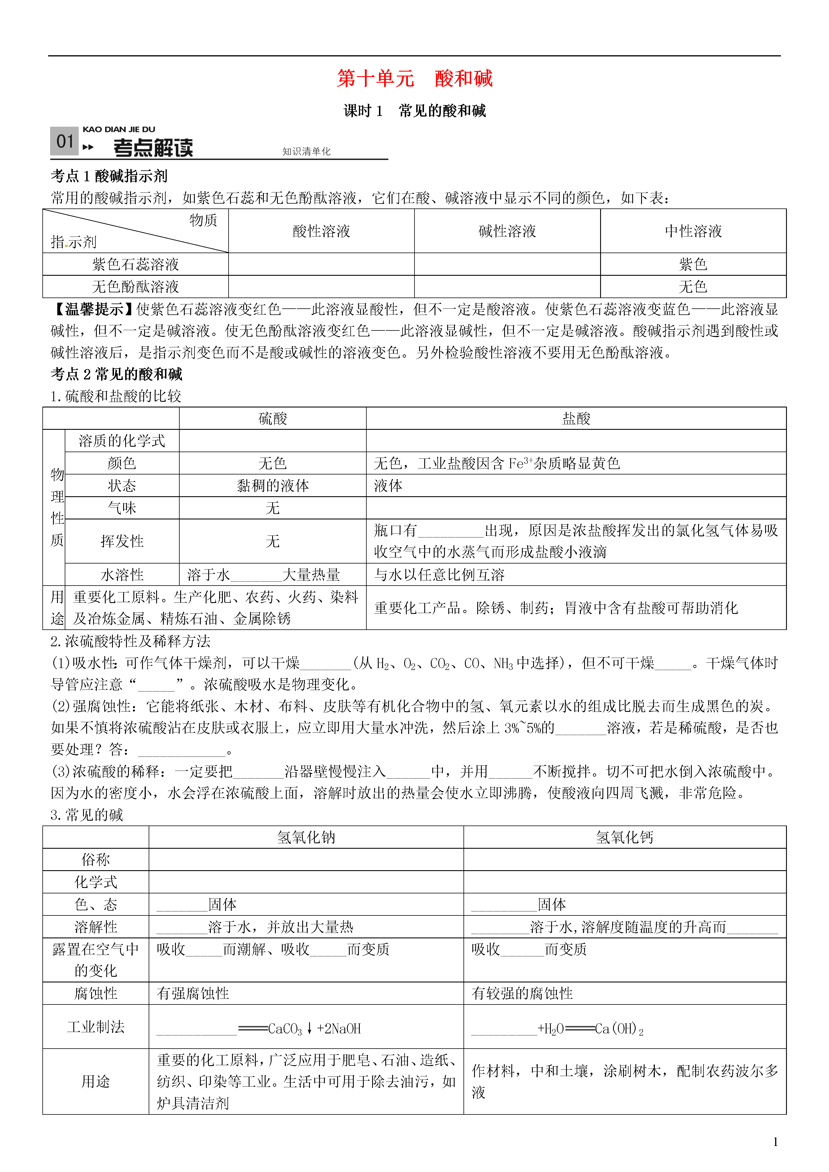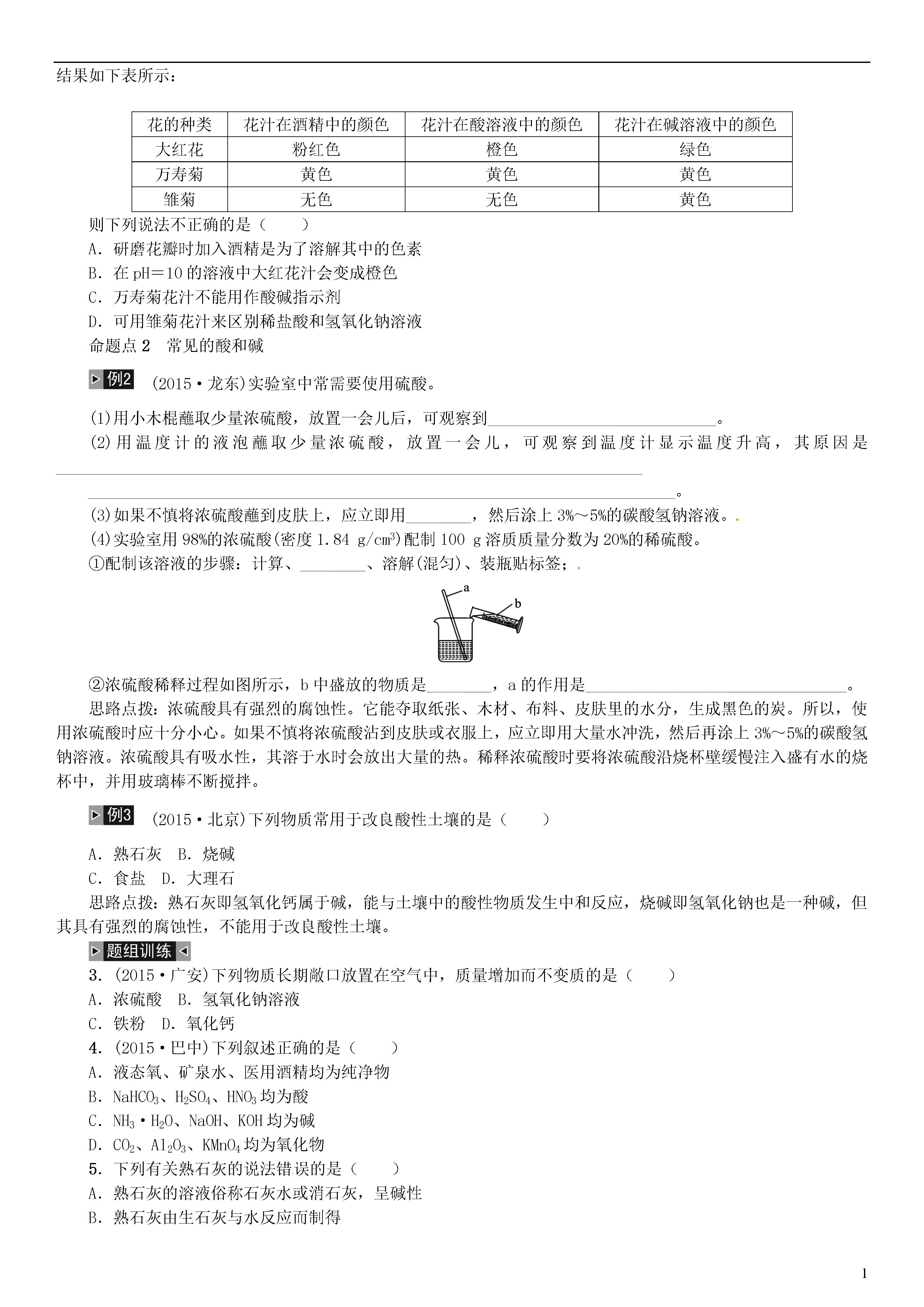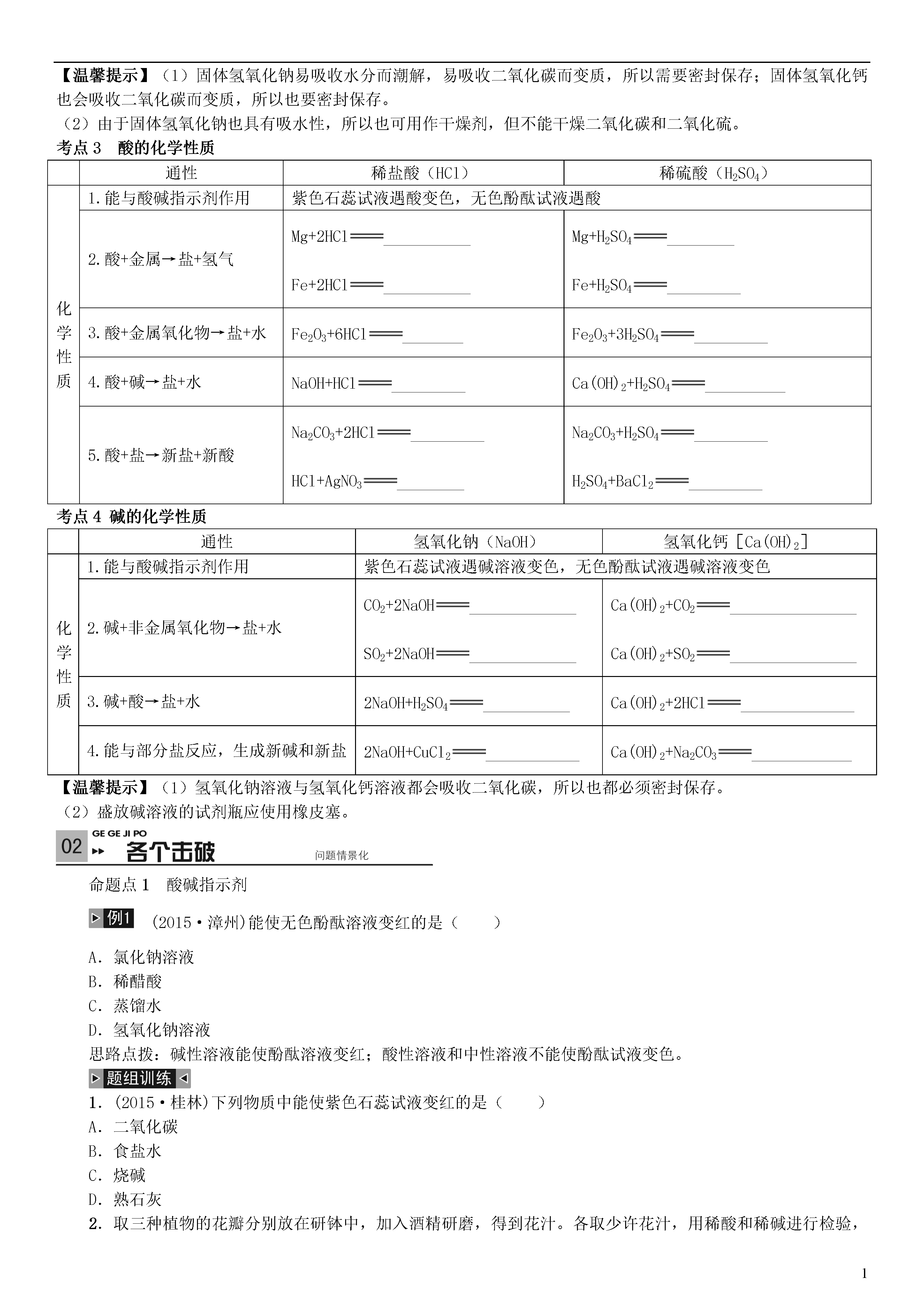 1第十单元酸和碱课时1常见的酸和碱考点1酸碱指示剂常用的酸碱指示剂,如紫色石蕊和无色酚酞溶液,它们在酸、碱溶液中显示不同的颜色,如下表:物质指示剂酸性溶液碱性溶液中性溶液紫色石蕊溶液紫色无色酚酞溶液无色【温馨提示】使紫色石蕊溶液变红色——此溶液显酸性,但不一定是酸溶液。使紫色石蕊溶液变蓝色——此溶液显碱性,但不一定是碱溶液。使无色酚酞溶液变红色——此溶液显碱性,但不一定是碱溶液。酸碱指示剂遇到酸性或碱性溶液后,是指示剂变色而不是酸或碱性的溶液变色。另外检验酸性溶液不要用无色酚酞溶液。考点2常见的酸和碱硫酸和盐酸的比较硫酸盐酸物理性质溶质的化学式颜色无色无色,工业盐酸因含Fe3+杂质略显黄色状态黏稠的液体液体气味无挥发性无瓶口有_________出现,原因是浓盐酸挥发出的氯化氢气体易吸收空气中的水蒸气而形成盐酸小液滴水溶性溶于水_______大量热量与水以任意比例互溶用途重要化工原料。生产化肥、农药、火药、染料及冶炼金属、精炼石油、金属除锈重要化工产品。除锈、制药;胃液中含有盐酸可帮助消化2.浓硫酸特性及稀释方法(1)吸水性:可作气体干燥剂,可以干燥_______(从H2、O2、CO2、CO、NH3中选择),但不可干燥_____。干燥气体时导管应注意“_____”。浓硫酸吸水是物理变化。(2)强腐蚀性:它能将纸张、木材、布料、皮肤等有机化合物中的氢、氧元素以水的组成比脱去而生成黑色的炭。如果不慎将浓硫酸沾在皮肤或衣服上,应立即用大量水冲洗,然后涂上3%~5%的_______溶液,若是稀硫酸,是否也要处理?答:____________。(3)浓硫酸的稀释:一定要把_______沿器壁慢慢注入______中,并用______不断搅拌。切不可把水倒入浓硫酸中。因为水的密度小,水会浮在浓硫酸上面,溶解时放出的热量会使水立即沸腾,使酸液向四周飞溅,非常危险。3.常见的碱氢氧化钠氢氧化钙俗称化学式色、态_______固体_________固体溶解性_______溶于水,并放出大量热________溶于水,溶解度随温度的升高而_______露置在空气中的变化吸收_____而潮解、吸收_____而变质吸收______而变质腐蚀性有强腐蚀性有较强的腐蚀性工业制法___________CaCO3↓+2NaOH_________+H2OCa(OH)2用途重要的化工原料,广泛应用于肥皂、石油、造纸、纺织、印染等工业。生活中可用于除去油污,如炉具清洁剂作材料,中和土壤,涂刷树木,配制农药波尔多液【温馨提示】(1)固体氢氧化钠易吸收水分而潮解,易吸收二氧化碳而变质,所以需要密封保存;固体氢氧化钙也会吸收二氧化碳而变质,所以也要密封保存。(2)由于固体氢氧化钠也具有吸水性,所以也可用作干燥剂,但不能干燥二氧化碳和二氧化硫。考点3酸的化学性质通性稀盐酸(HCl)稀硫酸(H2SO4)化学性质1.能与酸碱指示剂作用紫色石蕊试液遇酸变色,无色酚酞试液遇酸2.酸+金属→盐+氢气Mg+2HCl_____________Fe+2HCl_____________Mg+H2SO4__________Fe+H2SO4___________3.酸+金属氧化物→盐+水Fe2O3+6HCl_________Fe2O3+3H2SO4___________4.酸+碱→盐+水NaOH+HCl___________Ca(OH)2+H2SO4____________5.酸+盐→新盐+新酸Na2CO3+2HCl___________HCl+AgNO3__________Na2CO3+H2SO4___________H2SO4+BaCl2___________考点4碱的化学性质通性氢氧化钠(NaOH)氢氧化钙[Ca(OH)2]化学性质1.能与酸碱指示剂作用紫色石蕊试液遇碱溶液变色,无色酚酞试液遇碱溶液变色2.碱+非金属氧化物→盐+水CO2+2NaOH________________SO2+2NaOH________________Ca(OH)2+CO2___________________Ca(OH)2+SO2___________________3.碱+酸→盐+水2NaOH+H2SO4_____________Ca(OH)2+2HCl_________________4.能与部分盐反应,生成新碱和新盐2NaOH+CuCl2______________Ca(OH)2+Na2CO3_______________【温馨提示】(1)氢氧化钠溶液与氢氧化钙溶液都会吸收二氧化碳,所以也都必须密封保存。(2)盛放碱溶液的试剂瓶应使用橡皮塞。命题点1酸碱指示剂(2015·漳州)能使无色酚酞溶液变红的是()A.氯化钠溶液B.稀醋酸C.