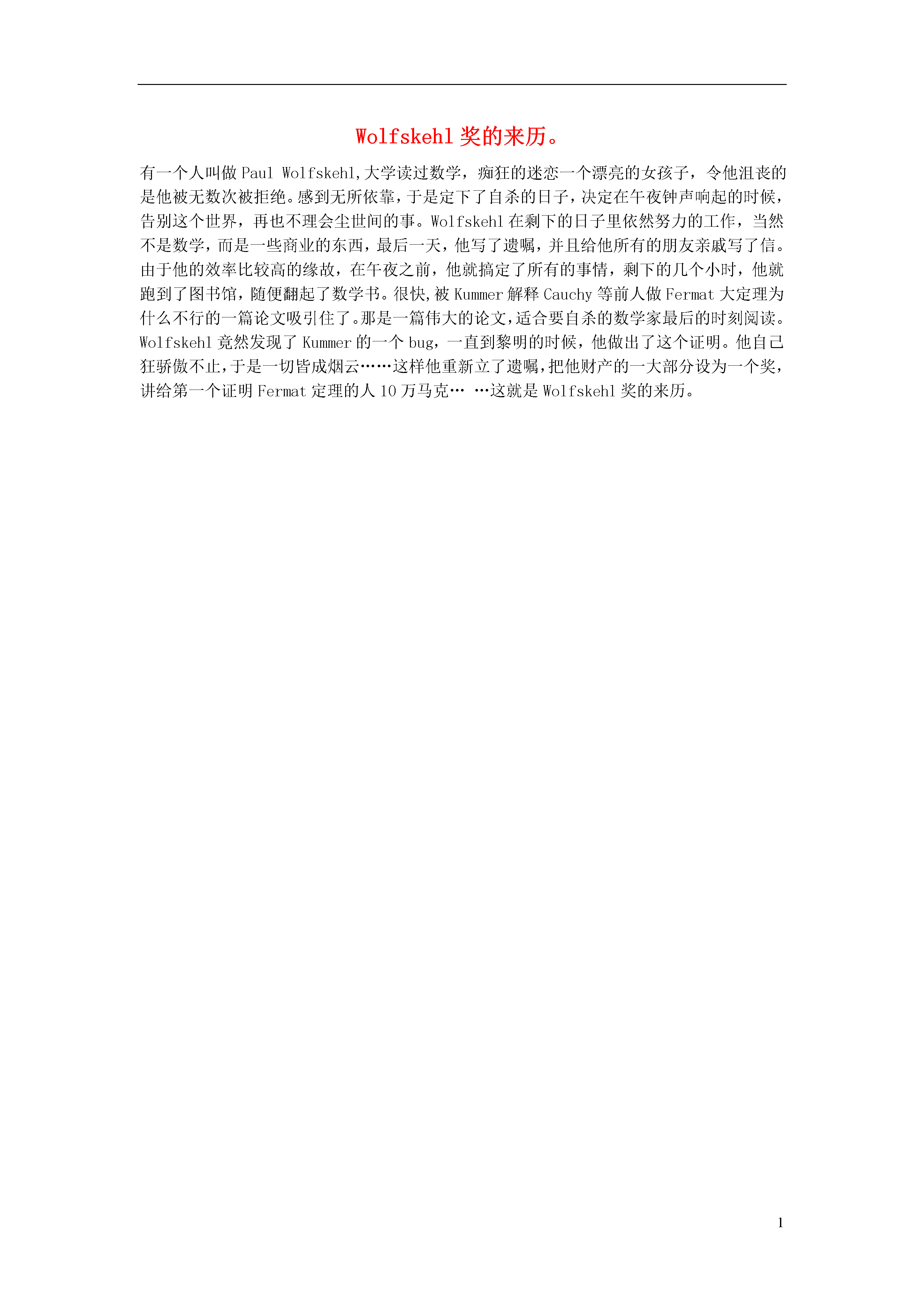 1Wolfskehl奖的来历。有一个人叫做PaulWolfskehl,大学读过数学,痴狂的迷恋一个漂亮的女孩子,令他沮丧的是他被无数次被拒绝。感到无所依靠,于是定下了自杀的日子,决定在午夜钟声响起的时候,告别这个世界,再也不理会尘世间的事。Wolfskehl在剩下的日子里依然努力的工作,当然不是数学,而是一些商业的东西,最后一天,他写了遗嘱,并且给他所有的朋友亲戚写了信。由于他的效率比较高的缘故,在午夜之前,他就搞定了所有的事情,剩下的几个小时,他就跑到了图书馆,随便翻起了数学书。很快,被Kummer解释Cauchy等前人做Fermat大定理为什么不行的一篇论文吸引住了。那是一篇伟大的论文,适合要自杀的数学家最后的时刻阅读。Wolfskehl竟然发现了Kummer的一个bug,一直到黎明的时候,他做出了这个证明。他自己狂骄傲不止,于是一切皆成烟云……这样他重新立了遗嘱,把他财产的一大部分设为一个奖,讲给第一个证明Fermat定理的人10万马克……这就是Wolfskehl奖的来历。