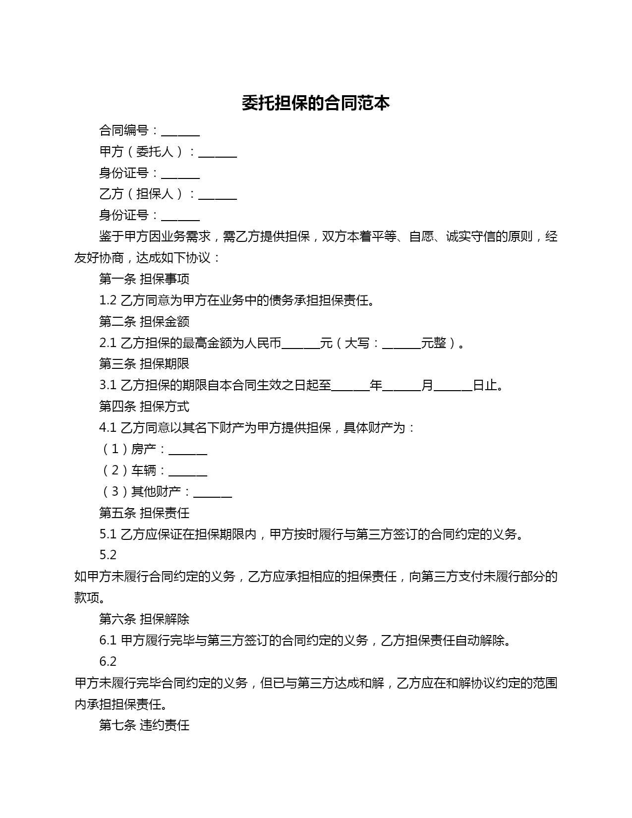 委托担保的合同范本合同编号:_______甲方(委托人):_______身份证号:_______乙方(担保人):_______身份证号:_______鉴于甲方因业务需求,需乙方提供担保,双方本着平等、自愿、诚实守信的原则,经友好协商,达成如下协议:第一条担保事项1.2乙方同意为甲方在业务中的债务承担担保责任。第二条担保金额2.1乙方担保的最高金额为人民币_______元(大写:_______元整)。第三条担保期限3.1乙方担保的期限自本合同生效之日起至_______年_______月_______日止。第四条担保方式4.1乙方同意以其名下财产为甲方提供担保,具体财产为:(1)房产:_______(2)车辆:_______(3)其他财产:_______第五条担保责任5.1乙方应保证在担保期限内,甲方按时履行与第三方签订的合同约定的义务。5.2如甲方未履行合同约定的义务,乙方应承担相应的担保责任,向第三方支付未履行部分的款项。第六条担保解除6.1甲方履行完毕与第三方签订的合同约定的义务,乙方担保责任自动解除。6.2甲方未履行完毕合同约定的义务,但已与第三方达成和解,乙方应在和解协议约定的范围内承担担保责任。第七条违约责任7.1如乙方未按本合同约定承担担保责任,甲方有权要求乙方承担违约责任,赔偿甲方因此遭受的损失。第八条争议解决8.1双方因本合同的履行发生争议,应通过友好协商解决;协商不成的,任何一方均有权向合同签订地人民法院提起诉讼。第九条合同生效9.1本合同自双方签字(或盖章)之日起生效。第十条其他约定10.1本合同一式两份,甲乙双方各执一份。10.2本合同未尽事宜,双方可另行签订补充协议,补充协议与本合同具有同等法律效力。甲方(委托人):_______乙方(担保人):_______签订日期:_______年_______月_______日(签名或盖章)