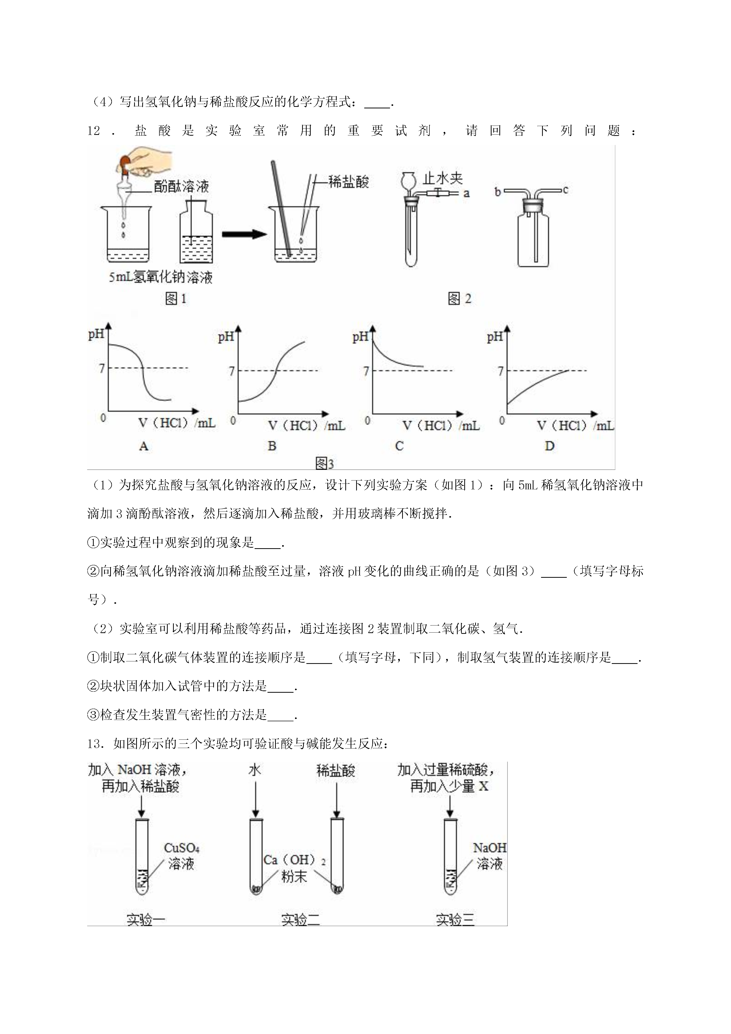 酸和碱的反应一、选择题1.下列反应中属于中和反应的是()A.Na2CO3+2HCl═2NaCl+H2O+CO2↑B.2NaOH+H2SO4═Na2SO4+2H2OC.CO2+2NaOH═Na2CO3+H2OD.Fe+CuSO4═Cu+FeSO42.在滴加了酚酞的氢氧化钠溶液中,逐滴加入稀盐酸至过量,溶液颜色的变化是()A.红色﹣蓝色B.蓝色﹣红色C.红色﹣无色D.无色﹣红色3.下列实际应用中,利用中和反应原理的是()①用氢氧化钠溶液洗涤石油产品中的残余硫酸②用碳酸氢钠治疗胃酸过多③用熟石灰改良酸性土壤④用稀氨水涂抹在蚊子叮咬处(分泌出蚁酸)止痒.A.①②B.②③④C.②③D.①③④4.向含有酚酞的NaOH溶液中滴加盐酸,溶液红色褪去变为无色,此时溶液pH可能是()A.5B.9C.12D.135.“类推”是学习化学过程中常用的思维方法.现有以下类推结果,其中错误的是()①酸碱中和反应生成盐和水,所以生成盐和水反应一定是中和反应;②氧化物中含有氧元素,所以含有氧元素的化合物一定是氧化物;③金属铝与盐酸反应生成AlCl3和H2,所以金属铁与盐酸反应生成FeCl3和H2;④浓盐酸试剂瓶敞口久置后变稀且质量减轻,所以浓硫酸敞口久置也变稀且质量减轻.A.①B.①③C.①②④D.全部6.化学与生活密切相关,根据你所学化学知识和生活经验判断,下列说法正确的是()A.胃酸过多可服用氢氧化钠溶液进行中和B.吸烟对人体健康没有影响,因为燃着的香烟产生的烟气中不含对人体有害的物质C.高楼室内起火应立即打开门窗通风,再用湿毛巾捂住口鼻,蹲下靠近地面或沿着墙壁跑离着火区域D.葡萄糖能为人体组织提供营养,可用葡萄糖溶液为病人补充血糖7.在氢氧化钠溶液中加入一定量的稀盐酸后,下列实验能证明两者恰好完全中和的是()A.滴入适量FeCl3溶液,溶液变黄,但无沉淀生成B.滴入几滴酚酞试液,酚酞试液不变色C.测得反应后溶液中Na+与Cl﹣的个数比为1:1D.滴入适量AgNO3溶液和稀硝酸,观察到有白色沉淀8.图中对所示的事例分析不正确的是()A.盐酸滴入氢氧化钠溶液中,说明钠离子与氯离子结合生成了氯化钠分子B.室内放置活性炭包净化空气,说明活性炭具有吸附作用C.在电流相同、通电时间相同的情况下,电阻越大,该电阻产生的热量越多D.在水平面上用弹簧秤匀速拉动木块,拉力和滑动摩擦力的一对平衡力9.某同学在探究“酸与碱能否发生反应”时,用稀NaOH溶液、稀盐酸和酸碱指示剂进行实验的过程如图,如图所加试剂①②③分别是()A.稀NaOH溶液、石蕊溶液、稀盐酸B.稀盐酸、石蕊溶液、稀NaOH溶液C.稀NaOH溶液、酚酞溶液、稀盐酸D.稀盐酸、酚酞溶液、稀NaOH溶液10.如图是稀HCl和NaOH溶液反应的pH变化曲线图,据图分析能得出的结论正确的是()A.该反应是NaOH溶液滴入稀盐酸B.a克是指加入NaOH溶液的质量C.A点时,溶液的溶质为NaOH、NaClD.B点表示稀盐酸和加入的NaOH溶液质量一定相同二、填空题11.中和反应在生活生产中应用广泛.(1)酸和碱作用生成和水的反应,叫做中和反应;(2)改良酸性土壤,可在土壤中加入适量的;(3)在一定量的氢氧化钠溶液中加一定浓度的稀盐酸,下列能正确反应溶液pH变化的是;(填序号)(4)写出氢氧化钠与稀盐酸反应的化学方程式:.12.盐酸是实验室常用的重要试剂,请回答下列问题:(1)为探究盐酸与氢氧化钠溶液的反应,设计下列实验方案(如图1):向5mL稀氢氧化钠溶液中滴加3滴酚酞溶液,然后逐滴加入稀盐酸,并用玻璃棒不断搅拌.①实验过程中观察到的现象是.②向稀氢氧化钠溶液滴加稀盐酸至过量,溶液pH变化的曲线正确的是(如图3)(填写字母标号).(2)实验室可以利用稀盐酸等药品,通过连接图2装置制取二氧化碳、氢气.①制取二氧化碳气体装置的连接顺序是(填写字母,下同),制取氢气装置的连接顺序是.②块状固体加入试管中的方法是.③检查发生装置气密性的方法是.13.如图所示的三个实验均可验证酸与碱能发生反应:(1)根据实验一回答:①加稀盐酸前,一定能观察到的实验现象是;②该实验通过稀盐酸与反应的现象,验证了酸与碱能发生反应.(2)实验二通过两只试管中的现象对比,可以判断稀盐酸与Ca(OH)2能反应,该实验除需控制所加水和稀盐酸的温度、体积相同外,还需控制相同.(3)实验三中,加入X可验证稀硫酸与碱能发生反应,符合此条件的X是下列物质中的.A.酚酞B.CuOC.Na2CO3D.Ba(NO3)2.14.某化学课堂围绕“酸碱中和反应”,将学生分成若干小组,在老师引导下开展探究活动.以下是教学片段,