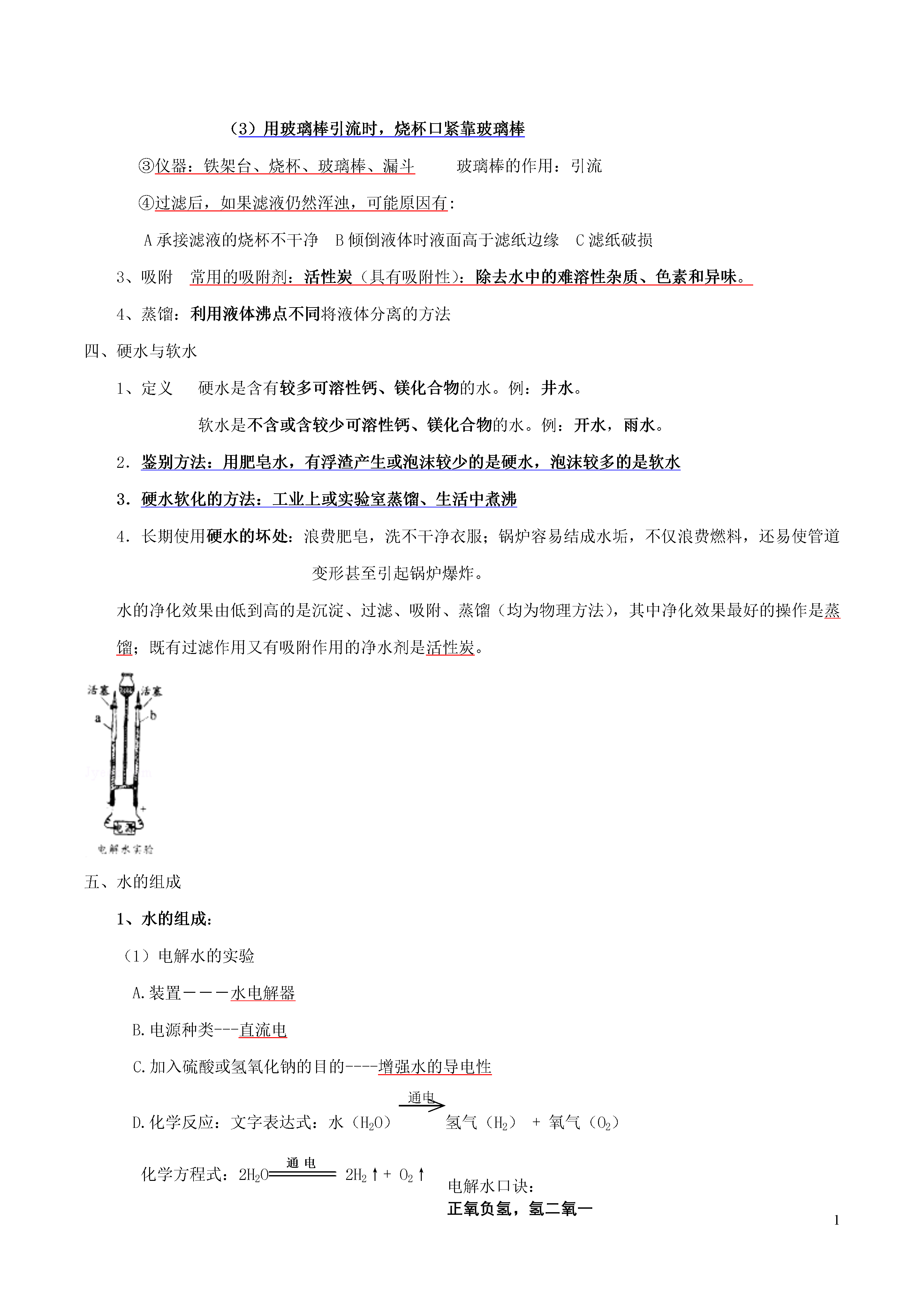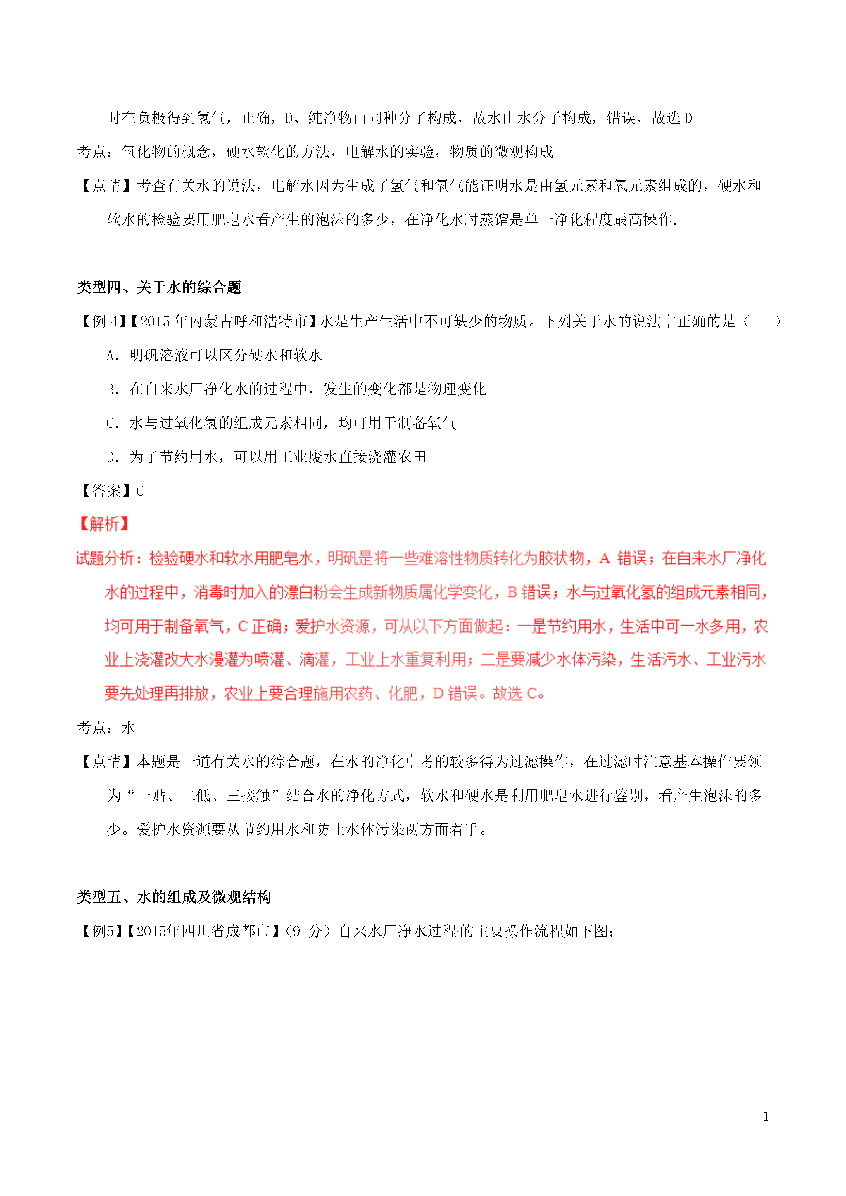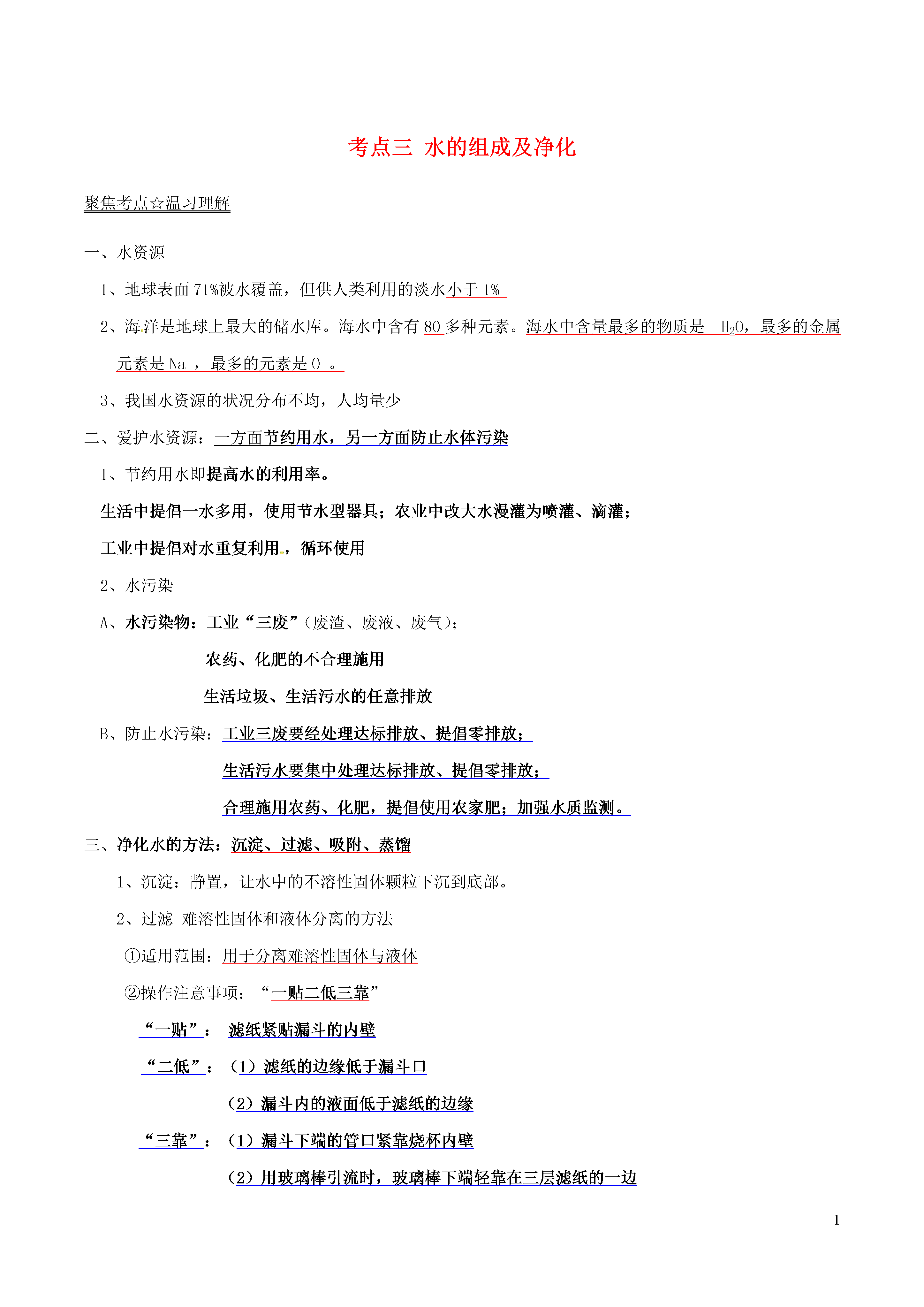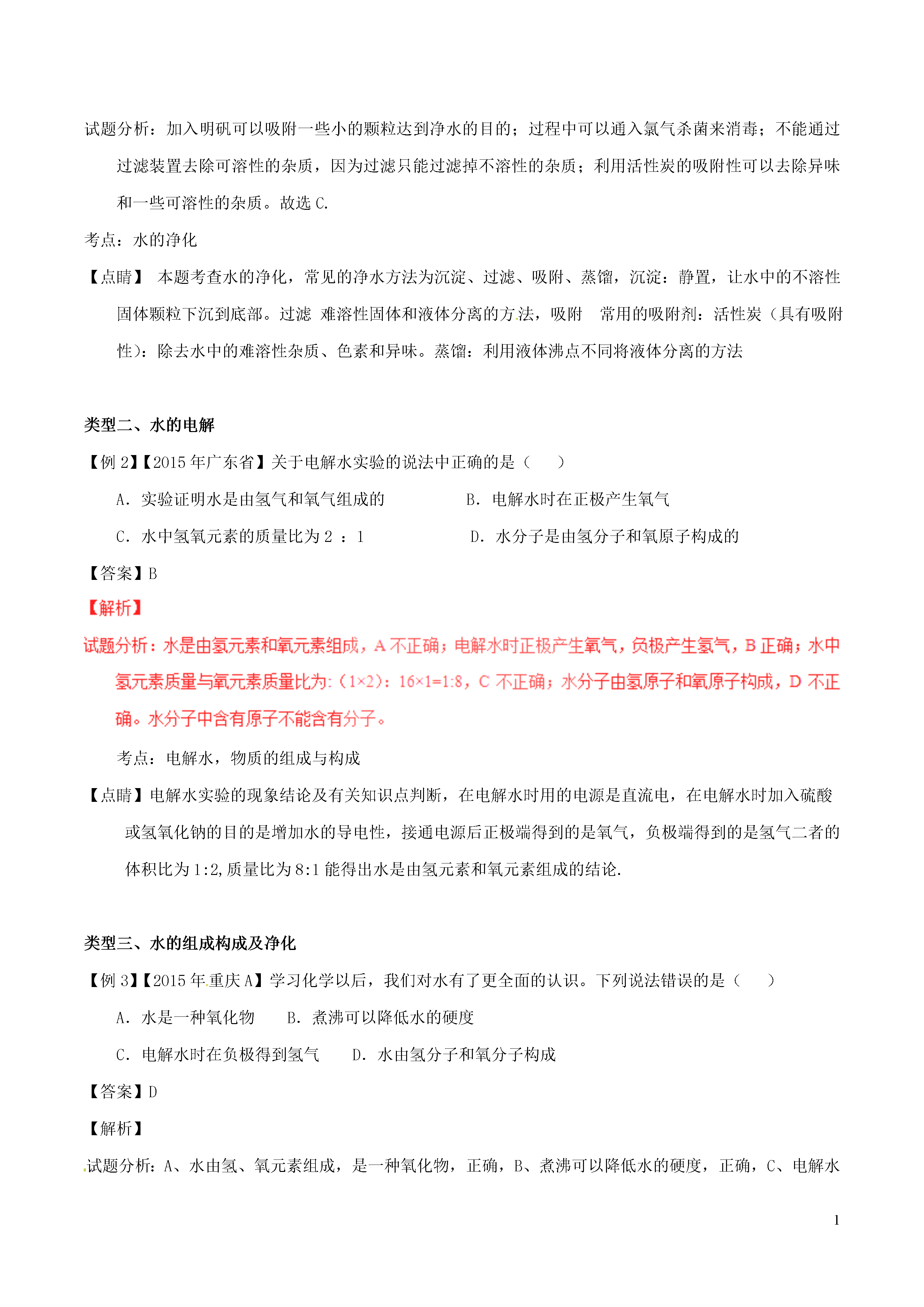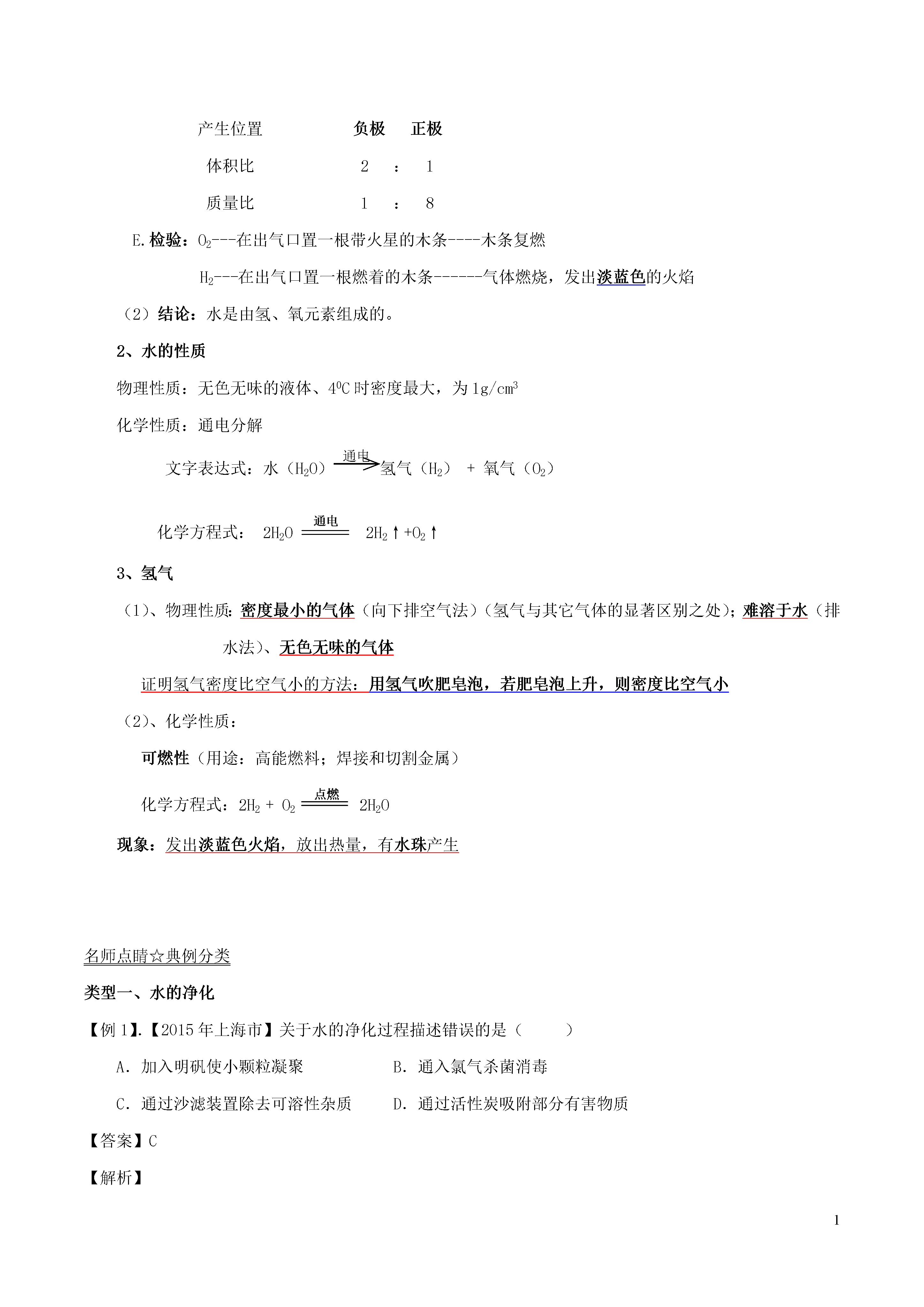 11考点三水的组成及净化聚焦考点☆温习理解一、水资源1、地球表面71%被水覆盖,但供人类利用的淡水小于1%2、海洋是地球上最大的储水库。海水中含有80多种元素。海水中含量最多的物质是H2O,最多的金属元素是Na,最多的元素是O。3、我国水资源的状况分布不均,人均量少二、爱护水资源:一方面节约用水,另一方面防止水体污染1、节约用水即提高水的利用率。生活中提倡一水多用,使用节水型器具;农业中改大水漫灌为喷灌、滴灌;工业中提倡对水重复利用,循环使用2、水污染A、水污染物:工业“三废”(废渣、废液、废气);农药、化肥的不合理施用生活垃圾、生活污水的任意排放B、防止水污染:工业三废要经处理达标排放、提倡零排放;生活污水要集中处理达标排放、提倡零排放;合理施用农药、化肥,提倡使用农家肥;加强水质监测。三、净化水的方法:沉淀、过滤、吸附、蒸馏1、沉淀:静置,让水中的不溶性固体颗粒下沉到底部。2、过滤难溶性固体和液体分离的方法①适用范围:用于分离难溶性固体与液体②操作注意事项:“一贴二低三靠”“一贴”:滤纸紧贴漏斗的内壁“二低”:(1)滤纸的边缘低于漏斗口(2)漏斗内的液面低于滤纸的边缘“三靠”:(1)漏斗下端的管口紧靠烧杯内壁(2)用玻璃棒引流时,玻璃棒下端轻靠在三层滤纸的一边(3)用玻璃棒引流时,烧杯口紧靠玻璃棒③仪器:铁架台、烧杯、玻璃棒、漏斗玻璃棒的作用:引流④过滤后,如果滤液仍然浑浊,可能原因有:A承接滤液的烧杯不干净B倾倒液体时液面高于滤纸边缘C滤纸破损3、吸附常用的吸附剂:活性炭(具有吸附性):除去水中的难溶性杂质、色素和异味。4、蒸馏:利用液体沸点不同将液体分离的方法四、硬水与软水1、定义硬水是含有较多可溶性钙、镁化合物的水。例:井水。软水是不含或含较少可溶性钙、镁化合物的水。例:开水,雨水。2.鉴别方法:用肥皂水,有浮渣产生或泡沫较少的是硬水,泡沫较多的是软水3.硬水软化的方法:工业上或实验室蒸馏、生活中煮沸4.长期使用硬水的坏处:浪费肥皂,洗不干净衣服;锅炉容易结成水垢,不仅浪费燃料,还易使管道变形甚至引起锅炉爆炸。水的净化效果由低到高的是沉淀、过滤、吸附、蒸馏(均为物理方法),其中净化效果最好的操作是蒸馏;既有过滤作用又有吸附作用的净水剂是活性炭。五、水的组成1、水的组成:(1)电解水的实验A.装置―――水电解器B.电源种类---直流电C.加入硫酸或氢氧化钠的目的----增强水的导电性D.化学反应:文字表达式:水(H2O)通电氢气(H2)+氧气(O2)电解水口诀:正氧负氢,氢二氧一化学方程式:2H2O2H2↑+O2↑产生位置负极正极体积比2:1质量比1:8E.检验:O2---在出气口置一根带火星的木条----木条复燃H2---在出气口置一根燃着的木条------气体燃烧,发出淡蓝色的火焰(2)结论:水是由氢、氧元素组成的。2、水的性质物理性质:无色无味的液体、40C时密度最大,为1g/cm3化学性质:通电分解文字表达式:水(H2O)通电氢气(H2)+氧气(O2)化学方程式:2H2O2H2↑+O2↑3、氢气(1)、物理性质:密度最小的气体(向下排空气法)(氢气与其它气体的显著区别之处);难溶于水(排水法)、无色无味的气体证明氢气密度比空气小的方法:用氢气吹肥皂泡,若肥皂泡上升,则密度比空气小(2)、化学性质:可燃性(用途:高能燃料;焊接和切割金属)化学方程式:2H2+O22H2O现象:发出淡蓝色火焰,放出热量,有水珠产生名师点睛☆典例分类类型一、水的净化【例1】.【2015年上海市】关于水的净化过程描述错误的是()A.加入明矾使小颗粒凝聚B.通入氯气杀菌消毒C.通过沙滤装置除去可溶性杂质D.通过活性炭吸附部分有害物质【答案】C【解析】试题分析:加入明矾可以吸附一些小的颗粒达到净水的目的;过程中可以通入氯气杀菌来消毒;不能通过过滤装置去除可溶性的杂质,因为过滤只能过滤掉不溶性的杂质;利用活性炭的吸附性可以去除异味和一些可溶性的杂质。故选C.考点:水的净化【点睛】本题考查水的净化,常见的净水方法为沉淀、过滤、吸附、蒸馏,沉淀:静置,让水中的不溶性固体颗粒下沉到底部。过滤难溶性固体和液体分离的方法,吸附常用的吸附剂:活性炭(具有吸附性):除去水中的难溶性杂质、色素和异味。蒸馏:利用液体沸点不同将液体分离的方法类型二、水的电解【例2】【2015年广东省】关于电解水实验的说法中正确的是()A.实验证明水是由氢气和氧气组成的B.电解水时在正极产生氧气C.水中氢氧元素的质量比为2:1D.水分子是由氢分子和氧原子构成的【答案】B考点:电解水,物