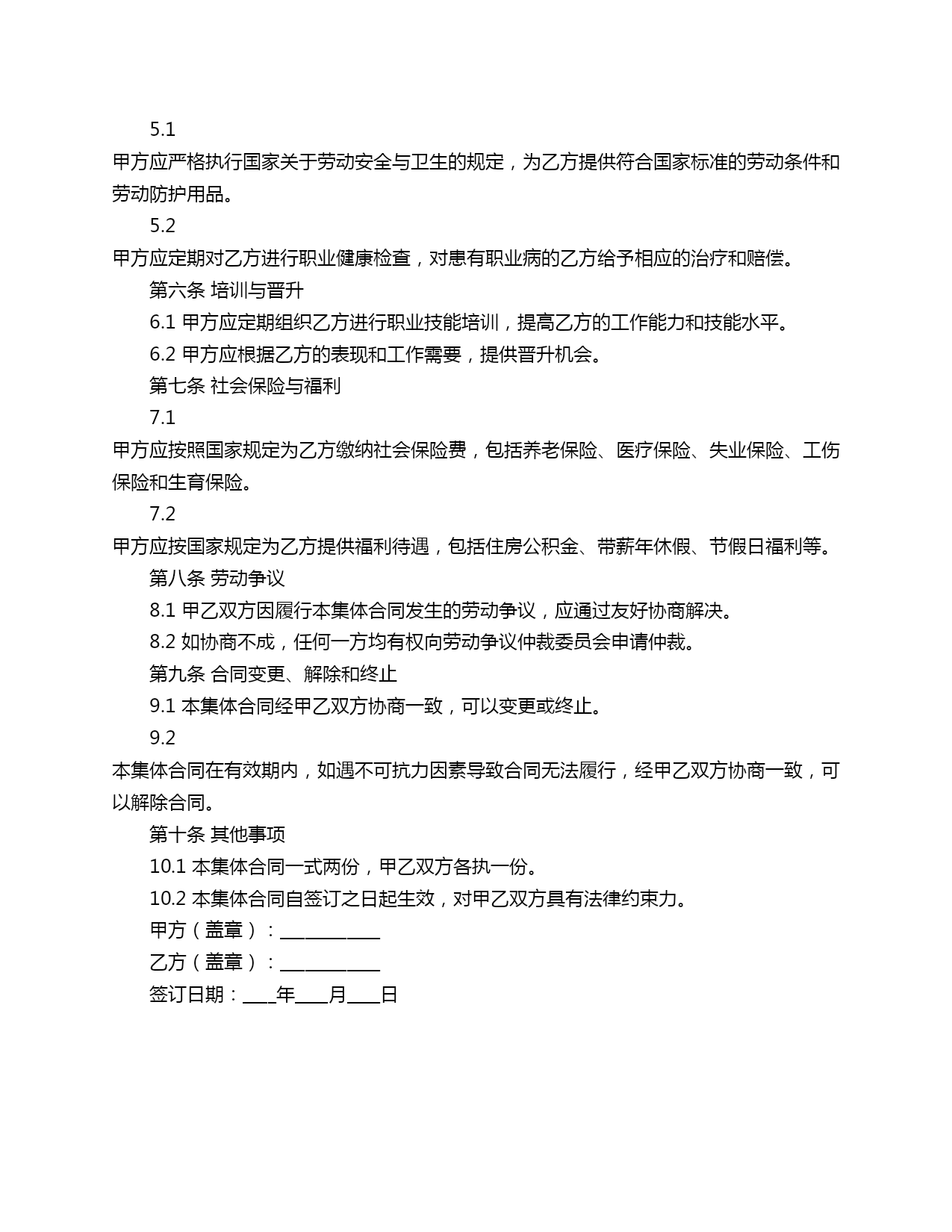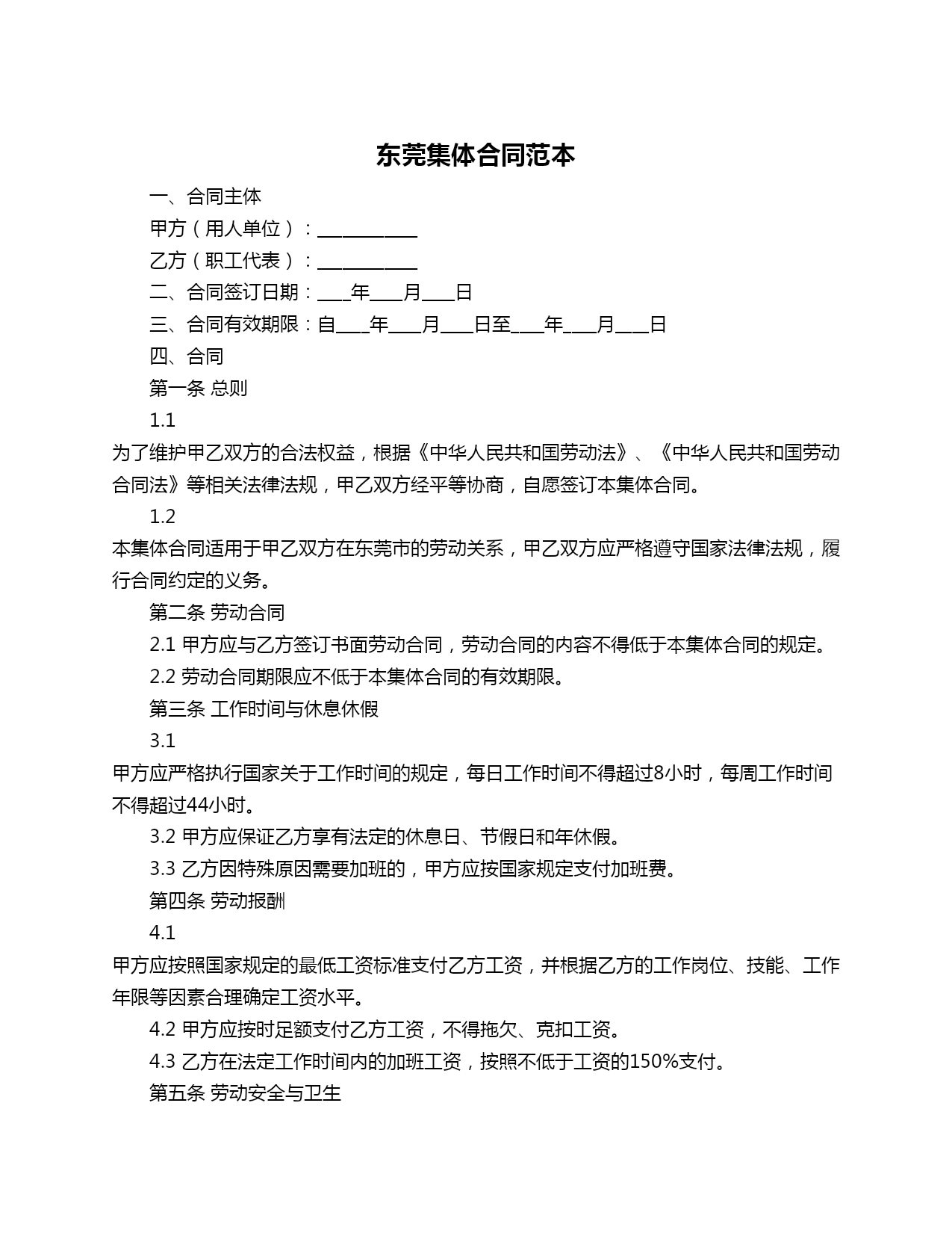 东莞集体合同范本一、合同主体甲方(用人单位):____________乙方(职工代表):____________二、合同签订日期:____年____月____日三、合同有效期限:自____年____月____日至____年____月____日四、合同第一条总则1.1为了维护甲乙双方的合法权益,根据《中华人民共和国劳动法》、《中华人民共和国劳动合同法》等相关法律法规,甲乙双方经平等协商,自愿签订本集体合同。1.2本集体合同适用于甲乙双方在东莞市的劳动关系,甲乙双方应严格遵守国家法律法规,履行合同约定的义务。第二条劳动合同2.1甲方应与乙方签订书面劳动合同,劳动合同的内容不得低于本集体合同的规定。2.2劳动合同期限应不低于本集体合同的有效期限。第三条工作时间与休息休假3.1甲方应严格执行国家关于工作时间的规定,每日工作时间不得超过8小时,每周工作时间不得超过44小时。3.2甲方应保证乙方享有法定的休息日、节假日和年休假。3.3乙方因特殊原因需要加班的,甲方应按国家规定支付加班费。第四条劳动报酬4.1甲方应按照国家规定的最低工资标准支付乙方工资,并根据乙方的工作岗位、技能、工作年限等因素合理确定工资水平。4.2甲方应按时足额支付乙方工资,不得拖欠、克扣工资。4.3乙方在法定工作时间内的加班工资,按照不低于工资的150%支付。第五条劳动安全与卫生5.1甲方应严格执行国家关于劳动安全与卫生的规定,为乙方提供符合国家标准的劳动条件和劳动防护用品。5.2甲方应定期对乙方进行职业健康检查,对患有职业病的乙方给予相应的治疗和赔偿。第六条培训与晋升6.1甲方应定期组织乙方进行职业技能培训,提高乙方的工作能力和技能水平。6.2甲方应根据乙方的表现和工作需要,提供晋升机会。第七条社会保险与福利7.1甲方应按照国家规定为乙方缴纳社会保险费,包括养老保险、医疗保险、失业保险、工伤保险和生育保险。7.2甲方应按国家规定为乙方提供福利待遇,包括住房公积金、带薪年休假、节假日福利等。第八条劳动争议8.1甲乙双方因履行本集体合同发生的劳动争议,应通过友好协商解决。8.2如协商不成,任何一方均有权向劳动争议仲裁委员会申请仲裁。第九条合同变更、解除和终止9.1本集体合同经甲乙双方协商一致,可以变更或终止。9.2本集体合同在有效期内,如遇不可抗力因素导致合同无法履行,经甲乙双方协商一致,可以解除合同。第十条其他事项10.1本集体合同一式两份,甲乙双方各执一份。10.2本集体合同自签订之日起生效,对甲乙双方具有法律约束力。甲方(盖章):____________乙方(盖章):____________签订日期:____年____月____日