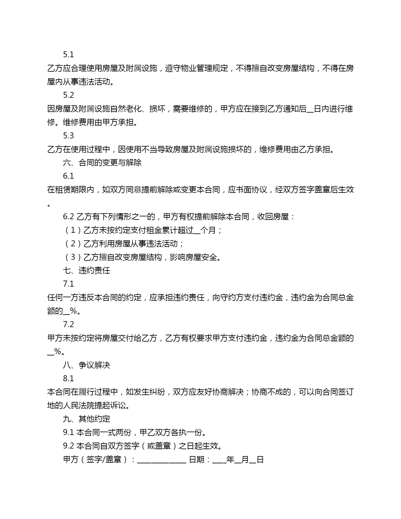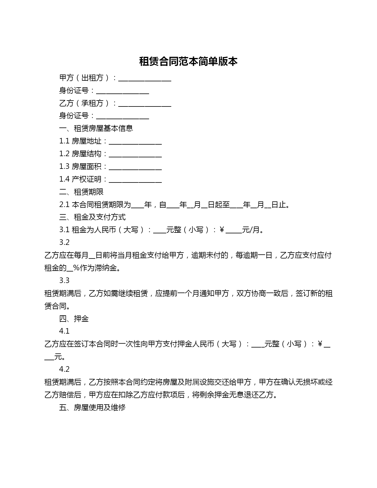 租赁合同范本简单版本甲方(出租方):________________身份证号:________________乙方(承租方):________________身份证号:________________一、租赁房屋基本信息1.1房屋地址:________________1.2房屋结构:________________1.3房屋面积:________________1.4产权证明:________________二、租赁期限2.1本合同租赁期限为____年,自____年__月__日起至____年__月__日止。三、租金及支付方式3.1租金为人民币(大写):____元整(小写):¥_____元/月。3.2乙方应在每月__日前将当月租金支付给甲方,逾期未付的,每逾期一日,乙方应支付应付租金的__%作为滞纳金。3.3租赁期满后,乙方如需继续租赁,应提前一个月通知甲方,双方协商一致后,签订新的租赁合同。四、押金4.1乙方应在签订本合同时一次性向甲方支付押金人民币(大写):____元整(小写):¥_____元。4.2租赁期满后,乙方按照本合同约定将房屋及附属设施交还给甲方,甲方在确认无损坏或经乙方赔偿后,甲方应在扣除乙方应付款项后,将剩余押金无息退还乙方。五、房屋使用及维修5.1乙方应合理使用房屋及附属设施,遵守物业管理规定,不得擅自改变房屋结构,不得在房屋内从事违法活动。5.2因房屋及附属设施自然老化、损坏,需要维修的,甲方应在接到乙方通知后__日内进行维修。维修费用由甲方承担。5.3乙方在使用过程中,因使用不当导致房屋及附属设施损坏的,维修费用由乙方承担。六、合同的变更与解除6.1在租赁期限内,如双方同意提前解除或变更本合同,应书面协议,经双方签字盖章后生效。6.2乙方有下列情形之一的,甲方有权提前解除本合同,收回房屋:(1)乙方未按约定支付租金累计超过__个月;(2)乙方利用房屋从事违法活动;(3)乙方擅自改变房屋结构,影响房屋安全。七、违约责任7.1任何一方违反本合同的约定,应承担违约责任,向守约方支付违约金,违约金为合同总金额的__%。7.2甲方未按约定将房屋交付给乙方,乙方有权要求甲方支付违约金,违约金为合同总金额的__%。八、争议解决8.1本合同在履行过程中,如发生纠纷,双方应友好协商解决;协商不成的,可以向合同签订地的人民法院提起诉讼。九、其他约定9.1本合同一式两份,甲乙双方各执一份。9.2本合同自双方签字(或盖章)之日起生效。甲方(签字/盖章):______________日期:____年__月__日乙方(签字/盖章):______________日期:____年__月__日