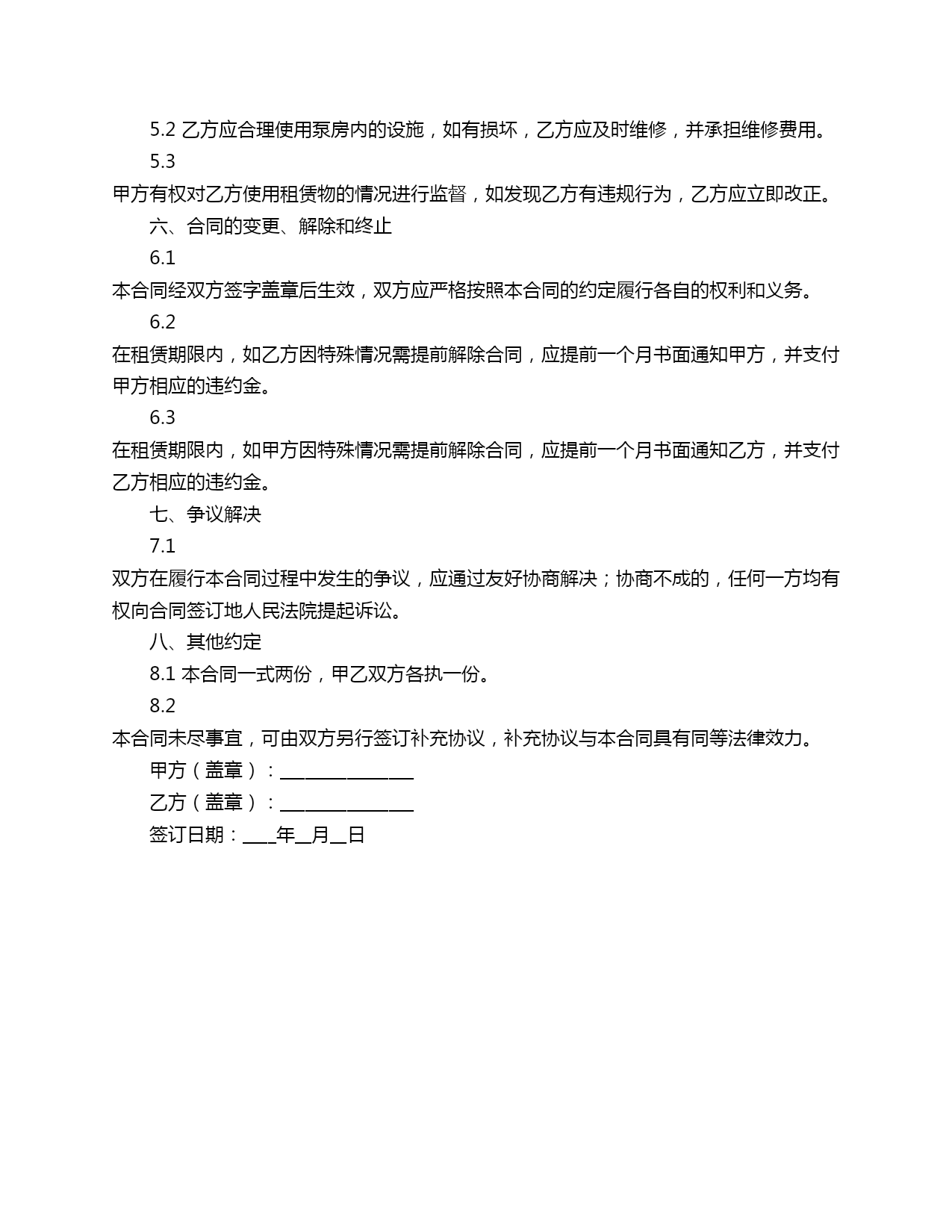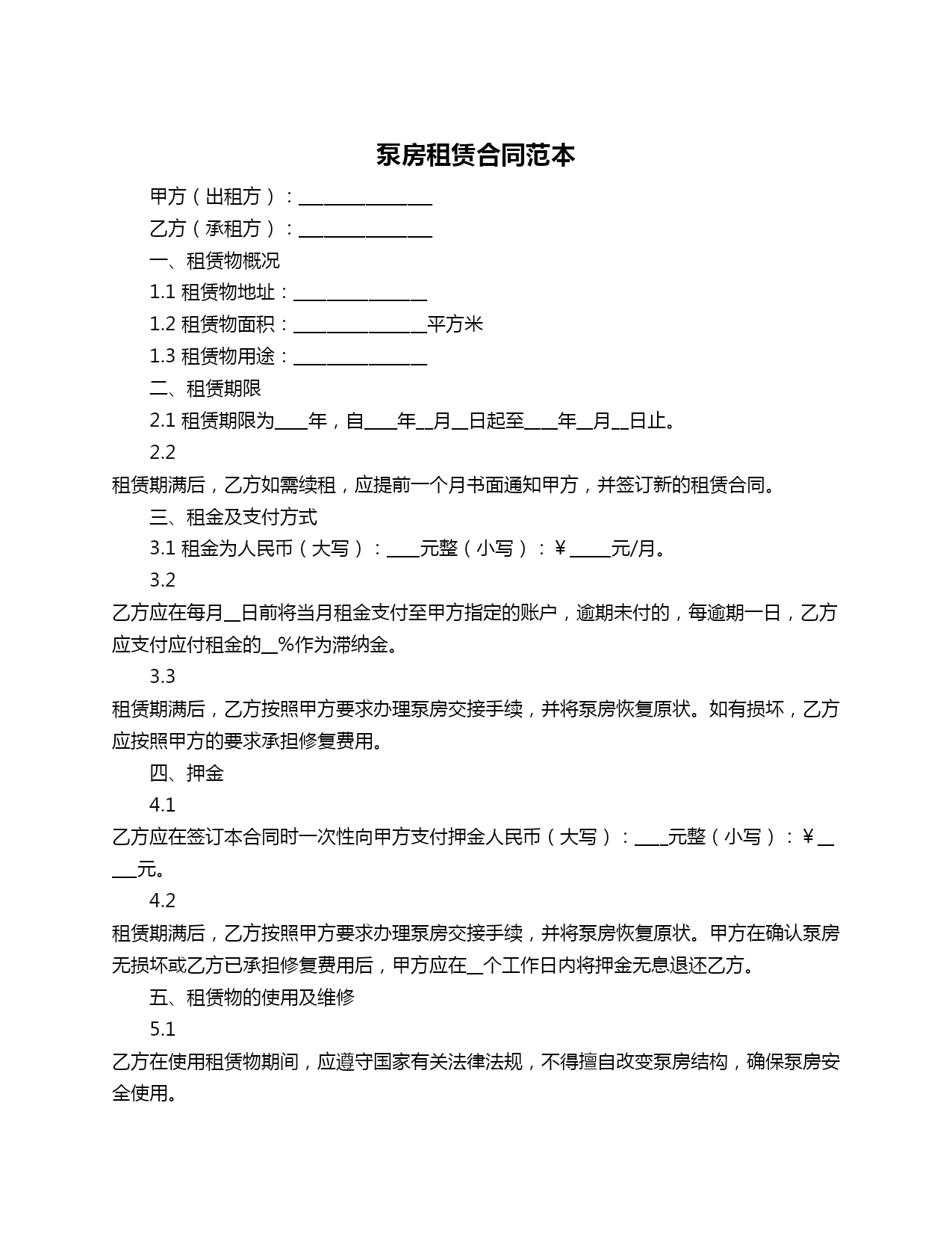 泵房租赁合同范本甲方(出租方):________________乙方(承租方):________________一、租赁物概况1.1租赁物地址:________________1.2租赁物面积:________________平方米1.3租赁物用途:________________二、租赁期限2.1租赁期限为____年,自____年__月__日起至____年__月__日止。2.2租赁期满后,乙方如需续租,应提前一个月书面通知甲方,并签订新的租赁合同。三、租金及支付方式3.1租金为人民币(大写):____元整(小写):¥_____元/月。3.2乙方应在每月__日前将当月租金支付至甲方指定的账户,逾期未付的,每逾期一日,乙方应支付应付租金的__%作为滞纳金。3.3租赁期满后,乙方按照甲方要求办理泵房交接手续,并将泵房恢复原状。如有损坏,乙方应按照甲方的要求承担修复费用。四、押金4.1乙方应在签订本合同时一次性向甲方支付押金人民币(大写):____元整(小写):¥_____元。4.2租赁期满后,乙方按照甲方要求办理泵房交接手续,并将泵房恢复原状。甲方在确认泵房无损坏或乙方已承担修复费用后,甲方应在__个工作日内将押金无息退还乙方。五、租赁物的使用及维修5.1乙方在使用租赁物期间,应遵守国家有关法律法规,不得擅自改变泵房结构,确保泵房安全使用。5.2乙方应合理使用泵房内的设施,如有损坏,乙方应及时维修,并承担维修费用。5.3甲方有权对乙方使用租赁物的情况进行监督,如发现乙方有违规行为,乙方应立即改正。六、合同的变更、解除和终止6.1本合同经双方签字盖章后生效,双方应严格按照本合同的约定履行各自的权利和义务。6.2在租赁期限内,如乙方因特殊情况需提前解除合同,应提前一个月书面通知甲方,并支付甲方相应的违约金。6.3在租赁期限内,如甲方因特殊情况需提前解除合同,应提前一个月书面通知乙方,并支付乙方相应的违约金。七、争议解决7.1双方在履行本合同过程中发生的争议,应通过友好协商解决;协商不成的,任何一方均有权向合同签订地人民法院提起诉讼。八、其他约定8.1本合同一式两份,甲乙双方各执一份。8.2本合同未尽事宜,可由双方另行签订补充协议,补充协议与本合同具有同等法律效力。甲方(盖章):________________乙方(盖章):________________签订日期:____年__月__日