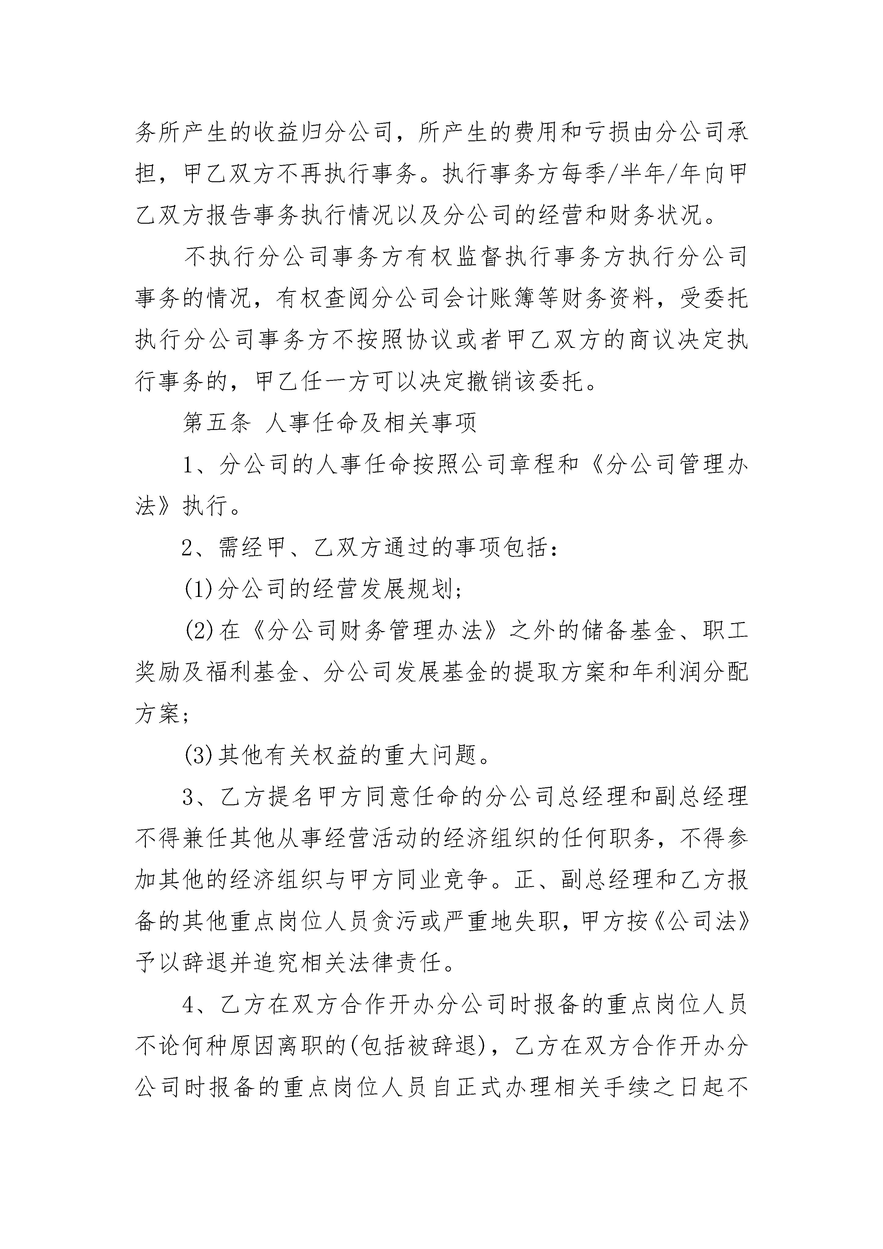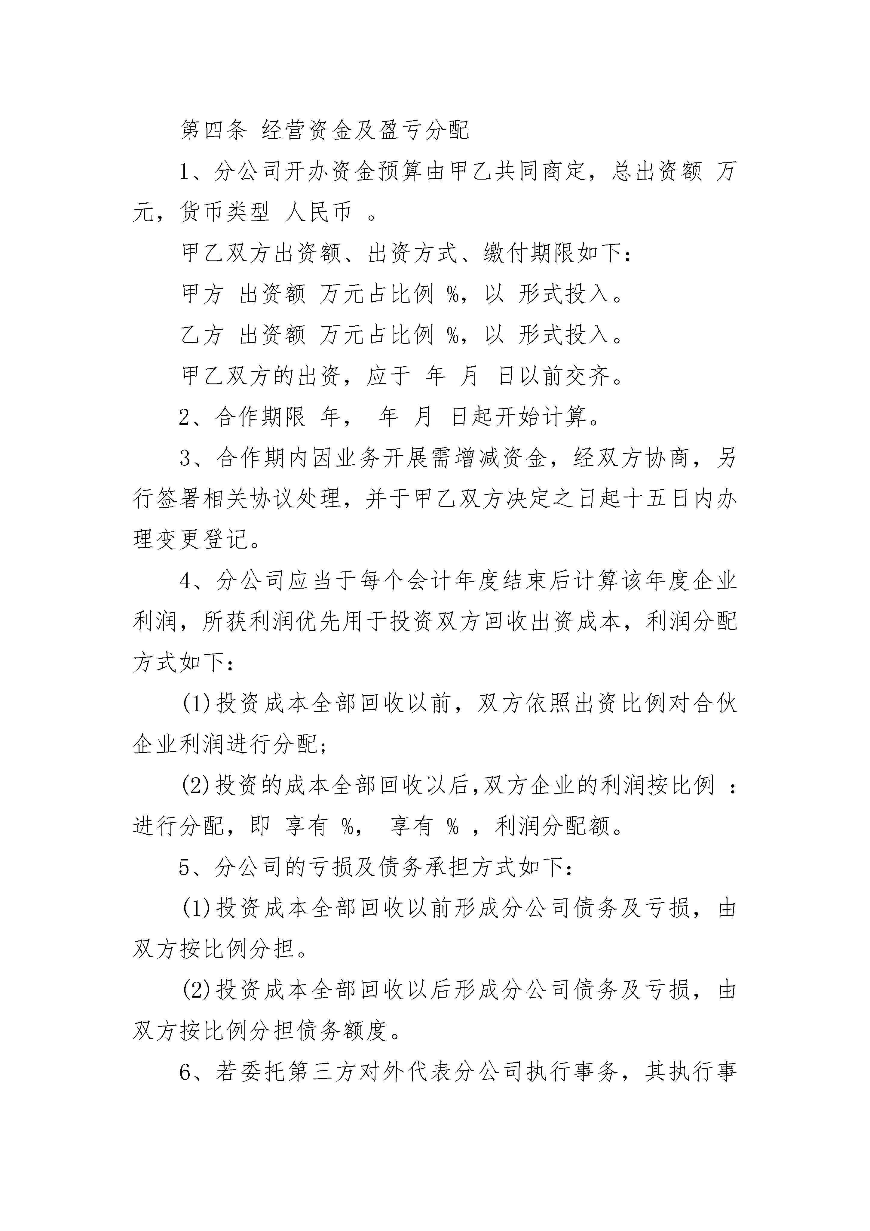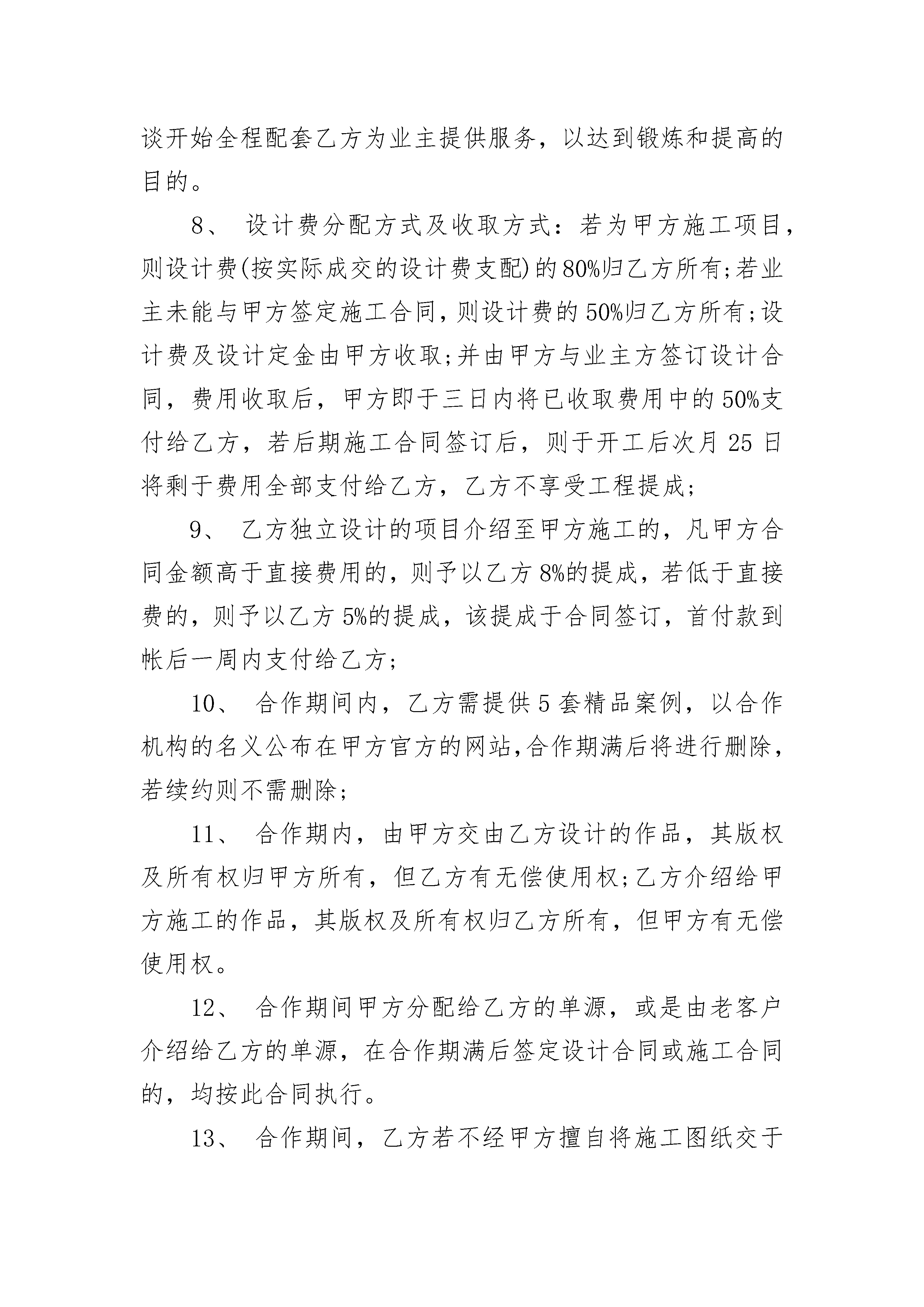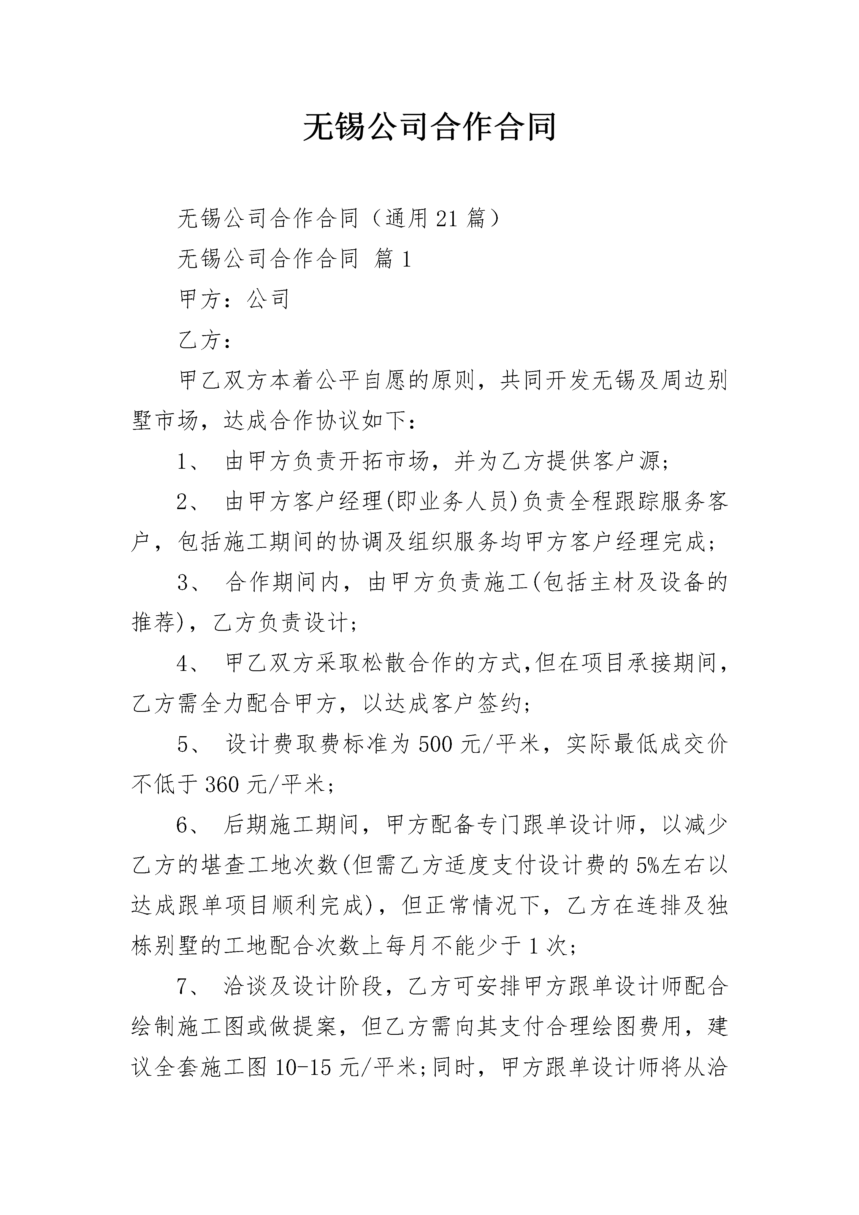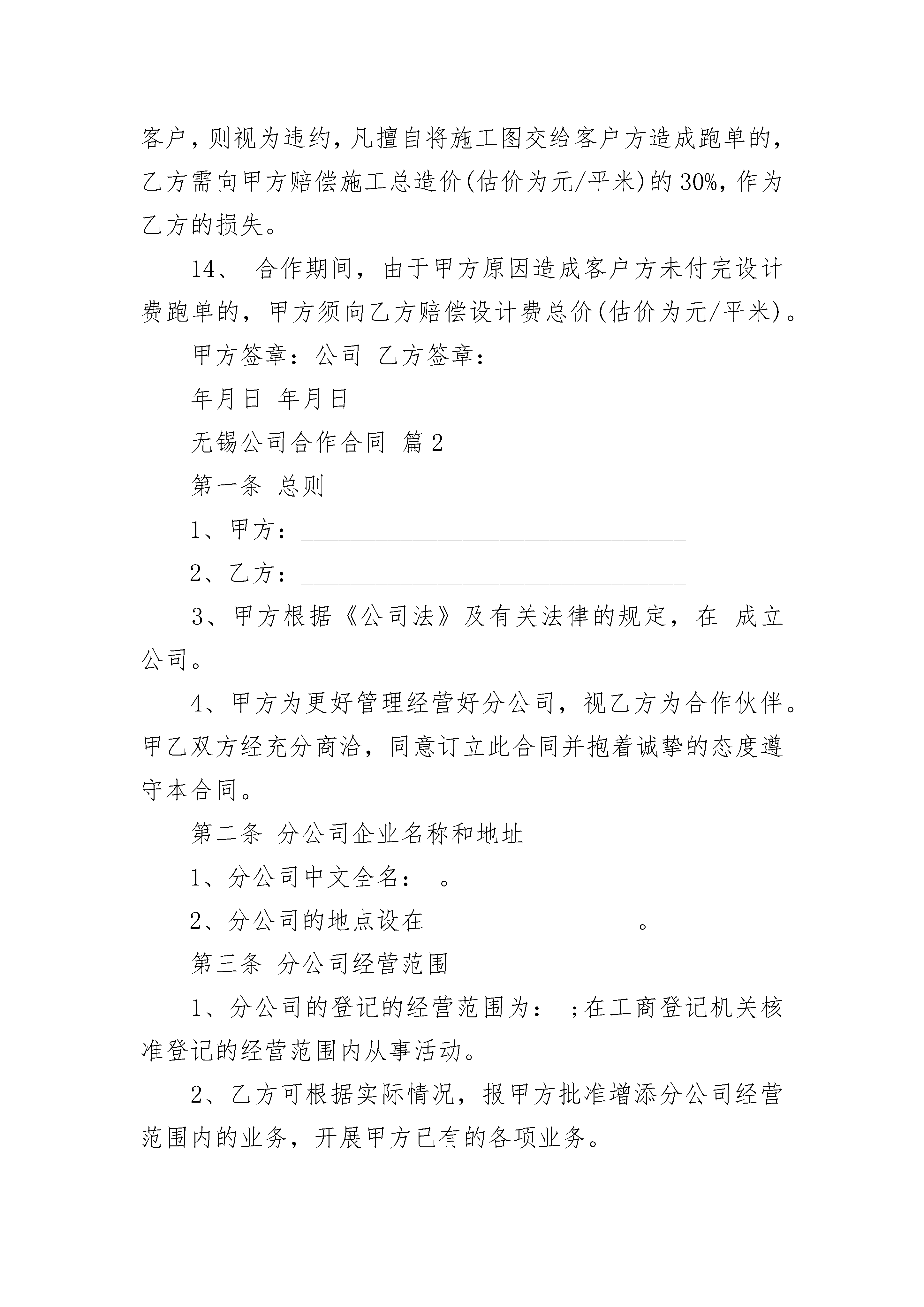 无锡公司合作合同无锡公司合作合同(通用21篇)无锡公司合作合同篇1甲方:公司乙方:甲乙双方本着公平自愿的原则,共同开发无锡及周边别墅市场,达成合作协议如下:1、由甲方负责开拓市场,并为乙方提供客户源;2、由甲方客户经理(即业务人员)负责全程跟踪服务客户,包括施工期间的协调及组织服务均甲方客户经理完成;3、合作期间内,由甲方负责施工(包括主材及设备的推荐),乙方负责设计;4、甲乙双方采取松散合作的方式,但在项目承接期间,乙方需全力配合甲方,以达成客户签约;5、设计费取费标准为500元/平米,实际最低成交价不低于360元/平米;6、后期施工期间,甲方配备专门跟单设计师,以减少乙方的堪查工地次数(但需乙方适度支付设计费的5%左右以达成跟单项目顺利完成),但正常情况下,乙方在连排及独栋别墅的工地配合次数上每月不能少于1次;7、洽谈及设计阶段,乙方可安排甲方跟单设计师配合绘制施工图或做提案,但乙方需向其支付合理绘图费用,建议全套施工图10-15元/平米;同时,甲方跟单设计师将从洽谈开始全程配套乙方为业主提供服务,以达到锻炼和提高的目的。8、设计费分配方式及收取方式:若为甲方施工项目,则设计费(按实际成交的设计费支配)的80%归乙方所有;若业主未能与甲方签定施工合同,则设计费的50%归乙方所有;设计费及设计定金由甲方收取;并由甲方与业主方签订设计合同,费用收取后,甲方即于三日内将已收取费用中的50%支付给乙方,若后期施工合同签订后,则于开工后次月25日将剩于费用全部支付给乙方,乙方不享受工程提成;9、乙方独立设计的项目介绍至甲方施工的,凡甲方合同金额高于直接费用的,则予以乙方8%的提成,若低于直接费的,则予以乙方5%的提成,该提成于合同签订,首付款到帐后一周内支付给乙方;10、合作期间内,乙方需提供5套精品案例,以合作机构的名义公布在甲方官方的网站,合作期满后将进行删除,若续约则不需删除;11、合作期内,由甲方交由乙方设计的作品,其版权及所有权归甲方所有,但乙方有无偿使用权;乙方介绍给甲方施工的作品,其版权及所有权归乙方所有,但甲方有无偿使用权。12、合作期间甲方分配给乙方的单源,或是由老客户介绍给乙方的单源,在合作期满后签定设计合同或施工合同的,均按此合同执行。13、合作期间,乙方若不经甲方擅自将施工图纸交于客户,则视为违约,凡擅自将施工图交给客户方造成跑单的,乙方需向甲方赔偿施工总造价(估价为元/平米)的30%,作为乙方的损失。14、合作期间,由于甲方原因造成客户方未付完设计费跑单的,甲方须向乙方赔偿设计费总价(估价为元/平米)。甲方签章:公司乙方签章:年月日年月日无锡公司合作合同篇2第一条总则1、甲方:_______________________________2、乙方:_______________________________3、甲方根据《公司法》及有关法律的规定,在成立公司。4、甲方为更好管理经营好分公司,视乙方为合作伙伴。甲乙双方经充分商洽,同意订立此合同并抱着诚挚的态度遵守本合同。第二条分公司企业名称和地址1、分公司中文全名:。2、分公司的地点设在_________________。第三条分公司经营范围1、分公司的登记的经营范围为:;在工商登记机关核准登记的经营范围内从事活动。2、乙方可根据实际情况,报甲方批准增添分公司经营范围内的业务,开展甲方已有的各项业务。第四条经营资金及盈亏分配1、分公司开办资金预算由甲乙共同商定,总出资额万元,货币类型人民币。甲乙双方出资额、出资方式、缴付期限如下:甲方出资额万元占比例%,以形式投入。乙方出资额万元占比例%,以形式投入。甲乙双方的出资,应于年月日以前交齐。2、合作期限年,年月日起开始计算。3、合作期内因业务开展需增减资金,经双方协商,另行签署相关协议处理,并于甲乙双方决定之日起十五日内办理变更登记。4、分公司应当于每个会计年度结束后计算该年度企业利润,所获利润优先用于投资双方回收出资成本,利润分配方式如下:(1)投资成本全部回收以前,双方依照出资比例对合伙企业利润进行分配;(2)投资的成本全部回收以后,双方企业的利润按比例:进行分配,即享有%,享有%,利润分配额。5、分公司的亏损及债务承担方式如下:(1)投资成本全部回收以前形成分公司债务及亏损,由双方按比例分担。(2)投资成本全部回收以后形成分公司债务及亏损,由双方按比例分担债务额度。6、若委托第三方对外代表分公司执行事务,其执行事务所产生的收益归分公司,所产生的费用和亏损由分公司承担,甲乙双方不再执行事务。执行事务方每季/半年/年向甲乙双方报告事务执行情况以及分公司的经营和财务状况。不执行分公司事务方有权监督执行事务方执行分公司事务的情况,有权查阅分公司会计账簿等财务资料,受委托执行分公司事务方不按照协议或者甲乙双方的商
