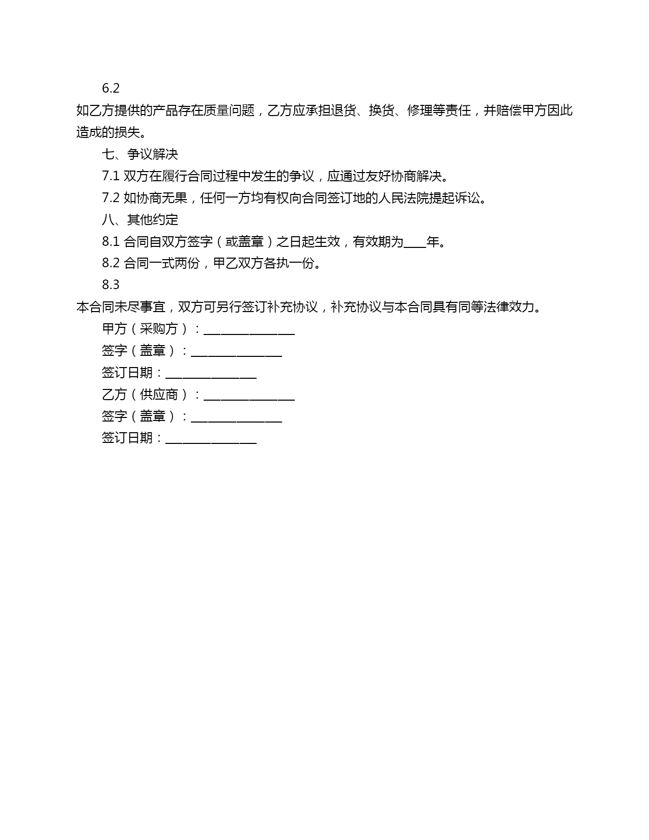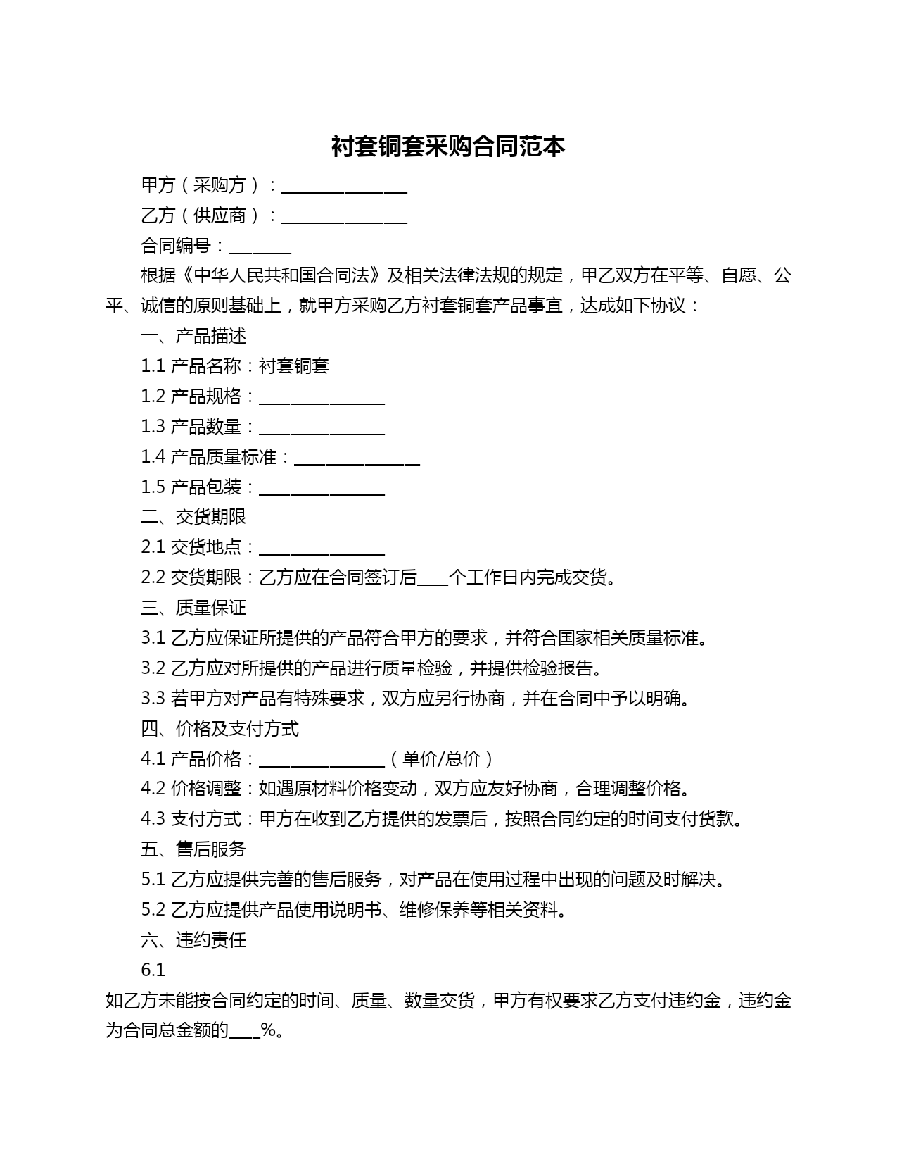 衬套铜套采购合同范本甲方(采购方):________________乙方(供应商):________________合同编号:________根据《中华人民共和国合同法》及相关法律法规的规定,甲乙双方在平等、自愿、公平、诚信的原则基础上,就甲方采购乙方衬套铜套产品事宜,达成如下协议:一、产品描述1.1产品名称:衬套铜套1.2产品规格:________________1.3产品数量:________________1.4产品质量标准:________________1.5产品包装:________________二、交货期限2.1交货地点:________________2.2交货期限:乙方应在合同签订后____个工作日内完成交货。三、质量保证3.1乙方应保证所提供的产品符合甲方的要求,并符合国家相关质量标准。3.2乙方应对所提供的产品进行质量检验,并提供检验报告。3.3若甲方对产品有特殊要求,双方应另行协商,并在合同中予以明确。四、价格及支付方式4.1产品价格:________________(单价/总价)4.2价格调整:如遇原材料价格变动,双方应友好协商,合理调整价格。4.3支付方式:甲方在收到乙方提供的发票后,按照合同约定的时间支付货款。五、售后服务5.1乙方应提供完善的售后服务,对产品在使用过程中出现的问题及时解决。5.2乙方应提供产品使用说明书、维修保养等相关资料。六、违约责任6.1如乙方未能按合同约定的时间、质量、数量交货,甲方有权要求乙方支付违约金,违约金为合同总金额的____%。6.2如乙方提供的产品存在质量问题,乙方应承担退货、换货、修理等责任,并赔偿甲方因此造成的损失。七、争议解决7.1双方在履行合同过程中发生的争议,应通过友好协商解决。7.2如协商无果,任何一方均有权向合同签订地的人民法院提起诉讼。八、其他约定8.1合同自双方签字(或盖章)之日起生效,有效期为____年。8.2合同一式两份,甲乙双方各执一份。8.3本合同未尽事宜,双方可另行签订补充协议,补充协议与本合同具有同等法律效力。甲方(采购方):________________签字(盖章):________________签订日期:________________乙方(供应商):________________签字(盖章):________________签订日期:________________