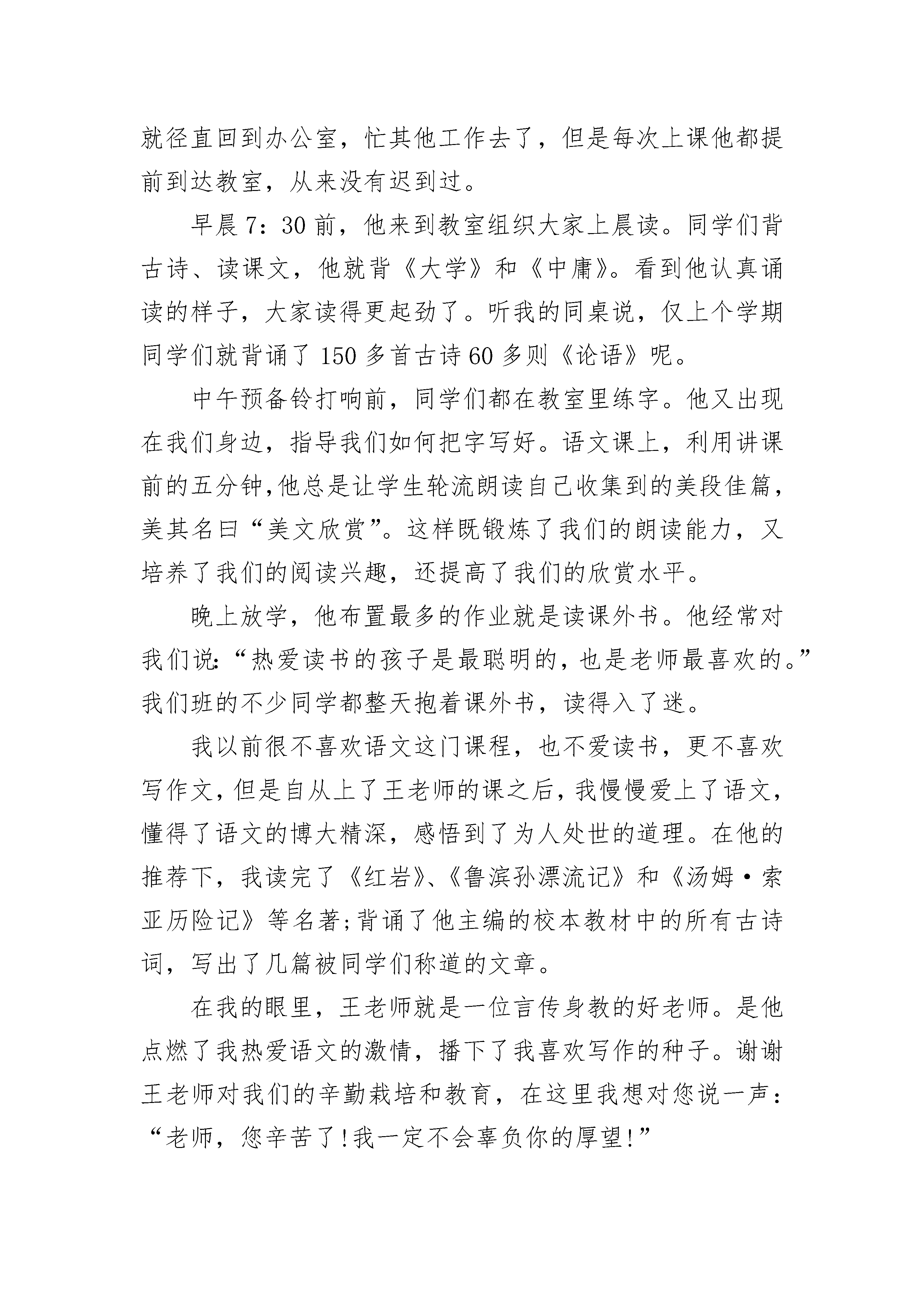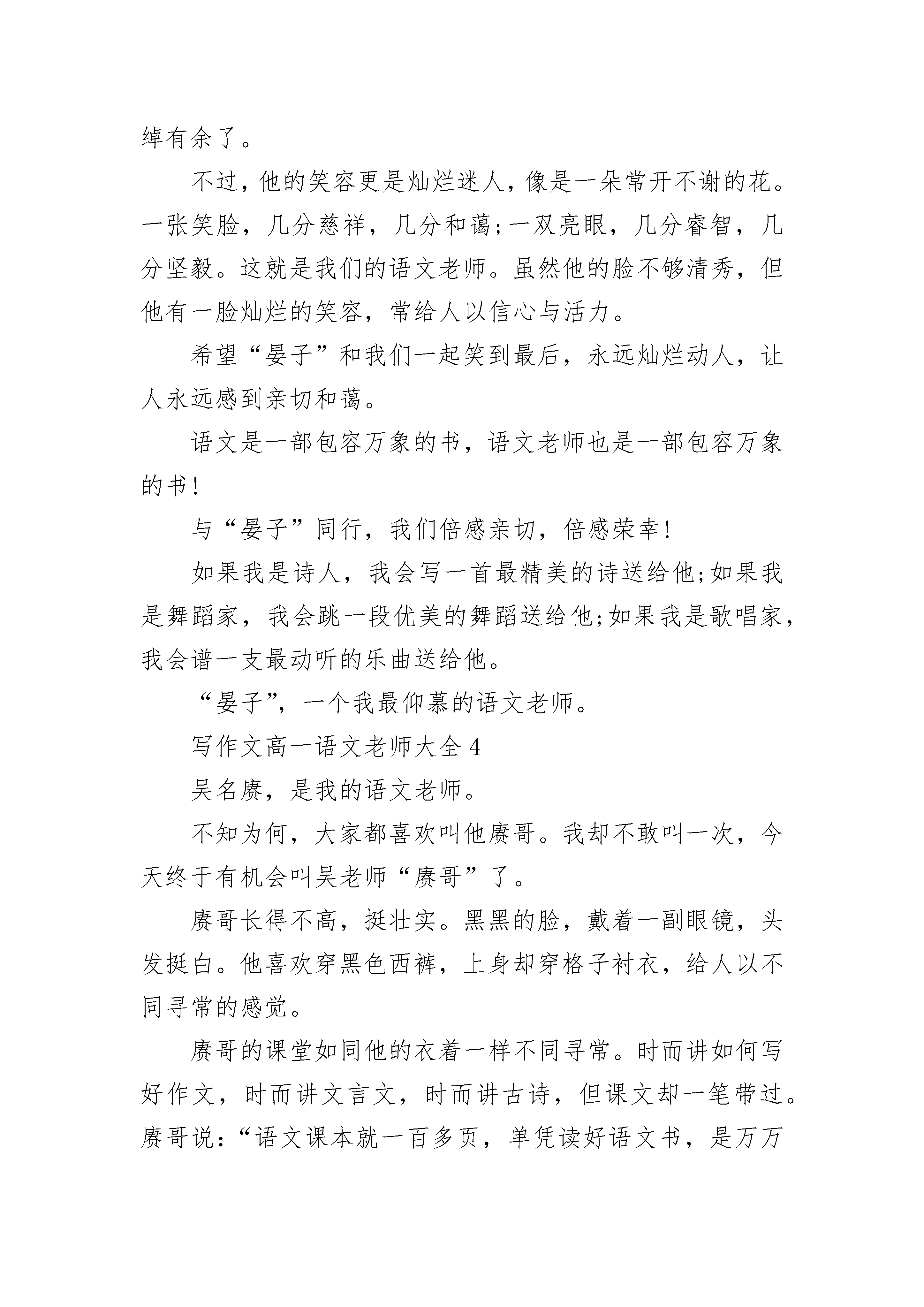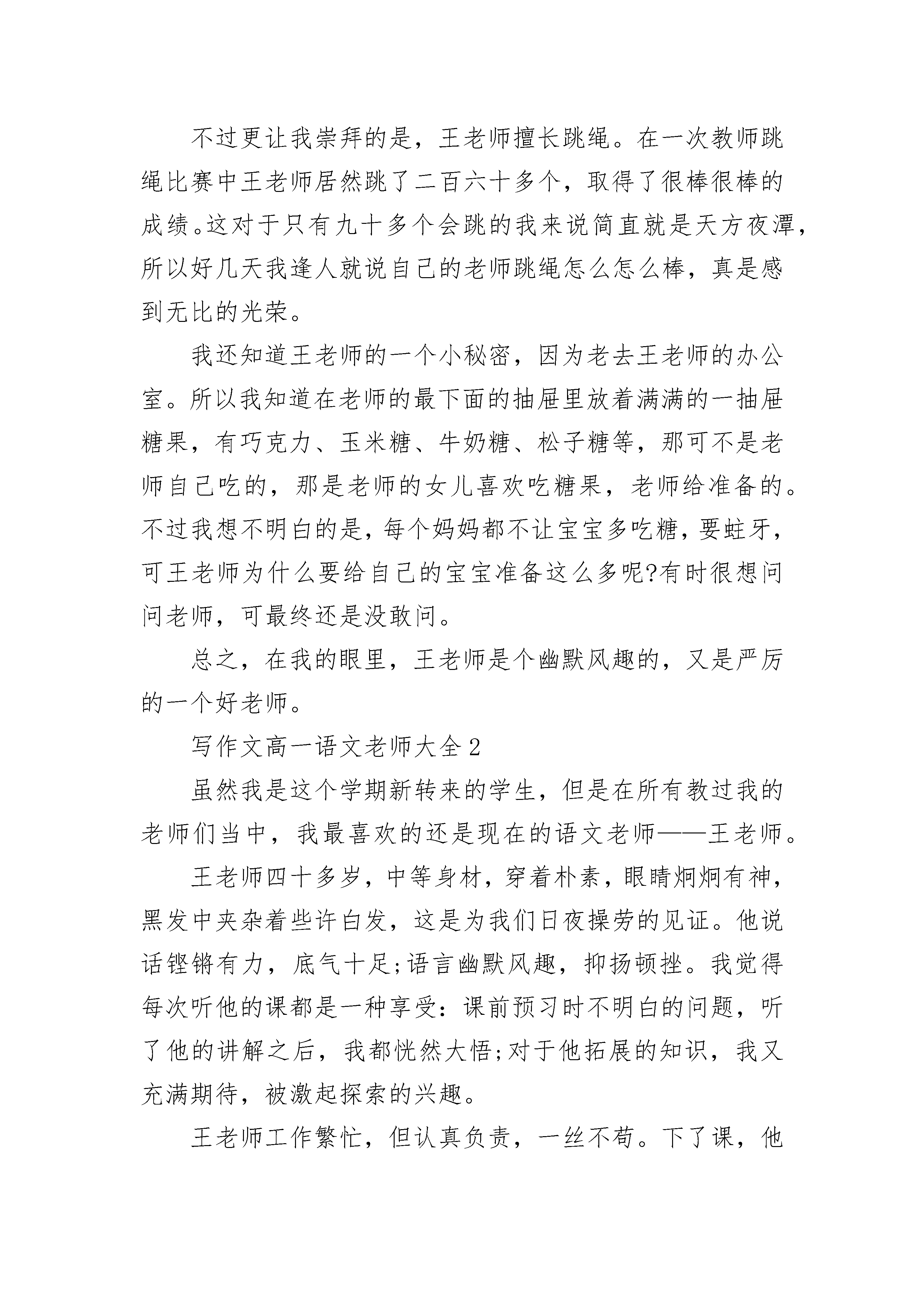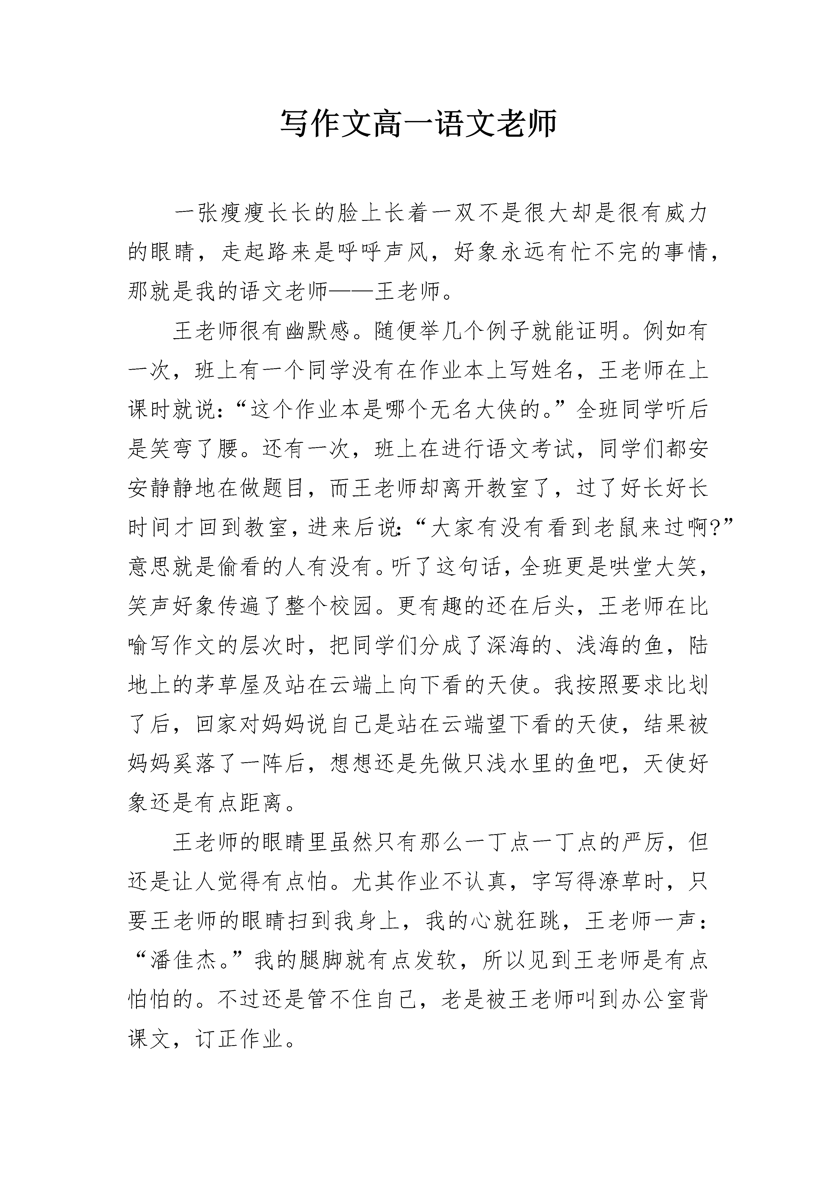 写作文高一语文老师一张瘦瘦长长的脸上长着一双不是很大却是很有威力的眼睛,走起路来是呼呼声风,好象永远有忙不完的事情,那就是我的语文老师——王老师。王老师很有幽默感。随便举几个例子就能证明。例如有一次,班上有一个同学没有在作业本上写姓名,王老师在上课时就说:“这个作业本是哪个无名大侠的。”全班同学听后是笑弯了腰。还有一次,班上在进行语文考试,同学们都安安静静地在做题目,而王老师却离开教室了,过了好长好长时间才回到教室,进来后说:“大家有没有看到老鼠来过啊?”意思就是偷看的人有没有。听了这句话,全班更是哄堂大笑,笑声好象传遍了整个校园。更有趣的还在后头,王老师在比喻写作文的层次时,把同学们分成了深海的、浅海的鱼,陆地上的茅草屋及站在云端上向下看的天使。我按照要求比划了后,回家对妈妈说自己是站在云端望下看的天使,结果被妈妈奚落了一阵后,想想还是先做只浅水里的鱼吧,天使好象还是有点距离。王老师的眼睛里虽然只有那么一丁点一丁点的严厉,但还是让人觉得有点怕。尤其作业不认真,字写得潦草时,只要王老师的眼睛扫到我身上,我的心就狂跳,王老师一声:“潘佳杰。”我的腿脚就有点发软,所以见到王老师是有点怕怕的。不过还是管不住自己,老是被王老师叫到办公室背课文,订正作业。不过更让我崇拜的是,王老师擅长跳绳。在一次教师跳绳比赛中王老师居然跳了二百六十多个,取得了很棒很棒的成绩。这对于只有九十多个会跳的我来说简直就是天方夜潭,所以好几天我逢人就说自己的老师跳绳怎么怎么棒,真是感到无比的光荣。我还知道王老师的一个小秘密,因为老去王老师的办公室。所以我知道在老师的最下面的抽屉里放着满满的一抽屉糖果,有巧克力、玉米糖、牛奶糖、松子糖等,那可不是老师自己吃的,那是老师的女儿喜欢吃糖果,老师给准备的。不过我想不明白的是,每个妈妈都不让宝宝多吃糖,要蛀牙,可王老师为什么要给自己的宝宝准备这么多呢?有时很想问问老师,可最终还是没敢问。总之,在我的眼里,王老师是个幽默风趣的,又是严厉的一个好老师。写作文高一语文老师大全2虽然我是这个学期新转来的学生,但是在所有教过我的老师们当中,我最喜欢的还是现在的语文老师——王老师。王老师四十多岁,中等身材,穿着朴素,眼睛炯炯有神,黑发中夹杂着些许白发,这是为我们日夜操劳的见证。他说话铿锵有力,底气十足;语言幽默风趣,抑扬顿挫。我觉得每次听他的课都是一种享受:课前预习时不明白的问题,听了他的讲解之后,我都恍然大悟;对于他拓展的知识,我又充满期待,被激起探索的兴趣。王老师工作繁忙,但认真负责,一丝不苟。下了课,他就径直回到办公室,忙其他工作去了,但是每次上课他都提前到达教室,从来没有迟到过。早晨7:30前,他来到教室组织大家上晨读。同学们背古诗、读课文,他就背《大学》和《中庸》。看到他认真诵读的样子,大家读得更起劲了。听我的同桌说,仅上个学期同学们就背诵了150多首古诗60多则《论语》呢。中午预备铃打响前,同学们都在教室里练字。他又出现在我们身边,指导我们如何把字写好。语文课上,利用讲课前的五分钟,他总是让学生轮流朗读自己收集到的美段佳篇,美其名曰“美文欣赏”。这样既锻炼了我们的朗读能力,又培养了我们的阅读兴趣,还提高了我们的欣赏水平。晚上放学,他布置最多的作业就是读课外书。他经常对我们说:“热爱读书的孩子是最聪明的,也是老师最喜欢的。”我们班的不少同学都整天抱着课外书,读得入了迷。我以前很不喜欢语文这门课程,也不爱读书,更不喜欢写作文,但是自从上了王老师的课之后,我慢慢爱上了语文,懂得了语文的博大精深,感悟到了为人处世的道理。在他的推荐下,我读完了《红岩》、《鲁滨孙漂流记》和《汤姆·索亚历险记》等名著;背诵了他主编的校本教材中的所有古诗词,写出了几篇被同学们称道的文章。在我的眼里,王老师就是一位言传身教的好老师。是他点燃了我热爱语文的激情,播下了我喜欢写作的种子。谢谢王老师对我们的辛勤栽培和教育,在这里我想对您说一声:“老师,您辛苦了!我一定不会辜负你的厚望!”写作文高一语文老师大全3春秋时期的晏子聪明机敏,足智多谋,学识渊博,深得后世敬仰和爱戴。而我们班的语文老师也被我们称为“晏子”,一是亲切,二是尊敬,三是匹配嘛!听他讲课,如沐浴在暖暖的阳光里、和煦的春风里,格外舒服。课堂上,或回忆童年的欢歌笑语,畅言少年的意气风发,追述青年的艰难探索;或畅想以后的美好生活,神游远古文明与未来太空……他带领我们浮想联翩,一切都是那般美好!他带给了我们诗意的语文。一个个生僻的汉字造出优美的佳句,一句句话语连缀出脍炙人口的片段。语言,被他玩得灵巧生辉;语文,被他演绎得出神入化。许多时候,他的一个神态,一个举止,让我们捧腹,让我们回味。听他一节课,我们常常满载而归。不时来上句诗词,不时来句名言,不时又自创佳语。有时一句妙语,学生问起谁说的,他便说是无