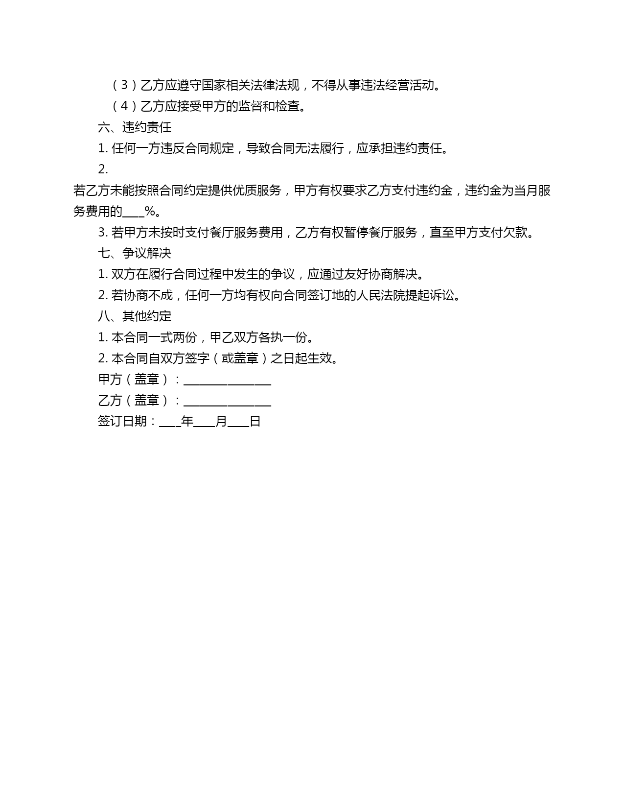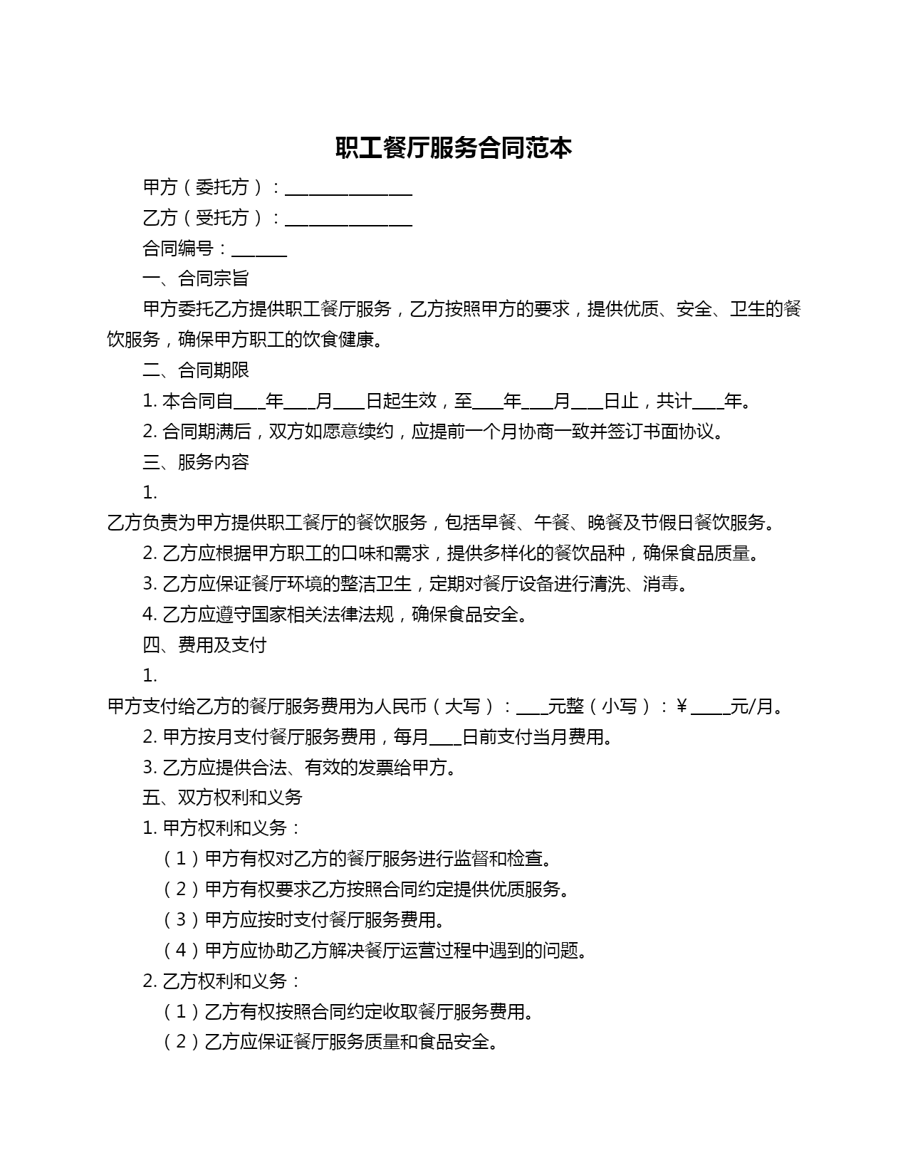 职工餐厅服务合同范本甲方(委托方):________________乙方(受托方):________________合同编号:_______一、合同宗旨甲方委托乙方提供职工餐厅服务,乙方按照甲方的要求,提供优质、安全、卫生的餐饮服务,确保甲方职工的饮食健康。二、合同期限1.本合同自____年____月____日起生效,至____年____月____日止,共计____年。2.合同期满后,双方如愿意续约,应提前一个月协商一致并签订书面协议。三、服务内容1.乙方负责为甲方提供职工餐厅的餐饮服务,包括早餐、午餐、晚餐及节假日餐饮服务。2.乙方应根据甲方职工的口味和需求,提供多样化的餐饮品种,确保食品质量。3.乙方应保证餐厅环境的整洁卫生,定期对餐厅设备进行清洗、消毒。4.乙方应遵守国家相关法律法规,确保食品安全。四、费用及支付1.甲方支付给乙方的餐厅服务费用为人民币(大写):____元整(小写):¥_____元/月。2.甲方按月支付餐厅服务费用,每月____日前支付当月费用。3.乙方应提供合法、有效的发票给甲方。五、双方权利和义务1.甲方权利和义务:(1)甲方有权对乙方的餐厅服务进行监督和检查。(2)甲方有权要求乙方按照合同约定提供优质服务。(3)甲方应按时支付餐厅服务费用。(4)甲方应协助乙方解决餐厅运营过程中遇到的问题。2.乙方权利和义务:(1)乙方有权按照合同约定收取餐厅服务费用。(2)乙方应保证餐厅服务质量和食品安全。(3)乙方应遵守国家相关法律法规,不得从事违法经营活动。(4)乙方应接受甲方的监督和检查。六、违约责任1.任何一方违反合同规定,导致合同无法履行,应承担违约责任。2.若乙方未能按照合同约定提供优质服务,甲方有权要求乙方支付违约金,违约金为当月服务费用的____%。3.若甲方未按时支付餐厅服务费用,乙方有权暂停餐厅服务,直至甲方支付欠款。七、争议解决1.双方在履行合同过程中发生的争议,应通过友好协商解决。2.若协商不成,任何一方均有权向合同签订地的人民法院提起诉讼。八、其他约定1.本合同一式两份,甲乙双方各执一份。2.本合同自双方签字(或盖章)之日起生效。甲方(盖章):________________乙方(盖章):________________签订日期:____年____月____日