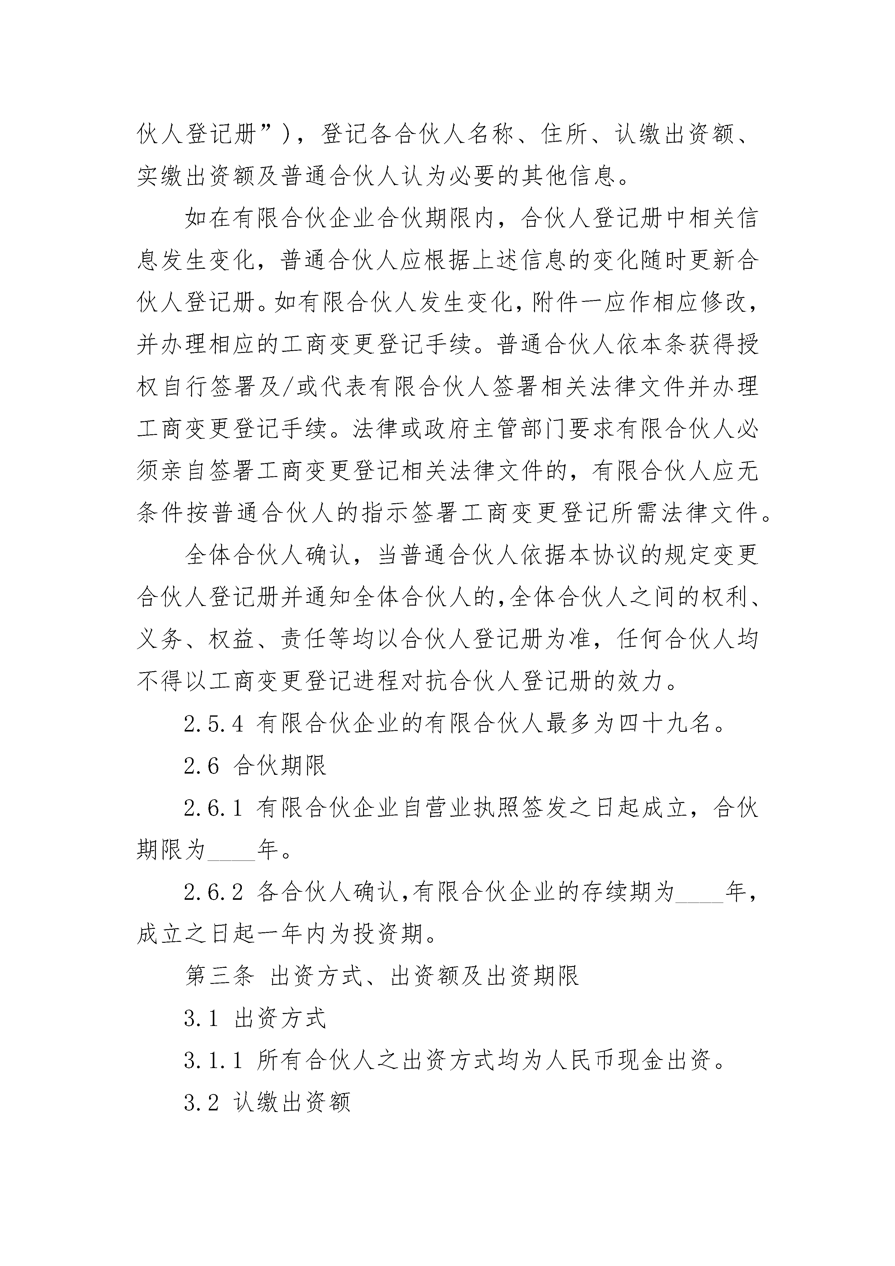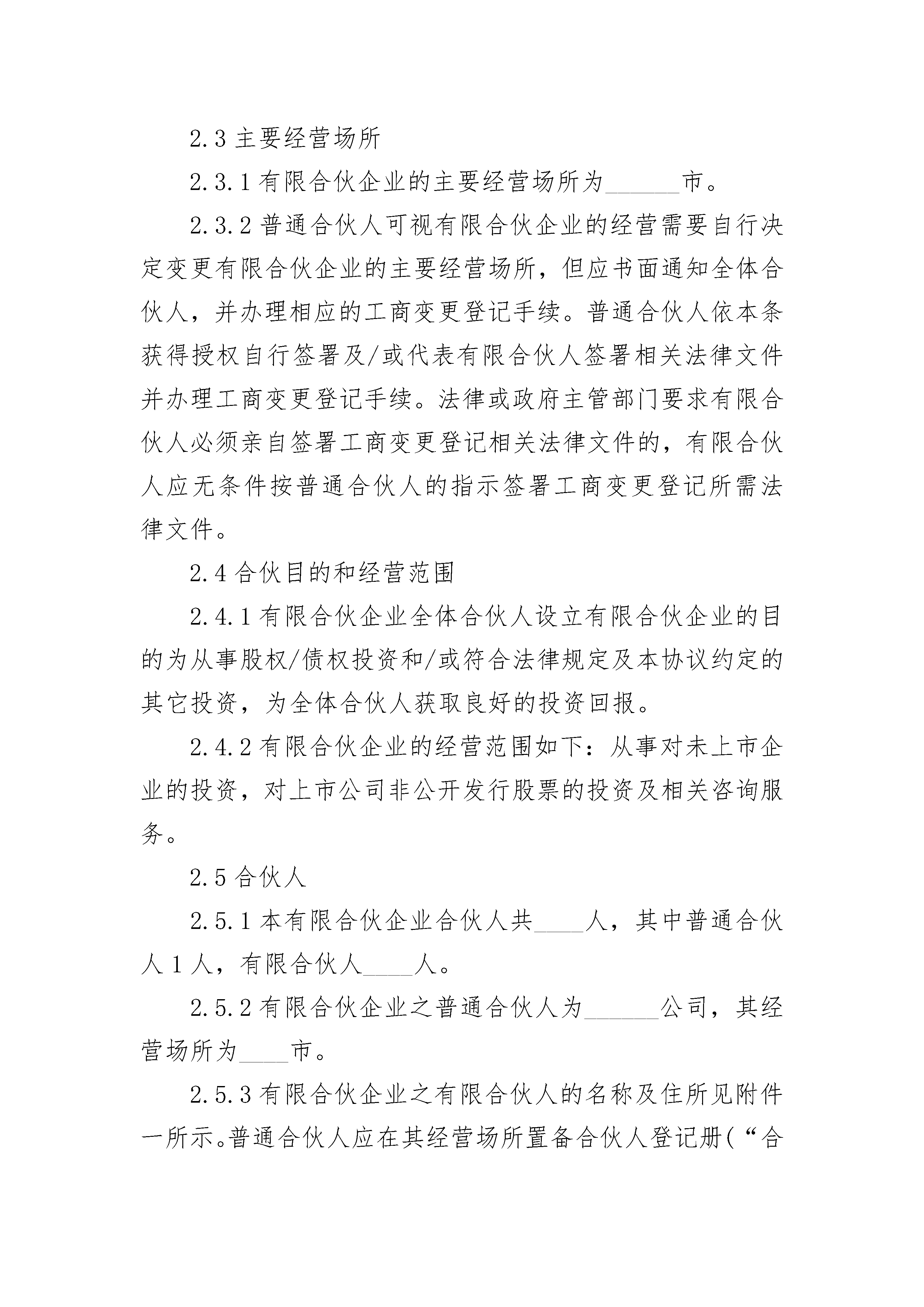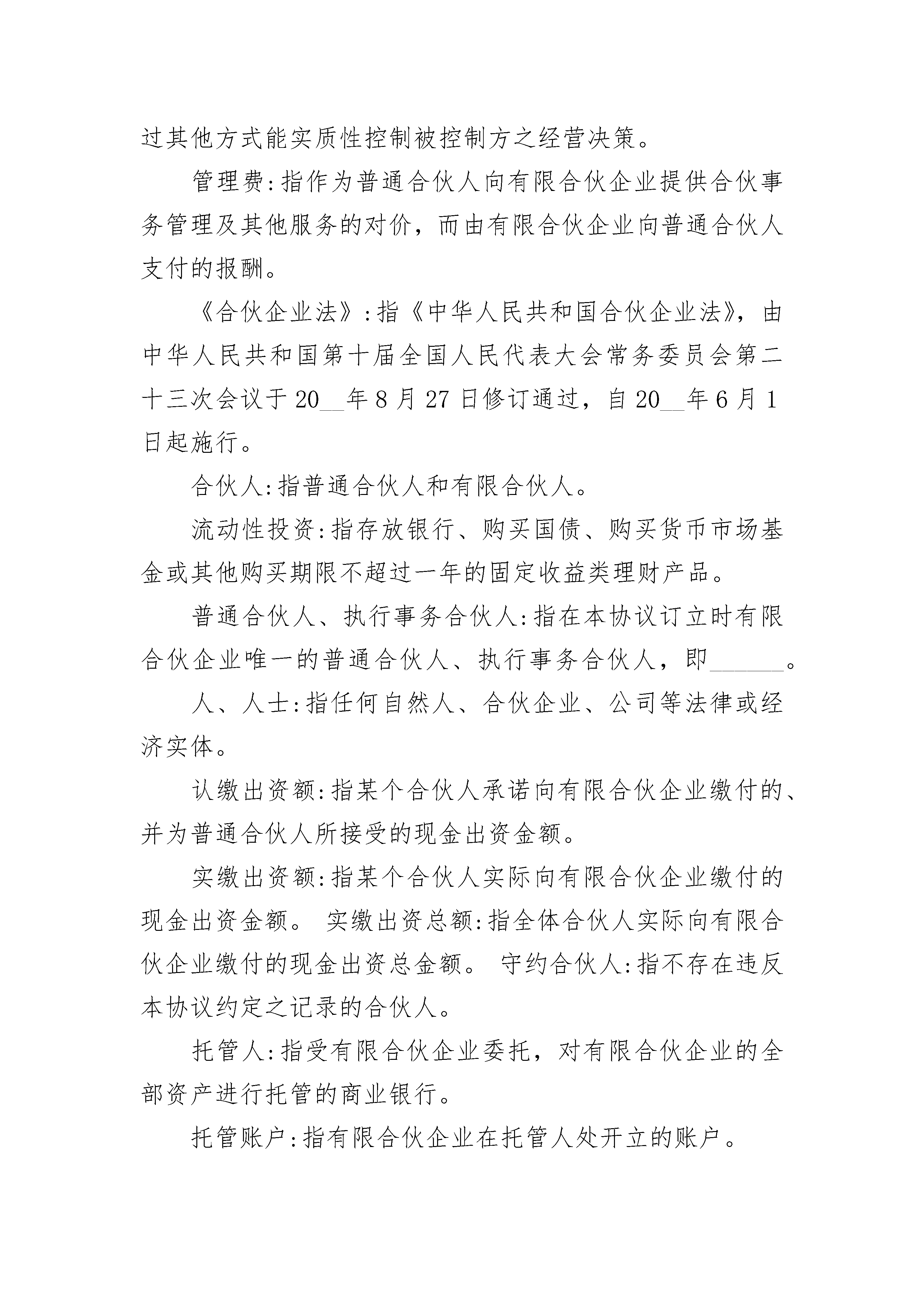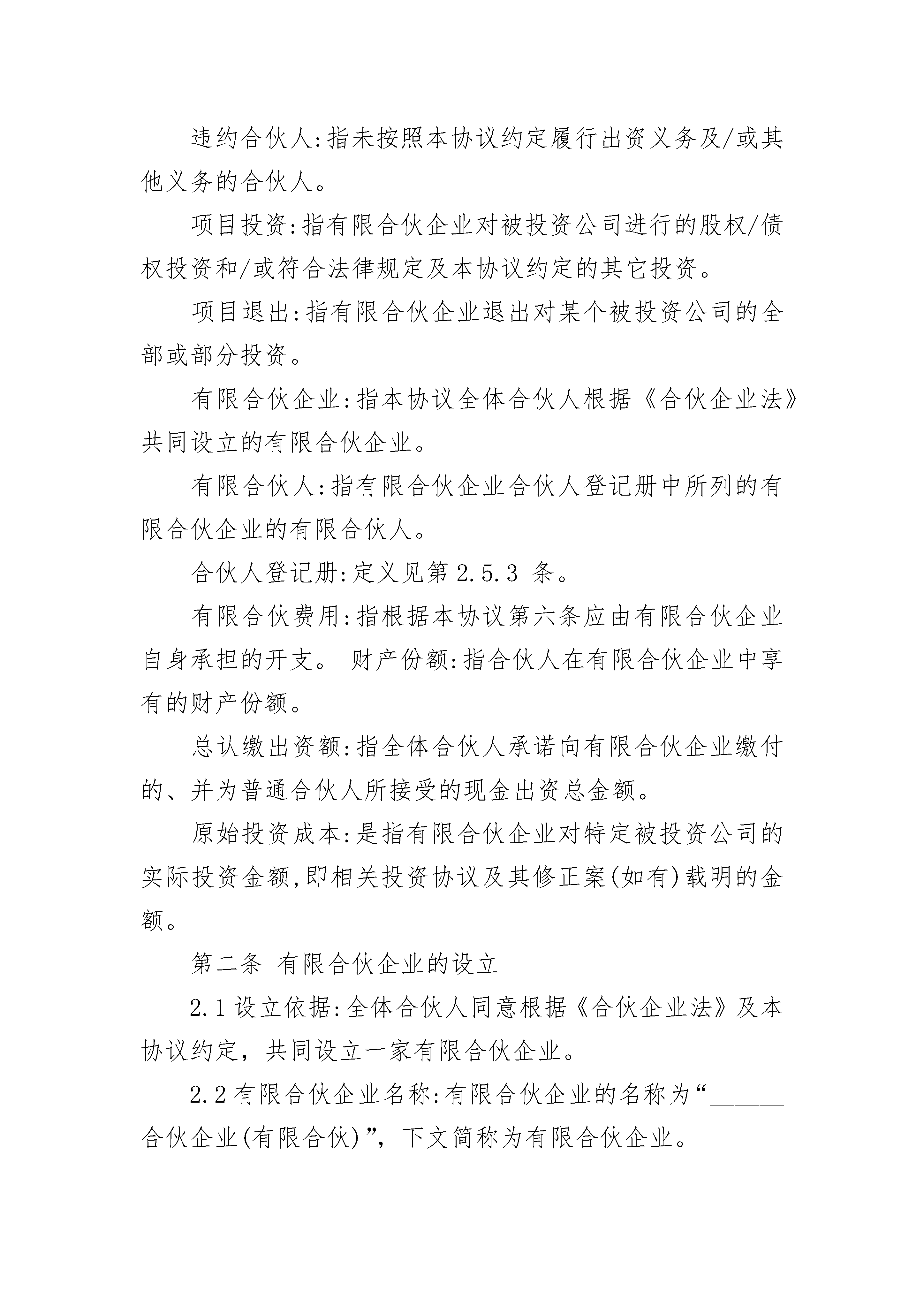 有限公司股权合伙协议有限公司股权合伙协议(精选21篇)有限公司股权合伙协议篇1有限公司股权合伙协议本有限合伙协议(下称“本协议”)由______(“普通合伙人”)与本协议附件一所列明之有限合伙人(“有限合伙人”)于______年____月____日共同订立并签署。下文中普通合伙人和有限合伙人合称为“各方”。鉴于各方均有意根据《合伙企业法》(如下文所定义)、相关法律法规的规定以及本协议所约定之条款和条件,发起设立一家有限合伙企业从事投资业务,各方达成如下协议:第一条定义1.1定义:在本协议中,除非上下文另有说明,下列词语分别具有下述列明的含义:被投资公司:指有限合伙企业以直接或间接方式对其进行了投资并持有其股权或债权的公司。工作日:指中国法定节假日、休息日之外的日期。工商变更登记:指有限合伙企业发生变更应办理的工商变更登记手续以及任何前置审批、备案、会商程序(如有)。关联人:指就任何人而言,是指(i)被该人控制,(ii)控制该人,或(iii)与该人一起受他人共同控制的任何自然人、公司、商业企业、合伙企业、联合企业或其它商业实体。为避免歧义,控制是指对被控制方持有50%及以上的股权或通过其他方式能实质性控制被控制方之经营决策。管理费:指作为普通合伙人向有限合伙企业提供合伙事务管理及其他服务的对价,而由有限合伙企业向普通合伙人支付的报酬。《合伙企业法》:指《中华人民共和国合伙企业法》,由中华人民共和国第十届全国人民代表大会常务委员会第二十三次会议于20__年8月27日修订通过,自20__年6月1日起施行。合伙人:指普通合伙人和有限合伙人。流动性投资:指存放银行、购买国债、购买货币市场基金或其他购买期限不超过一年的固定收益类理财产品。普通合伙人、执行事务合伙人:指在本协议订立时有限合伙企业唯一的普通合伙人、执行事务合伙人,即______。人、人士:指任何自然人、合伙企业、公司等法律或经济实体。认缴出资额:指某个合伙人承诺向有限合伙企业缴付的、并为普通合伙人所接受的现金出资金额。实缴出资额:指某个合伙人实际向有限合伙企业缴付的现金出资金额。实缴出资总额:指全体合伙人实际向有限合伙企业缴付的现金出资总金额。守约合伙人:指不存在违反本协议约定之记录的合伙人。托管人:指受有限合伙企业委托,对有限合伙企业的全部资产进行托管的商业银行。托管账户:指有限合伙企业在托管人处开立的账户。违约合伙人:指未按照本协议约定履行出资义务及/或其他义务的合伙人。项目投资:指有限合伙企业对被投资公司进行的股权/债权投资和/或符合法律规定及本协议约定的其它投资。项目退出:指有限合伙企业退出对某个被投资公司的全部或部分投资。有限合伙企业:指本协议全体合伙人根据《合伙企业法》共同设立的有限合伙企业。有限合伙人:指有限合伙企业合伙人登记册中所列的有限合伙企业的有限合伙人。合伙人登记册:定义见第2.5.3条。有限合伙费用:指根据本协议第六条应由有限合伙企业自身承担的开支。财产份额:指合伙人在有限合伙企业中享有的财产份额。总认缴出资额:指全体合伙人承诺向有限合伙企业缴付的、并为普通合伙人所接受的现金出资总金额。原始投资成本:是指有限合伙企业对特定被投资公司的实际投资金额,即相关投资协议及其修正案(如有)载明的金额。第二条有限合伙企业的设立2.1设立依据:全体合伙人同意根据《合伙企业法》及本协议约定,共同设立一家有限合伙企业。2.2有限合伙企业名称:有限合伙企业的名称为“______合伙企业(有限合伙)”,下文简称为有限合伙企业。2.3主要经营场所2.3.1有限合伙企业的主要经营场所为______市。2.3.2普通合伙人可视有限合伙企业的经营需要自行决定变更有限合伙企业的主要经营场所,但应书面通知全体合伙人,并办理相应的工商变更登记手续。普通合伙人依本条获得授权自行签署及/或代表有限合伙人签署相关法律文件并办理工商变更登记手续。法律或政府主管部门要求有限合伙人必须亲自签署工商变更登记相关法律文件的,有限合伙人应无条件按普通合伙人的指示签署工商变更登记所需法律文件。2.4合伙目的和经营范围2.4.1有限合伙企业全体合伙人设立有限合伙企业的目的为从事股权/债权投资和/或符合法律规定及本协议约定的其它投资,为全体合伙人获取良好的投资回报。2.4.2有限合伙企业的经营范围如下:从事对未上市企业的投资,对上市公司非公开发行股票的投资及相关咨询服务。2.5合伙人2.5.1本有限合伙企业合伙人共____人,其中普通合伙人1人,有限合伙人____人。2.5.2有限合伙企业之普通合伙人为______公司,其经营场所为____市。2.5.3有限合伙企业之有限合伙人的名称及住所见附件一所示。普通合伙人应在其经营场所置备合伙人登记册(“合伙人登记册”),登记各合伙人名称、住所、认缴出资额、实缴出资