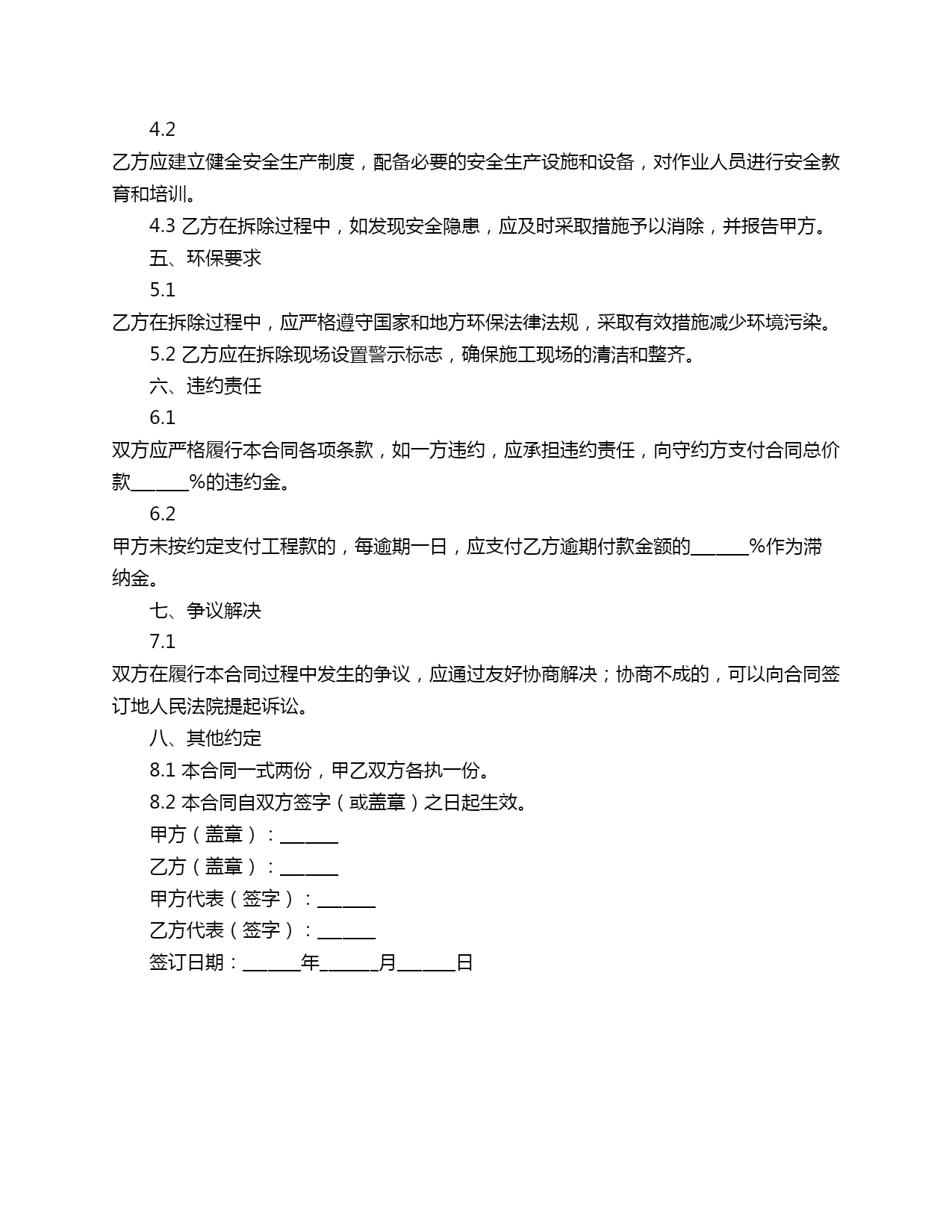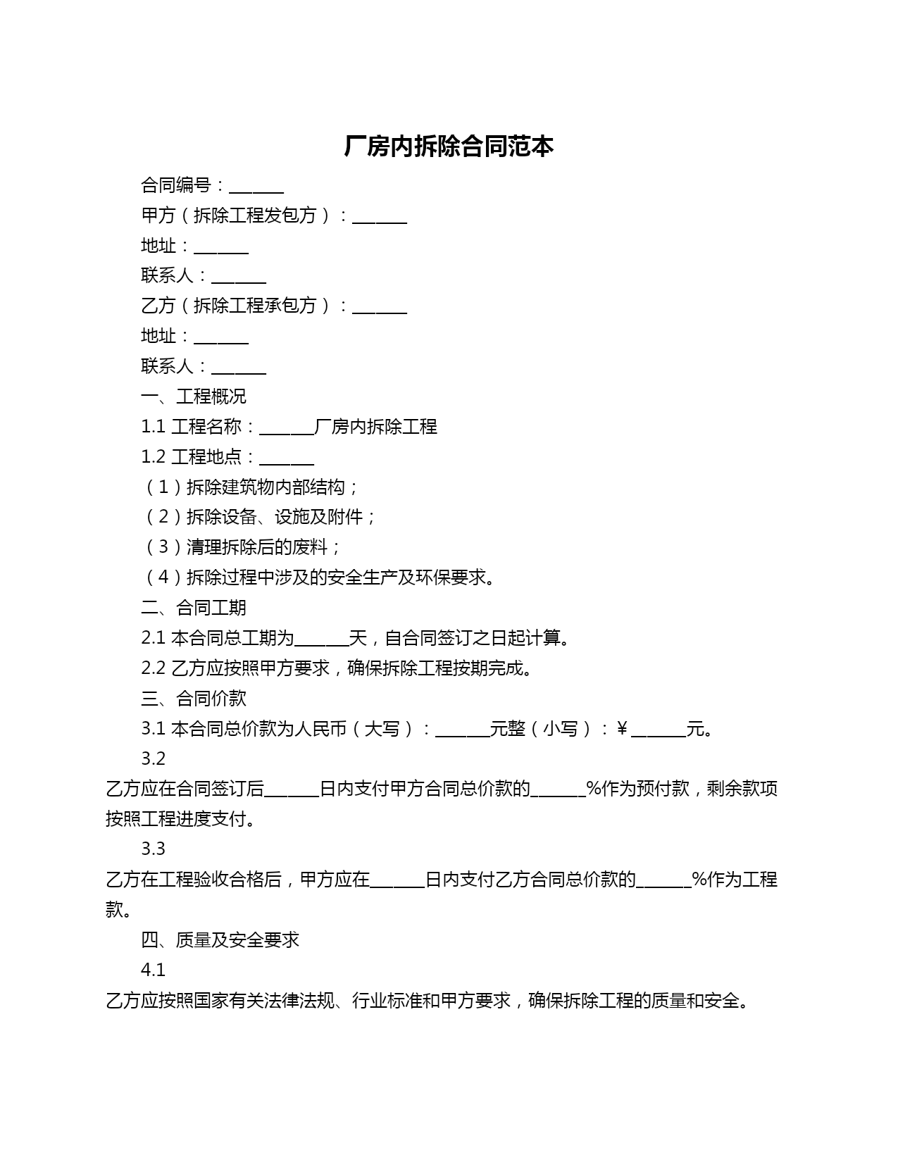厂房内拆除合同范本合同编号:_______甲方(拆除工程发包方):_______地址:_______联系人:_______乙方(拆除工程承包方):_______地址:_______联系人:_______一、工程概况1.1工程名称:_______厂房内拆除工程1.2工程地点:_______(1)拆除建筑物内部结构;(2)拆除设备、设施及附件;(3)清理拆除后的废料;(4)拆除过程中涉及的安全生产及环保要求。二、合同工期2.1本合同总工期为_______天,自合同签订之日起计算。2.2乙方应按照甲方要求,确保拆除工程按期完成。三、合同价款3.1本合同总价款为人民币(大写):_______元整(小写):¥_______元。3.2乙方应在合同签订后_______日内支付甲方合同总价款的_______%作为预付款,剩余款项按照工程进度支付。3.3乙方在工程验收合格后,甲方应在_______日内支付乙方合同总价款的_______%作为工程款。四、质量及安全要求4.1乙方应按照国家有关法律法规、行业标准和甲方要求,确保拆除工程的质量和安全。4.2乙方应建立健全安全生产制度,配备必要的安全生产设施和设备,对作业人员进行安全教育和培训。4.3乙方在拆除过程中,如发现安全隐患,应及时采取措施予以消除,并报告甲方。五、环保要求5.1乙方在拆除过程中,应严格遵守国家和地方环保法律法规,采取有效措施减少环境污染。5.2乙方应在拆除现场设置警示标志,确保施工现场的清洁和整齐。六、违约责任6.1双方应严格履行本合同各项条款,如一方违约,应承担违约责任,向守约方支付合同总价款_______%的违约金。6.2甲方未按约定支付工程款的,每逾期一日,应支付乙方逾期付款金额的_______%作为滞纳金。七、争议解决7.1双方在履行本合同过程中发生的争议,应通过友好协商解决;协商不成的,可以向合同签订地人民法院提起诉讼。八、其他约定8.1本合同一式两份,甲乙双方各执一份。8.2本合同自双方签字(或盖章)之日起生效。甲方(盖章):_______乙方(盖章):_______甲方代表(签字):_______乙方代表(签字):_______签订日期:_______年_______月_______日