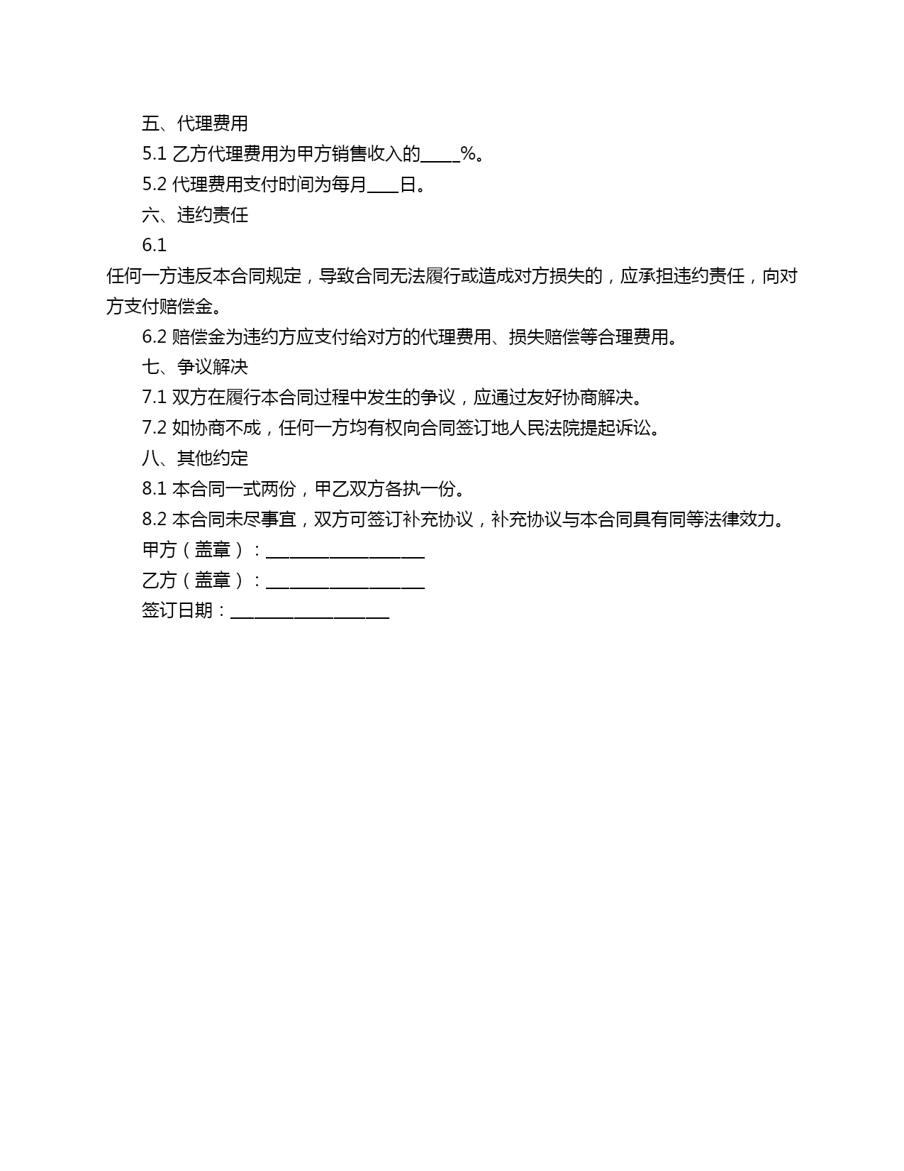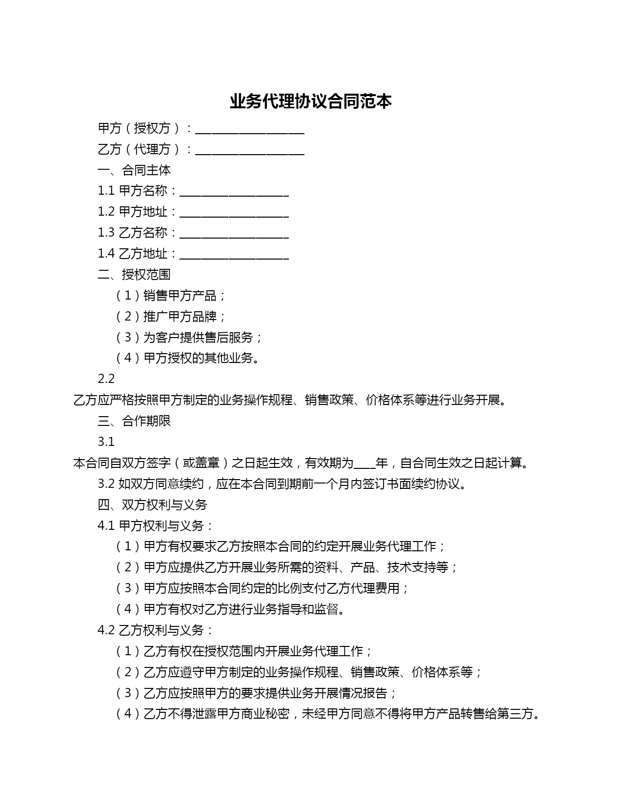 业务代理协议合同范本甲方(授权方):____________________乙方(代理方):____________________一、合同主体1.1甲方名称:____________________1.2甲方地址:____________________1.3乙方名称:____________________1.4乙方地址:____________________二、授权范围(1)销售甲方产品;(2)推广甲方品牌;(3)为客户提供售后服务;(4)甲方授权的其他业务。2.2乙方应严格按照甲方制定的业务操作规程、销售政策、价格体系等进行业务开展。三、合作期限3.1本合同自双方签字(或盖章)之日起生效,有效期为____年,自合同生效之日起计算。3.2如双方同意续约,应在本合同到期前一个月内签订书面续约协议。四、双方权利与义务4.1甲方权利与义务:(1)甲方有权要求乙方按照本合同的约定开展业务代理工作;(2)甲方应提供乙方开展业务所需的资料、产品、技术支持等;(3)甲方应按照本合同约定的比例支付乙方代理费用;(4)甲方有权对乙方进行业务指导和监督。4.2乙方权利与义务:(1)乙方有权在授权范围内开展业务代理工作;(2)乙方应遵守甲方制定的业务操作规程、销售政策、价格体系等;(3)乙方应按照甲方的要求提供业务开展情况报告;(4)乙方不得泄露甲方商业秘密,未经甲方同意不得将甲方产品转售给第三方。五、代理费用5.1乙方代理费用为甲方销售收入的_____%。5.2代理费用支付时间为每月____日。六、违约责任6.1任何一方违反本合同规定,导致合同无法履行或造成对方损失的,应承担违约责任,向对方支付赔偿金。6.2赔偿金为违约方应支付给对方的代理费用、损失赔偿等合理费用。七、争议解决7.1双方在履行本合同过程中发生的争议,应通过友好协商解决。7.2如协商不成,任何一方均有权向合同签订地人民法院提起诉讼。八、其他约定8.1本合同一式两份,甲乙双方各执一份。8.2本合同未尽事宜,双方可签订补充协议,补充协议与本合同具有同等法律效力。甲方(盖章):____________________乙方(盖章):____________________签订日期:____________________