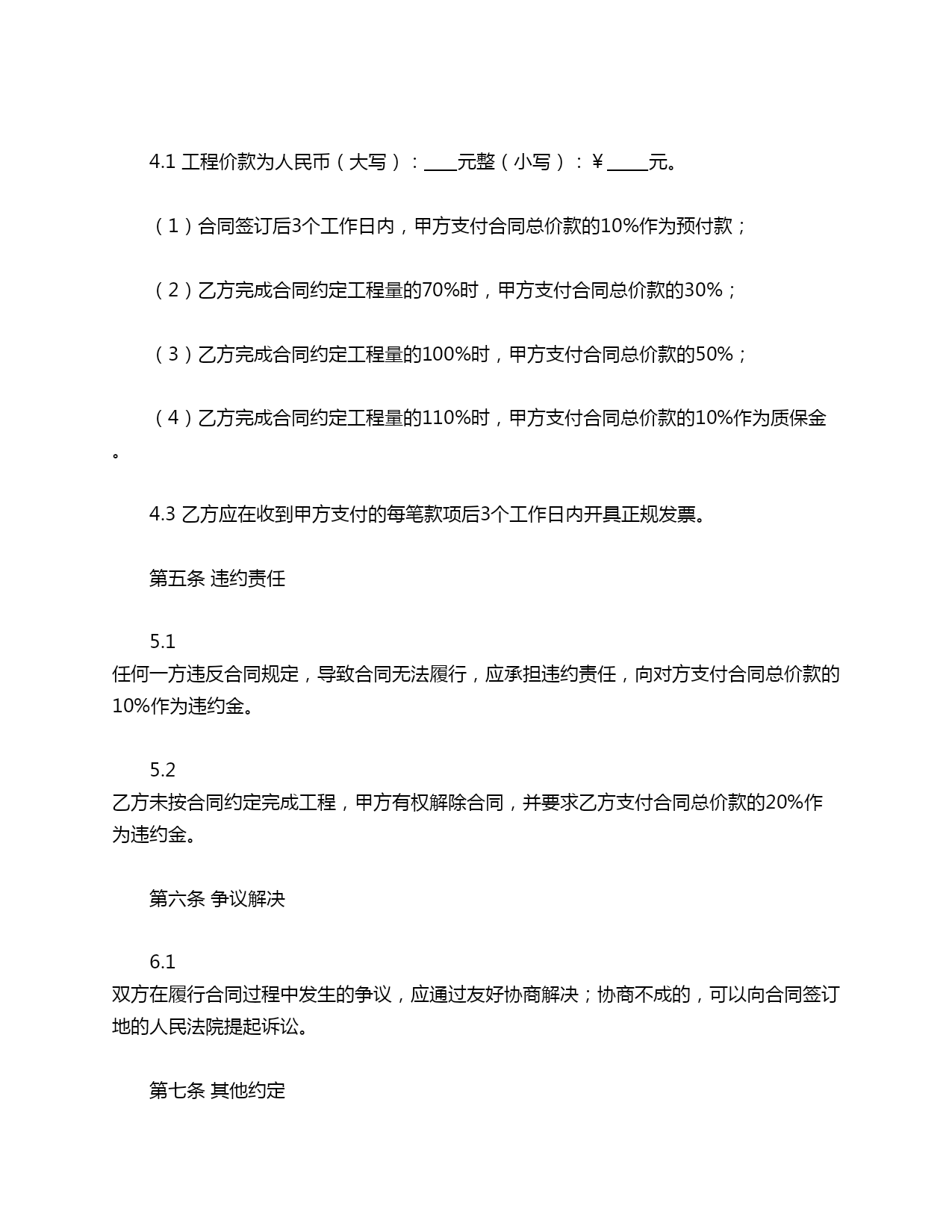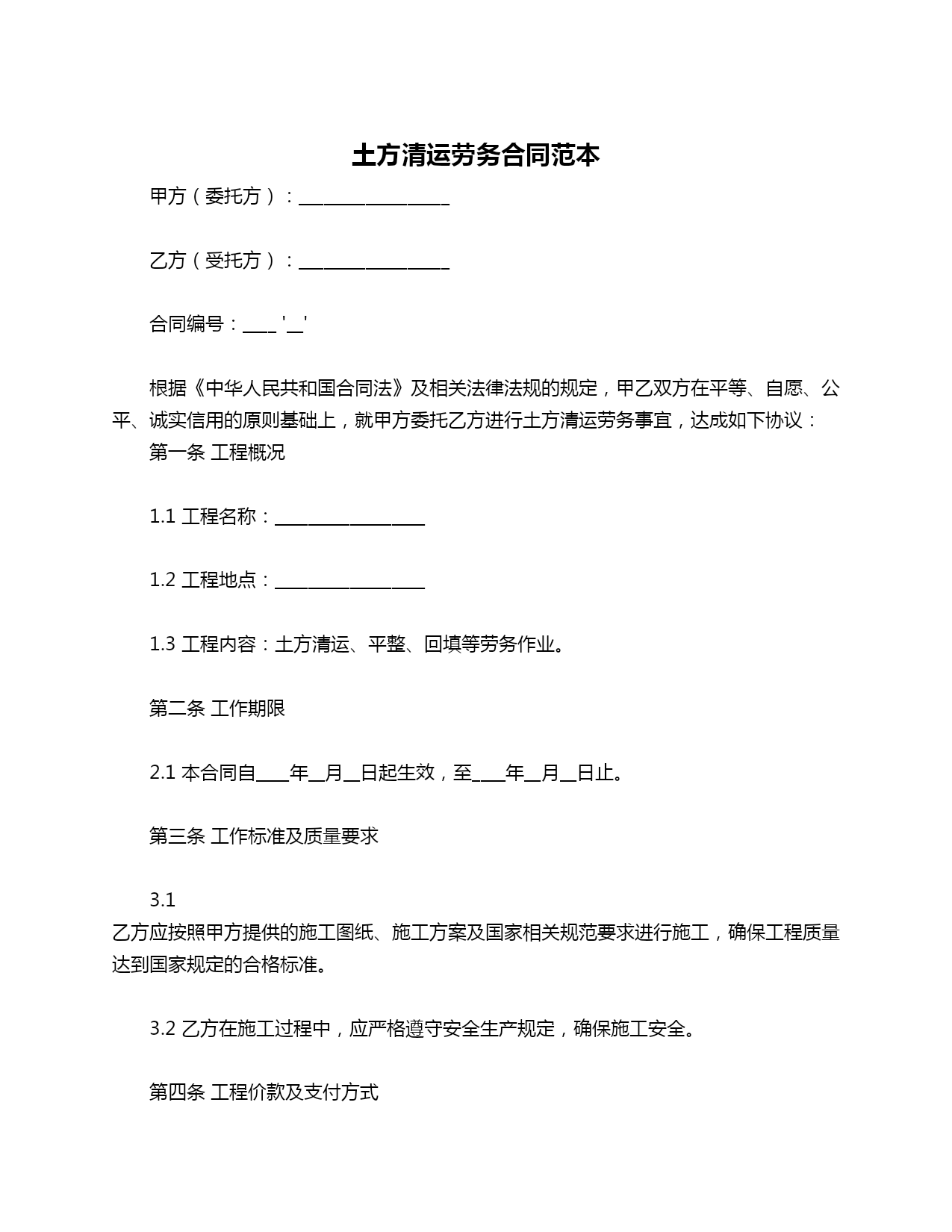 土方清运劳务合同范本甲方(委托方):__________________乙方(受托方):__________________合同编号:____'__'根据《中华人民共和国合同法》及相关法律法规的规定,甲乙双方在平等、自愿、公平、诚实信用的原则基础上,就甲方委托乙方进行土方清运劳务事宜,达成如下协议:第一条工程概况1.1工程名称:__________________1.2工程地点:__________________1.3工程内容:土方清运、平整、回填等劳务作业。第二条工作期限2.1本合同自____年__月__日起生效,至____年__月__日止。第三条工作标准及质量要求3.1乙方应按照甲方提供的施工图纸、施工方案及国家相关规范要求进行施工,确保工程质量达到国家规定的合格标准。3.2乙方在施工过程中,应严格遵守安全生产规定,确保施工安全。第四条工程价款及支付方式4.1工程价款为人民币(大写):____元整(小写):¥_____元。(1)合同签订后3个工作日内,甲方支付合同总价款的10%作为预付款;(2)乙方完成合同约定工程量的70%时,甲方支付合同总价款的30%;(3)乙方完成合同约定工程量的100%时,甲方支付合同总价款的50%;(4)乙方完成合同约定工程量的110%时,甲方支付合同总价款的10%作为质保金。4.3乙方应在收到甲方支付的每笔款项后3个工作日内开具正规发票。第五条违约责任5.1任何一方违反合同规定,导致合同无法履行,应承担违约责任,向对方支付合同总价款的10%作为违约金。5.2乙方未按合同约定完成工程,甲方有权解除合同,并要求乙方支付合同总价款的20%作为违约金。第六条争议解决6.1双方在履行合同过程中发生的争议,应通过友好协商解决;协商不成的,可以向合同签订地的人民法院提起诉讼。第七条其他约定7.1本合同一式两份,甲乙双方各执一份。7.2本合同自甲乙双方签字(或盖章)之日起生效。甲方(盖章):__________________乙方(盖章):__________________签订日期:____年__月__日