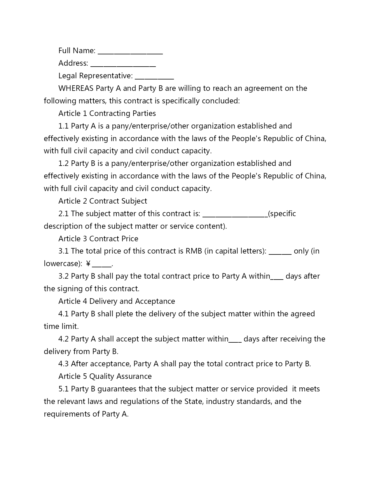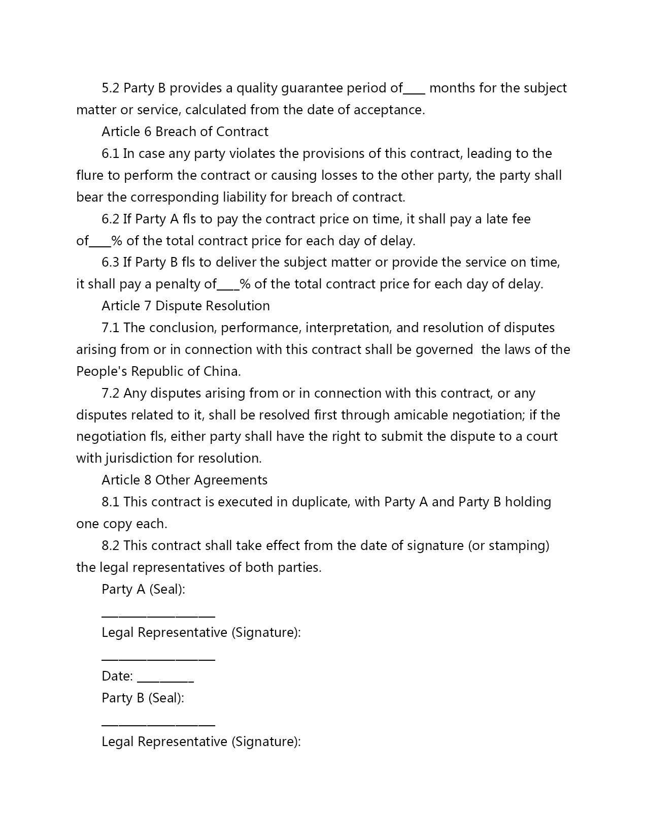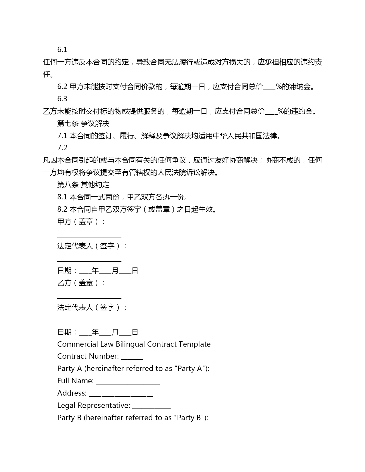 商法双语合同范本合同编号:_______全称:____________________地址:____________________法定代表人:______________全称:____________________地址:____________________法定代表人:______________第一条合同主体1.1甲方为依据中华人民共和国法律设立并有效存在的公司/企业/其他组织,具有完全民事权利能力和民事行为能力。1.2乙方为依据中华人民共和国法律设立并有效存在的公司/企业/其他组织,具有完全民事权利能力和民事行为能力。第二条合同标的2.1本合同项下的标的为:____________________(具体描述标的物或服务内容)。第三条合同价格3.1本合同的总价为人民币(大写):____元整(小写):¥____元。3.2乙方应在合同签订后____日内,向甲方支付合同总价。第四条交付及验收4.1乙方应在合同约定的期限内完成标的物的交付。4.2甲方应在收到乙方交付的标的物后____日内进行验收。4.3验收合格后,甲方应向乙方支付合同总价。第五条质量保证5.1乙方保证其提供的标的物或服务符合国家相关法律法规、行业标准以及甲方的要求。5.2乙方对标的物或服务提供质量保证期为____个月,自验收合格之日起计算。第六条违约责任6.1任何一方违反本合同的约定,导致合同无法履行或造成对方损失的,应承担相应的违约责任。6.2甲方未能按时支付合同价款的,每逾期一日,应支付合同总价____%的滞纳金。6.3乙方未能按时交付标的物或提供服务的,每逾期一日,应支付合同总价____%的违约金。第七条争议解决7.1本合同的签订、履行、解释及争议解决均适用中华人民共和国法律。7.2凡因本合同引起的或与本合同有关的任何争议,应通过友好协商解决;协商不成的,任何一方均有权将争议提交至有管辖权的人民法院诉讼解决。第八条其他约定8.1本合同一式两份,甲乙双方各执一份。8.2本合同自甲乙双方签字(或盖章)之日起生效。甲方(盖章):____________________法定代表人(签字):____________________日期:____年____月____日乙方(盖章):____________________法定代表人(签字):____________________日期:____年____月____日CommercialLawBilingualContractTemplateContractNumber:_______PartyA(hereinafterreferredtoas"PartyA"):FullName:____________________Address:____________________LegalRepresentative:____________PartyB(hereinafterreferredtoas"PartyB"):FullName:____________________Address:____________________LegalRepresentative:____________WHEREASPartyAandPartyBarewillingtoreachanagreementonthefollowingmatters,thiscontractisspecificallyconcluded:Article1ContractingParties1.1PartyAisapany/enterprise/otherorganizationestablishedandeffectivelyexistinginaccordancewiththelawsofthePeople'sRepublicofChina,withfullcivilcapacityandcivilconductcapacity.1.2PartyBisapany/enterprise/otherorganizationestablishedandeffectivelyexistinginaccordancewiththelawsofthePeople'sRepublicofChina,withfullcivilcapacityandcivilconductcapacity.Article2ContractSubject2.1Thesubjectmatterofthiscontractis:____________________(specificdescriptionofthesubjectmatterorservicecontent).Article3ContractPrice3.1ThetotalpriceofthiscontractisRMB(i