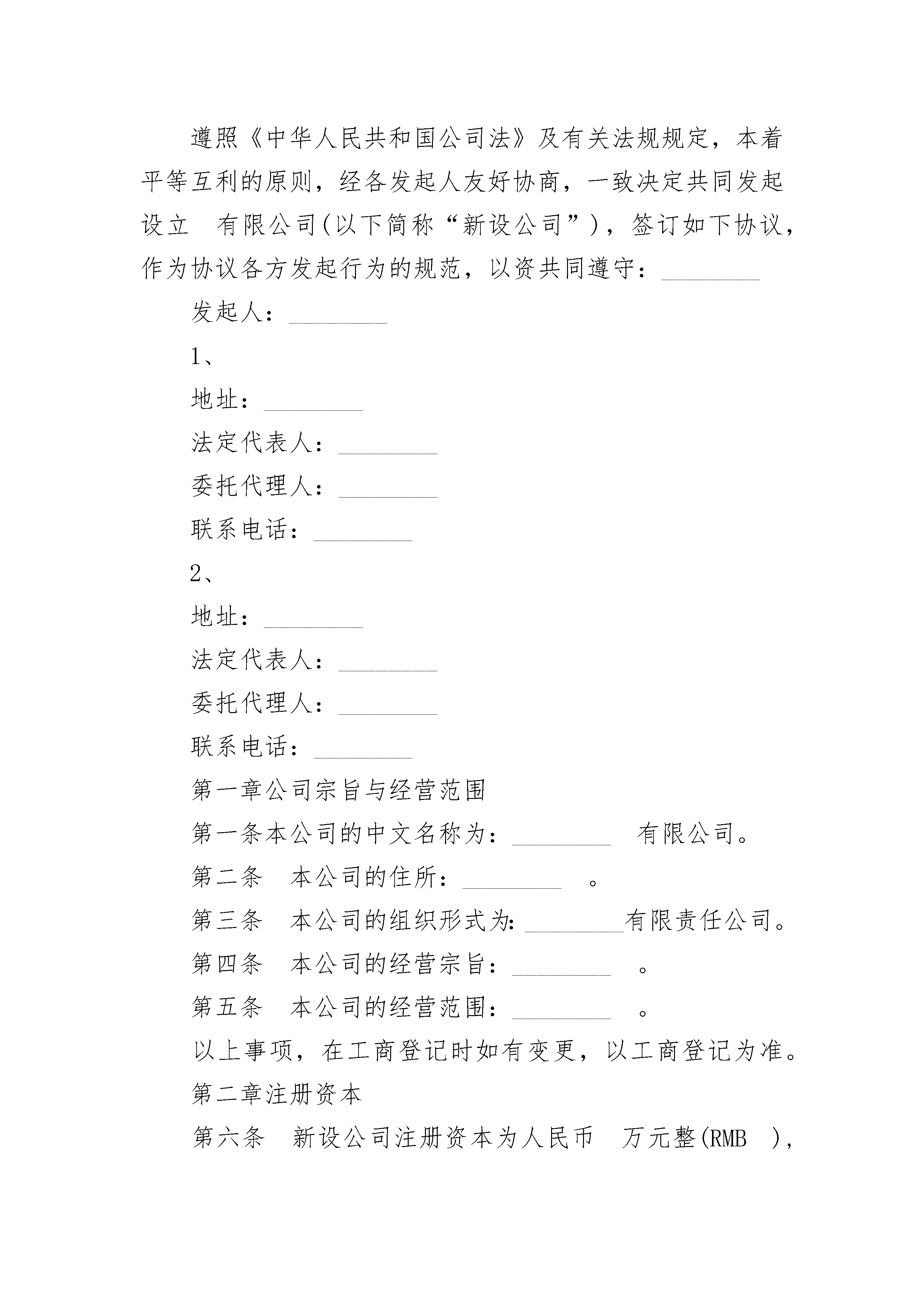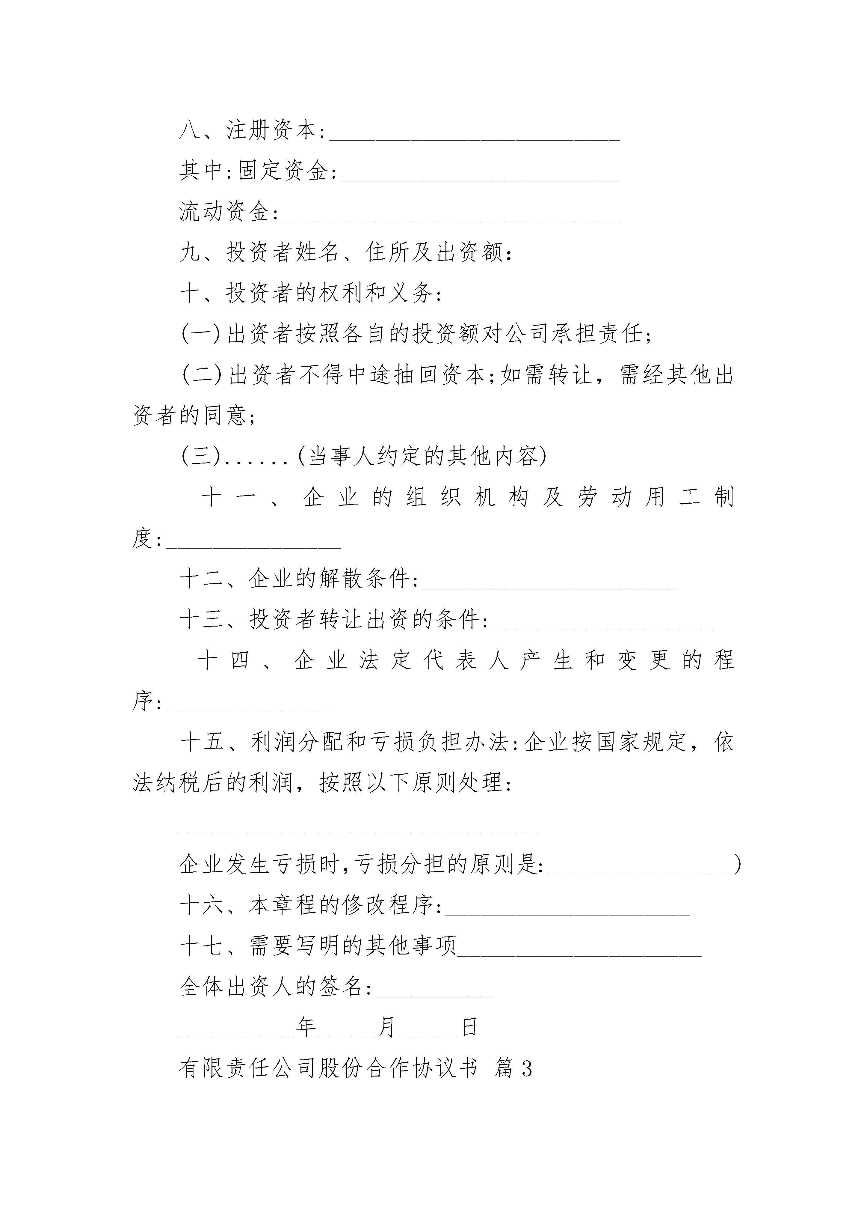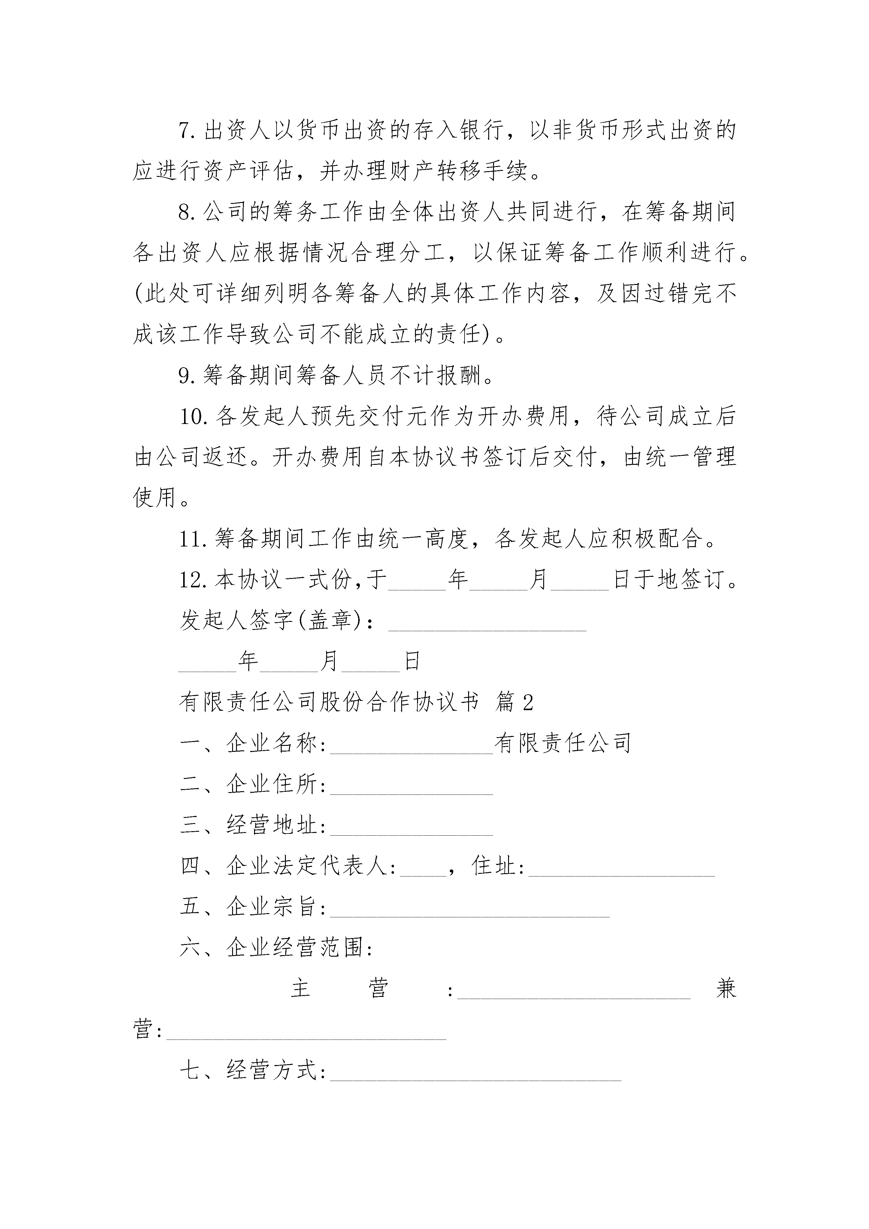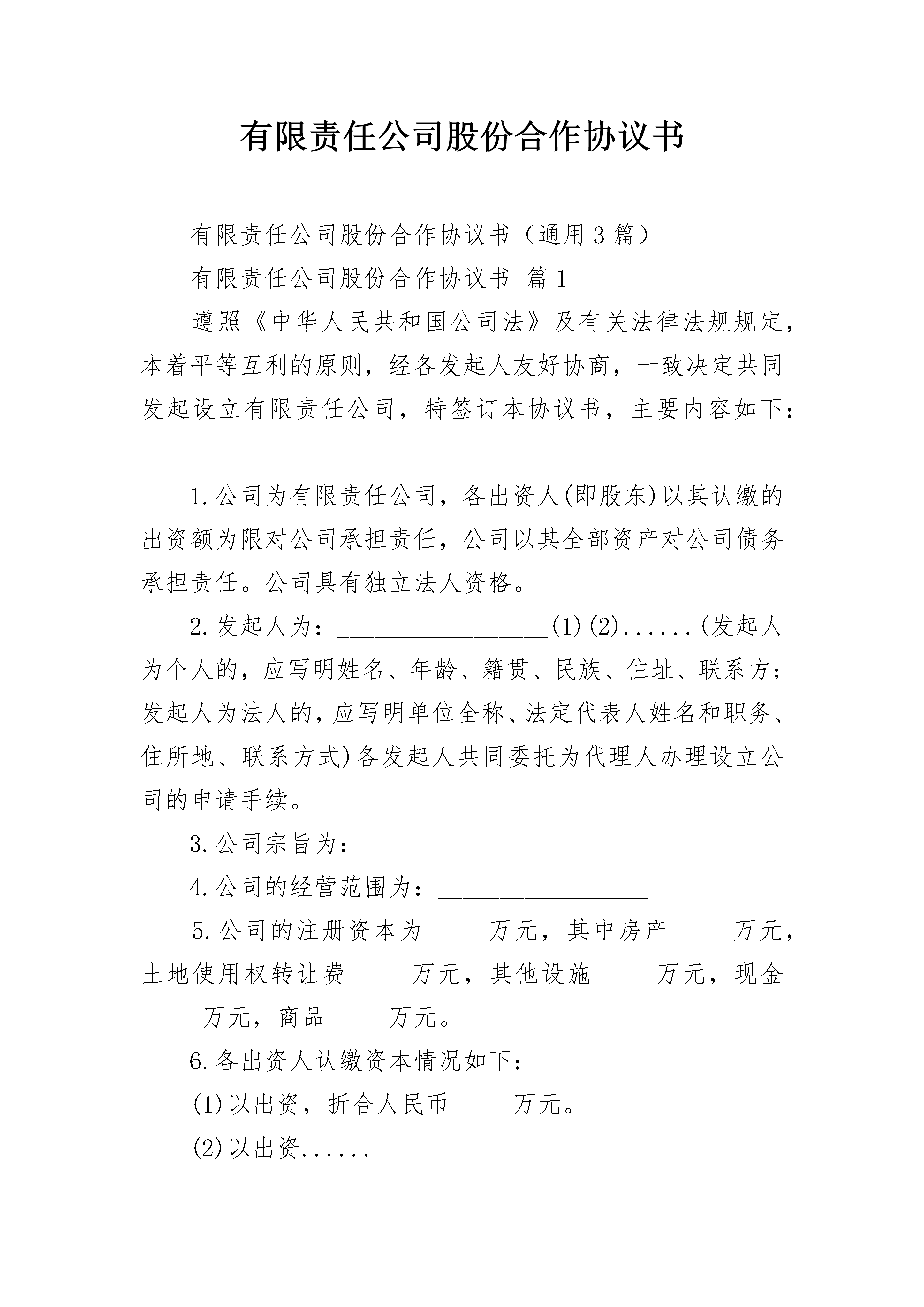 有限责任公司股份合作协议书有限责任公司股份合作协议书(通用3篇)有限责任公司股份合作协议书篇1遵照《中华人民共和国公司法》及有关法律法规规定,本着平等互利的原则,经各发起人友好协商,一致决定共同发起设立有限责任公司,特签订本协议书,主要内容如下:_________________1.公司为有限责任公司,各出资人(即股东)以其认缴的出资额为限对公司承担责任,公司以其全部资产对公司债务承担责任。公司具有独立法人资格。2.发起人为:_________________(1)(2)......(发起人为个人的,应写明姓名、年龄、籍贯、民族、住址、联系方;发起人为法人的,应写明单位全称、法定代表人姓名和职务、住所地、联系方式)各发起人共同委托为代理人办理设立公司的申请手续。3.公司宗旨为:_________________4.公司的经营范围为:_________________5.公司的注册资本为_____万元,其中房产_____万元,土地使用权转让费_____万元,其他设施_____万元,现金_____万元,商品_____万元。6.各出资人认缴资本情况如下:_________________(1)以出资,折合人民币_____万元。(2)以出资......7.出资人以货币出资的存入银行,以非货币形式出资的应进行资产评估,并办理财产转移手续。8.公司的筹务工作由全体出资人共同进行,在筹备期间各出资人应根据情况合理分工,以保证筹备工作顺利进行。(此处可详细列明各筹备人的具体工作内容,及因过错完不成该工作导致公司不能成立的责任)。9.筹备期间筹备人员不计报酬。10.各发起人预先交付元作为开办费用,待公司成立后由公司返还。开办费用自本协议书签订后交付,由统一管理使用。11.筹备期间工作由统一高度,各发起人应积极配合。12.本协议一式份,于_____年_____月_____日于地签订。发起人签字(盖章):______________________年_____月_____日有限责任公司股份合作协议书篇2一、企业名称:______________有限责任公司二、企业住所:______________三、经营地址:______________四、企业法定代表人:____,住址:________________五、企业宗旨:________________________六、企业经营范围:主营:____________________兼营:________________________七、经营方式:_________________________八、注册资本:_________________________其中:固定资金:________________________流动资金:_____________________________九、投资者姓名、住所及出资额:十、投资者的权利和义务:(一)出资者按照各自的投资额对公司承担责任;(二)出资者不得中途抽回资本;如需转让,需经其他出资者的同意;(三)......(当事人约定的其他内容)十一、企业的组织机构及劳动用工制度:_______________十二、企业的解散条件:______________________十三、投资者转让出资的条件:___________________十四、企业法定代表人产生和变更的程序:______________十五、利润分配和亏损负担办法:企业按国家规定,依法纳税后的利润,按照以下原则处理:_______________________________企业发生亏损时,亏损分担的原则是:________________)十六、本章程的修改程序:_____________________十七、需要写明的其他事项_____________________全体出资人的签名:____________________年_____月_____日有限责任公司股份合作协议书篇3遵照《中华人民共和国公司法》及有关法规规定,本着平等互利的原则,经各发起人友好协商,一致决定共同发起设立有限公司(以下简称“新设公司”),签订如下协议,作为协议各方发起行为的规范,以资共同遵守:________发起人:________1、地址:________法定代表人:________委托代理人:________联系电话:________2、地址:________法定代表人:________委托代理人:________联系电话:________第一章公司宗旨与经营范围第一条本公司的中文名称为:________有限公司。第二条本公司的住所:________。第三条本公司的组织形式为:________有限责任公司。第四条本公司的经营宗旨:________。第五条本公司的经营范围:______