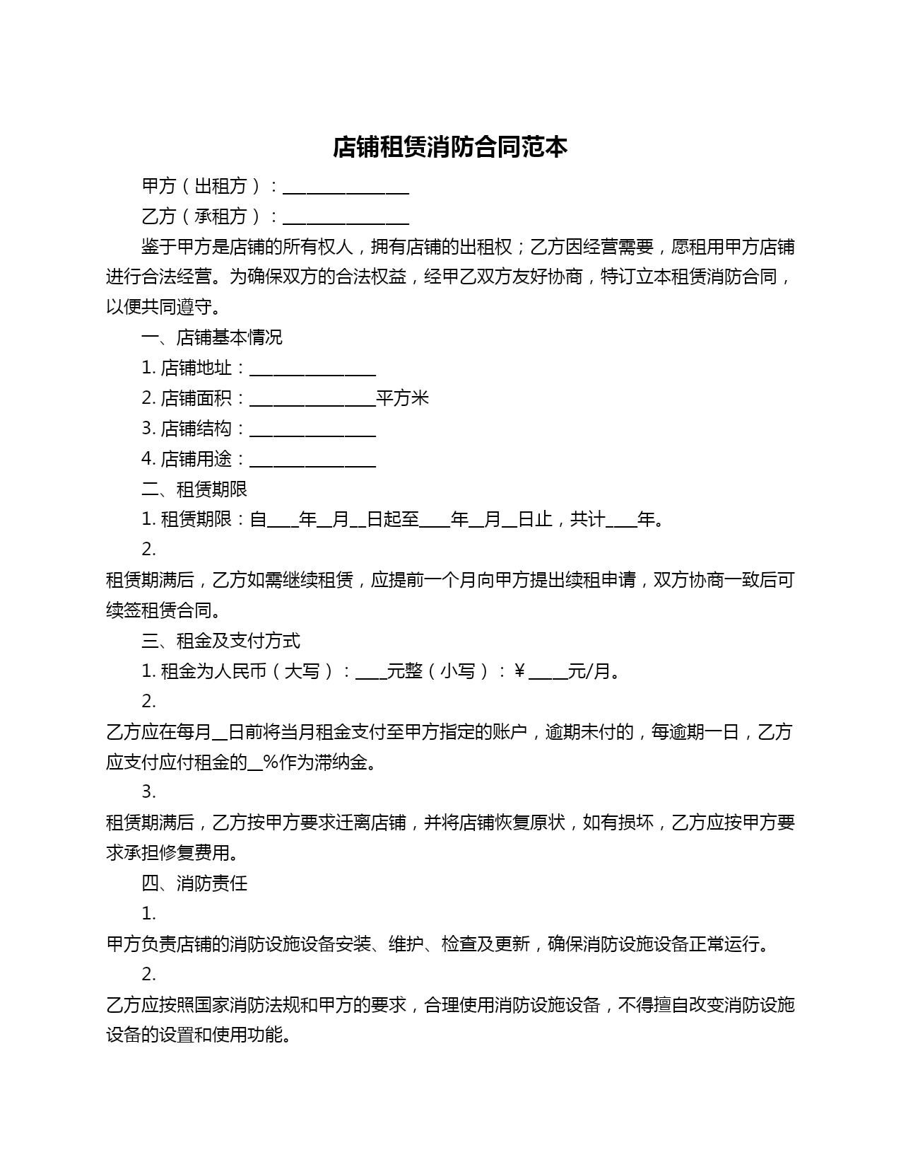 店铺租赁消防合同范本甲方(出租方):________________乙方(承租方):________________鉴于甲方是店铺的所有权人,拥有店铺的出租权;乙方因经营需要,愿租用甲方店铺进行合法经营。为确保双方的合法权益,经甲乙双方友好协商,特订立本租赁消防合同,以便共同遵守。一、店铺基本情况1.店铺地址:________________2.店铺面积:________________平方米3.店铺结构:________________4.店铺用途:________________二、租赁期限1.租赁期限:自____年__月__日起至____年__月__日止,共计____年。2.租赁期满后,乙方如需继续租赁,应提前一个月向甲方提出续租申请,双方协商一致后可续签租赁合同。三、租金及支付方式1.租金为人民币(大写):____元整(小写):¥_____元/月。2.乙方应在每月__日前将当月租金支付至甲方指定的账户,逾期未付的,每逾期一日,乙方应支付应付租金的__%作为滞纳金。3.租赁期满后,乙方按甲方要求迁离店铺,并将店铺恢复原状,如有损坏,乙方应按甲方要求承担修复费用。四、消防责任1.甲方负责店铺的消防设施设备安装、维护、检查及更新,确保消防设施设备正常运行。2.乙方应按照国家消防法规和甲方的要求,合理使用消防设施设备,不得擅自改变消防设施设备的设置和使用功能。3.乙方应加强员工的消防安全教育,提高员工的消防安全意识,制定并落实消防安全制度。4.乙方在租赁期间如需进行装修,必须提前向甲方提交装修方案,并经甲方审批同意后方可施工。装修过程中,乙方应确保消防设施设备正常运行,不得损坏消防设施设备。5.乙方在租赁期间如发生火灾,应立即启动火灾应急预案,采取有效措施进行扑救,并立即通知甲方及消防部门。五、违约责任1.乙方未按照约定支付租金的,甲方有权解除本合同,并要求乙方支付违约金,违约金为应付租金的__%。2.乙方擅自改变店铺用途、结构或进行违法经营活动的,甲方有权解除本合同,并要求乙方承担违约责任。3.乙方未按照约定履行消防责任的,甲方有权解除本合同,并要求乙方承担违约责任。六、争议解决本合同履行过程中,如发生争议,双方应友好协商解决;协商不成的,可以向合同签订地的人民法院提起诉讼。七、其他约定1.本合同一式两份,甲乙双方各执一份。2.本合同自双方签字(或盖章)之日起生效。甲方(盖章或签字):________________乙方(盖章或签字):________________签订日期:____年__月__日