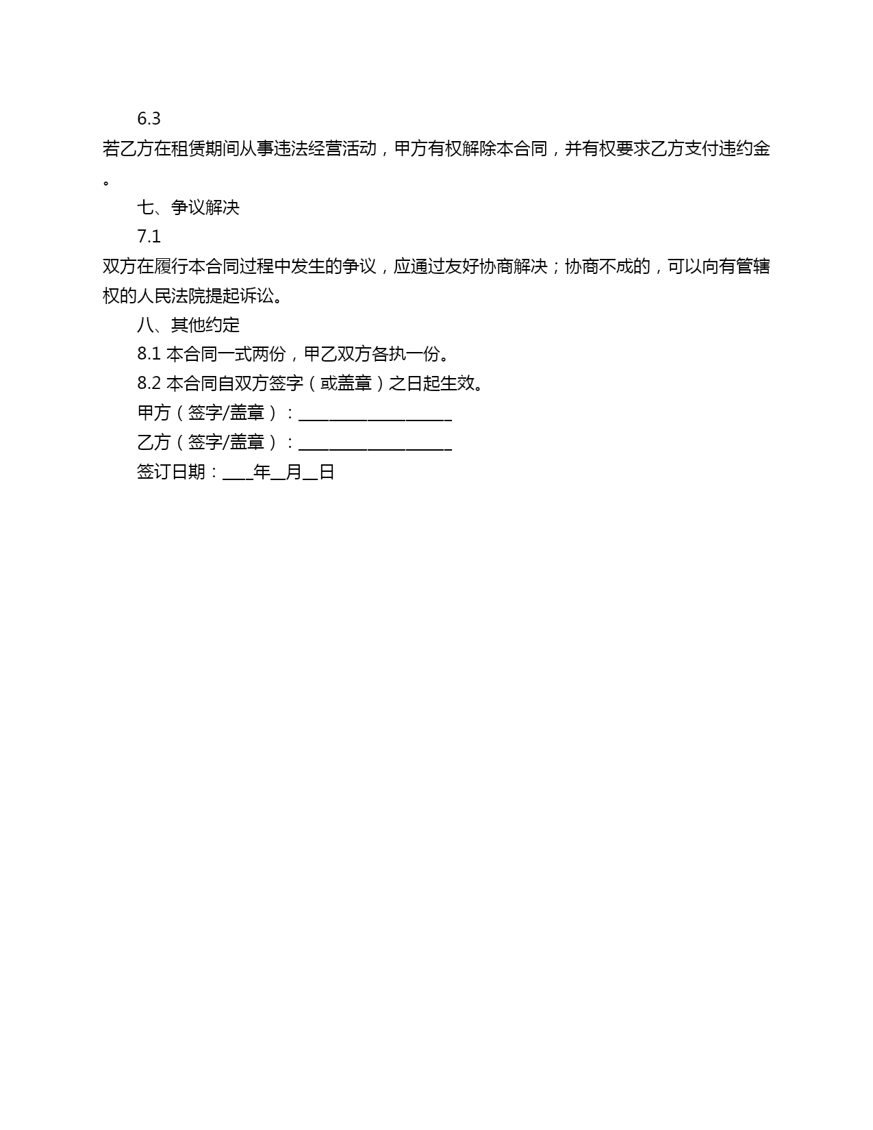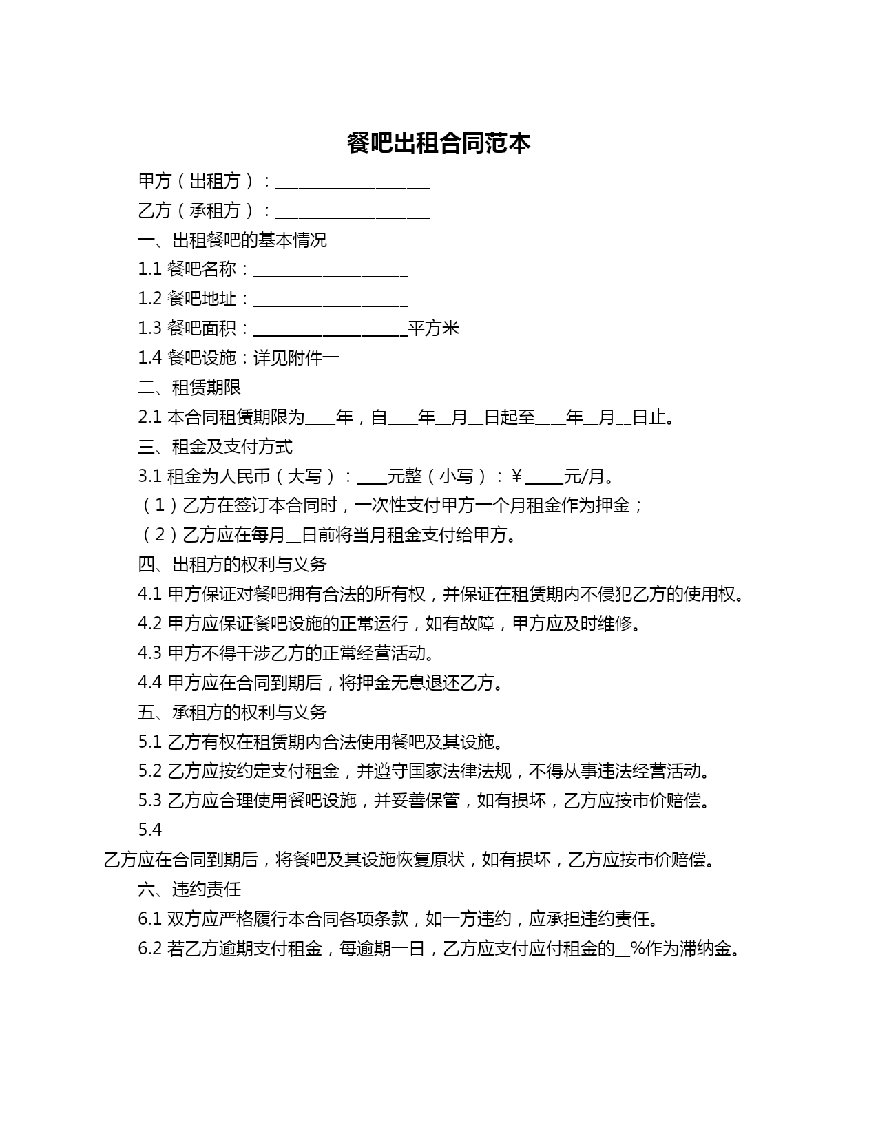 餐吧出租合同范本甲方(出租方):____________________乙方(承租方):____________________一、出租餐吧的基本情况1.1餐吧名称:____________________1.2餐吧地址:____________________1.3餐吧面积:____________________平方米1.4餐吧设施:详见附件一二、租赁期限2.1本合同租赁期限为____年,自____年__月__日起至____年__月__日止。三、租金及支付方式3.1租金为人民币(大写):____元整(小写):¥_____元/月。(1)乙方在签订本合同时,一次性支付甲方一个月租金作为押金;(2)乙方应在每月__日前将当月租金支付给甲方。四、出租方的权利与义务4.1甲方保证对餐吧拥有合法的所有权,并保证在租赁期内不侵犯乙方的使用权。4.2甲方应保证餐吧设施的正常运行,如有故障,甲方应及时维修。4.3甲方不得干涉乙方的正常经营活动。4.4甲方应在合同到期后,将押金无息退还乙方。五、承租方的权利与义务5.1乙方有权在租赁期内合法使用餐吧及其设施。5.2乙方应按约定支付租金,并遵守国家法律法规,不得从事违法经营活动。5.3乙方应合理使用餐吧设施,并妥善保管,如有损坏,乙方应按市价赔偿。5.4乙方应在合同到期后,将餐吧及其设施恢复原状,如有损坏,乙方应按市价赔偿。六、违约责任6.1双方应严格履行本合同各项条款,如一方违约,应承担违约责任。6.2若乙方逾期支付租金,每逾期一日,乙方应支付应付租金的__%作为滞纳金。6.3若乙方在租赁期间从事违法经营活动,甲方有权解除本合同,并有权要求乙方支付违约金。七、争议解决7.1双方在履行本合同过程中发生的争议,应通过友好协商解决;协商不成的,可以向有管辖权的人民法院提起诉讼。八、其他约定8.1本合同一式两份,甲乙双方各执一份。8.2本合同自双方签字(或盖章)之日起生效。甲方(签字/盖章):____________________乙方(签字/盖章):____________________签订日期:____年__月__日
