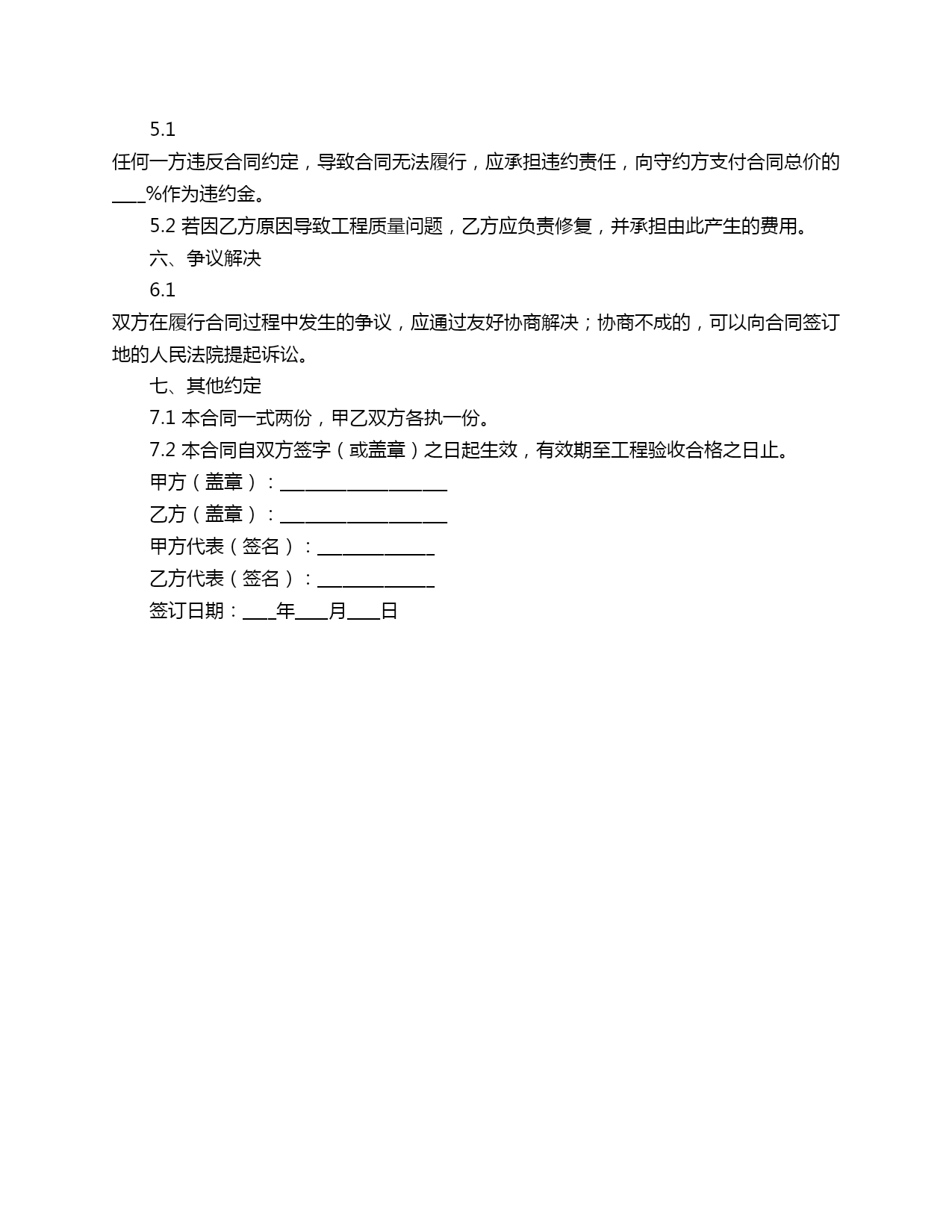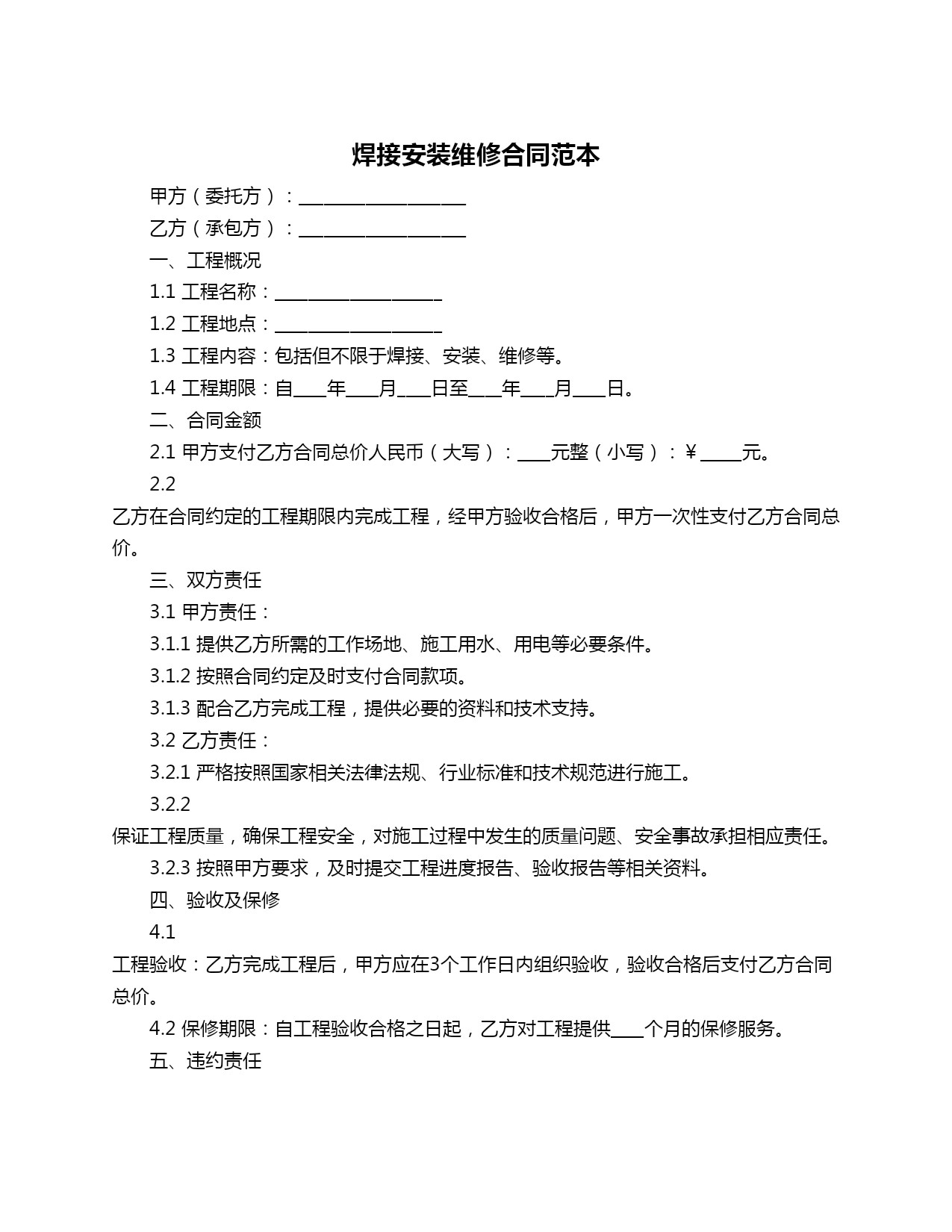 焊接安装维修合同范本甲方(委托方):____________________乙方(承包方):____________________一、工程概况1.1工程名称:____________________1.2工程地点:____________________1.3工程内容:包括但不限于焊接、安装、维修等。1.4工程期限:自____年____月____日至____年____月____日。二、合同金额2.1甲方支付乙方合同总价人民币(大写):____元整(小写):¥_____元。2.2乙方在合同约定的工程期限内完成工程,经甲方验收合格后,甲方一次性支付乙方合同总价。三、双方责任3.1甲方责任:3.1.1提供乙方所需的工作场地、施工用水、用电等必要条件。3.1.2按照合同约定及时支付合同款项。3.1.3配合乙方完成工程,提供必要的资料和技术支持。3.2乙方责任:3.2.1严格按照国家相关法律法规、行业标准和技术规范进行施工。3.2.2保证工程质量,确保工程安全,对施工过程中发生的质量问题、安全事故承担相应责任。3.2.3按照甲方要求,及时提交工程进度报告、验收报告等相关资料。四、验收及保修4.1工程验收:乙方完成工程后,甲方应在3个工作日内组织验收,验收合格后支付乙方合同总价。4.2保修期限:自工程验收合格之日起,乙方对工程提供____个月的保修服务。五、违约责任5.1任何一方违反合同约定,导致合同无法履行,应承担违约责任,向守约方支付合同总价的____%作为违约金。5.2若因乙方原因导致工程质量问题,乙方应负责修复,并承担由此产生的费用。六、争议解决6.1双方在履行合同过程中发生的争议,应通过友好协商解决;协商不成的,可以向合同签订地的人民法院提起诉讼。七、其他约定7.1本合同一式两份,甲乙双方各执一份。7.2本合同自双方签字(或盖章)之日起生效,有效期至工程验收合格之日止。甲方(盖章):____________________乙方(盖章):____________________甲方代表(签名):______________乙方代表(签名):______________签订日期:____年____月____日