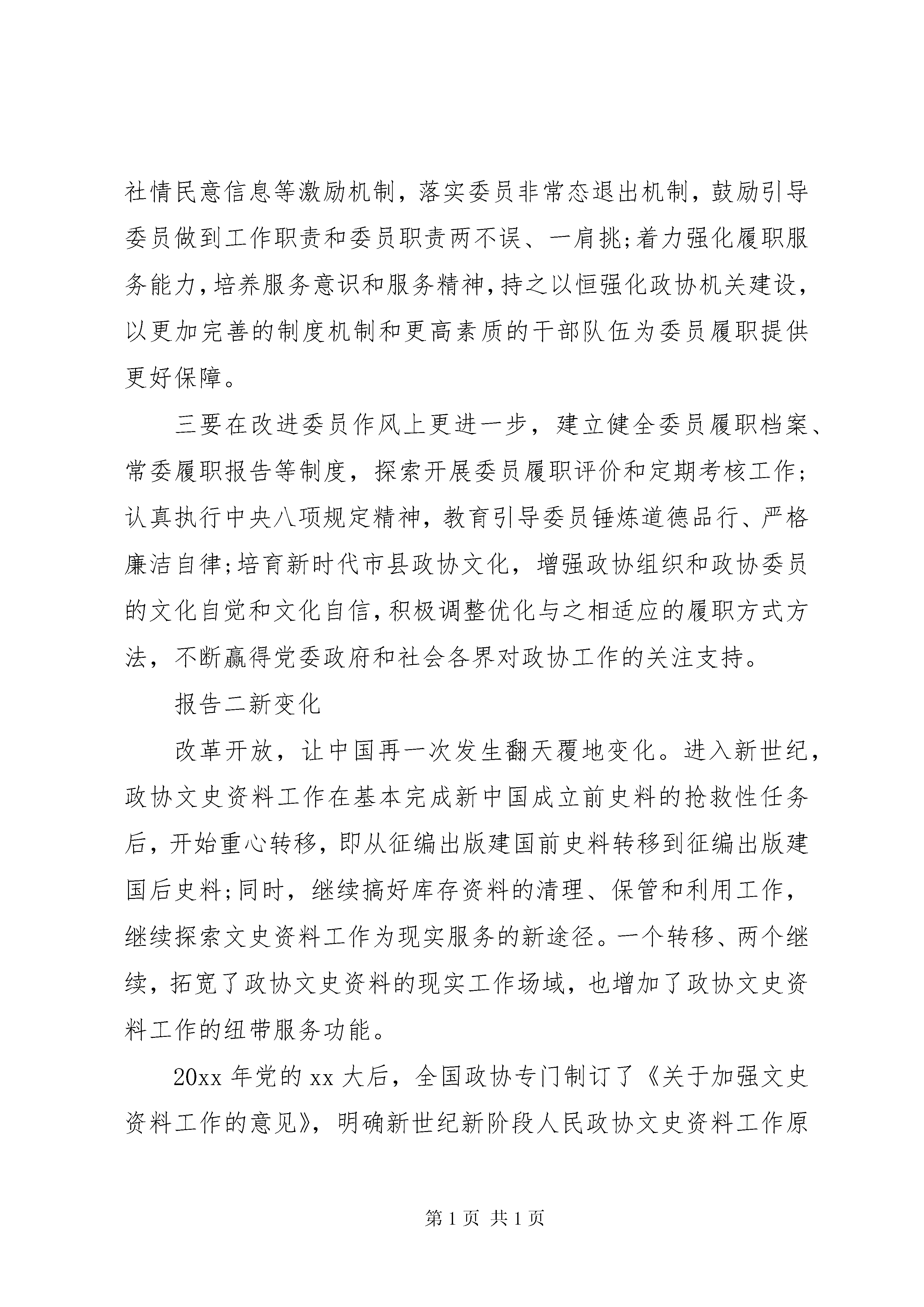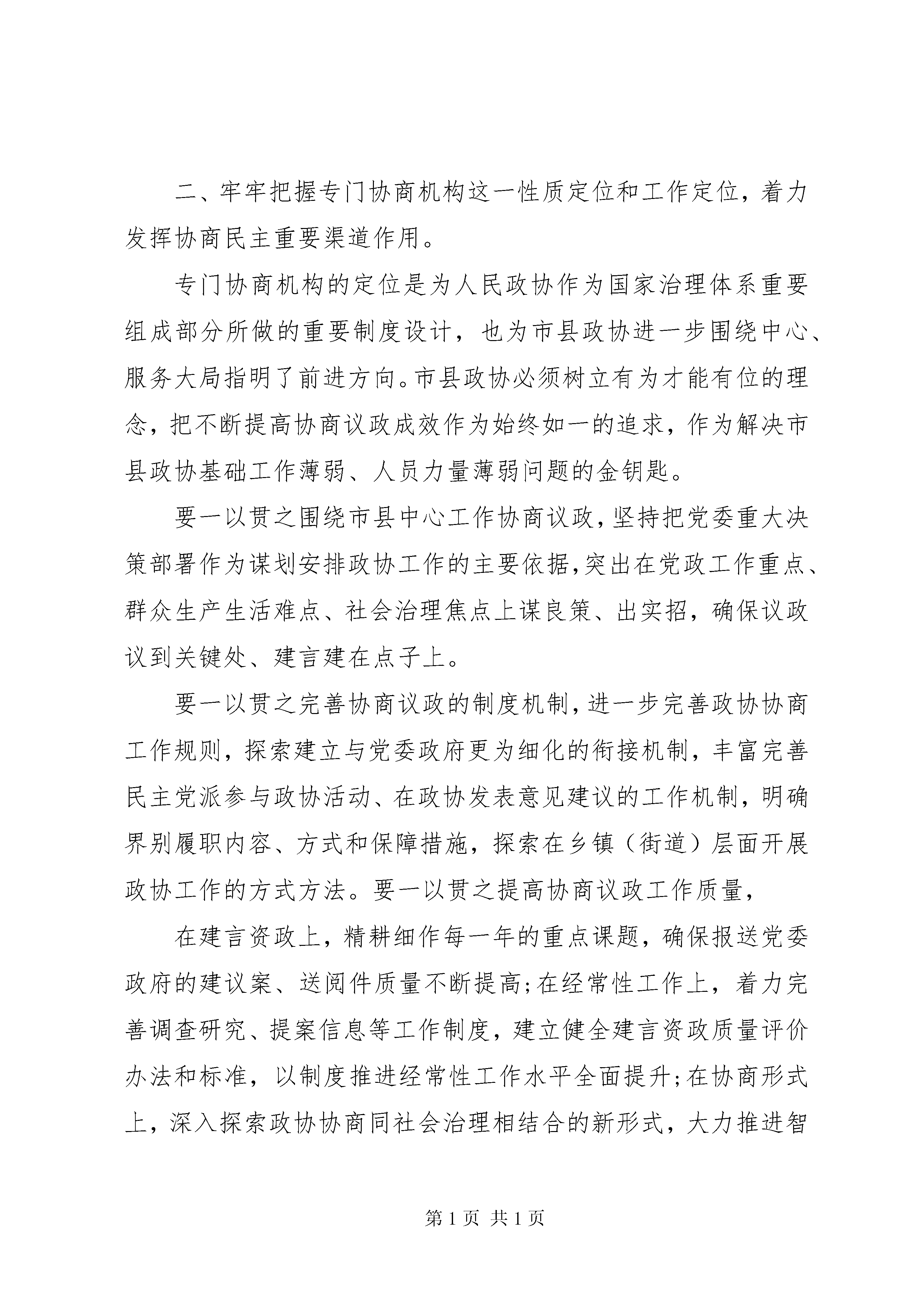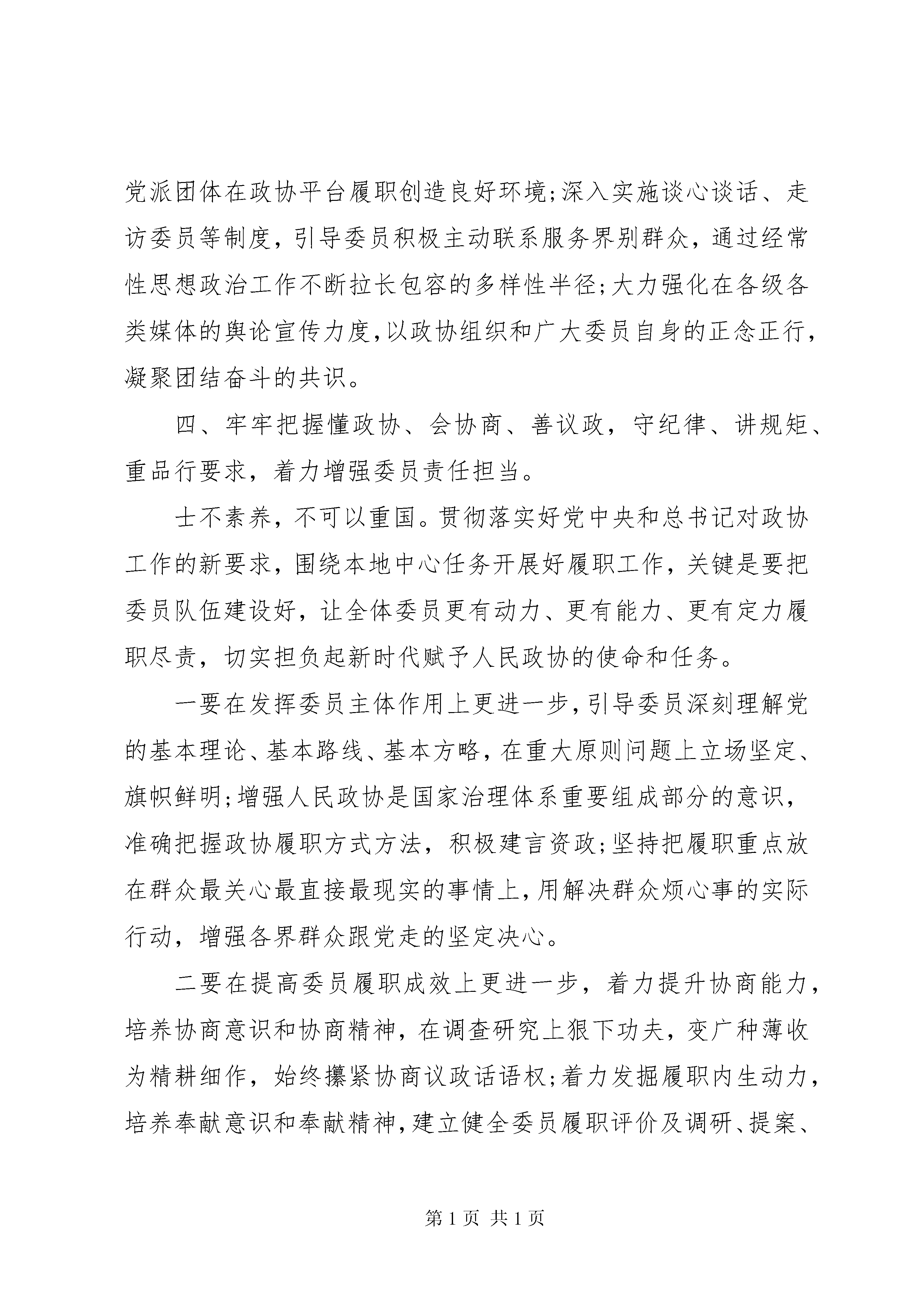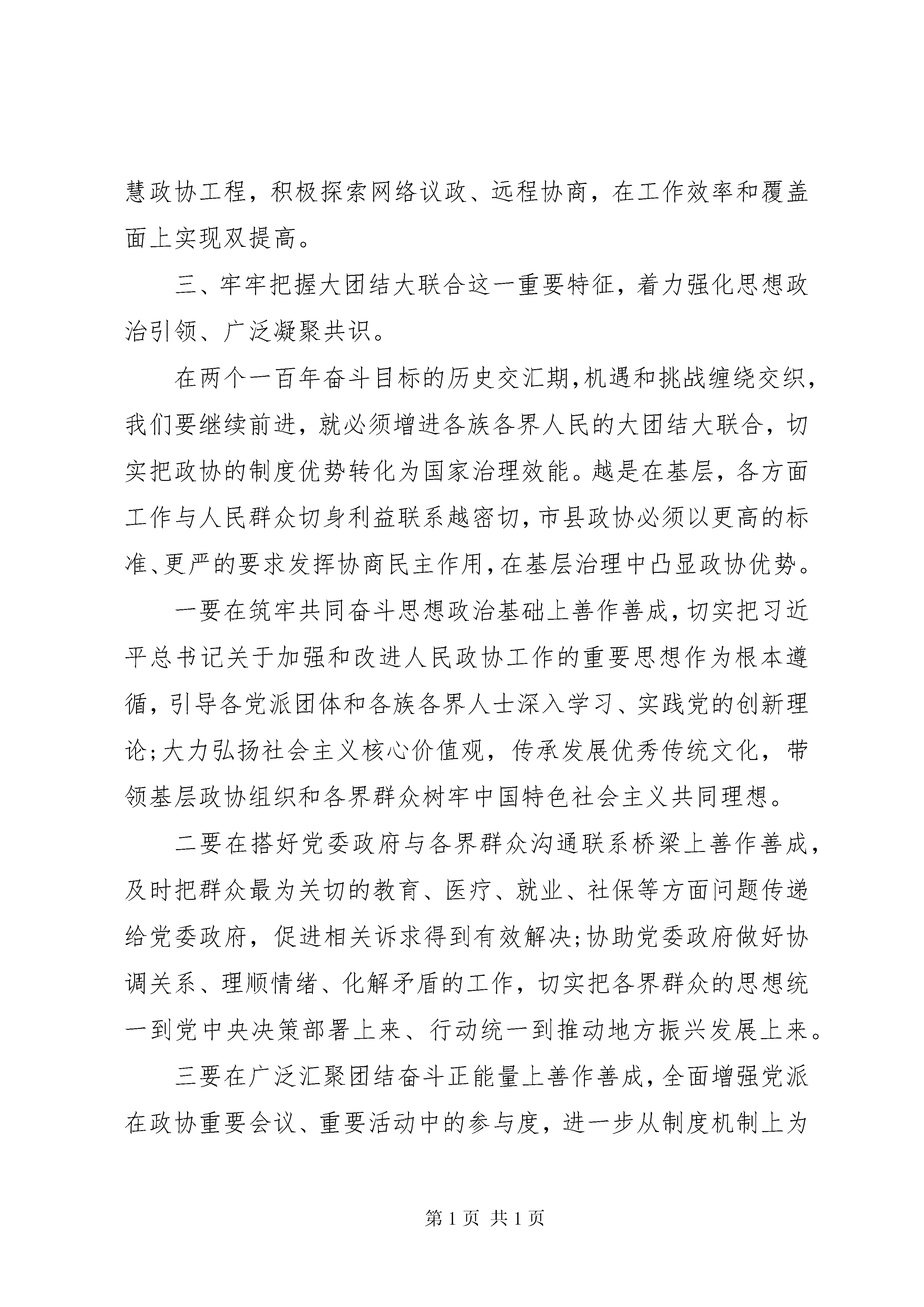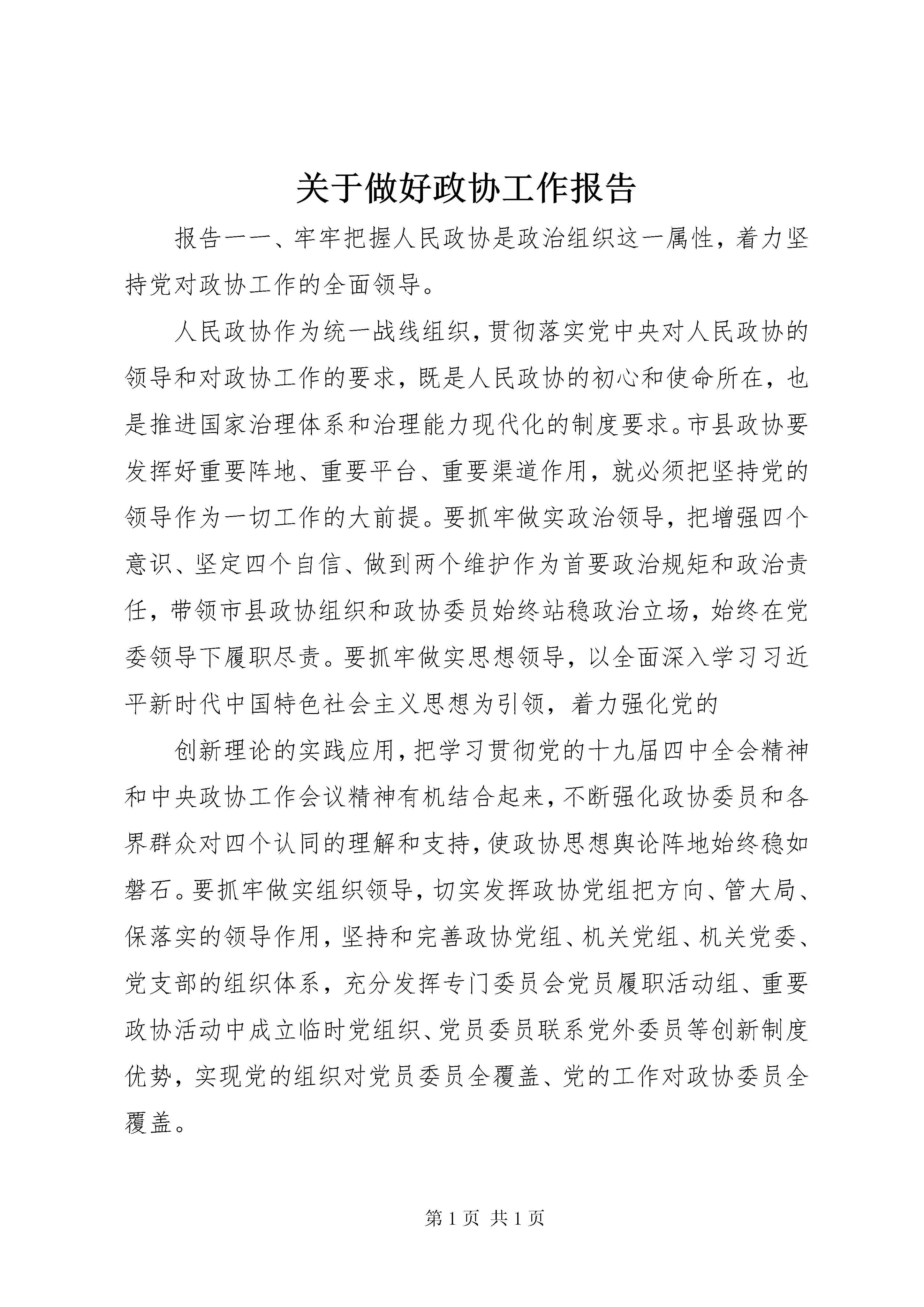 关于做好政协工作报告报告一一、牢牢把握人民政协是政治组织这一属性,着力坚持党对政协工作的全面领导。人民政协作为统一战线组织,贯彻落实党中央对人民政协的领导和对政协工作的要求,既是人民政协的初心和使命所在,也是推进国家治理体系和治理能力现代化的制度要求。市县政协要发挥好重要阵地、重要平台、重要渠道作用,就必须把坚持党的领导作为一切工作的大前提。要抓牢做实政治领导,把增强四个意识、坚定四个自信、做到两个维护作为首要政治规矩和政治责任,带领市县政协组织和政协委员始终站稳政治立场,始终在党委领导下履职尽责。要抓牢做实思想领导,以全面深入学习习近平新时代中国特色社会主义思想为引领,着力强化党的创新理论的实践应用,把学习贯彻党的十九届四中全会精神和中央政协工作会议精神有机结合起来,不断强化政协委员和各界群众对四个认同的理解和支持,使政协思想舆论阵地始终稳如磐石。要抓牢做实组织领导,切实发挥政协党组把方向、管大局、保落实的领导作用,坚持和完善政协党组、机关党组、机关党委、党支部的组织体系,充分发挥专门委员会党员履职活动组、重要政协活动中成立临时党组织、党员委员联系党外委员等创新制度优势,实现党的组织对党员委员全覆盖、党的工作对政协委员全覆盖。二、牢牢把握专门协商机构这一性质定位和工作定位,着力发挥协商民主重要渠道作用。专门协商机构的定位是为人民政协作为国家治理体系重要组成部分所做的重要制度设计,也为市县政协进一步围绕中心、服务大局指明了前进方向。市县政协必须树立有为才能有位的理念,把不断提高协商议政成效作为始终如一的追求,作为解决市县政协基础工作薄弱、人员力量薄弱问题的金钥匙。要一以贯之围绕市县中心工作协商议政,坚持把党委重大决策部署作为谋划安排政协工作的主要依据,突出在党政工作重点、群众生产生活难点、社会治理焦点上谋良策、出实招,确保议政议到关键处、建言建在点子上。要一以贯之完善协商议政的制度机制,进一步完善政协协商工作规则,探索建立与党委政府更为细化的衔接机制,丰富完善民主党派参与政协活动、在政协发表意见建议的工作机制,明确界别履职内容、方式和保障措施,探索在乡镇(街道)层面开展政协工作的方式方法。要一以贯之提高协商议政工作质量,在建言资政上,精耕细作每一年的重点课题,确保报送党委政府的建议案、送阅件质量不断提高;在经常性工作上,着力完善调查研究、提案信息等工作制度,建立健全建言资政质量评价办法和标准,以制度推进经常性工作水平全面提升;在协商形式上,深入探索政协协商同社会治理相结合的新形式,大力推进智慧政协工程,积极探索网络议政、远程协商,在工作效率和覆盖面上实现双提高。三、牢牢把握大团结大联合这一重要特征,着力强化思想政治引领、广泛凝聚共识。在两个一百年奋斗目标的历史交汇期,机遇和挑战缠绕交织,我们要继续前进,就必须增进各族各界人民的大团结大联合,切实把政协的制度优势转化为国家治理效能。越是在基层,各方面工作与人民群众切身利益联系越密切,市县政协必须以更高的标准、更严的要求发挥协商民主作用,在基层治理中凸显政协优势。一要在筑牢共同奋斗思想政治基础上善作善成,切实把习近平总书记关于加强和改进人民政协工作的重要思想作为根本遵循,引导各党派团体和各族各界人士深入学习、实践党的创新理论;大力弘扬社会主义核心价值观,传承发展优秀传统文化,带领基层政协组织和各界群众树牢中国特色社会主义共同理想。二要在搭好党委政府与各界群众沟通联系桥梁上善作善成,及时把群众最为关切的教育、医疗、就业、社保等方面问题传递给党委政府,促进相关诉求得到有效解决;协助党委政府做好协调关系、理顺情绪、化解矛盾的工作,切实把各界群众的思想统一到党中央决策部署上来、行动统一到推动地方振兴发展上来。三要在广泛汇聚团结奋斗正能量上善作善成,全面增强党派在政协重要会议、重要活动中的参与度,进一步从制度机制上为党派团体在政协平台履职创造良好环境;深入实施谈心谈话、走访委员等制度,引导委员积极主动联系服务界别群众,通过经常性思想政治工作不断拉长包容的多样性半径;大力强化在各级各类媒体的舆论宣传力度,以政协组织和广大委员自身的正念正行,凝聚团结奋斗的共识。四、牢牢把握懂政协、会协商、善议政,守纪律、讲规矩、重品行要求,着力增强委员责任担当。士不素养,不可以重国。贯彻落实好党中央和总书记对政协工作的新要求,围绕本地中心任务开展好履职工作,关键是要把委员队伍建设好,让全体委员更有动力、更有能力、更有定力履职尽责,切实担负起新时代赋予人民政协的使命和任务。一要在发挥委员主体作用上更进一步,引导委员深刻理解党的基本理论、基本路线、基本方略,在重大原则问题上立场坚定、旗帜鲜明;增强人民政协是国家治理体系重要组成部分的意识,准确把握政协履职方式方法,积极建言资政;坚持把履职重