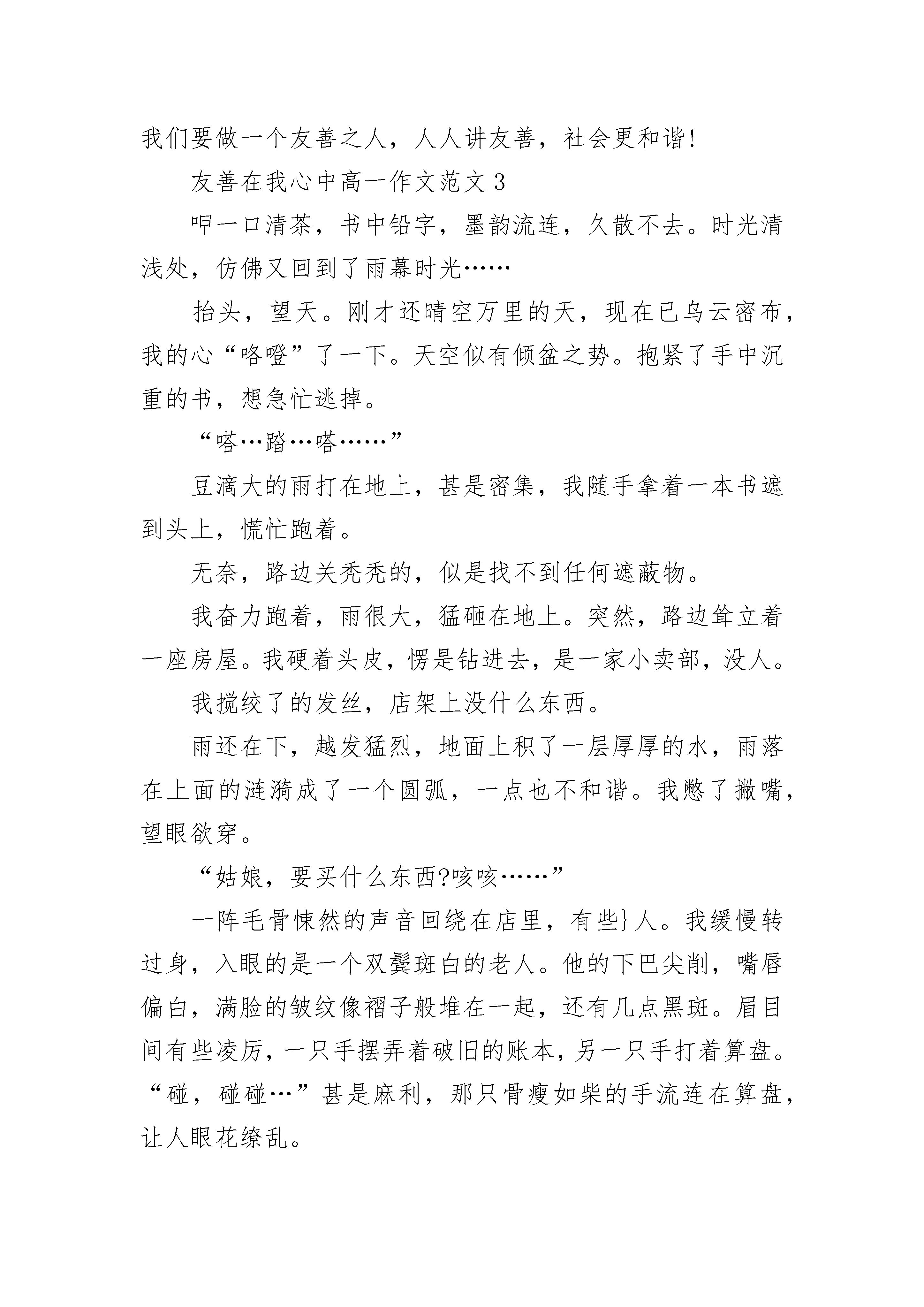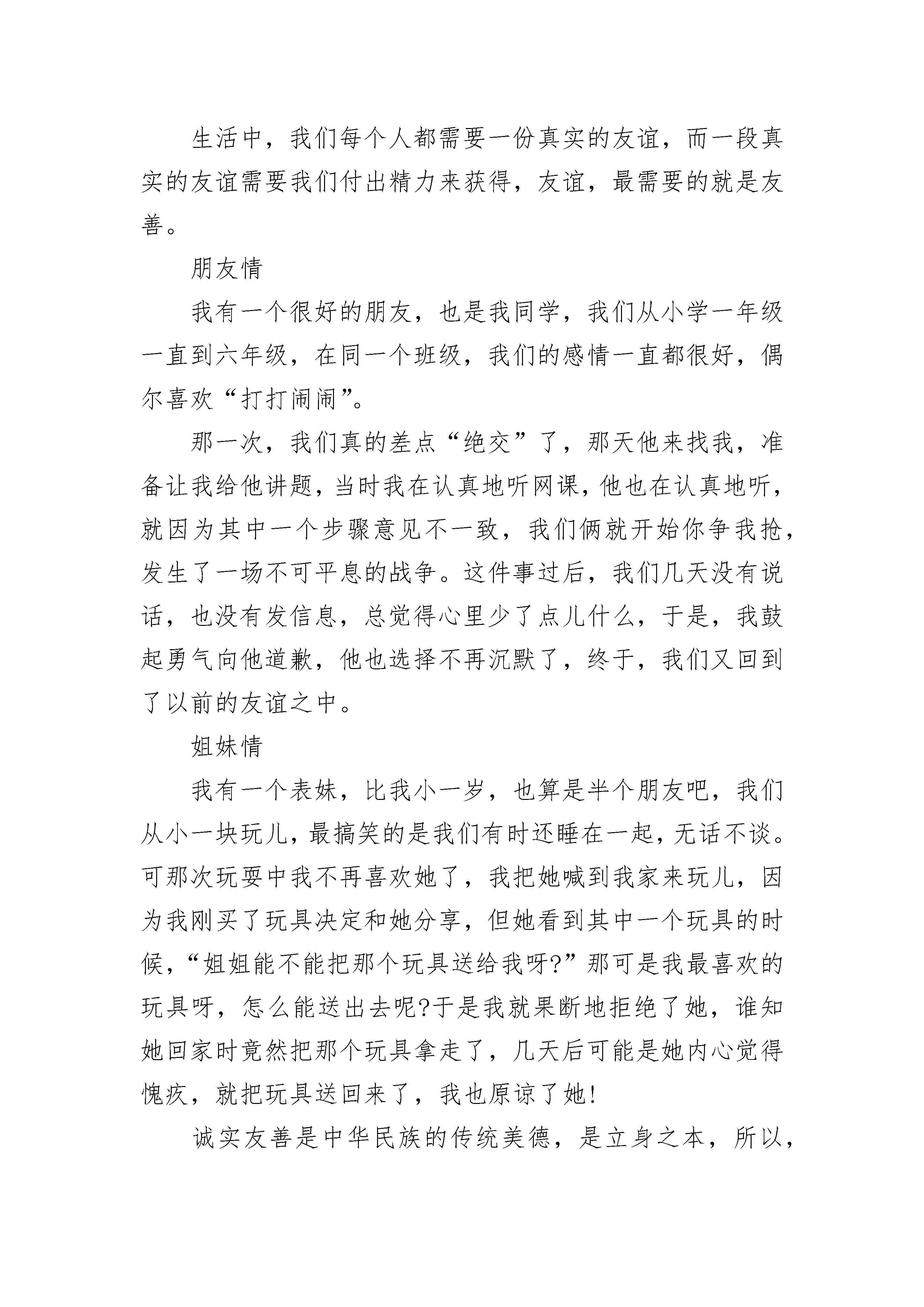友善在我心中高一作文范文友善是我们身边不可缺少的一点。它是从古流传下来的文化精神。它是一个人胸襟宽广的体现,它是一个人品格高尚的标准,它是当今社会中待人接物的美好美德。记得有一次,在星期三下午的体育课上,我们举行了一次接力跑比赛。同学们热情高涨,个个都牟足了劲,奋力向前冲去。前面的同学都稳稳的接住了红白相间的接力棒。马上就轮到我了,我还没开始跑,腿就开始软了。“怎么办?怎么办?我跑不快,会给我们这队拖后腿的。”我一个人在自言自语。我们这队的队员听到了,轻轻的拍了拍我的肩膀,说:“没关系,只要你全力以赴,不管结果怎么样,大家都不会责怪你的。”从她说话的眼神里,我看到了友善。轮到我了,我轻松的接住了接力棒,拼尽全力向前冲去。眼看就要交棒了,可是一不留神却和接棒的同学撞个满怀。巨大的冲击力把她撞倒了,可是她不顾自身伤痛,立马从草地上爬起来,奋力向终点跑去。虽然我们这队中间出现了小插曲,但最终我们还是赢了。大家都沉浸在喜悦中,可是我却满怀愧疚。回到教室,我一个劲儿的向被我撞倒的同学赔礼道歉。然而,她却友善的对我说:“没事呢,不疼。大家都是为了我们团队获得好的成绩而努力。”没错!友善就是这么简单的一句话。让一个人心里得到解脱。友善在我心中高一作文范文2生活中,我们每个人都需要一份真实的友谊,而一段真实的友谊需要我们付出精力来获得,友谊,最需要的就是友善。朋友情我有一个很好的朋友,也是我同学,我们从小学一年级一直到六年级,在同一个班级,我们的感情一直都很好,偶尔喜欢“打打闹闹”。那一次,我们真的差点“绝交”了,那天他来找我,准备让我给他讲题,当时我在认真地听网课,他也在认真地听,就因为其中一个步骤意见不一致,我们俩就开始你争我抢,发生了一场不可平息的战争。这件事过后,我们几天没有说话,也没有发信息,总觉得心里少了点儿什么,于是,我鼓起勇气向他道歉,他也选择不再沉默了,终于,我们又回到了以前的友谊之中。姐妹情我有一个表妹,比我小一岁,也算是半个朋友吧,我们从小一块玩儿,最搞笑的是我们有时还睡在一起,无话不谈。可那次玩耍中我不再喜欢她了,我把她喊到我家来玩儿,因为我刚买了玩具决定和她分享,但她看到其中一个玩具的时候,“姐姐能不能把那个玩具送给我呀?”那可是我最喜欢的玩具呀,怎么能送出去呢?于是我就果断地拒绝了她,谁知她回家时竟然把那个玩具拿走了,几天后可能是她内心觉得愧疚,就把玩具送回来了,我也原谅了她!诚实友善是中华民族的传统美德,是立身之本,所以,我们要做一个友善之人,人人讲友善,社会更和谐!友善在我心中高一作文范文3呷一口清茶,书中铅字,墨韵流连,久散不去。时光清浅处,仿佛又回到了雨幕时光……抬头,望天。刚才还晴空万里的天,现在已乌云密布,我的心“咯噔”了一下。天空似有倾盆之势。抱紧了手中沉重的书,想急忙逃掉。“嗒…踏…嗒……”豆滴大的雨打在地上,甚是密集,我随手拿着一本书遮到头上,慌忙跑着。无奈,路边关秃秃的,似是找不到任何遮蔽物。我奋力跑着,雨很大,猛砸在地上。突然,路边耸立着一座房屋。我硬着头皮,愣是钻进去,是一家小卖部,没人。我搅绞了的发丝,店架上没什么东西。雨还在下,越发猛烈,地面上积了一层厚厚的水,雨落在上面的涟漪成了一个圆弧,一点也不和谐。我憋了撇嘴,望眼欲穿。“姑娘,要买什么东西?咳咳……”一阵毛骨悚然的声音回绕在店里,有些}人。我缓慢转过身,入眼的是一个双鬓斑白的老人。他的下巴尖削,嘴唇偏白,满脸的皱纹像褶子般堆在一起,还有几点黑斑。眉目间有些凌厉,一只手摆弄着破旧的账本,另一只手打着算盘。“碰,碰碰…”甚是麻利,那只骨瘦如柴的手流连在算盘,让人眼花缭乱。他似是感觉到我的目光,猛抬头,冷冷的说了句:“要买什么东西?”“没,没买什么。”我低下头,看着脚尖。没再说话。雨下得更大了,斜织着,未有消停之势。我犹豫着,望了望雨,轻轻咬着嘴唇,准备冲入雨中。“踏…踏”身边传来了一阵脚步声,老人走进了另一间屋子。我再次望着雨帘,呵,还是很大呢!我在店里踱来踱去,好吧。一只脚便跨出了门。“等一下,咳咳…”“这里有伞,你一个女孩子,淋感冒了怎么办。快拿着。”他缓缓地递过一把黑伞,我撇了眼,接过。“谢谢”嘴边嗫嚅着。伞很新,把柄没有生锈的痕迹,漆黝黑发亮。我拿着伞,顿了下,冲入雨中。雨小了点,我转过头,他C骨嶙峋的身子映入眼帘。喉中有些哽咽。……“啪嗒……啪嗒”雨和脚步声融合在一起,竟有些和谐。友善在我心中高一作文范文4小时的我,不爱分享,一有什么新玩意儿带到学校,总是小心地护着,生怕被别人借了去。若是有人开口借,我会果断拒绝。每次对方嘀咕“小气鬼”悻悻走开时,我想的都是“没有就去买啊,我的东西凭什么借给你?”在家也是不爱分享的。爸爸有什么好东西给我,我总是毫不客气地接下;自己剥了橘子,也只是自己心安理得地吃着。妈妈总是叹气:“你不能