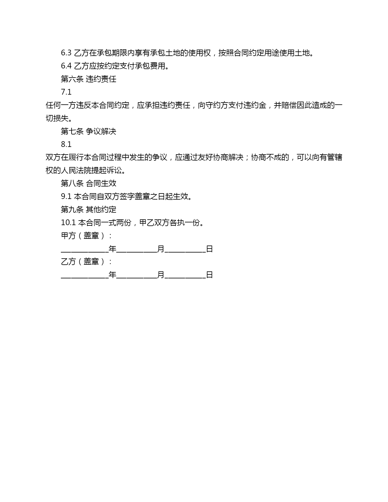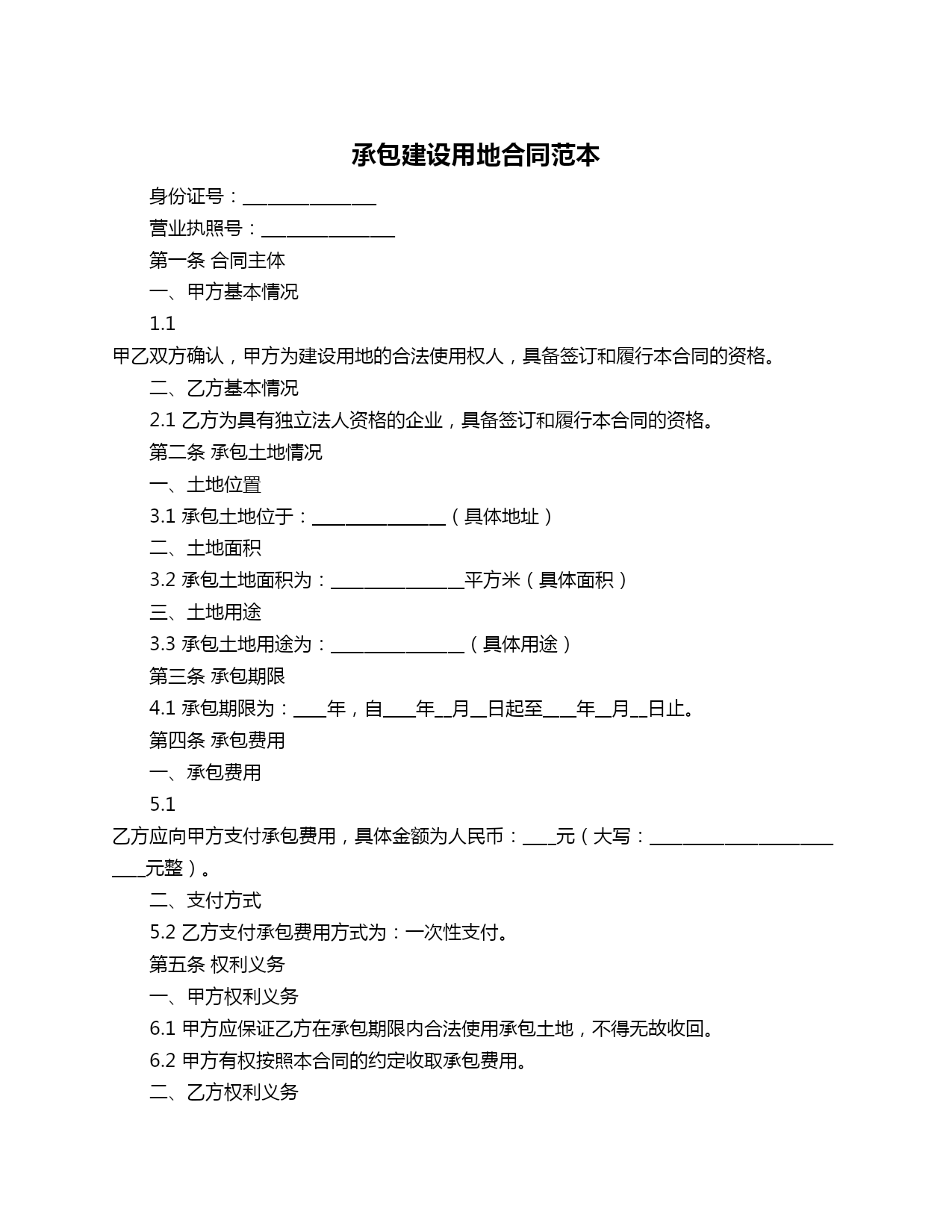 承包建设用地合同范本身份证号:________________营业执照号:________________第一条合同主体一、甲方基本情况1.1甲乙双方确认,甲方为建设用地的合法使用权人,具备签订和履行本合同的资格。二、乙方基本情况2.1乙方为具有独立法人资格的企业,具备签订和履行本合同的资格。第二条承包土地情况一、土地位置3.1承包土地位于:________________(具体地址)二、土地面积3.2承包土地面积为:________________平方米(具体面积)三、土地用途3.3承包土地用途为:________________(具体用途)第三条承包期限4.1承包期限为:____年,自____年__月__日起至____年__月__日止。第四条承包费用一、承包费用5.1乙方应向甲方支付承包费用,具体金额为人民币:____元(大写:__________________________元整)。二、支付方式5.2乙方支付承包费用方式为:一次性支付。第五条权利义务一、甲方权利义务6.1甲方应保证乙方在承包期限内合法使用承包土地,不得无故收回。6.2甲方有权按照本合同的约定收取承包费用。二、乙方权利义务6.3乙方在承包期限内享有承包土地的使用权,按照合同约定用途使用土地。6.4乙方应按约定支付承包费用。第六条违约责任7.1任何一方违反本合同约定,应承担违约责任,向守约方支付违约金,并赔偿因此造成的一切损失。第七条争议解决8.1双方在履行本合同过程中发生的争议,应通过友好协商解决;协商不成的,可以向有管辖权的人民法院提起诉讼。第八条合同生效9.1本合同自双方签字盖章之日起生效。第九条其他约定10.1本合同一式两份,甲乙双方各执一份。甲方(盖章):______________年____________月____________日乙方(盖章):______________年____________月____________日