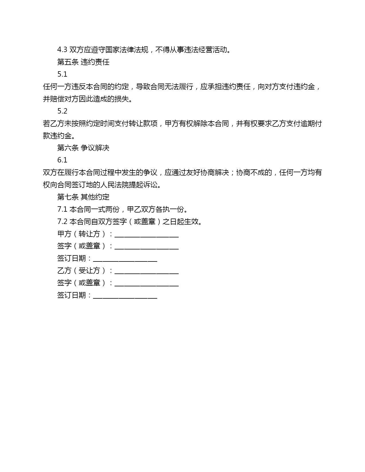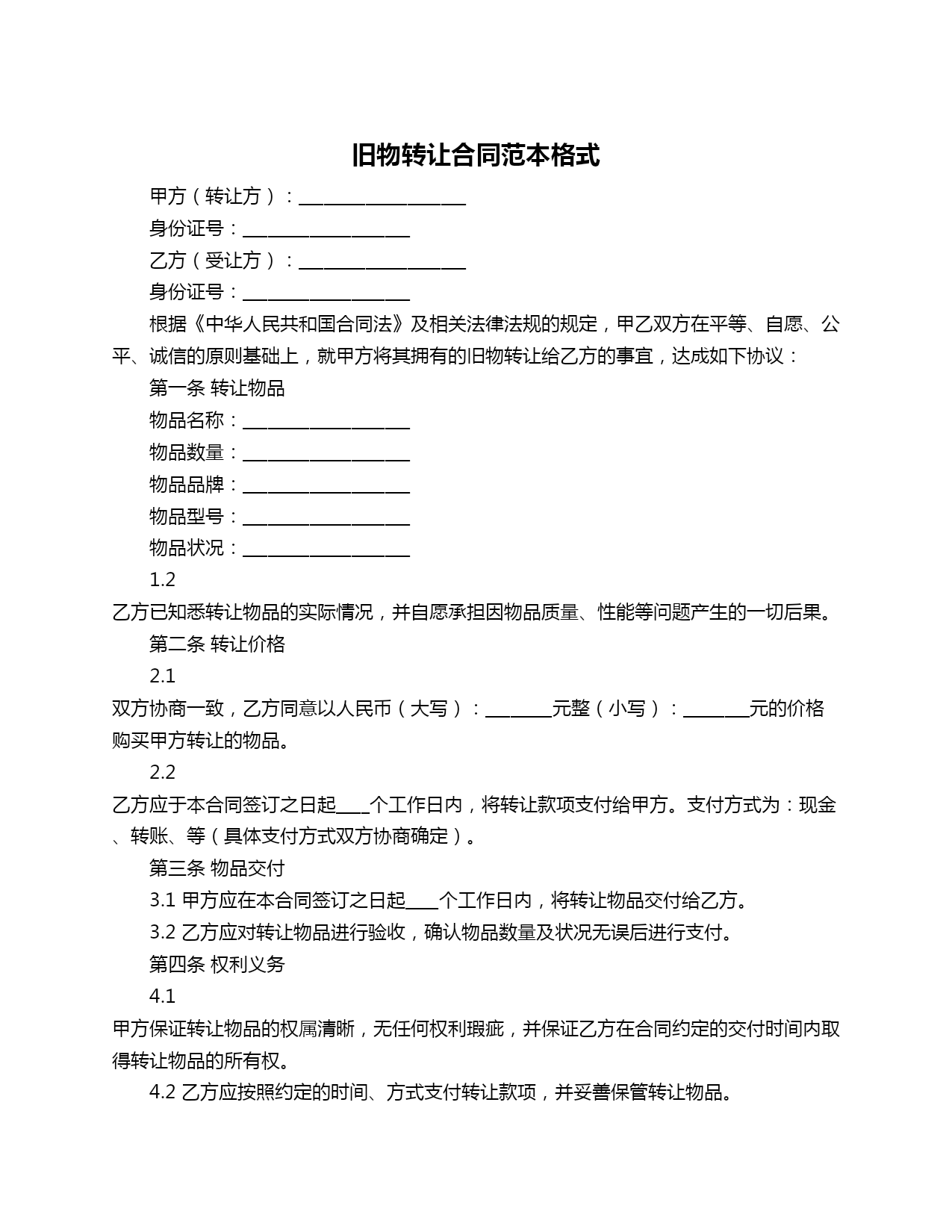 旧物转让合同范本格式甲方(转让方):____________________身份证号:____________________乙方(受让方):____________________身份证号:____________________根据《中华人民共和国合同法》及相关法律法规的规定,甲乙双方在平等、自愿、公平、诚信的原则基础上,就甲方将其拥有的旧物转让给乙方的事宜,达成如下协议:第一条转让物品物品名称:____________________物品数量:____________________物品品牌:____________________物品型号:____________________物品状况:____________________1.2乙方已知悉转让物品的实际情况,并自愿承担因物品质量、性能等问题产生的一切后果。第二条转让价格2.1双方协商一致,乙方同意以人民币(大写):________元整(小写):________元的价格购买甲方转让的物品。2.2乙方应于本合同签订之日起____个工作日内,将转让款项支付给甲方。支付方式为:现金、转账、等(具体支付方式双方协商确定)。第三条物品交付3.1甲方应在本合同签订之日起____个工作日内,将转让物品交付给乙方。3.2乙方应对转让物品进行验收,确认物品数量及状况无误后进行支付。第四条权利义务4.1甲方保证转让物品的权属清晰,无任何权利瑕疵,并保证乙方在合同约定的交付时间内取得转让物品的所有权。4.2乙方应按照约定的时间、方式支付转让款项,并妥善保管转让物品。4.3双方应遵守国家法律法规,不得从事违法经营活动。第五条违约责任5.1任何一方违反本合同的约定,导致合同无法履行,应承担违约责任,向对方支付违约金,并赔偿对方因此造成的损失。5.2若乙方未按照约定时间支付转让款项,甲方有权解除本合同,并有权要求乙方支付逾期付款违约金。第六条争议解决6.1双方在履行本合同过程中发生的争议,应通过友好协商解决;协商不成的,任何一方均有权向合同签订地的人民法院提起诉讼。第七条其他约定7.1本合同一式两份,甲乙双方各执一份。7.2本合同自双方签字(或盖章)之日起生效。甲方(转让方):____________________签字(或盖章):____________________签订日期:____________________乙方(受让方):____________________签字(或盖章):____________________签订日期:____________________