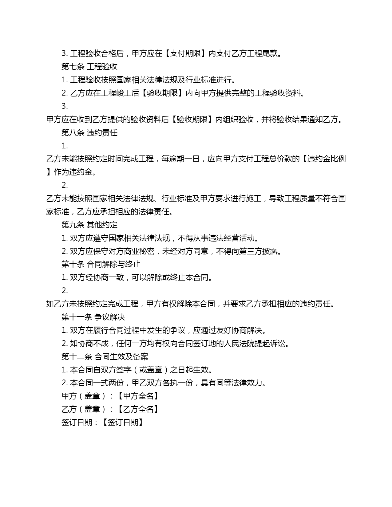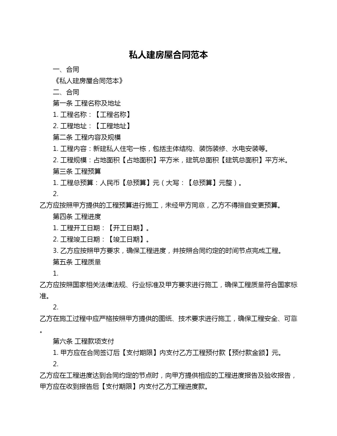 私人建房屋合同范本一、合同《私人建房屋合同范本》二、合同第一条工程名称及地址1.工程名称:【工程名称】2.工程地址:【工程地址】第二条工程内容及规模1.工程内容:新建私人住宅一栋,包括主体结构、装饰装修、水电安装等。2.工程规模:占地面积【占地面积】平方米,建筑总面积【建筑总面积】平方米。第三条工程预算1.工程总预算:人民币【总预算】元(大写:【总预算】元整)。2.乙方应按照甲方提供的工程预算进行施工,未经甲方同意,乙方不得擅自变更预算。第四条工程进度1.工程开工日期:【开工日期】。2.工程竣工日期:【竣工日期】。3.乙方应按照甲方要求,确保工程进度,并按照合同约定的时间节点完成工程。第五条工程质量1.乙方应按照国家相关法律法规、行业标准及甲方要求进行施工,确保工程质量符合国家标准。2.乙方在施工过程中应严格按照甲方提供的图纸、技术要求进行施工,确保工程安全、可靠。第六条工程款项支付1.甲方应在合同签订后【支付期限】内支付乙方工程预付款【预付款金额】元。2.乙方应在工程进度达到合同约定的节点时,向甲方提供相应的工程进度报告及验收报告,甲方应在收到报告后【支付期限】内支付乙方工程进度款。3.工程验收合格后,甲方应在【支付期限】内支付乙方工程尾款。第七条工程验收1.工程验收按照国家相关法律法规及行业标准进行。2.乙方应在工程峻工后【验收期限】内向甲方提供完整的工程验收资料。3.甲方应在收到乙方提供的验收资料后【验收期限】内组织验收,并将验收结果通知乙方。第八条违约责任1.乙方未能按照约定时间完成工程,每逾期一日,应向甲方支付工程总价款的【违约金比例】作为违约金。2.乙方未能按照国家相关法律法规、行业标准及甲方要求进行施工,导致工程质量不符合国家标准,乙方应承担相应的法律责任。第九条其他约定1.双方应遵守国家相关法律法规,不得从事违法经营活动。2.双方应保守对方商业秘密,未经对方同意,不得向第三方披露。第十条合同解除与终止1.双方经协商一致,可以解除或终止本合同。2.如乙方未按照约定完成工程,甲方有权解除本合同,并要求乙方承担相应的违约责任。第十一条争议解决1.双方在履行合同过程中发生的争议,应通过友好协商解决。2.如协商不成,任何一方均有权向合同签订地的人民法院提起诉讼。第十二条合同生效及备案1.本合同自双方签字(或盖章)之日起生效。2.本合同一式两份,甲乙双方各执一份,具有同等法律效力。甲方(盖章):【甲方全名】乙方(盖章):【乙方全名】签订日期:【签订日期】