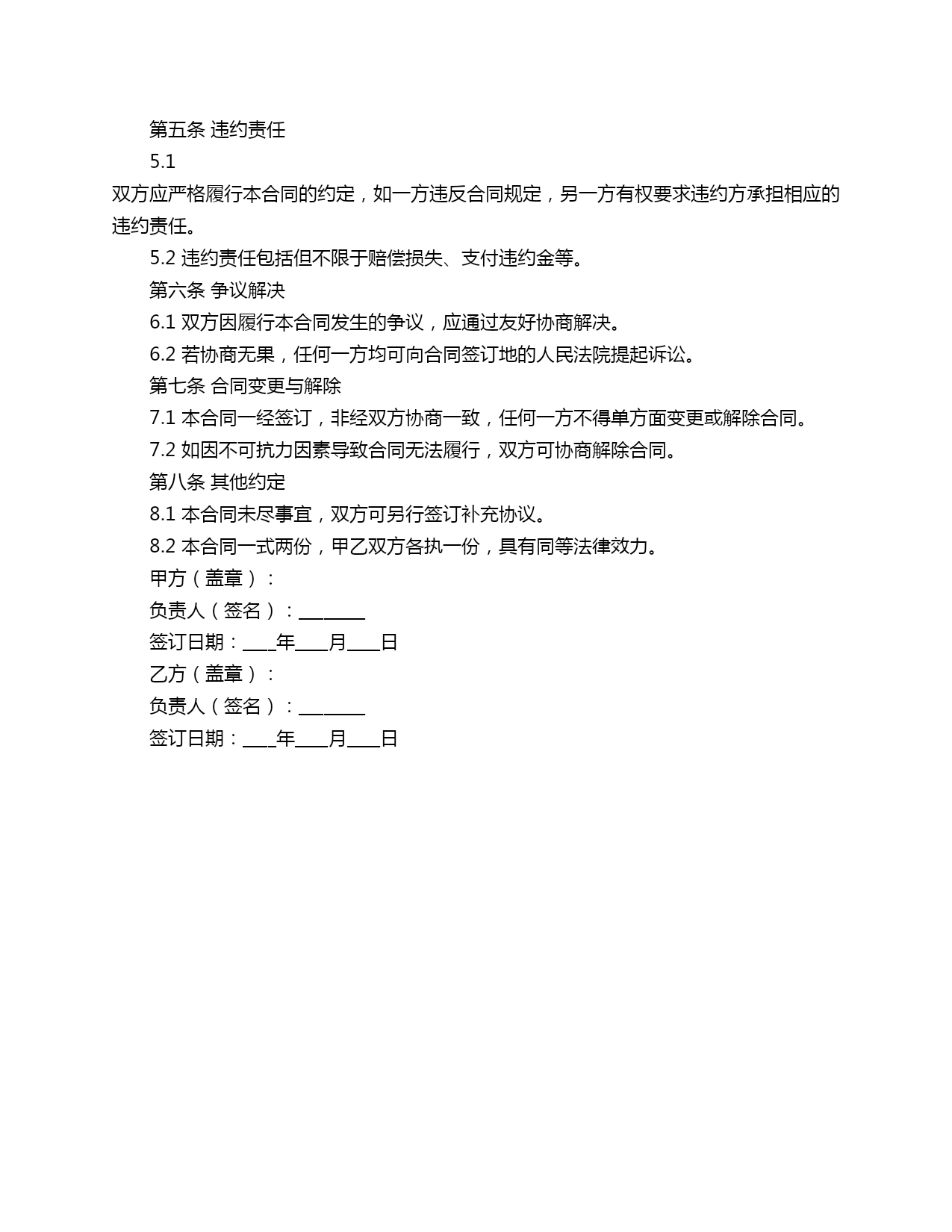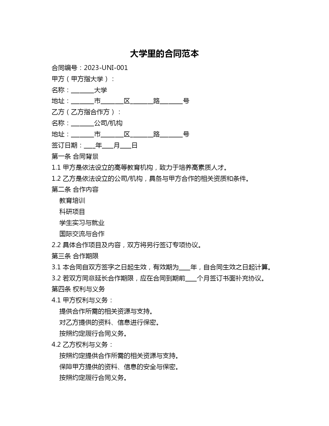 大学里的合同范本合同编号:2023-UNI-001甲方(甲方指大学):名称:________大学地址:________市________区________路________号乙方(乙方指合作方):名称:________公司/机构地址:________市________区________路________号签订日期:____年____月____日第一条合同背景1.1甲方是依法设立的高等教育机构,致力于培养高素质人才。1.2乙方是依法设立的公司/机构,具备与甲方合作的相关资质和条件。第二条合作内容教育培训科研项目学生实习与就业国际交流与合作2.2具体合作项目及内容,双方将另行签订专项协议。第三条合作期限3.1本合同自双方签字之日起生效,有效期为____年,自合同生效之日起计算。3.2若双方同意延长合作期限,应在合同到期前____个月签订书面补充协议。第四条权利与义务4.1甲方权利与义务:提供合作所需的相关资源与支持。对乙方提供的资料、信息进行保密。按照约定履行合同义务。4.2乙方权利与义务:按照约定提供合作所需的相关资源与支持。保障甲方提供的资料、信息的安全与保密。按照约定履行合同义务。第五条违约责任5.1双方应严格履行本合同的约定,如一方违反合同规定,另一方有权要求违约方承担相应的违约责任。5.2违约责任包括但不限于赔偿损失、支付违约金等。第六条争议解决6.1双方因履行本合同发生的争议,应通过友好协商解决。6.2若协商无果,任何一方均可向合同签订地的人民法院提起诉讼。第七条合同变更与解除7.1本合同一经签订,非经双方协商一致,任何一方不得单方面变更或解除合同。7.2如因不可抗力因素导致合同无法履行,双方可协商解除合同。第八条其他约定8.1本合同未尽事宜,双方可另行签订补充协议。8.2本合同一式两份,甲乙双方各执一份,具有同等法律效力。甲方(盖章):负责人(签名):________签订日期:____年____月____日乙方(盖章):负责人(签名):________签订日期:____年____月____日