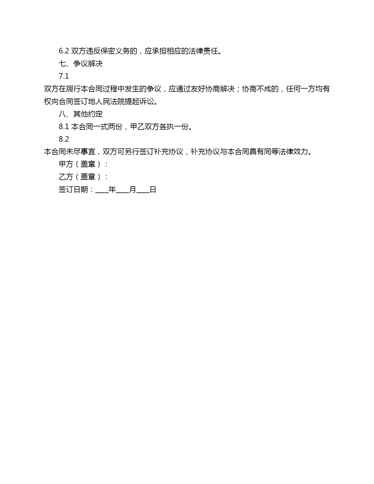 技术专利合作合同范本鉴于甲方拥有某项技术专利,乙方愿意与甲方进行合作,共同开发、利用该项技术专利。为确保双方的合法权益,经双方友好协商,特订立本合同,以便共同遵守。一、合作项目1.1专利名称:____________________1.2专利号:____________________1.3合作内容:双方共同开发、利用甲方拥有的上述技术专利,进行产品研发、生产、销售等活动。二、合作期限2.1本合同自双方签字(或盖章)之日起生效,有效期为____年,自合同生效之日起计算。三、专利权归属3.1甲方拥有上述技术专利的独立使用权、许可权、转让权等全部权利。3.2乙方在合同有效期内,有权在甲方授权范围内使用该技术专利,进行产品研发、生产、销售等活动。四、技术保密4.1双方应对在合作过程中获取的对方商业秘密、技术秘密、市场信息等予以严格保密,未经对方书面同意,不得向第三方泄露。4.2保密期限自本合同生效之日起算,至合同终止或履行完毕之日止。五、合作权益分配5.1甲方负责提供技术专利,乙方负责提供资金、设备、人员等资源。5.2双方按照投入比例分享合作产生的收益,具体分配比例双方协商确定。5.3乙方在合同有效期内,有优先购买甲方转让的该技术专利的权利。六、违约责任6.1双方应严格按照本合同的约定履行各自的权利义务,如一方违约,应承担违约责任,向对方支付违约金,并赔偿因此给对方造成的损失。6.2双方违反保密义务的,应承担相应的法律责任。七、争议解决7.1双方在履行本合同过程中发生的争议,应通过友好协商解决;协商不成的,任何一方均有权向合同签订地人民法院提起诉讼。八、其他约定8.1本合同一式两份,甲乙双方各执一份。8.2本合同未尽事宜,双方可另行签订补充协议,补充协议与本合同具有同等法律效力。甲方(盖章):乙方(盖章):签订日期:____年____月____日