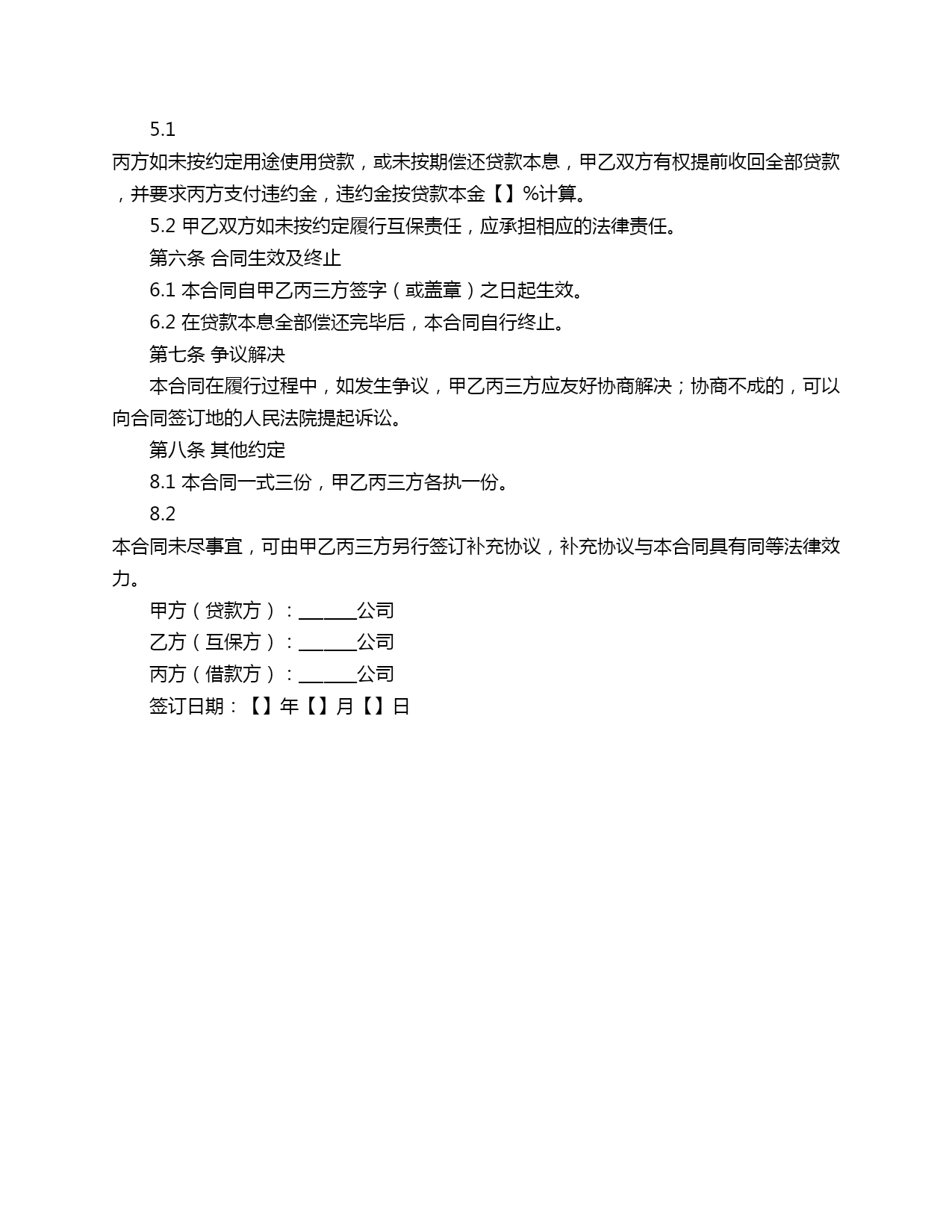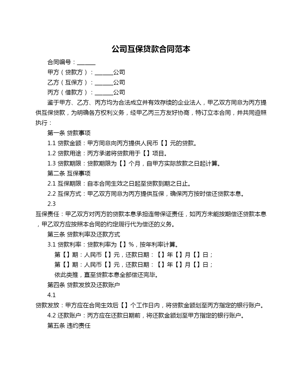 公司互保贷款合同范本合同编号:_______甲方(贷款方):_______公司乙方(互保方):_______公司丙方(借款方):_______公司鉴于甲方、乙方、丙方均为合法成立并有效存续的企业法人,甲乙双方同意为丙方提供互保贷款,为明确各方权利义务,经甲乙丙三方友好协商,特订立本合同,并共同遵照执行:第一条贷款事项1.1贷款金额:甲方同意向丙方提供人民币【】元的贷款。1.2贷款用途:丙方承诺将贷款用于【】项目。1.3贷款期限:贷款期限为【】个月,自甲方实际放款之日起计算。第二条互保事项2.1互保期限:自本合同生效之日起至贷款到期之日止。2.2互保方式:甲乙双方同意为丙方提供互保,确保丙方按时偿还贷款本息。2.3互保责任:甲乙双方对丙方的贷款本息承担连带保证责任,如丙方未能按期偿还贷款本息,甲乙双方应按照本合同的约定履行代为偿还的义务。第三条贷款利率及还款方式3.1贷款利率:贷款利率为【】%,按年利率计算。第【】期:人民币【】元,还款日期:【】年【】月【】日;第【】期:人民币【】元,还款日期:【】年【】月【】日;依此类推,直至贷款本息全部偿还完毕。第四条贷款发放及还款账户4.1贷款发放:甲方应在合同生效后【】个工作日内,将贷款金额划至丙方指定的银行账户。4.2还款账户:丙方应在还款日期前,将还款金额划至甲方指定的银行账户。第五条违约责任5.1丙方如未按约定用途使用贷款,或未按期偿还贷款本息,甲乙双方有权提前收回全部贷款,并要求丙方支付违约金,违约金按贷款本金【】%计算。5.2甲乙双方如未按约定履行互保责任,应承担相应的法律责任。第六条合同生效及终止6.1本合同自甲乙丙三方签字(或盖章)之日起生效。6.2在贷款本息全部偿还完毕后,本合同自行终止。第七条争议解决本合同在履行过程中,如发生争议,甲乙丙三方应友好协商解决;协商不成的,可以向合同签订地的人民法院提起诉讼。第八条其他约定8.1本合同一式三份,甲乙丙三方各执一份。8.2本合同未尽事宜,可由甲乙丙三方另行签订补充协议,补充协议与本合同具有同等法律效力。甲方(贷款方):_______公司乙方(互保方):_______公司丙方(借款方):_______公司签订日期:【】年【】月【】日