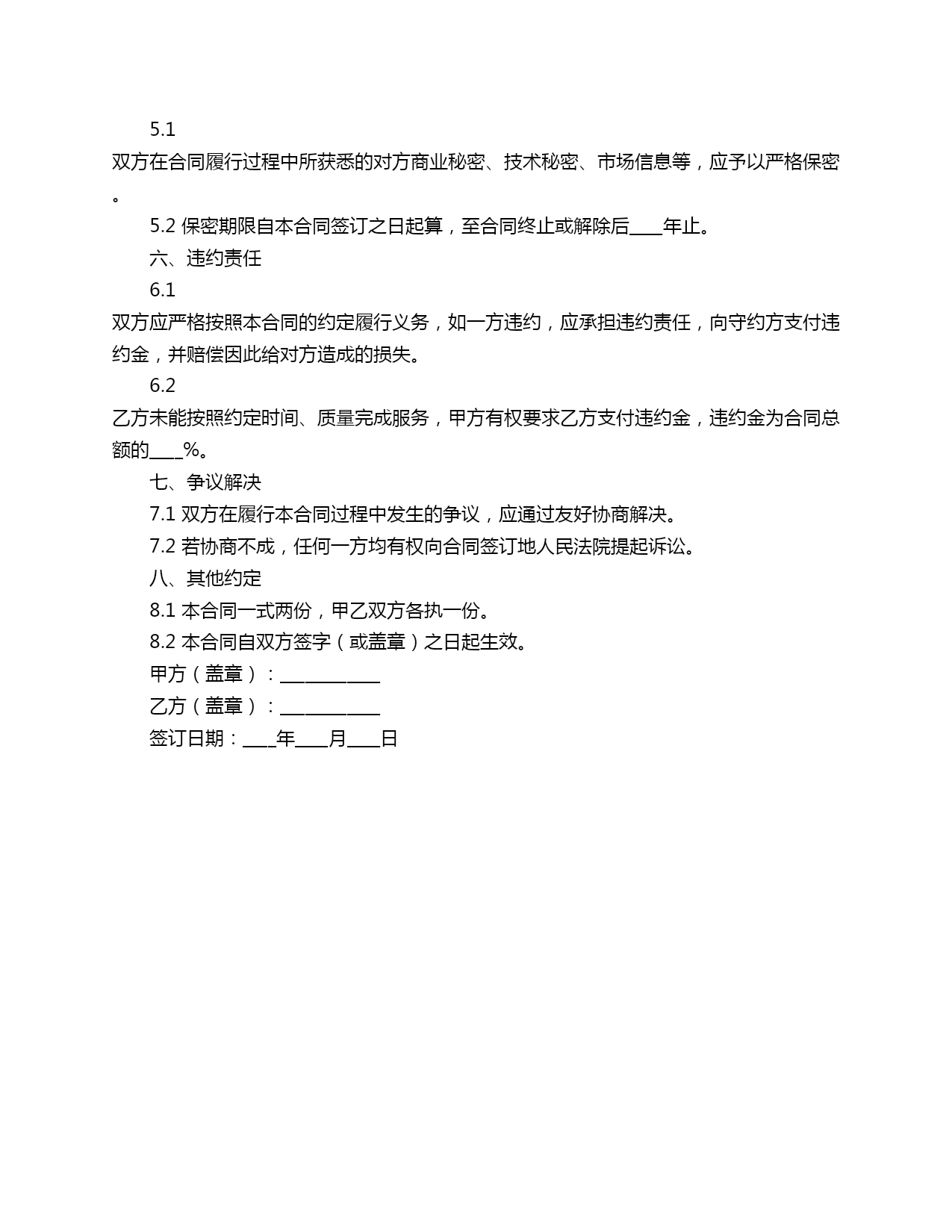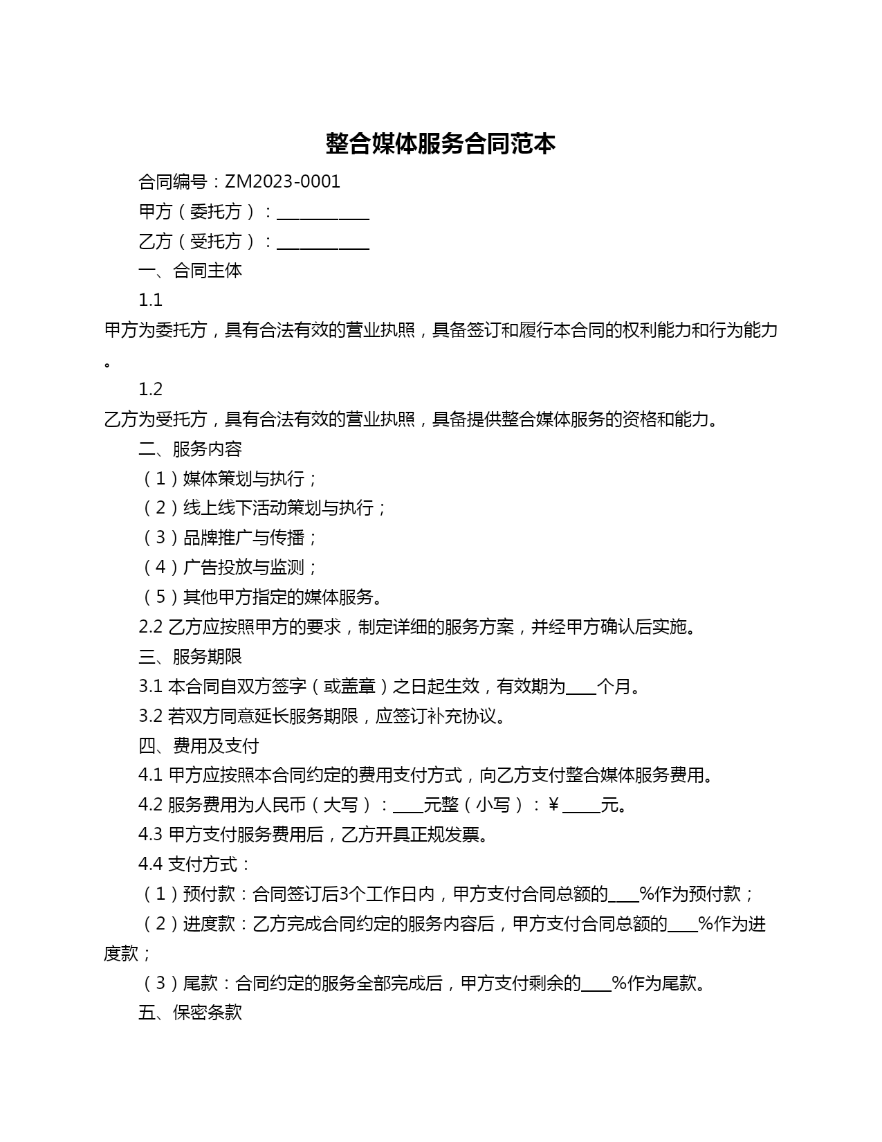 整合媒体服务合同范本合同编号:ZM2023-0001甲方(委托方):____________乙方(受托方):____________一、合同主体1.1甲方为委托方,具有合法有效的营业执照,具备签订和履行本合同的权利能力和行为能力。1.2乙方为受托方,具有合法有效的营业执照,具备提供整合媒体服务的资格和能力。二、服务内容(1)媒体策划与执行;(2)线上线下活动策划与执行;(3)品牌推广与传播;(4)广告投放与监测;(5)其他甲方指定的媒体服务。2.2乙方应按照甲方的要求,制定详细的服务方案,并经甲方确认后实施。三、服务期限3.1本合同自双方签字(或盖章)之日起生效,有效期为____个月。3.2若双方同意延长服务期限,应签订补充协议。四、费用及支付4.1甲方应按照本合同约定的费用支付方式,向乙方支付整合媒体服务费用。4.2服务费用为人民币(大写):____元整(小写):¥_____元。4.3甲方支付服务费用后,乙方开具正规发票。4.4支付方式:(1)预付款:合同签订后3个工作日内,甲方支付合同总额的____%作为预付款;(2)进度款:乙方完成合同约定的服务内容后,甲方支付合同总额的____%作为进度款;(3)尾款:合同约定的服务全部完成后,甲方支付剩余的____%作为尾款。五、保密条款5.1双方在合同履行过程中所获悉的对方商业秘密、技术秘密、市场信息等,应予以严格保密。5.2保密期限自本合同签订之日起算,至合同终止或解除后____年止。六、违约责任6.1双方应严格按照本合同的约定履行义务,如一方违约,应承担违约责任,向守约方支付违约金,并赔偿因此给对方造成的损失。6.2乙方未能按照约定时间、质量完成服务,甲方有权要求乙方支付违约金,违约金为合同总额的____%。七、争议解决7.1双方在履行本合同过程中发生的争议,应通过友好协商解决。7.2若协商不成,任何一方均有权向合同签订地人民法院提起诉讼。八、其他约定8.1本合同一式两份,甲乙双方各执一份。8.2本合同自双方签字(或盖章)之日起生效。甲方(盖章):____________乙方(盖章):____________签订日期:____年____月____日