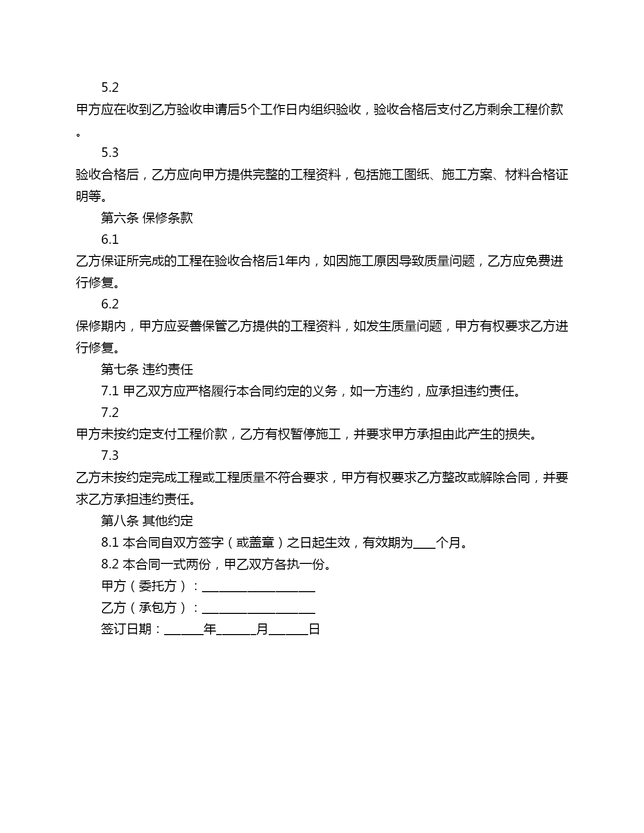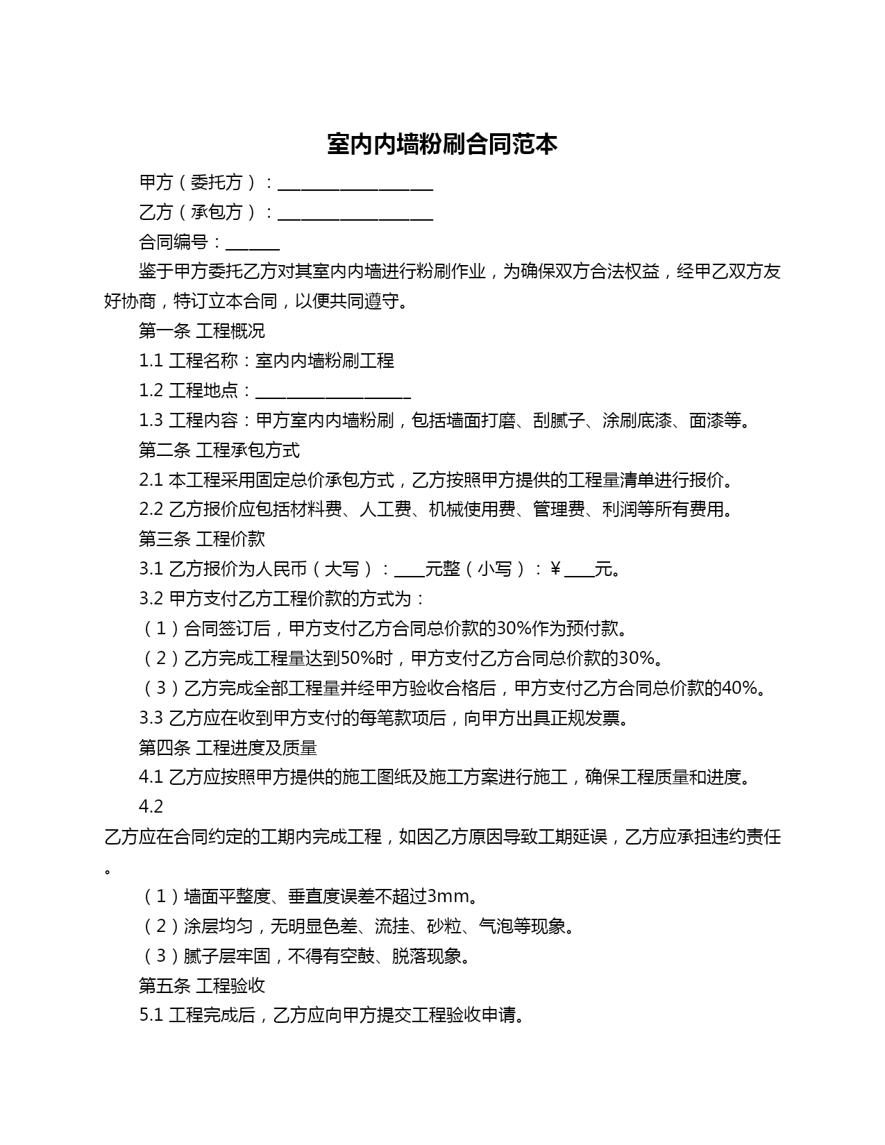 室内内墙粉刷合同范本甲方(委托方):____________________乙方(承包方):____________________合同编号:_______鉴于甲方委托乙方对其室内内墙进行粉刷作业,为确保双方合法权益,经甲乙双方友好协商,特订立本合同,以便共同遵守。第一条工程概况1.1工程名称:室内内墙粉刷工程1.2工程地点:____________________1.3工程内容:甲方室内内墙粉刷,包括墙面打磨、刮腻子、涂刷底漆、面漆等。第二条工程承包方式2.1本工程采用固定总价承包方式,乙方按照甲方提供的工程量清单进行报价。2.2乙方报价应包括材料费、人工费、机械使用费、管理费、利润等所有费用。第三条工程价款3.1乙方报价为人民币(大写):____元整(小写):¥____元。3.2甲方支付乙方工程价款的方式为:(1)合同签订后,甲方支付乙方合同总价款的30%作为预付款。(2)乙方完成工程量达到50%时,甲方支付乙方合同总价款的30%。(3)乙方完成全部工程量并经甲方验收合格后,甲方支付乙方合同总价款的40%。3.3乙方应在收到甲方支付的每笔款项后,向甲方出具正规发票。第四条工程进度及质量4.1乙方应按照甲方提供的施工图纸及施工方案进行施工,确保工程质量和进度。4.2乙方应在合同约定的工期内完成工程,如因乙方原因导致工期延误,乙方应承担违约责任。(1)墙面平整度、垂直度误差不超过3mm。(2)涂层均匀,无明显色差、流挂、砂粒、气泡等现象。(3)腻子层牢固,不得有空鼓、脱落现象。第五条工程验收5.1工程完成后,乙方应向甲方提交工程验收申请。5.2甲方应在收到乙方验收申请后5个工作日内组织验收,验收合格后支付乙方剩余工程价款。5.3验收合格后,乙方应向甲方提供完整的工程资料,包括施工图纸、施工方案、材料合格证明等。第六条保修条款6.1乙方保证所完成的工程在验收合格后1年内,如因施工原因导致质量问题,乙方应免费进行修复。6.2保修期内,甲方应妥善保管乙方提供的工程资料,如发生质量问题,甲方有权要求乙方进行修复。第七条违约责任7.1甲乙双方应严格履行本合同约定的义务,如一方违约,应承担违约责任。7.2甲方未按约定支付工程价款,乙方有权暂停施工,并要求甲方承担由此产生的损失。7.3乙方未按约定完成工程或工程质量不符合要求,甲方有权要求乙方整改或解除合同,并要求乙方承担违约责任。第八条其他约定8.1本合同自双方签字(或盖章)之日起生效,有效期为____个月。8.2本合同一式两份,甲乙双方各执一份。甲方(委托方):____________________乙方(承包方):____________________签订日期:_______年_______月_______日