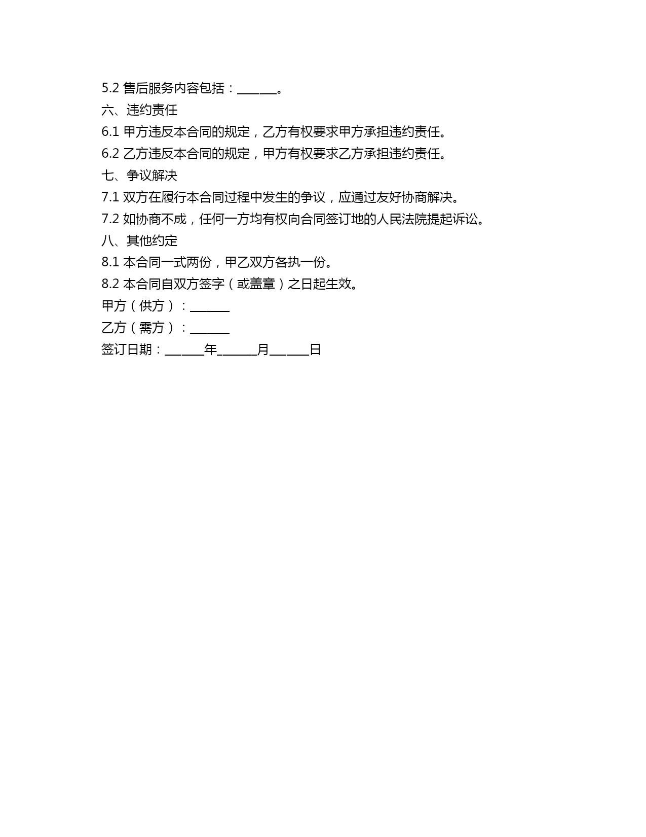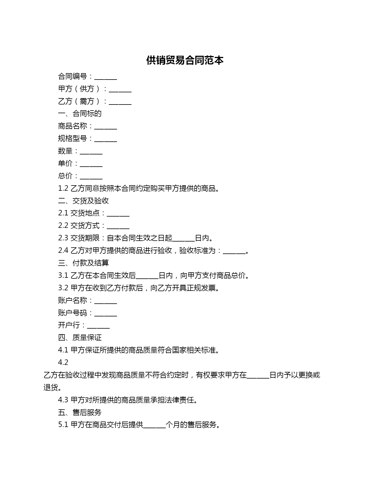 供销贸易合同范本合同编号:_______甲方(供方):_______乙方(需方):_______一、合同标的商品名称:_______规格型号:_______数量:_______单价:_______总价:_______1.2乙方同意按照本合同约定购买甲方提供的商品。二、交货及验收2.1交货地点:_______2.2交货方式:_______2.3交货期限:自本合同生效之日起_______日内。2.4乙方对甲方提供的商品进行验收,验收标准为:_______。三、付款及结算3.1乙方在本合同生效后_______日内,向甲方支付商品总价。3.2甲方在收到乙方付款后,向乙方开具正规发票。账户名称:_______账户号码:_______开户行:_______四、质量保证4.1甲方保证所提供的商品质量符合国家相关标准。4.2乙方在验收过程中发现商品质量不符合约定时,有权要求甲方在_______日内予以更换或退货。4.3甲方对所提供的商品质量承担法律责任。五、售后服务5.1甲方在商品交付后提供_______个月的售后服务。5.2售后服务内容包括:_______。六、违约责任6.1甲方违反本合同的规定,乙方有权要求甲方承担违约责任。6.2乙方违反本合同的规定,甲方有权要求乙方承担违约责任。七、争议解决7.1双方在履行本合同过程中发生的争议,应通过友好协商解决。7.2如协商不成,任何一方均有权向合同签订地的人民法院提起诉讼。八、其他约定8.1本合同一式两份,甲乙双方各执一份。8.2本合同自双方签字(或盖章)之日起生效。甲方(供方):_______乙方(需方):_______签订日期:_______年_______月_______日