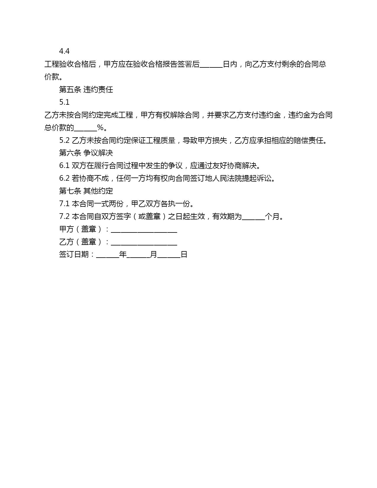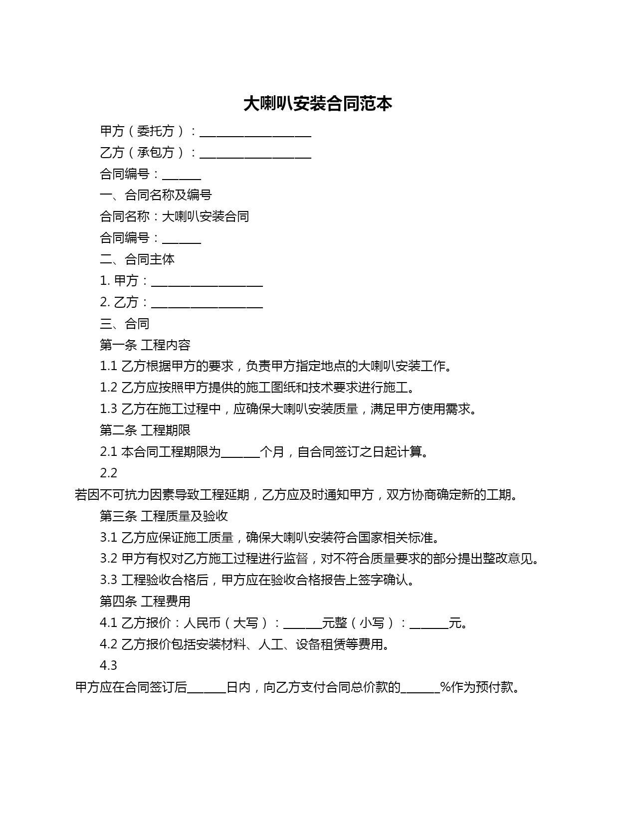 大喇叭安装合同范本甲方(委托方):____________________乙方(承包方):____________________合同编号:_______一、合同名称及编号合同名称:大喇叭安装合同合同编号:_______二、合同主体1.甲方:____________________2.乙方:____________________三、合同第一条工程内容1.1乙方根据甲方的要求,负责甲方指定地点的大喇叭安装工作。1.2乙方应按照甲方提供的施工图纸和技术要求进行施工。1.3乙方在施工过程中,应确保大喇叭安装质量,满足甲方使用需求。第二条工程期限2.1本合同工程期限为_______个月,自合同签订之日起计算。2.2若因不可抗力因素导致工程延期,乙方应及时通知甲方,双方协商确定新的工期。第三条工程质量及验收3.1乙方应保证施工质量,确保大喇叭安装符合国家相关标准。3.2甲方有权对乙方施工过程进行监督,对不符合质量要求的部分提出整改意见。3.3工程验收合格后,甲方应在验收合格报告上签字确认。第四条工程费用4.1乙方报价:人民币(大写):_______元整(小写):_______元。4.2乙方报价包括安装材料、人工、设备租赁等费用。4.3甲方应在合同签订后_______日内,向乙方支付合同总价款的_______%作为预付款。4.4工程验收合格后,甲方应在验收合格报告签署后_______日内,向乙方支付剩余的合同总价款。第五条违约责任5.1乙方未按合同约定完成工程,甲方有权解除合同,并要求乙方支付违约金,违约金为合同总价款的_______%。5.2乙方未按合同约定保证工程质量,导致甲方损失,乙方应承担相应的赔偿责任。第六条争议解决6.1双方在履行合同过程中发生的争议,应通过友好协商解决。6.2若协商不成,任何一方均有权向合同签订地人民法院提起诉讼。第七条其他约定7.1本合同一式两份,甲乙双方各执一份。7.2本合同自双方签字(或盖章)之日起生效,有效期为_______个月。甲方(盖章):____________________乙方(盖章):____________________签订日期:_______年_______月_______日