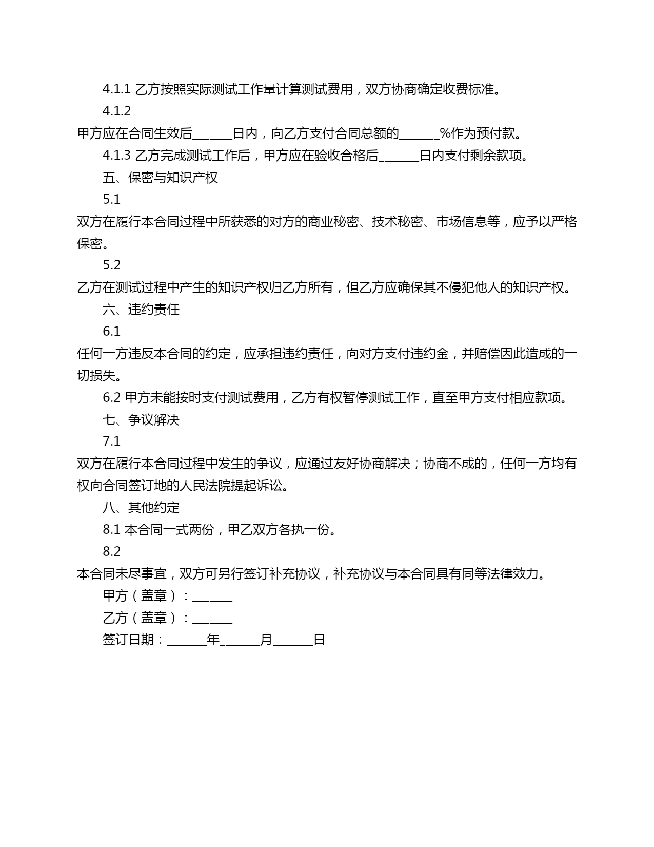 自动测试合同范本合同编号:_______甲方(委托方):_______地址:_______法定代表人:_______联系电话:_______乙方(受托方):_______地址:_______法定代表人:_______联系电话:_______一、合同标的1.1乙方根据甲方的委托,为甲方提供自动测试服务,包括但不限于软件测试、硬件测试、系统测试等。二、合同期限2.1本合同自双方签字(或盖章)之日起生效,有效期为_______个月。三、合同内容3.1测试范围:乙方根据甲方提供的测试需求文档,对甲方指定的软件、硬件或系统进行全面的测试。3.2测试标准:乙方按照国家相关标准和行业规范进行测试,确保测试结果的准确性和可靠性。3.3测试进度:乙方应按照甲方提供的测试计划和时间表进行测试,并定期向甲方报告测试进度。3.4测试报告:乙方应在测试结束后,向甲方提交详细的测试报告,包括测试结果、问题分析及改进建议。四、费用与支付4.1.1乙方按照实际测试工作量计算测试费用,双方协商确定收费标准。4.1.2甲方应在合同生效后_______日内,向乙方支付合同总额的_______%作为预付款。4.1.3乙方完成测试工作后,甲方应在验收合格后_______日内支付剩余款项。五、保密与知识产权5.1双方在履行本合同过程中所获悉的对方的商业秘密、技术秘密、市场信息等,应予以严格保密。5.2乙方在测试过程中产生的知识产权归乙方所有,但乙方应确保其不侵犯他人的知识产权。六、违约责任6.1任何一方违反本合同的约定,应承担违约责任,向对方支付违约金,并赔偿因此造成的一切损失。6.2甲方未能按时支付测试费用,乙方有权暂停测试工作,直至甲方支付相应款项。七、争议解决7.1双方在履行本合同过程中发生的争议,应通过友好协商解决;协商不成的,任何一方均有权向合同签订地的人民法院提起诉讼。八、其他约定8.1本合同一式两份,甲乙双方各执一份。8.2本合同未尽事宜,双方可另行签订补充协议,补充协议与本合同具有同等法律效力。甲方(盖章):_______乙方(盖章):_______签订日期:_______年_______月_______日